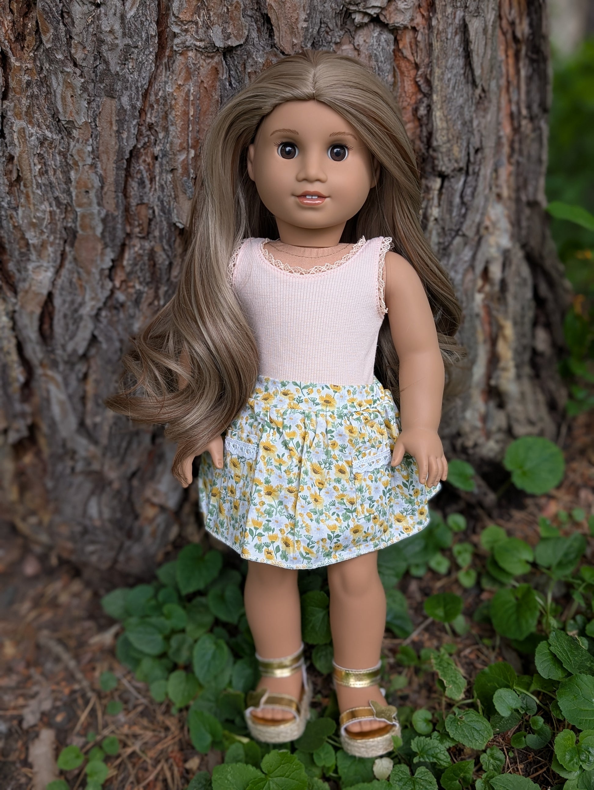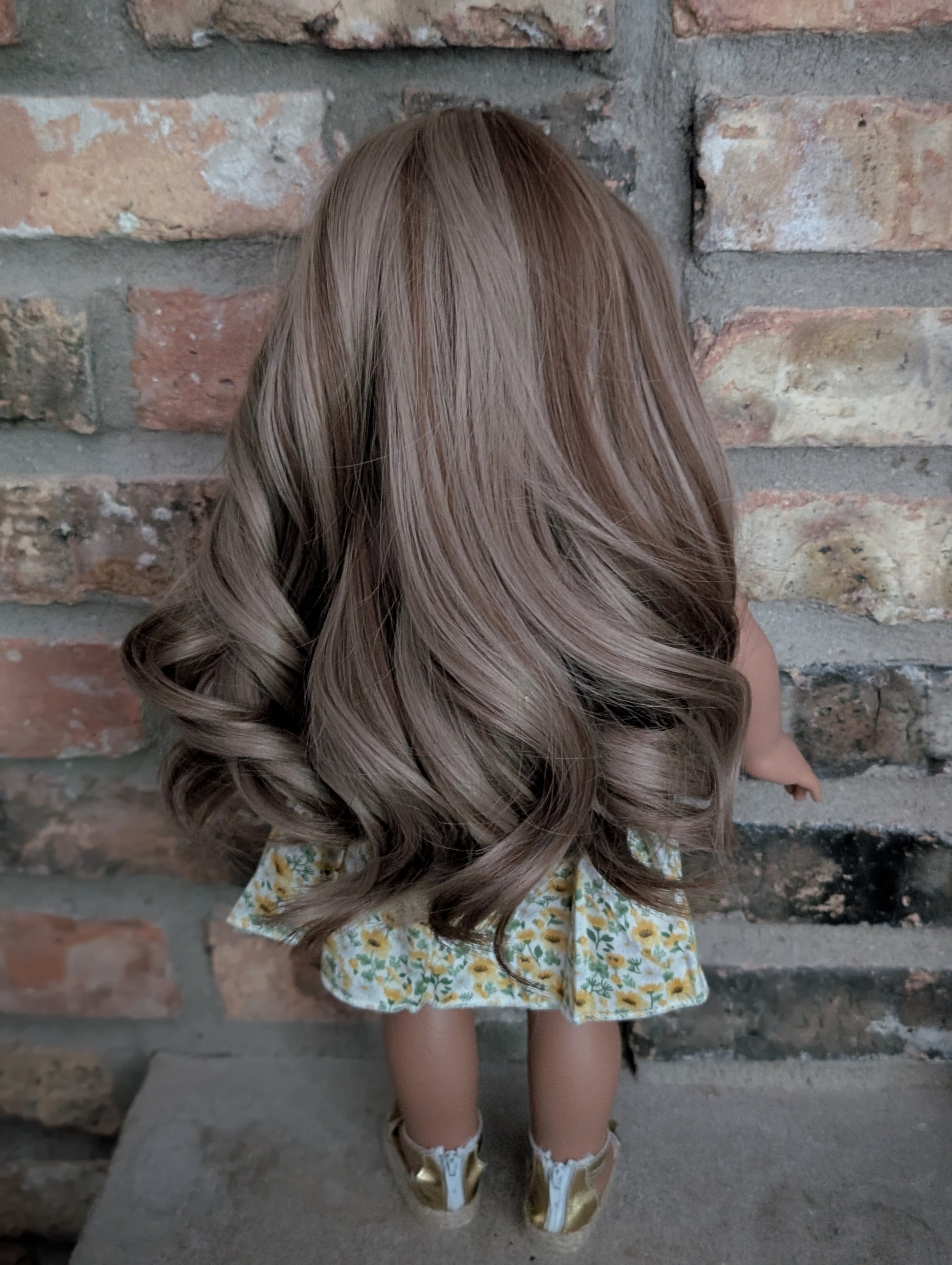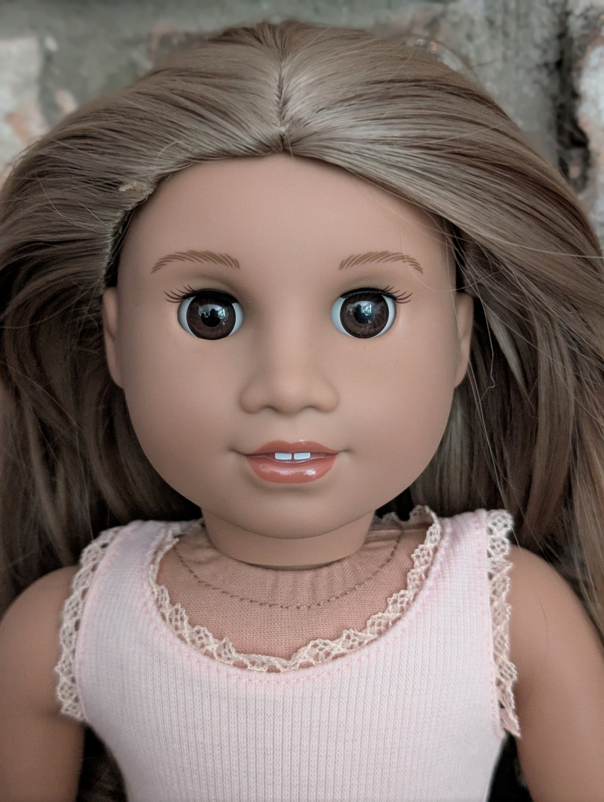 This one of a kind OOAK custom American Girl doll was created with a brand new doll, a brown wig, and brown eyes. She has lip gloss that was hand painted and sealed. She may have some minor shine marks from handling. She comes with the outfit pictured.