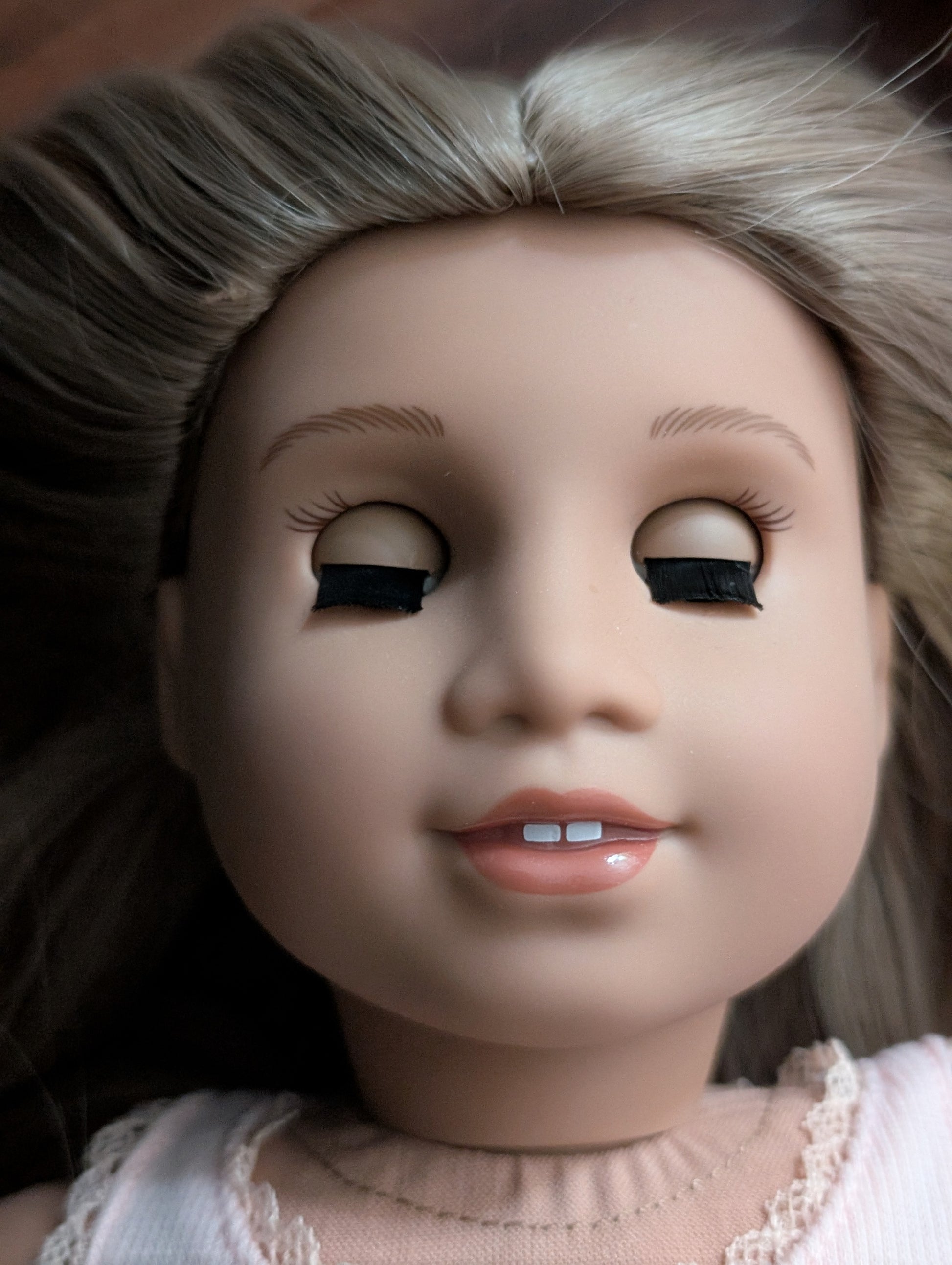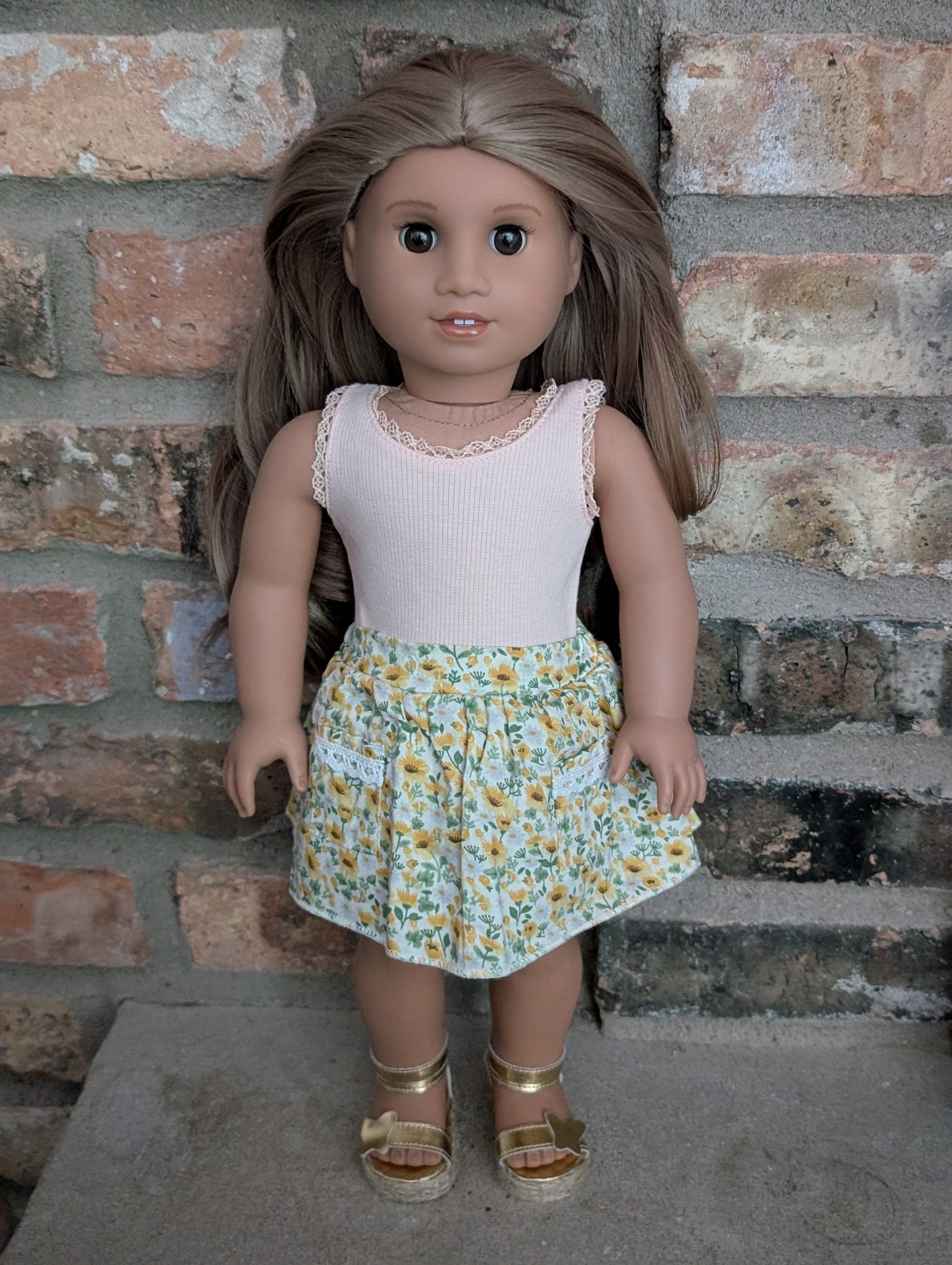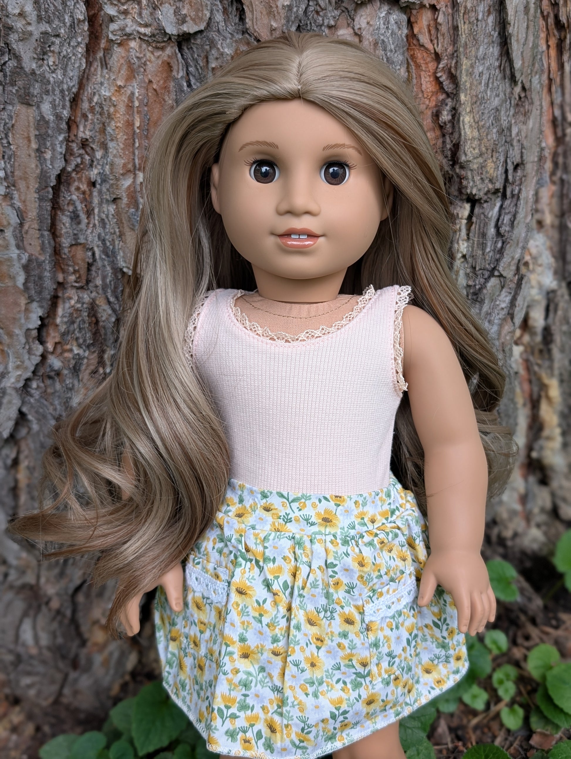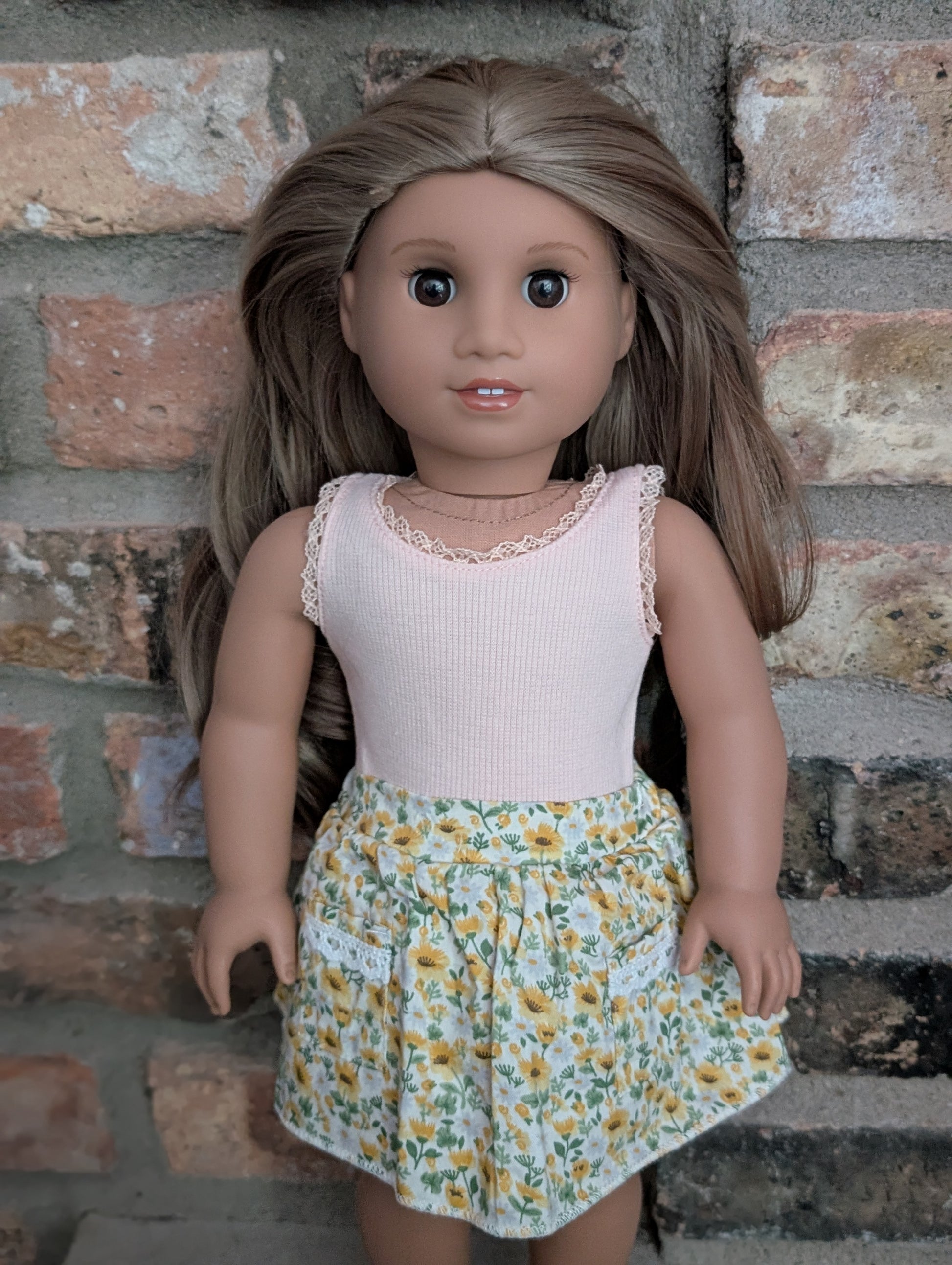 This one of a kind OOAK custom American Girl doll was created with a brand new doll, a brown wig, and brown eyes. She has lip gloss that was hand painted and sealed. She may have some minor shine marks from handling. She comes with the outfit pictured.