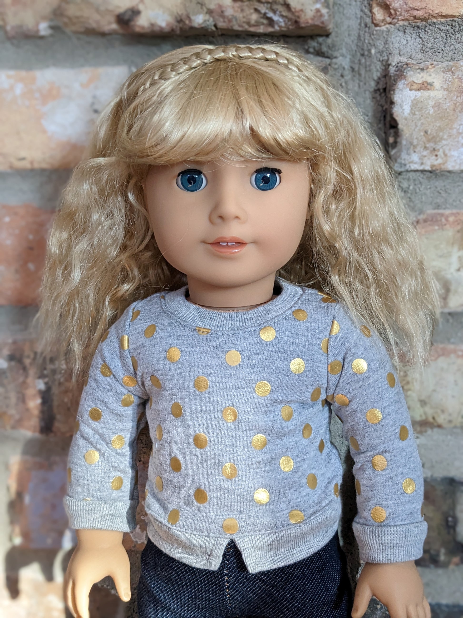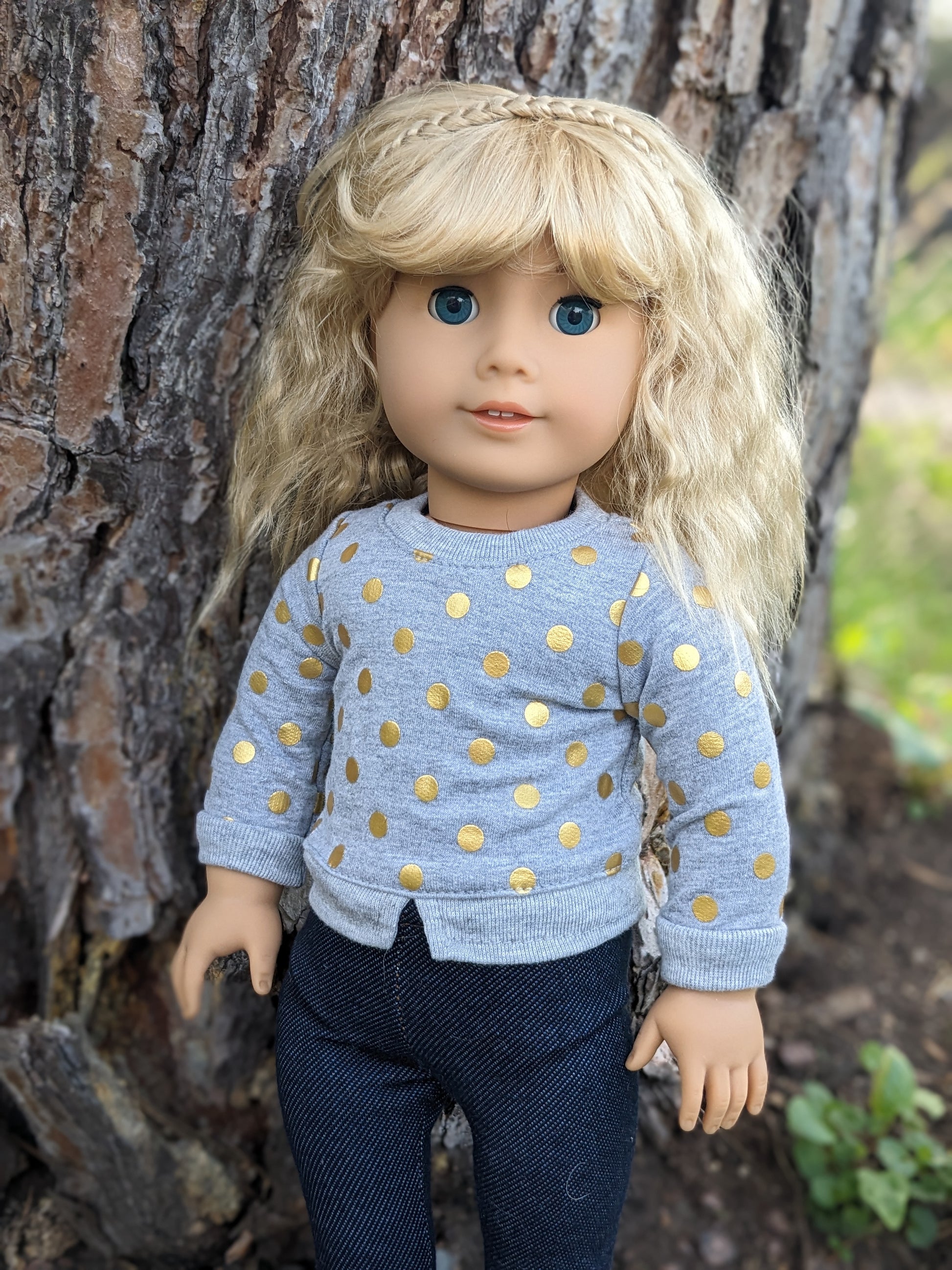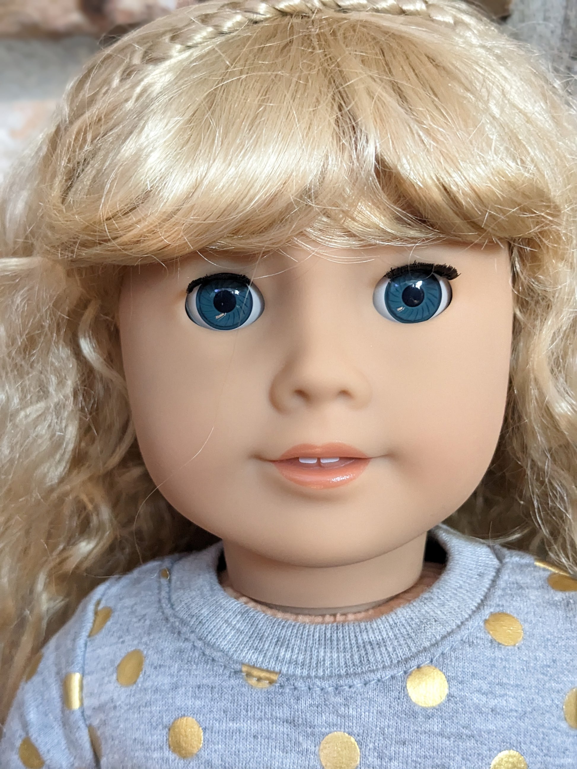 This one of a kind OOAK custom American Girl doll was created with a new doll, a blonde super soft vegan mohair wig, and blue eyes. She has lip gloss that was hand painted and sealed. She may have some minor shine marks from handling. She comes with the outfit pictured. She has the microfiber cloth body with permapanties.