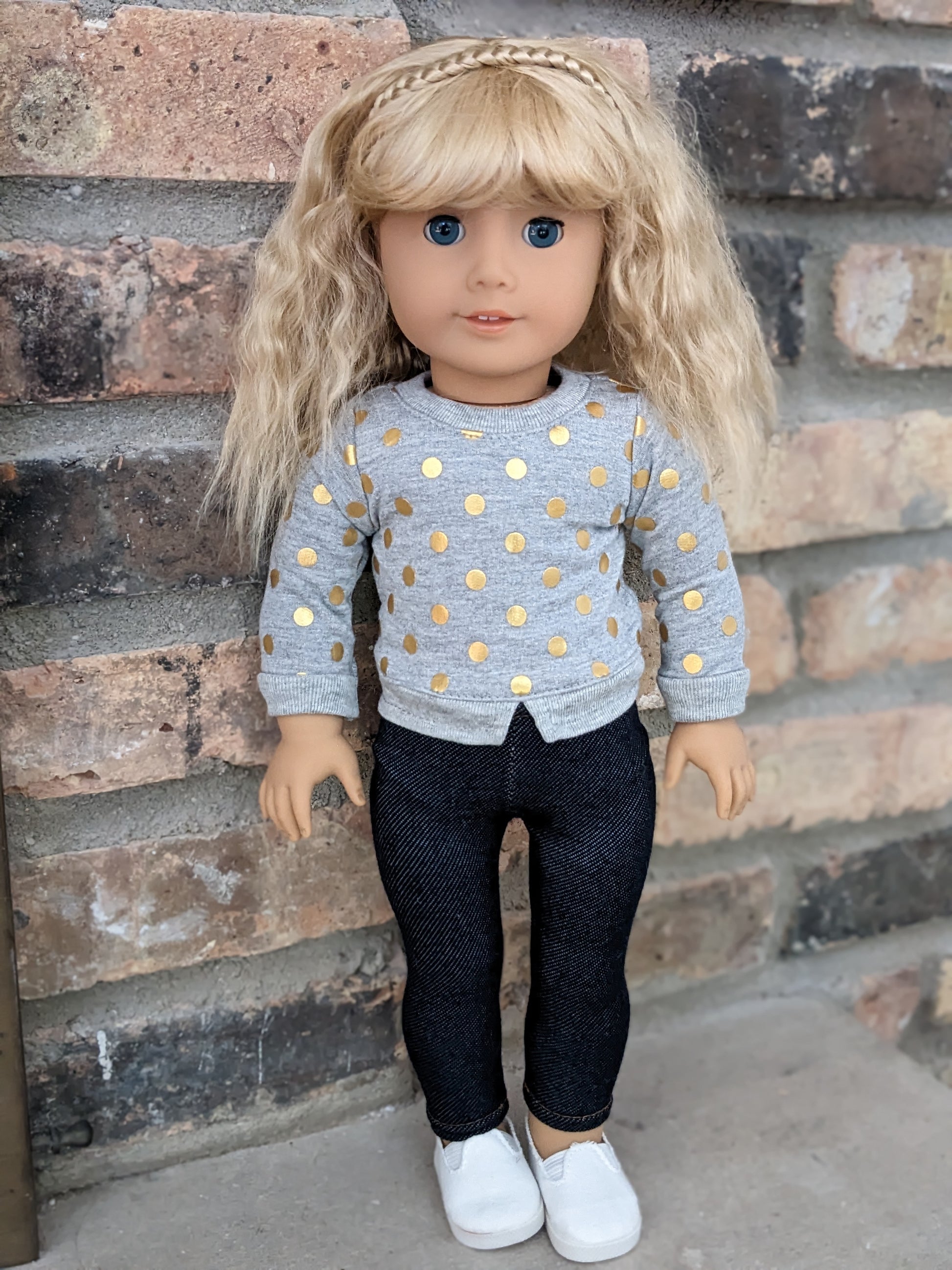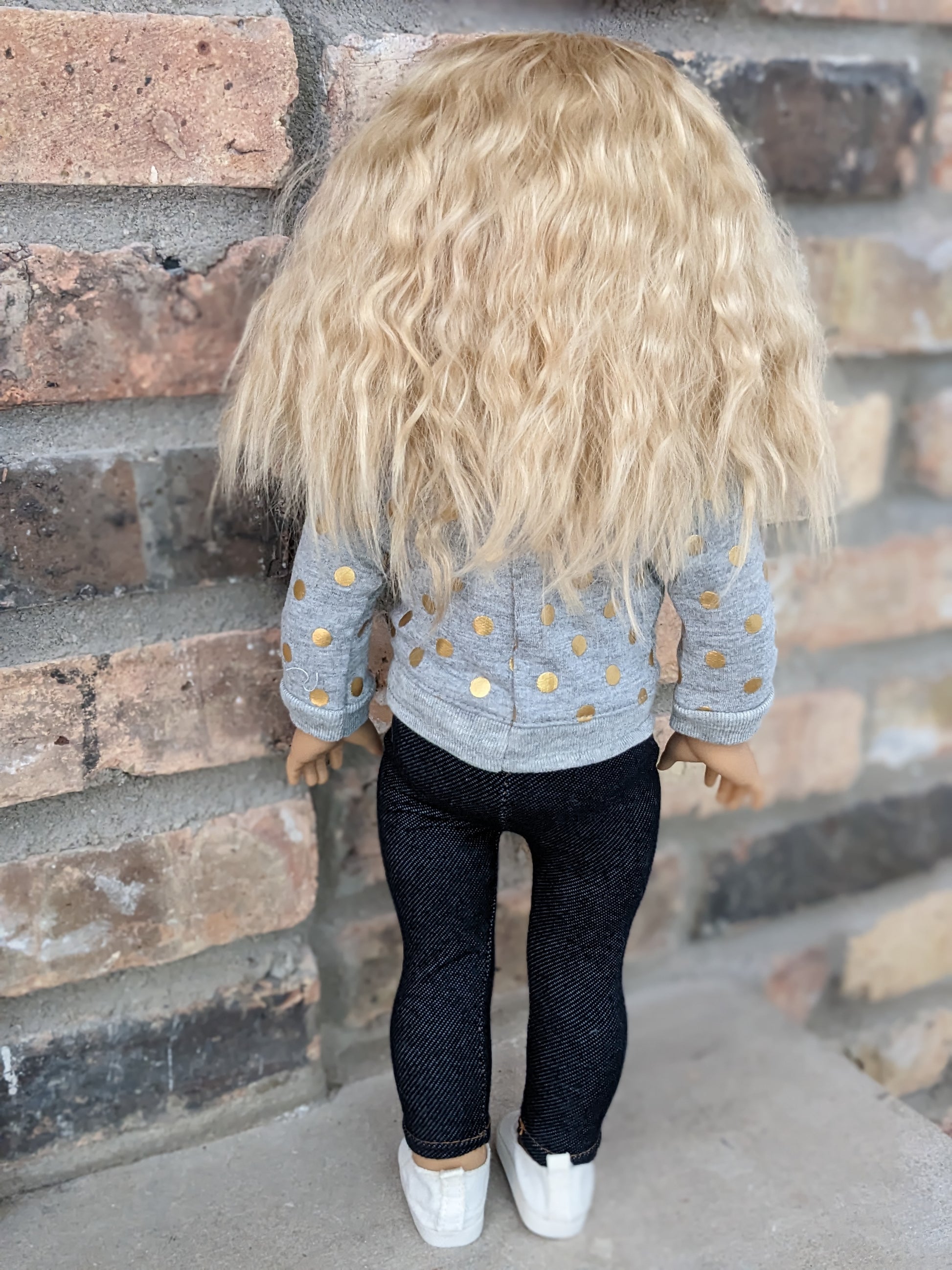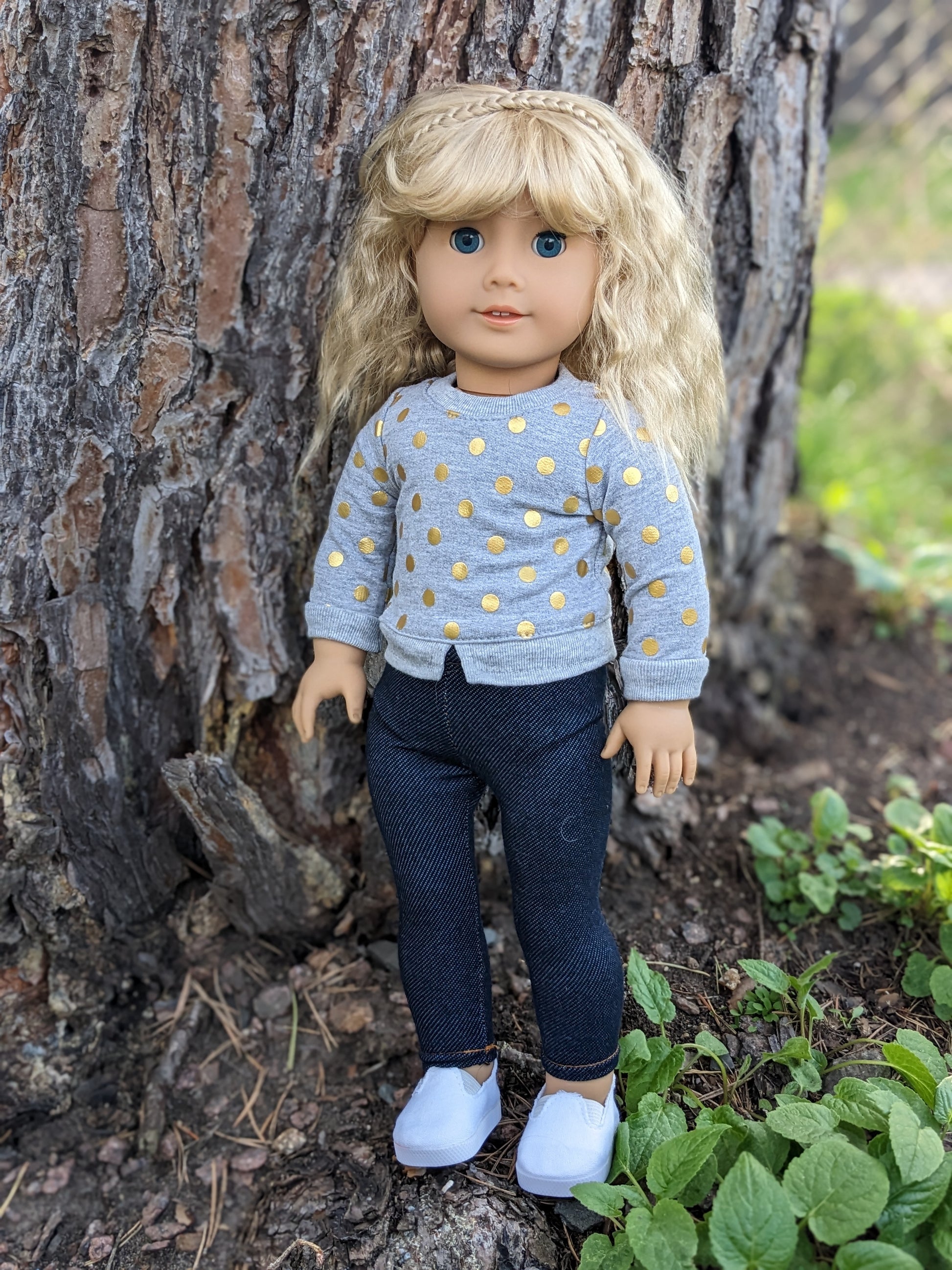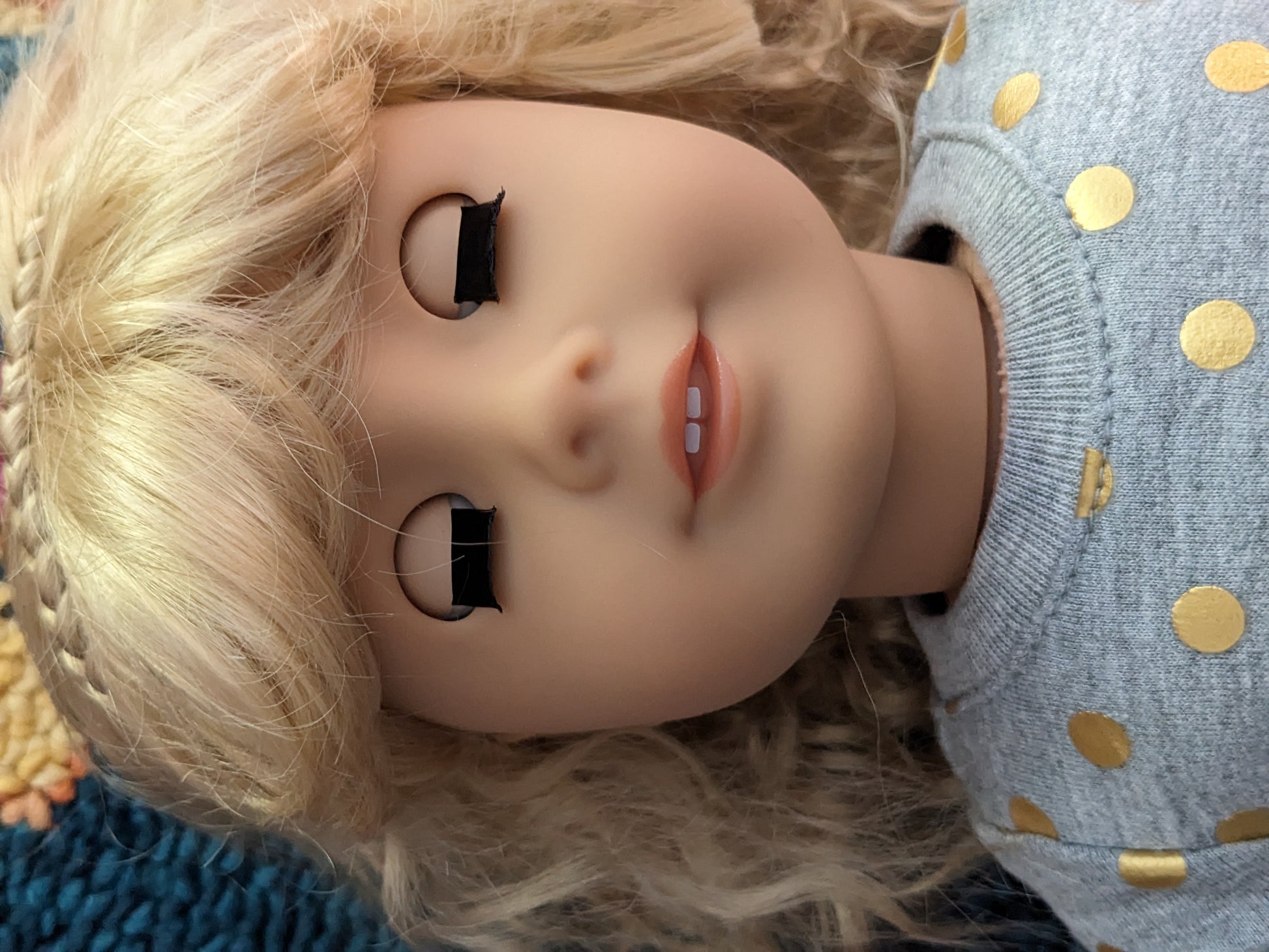 This one of a kind OOAK custom American Girl doll was created with a new doll, a blonde super soft vegan mohair wig, and blue eyes. She has lip gloss that was hand painted and sealed. She may have some minor shine marks from handling. She comes with the outfit pictured. She has the microfiber cloth body with permapanties.