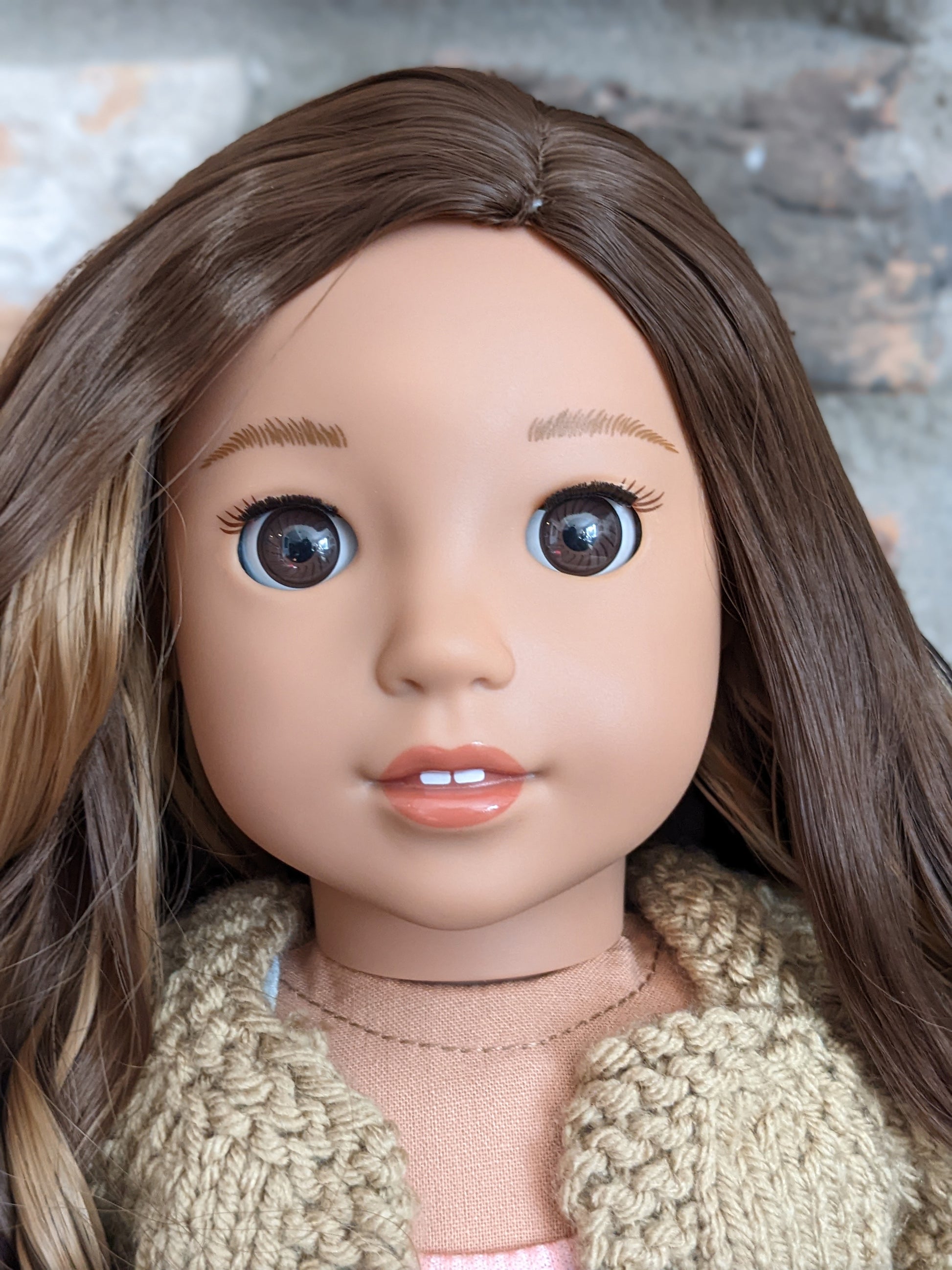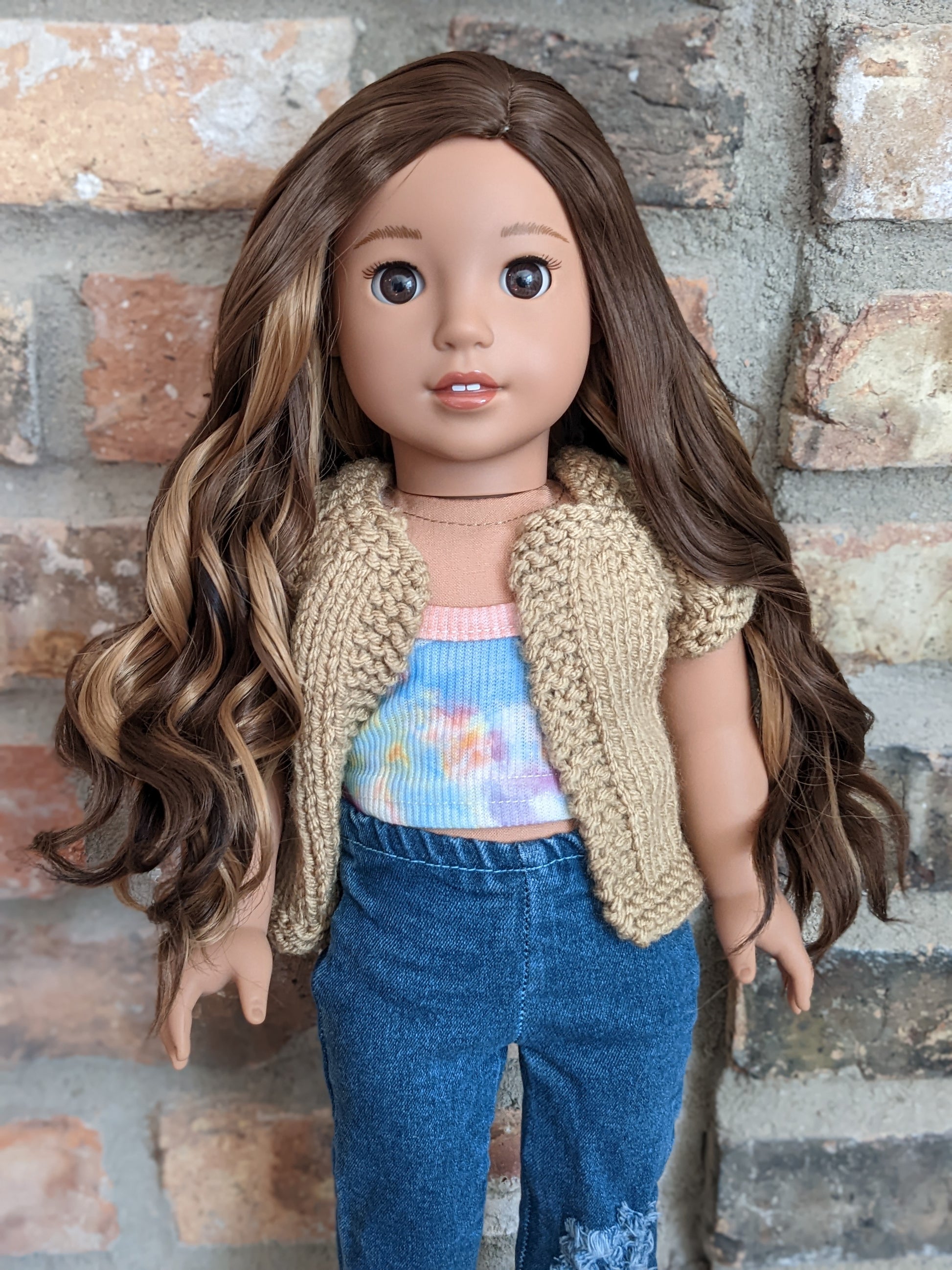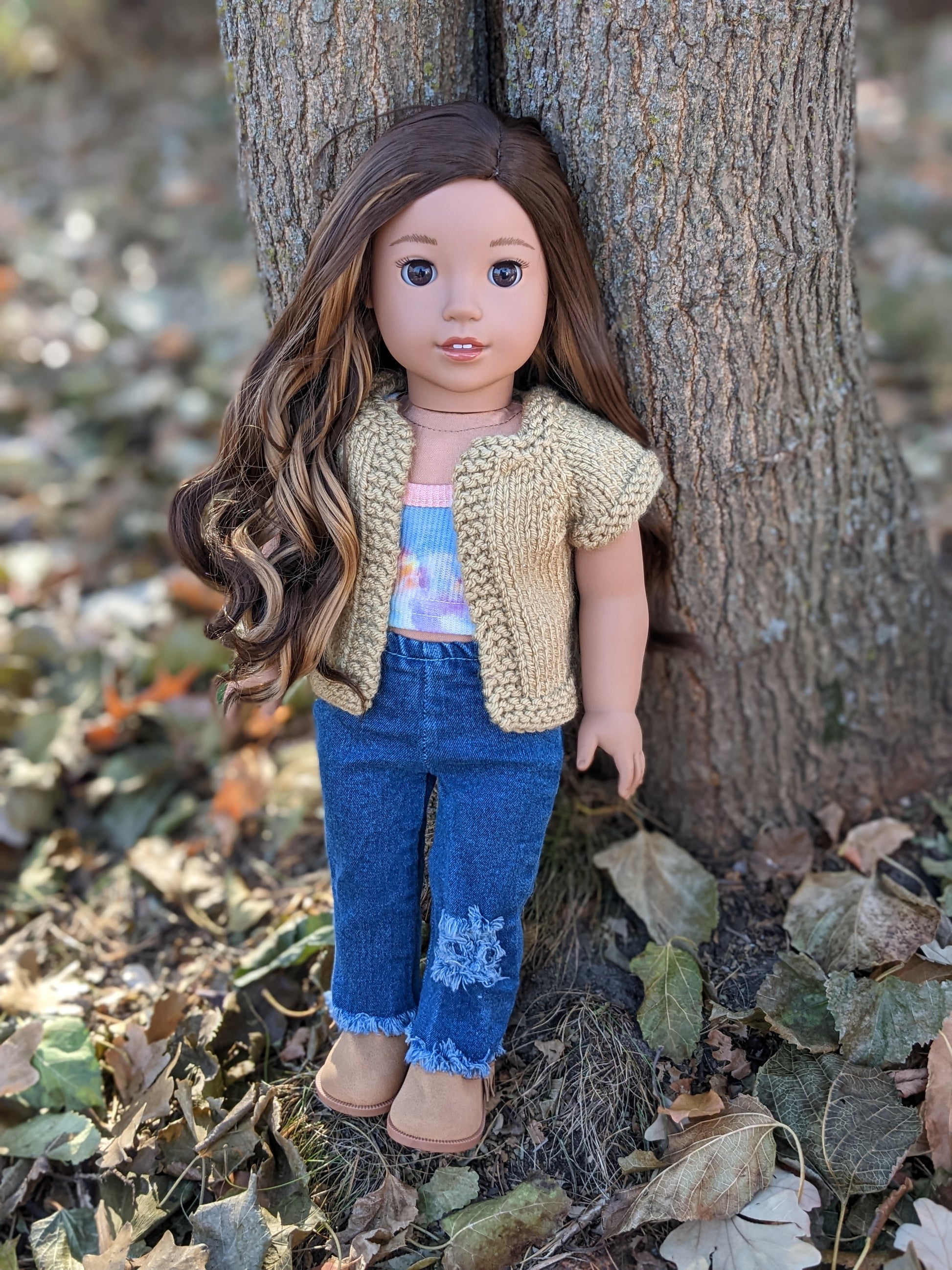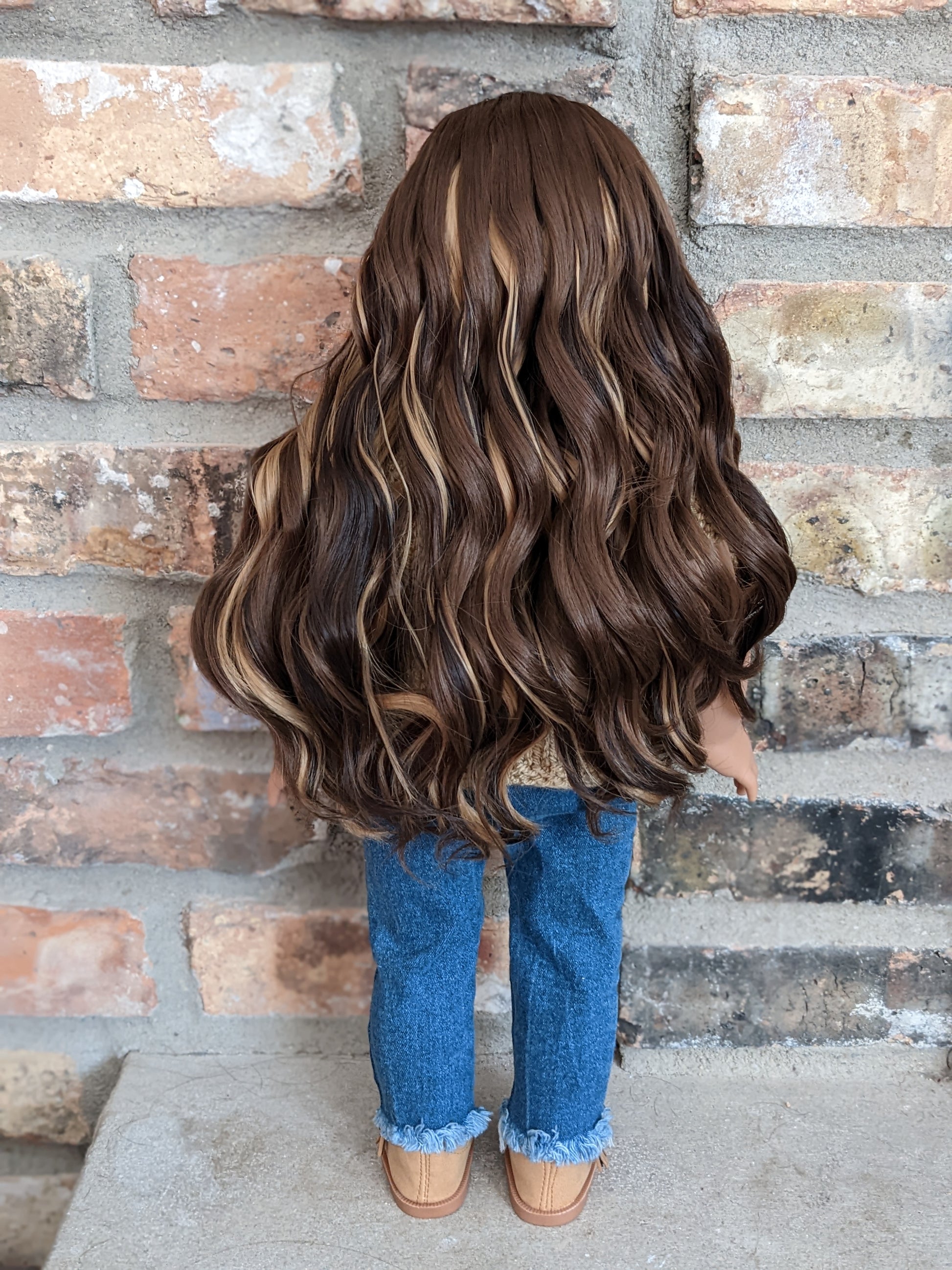 This one of a kind OOAK custom American Girl doll was created with a brand new Truly Me 120 doll, a brown multi toned wig, and brown eyes. She has lip gloss that was hand painted and sealed. She may have some minor shine marks from handling. She comes with the outfit pictured. Her bottom painted on eyelashes have been removed.