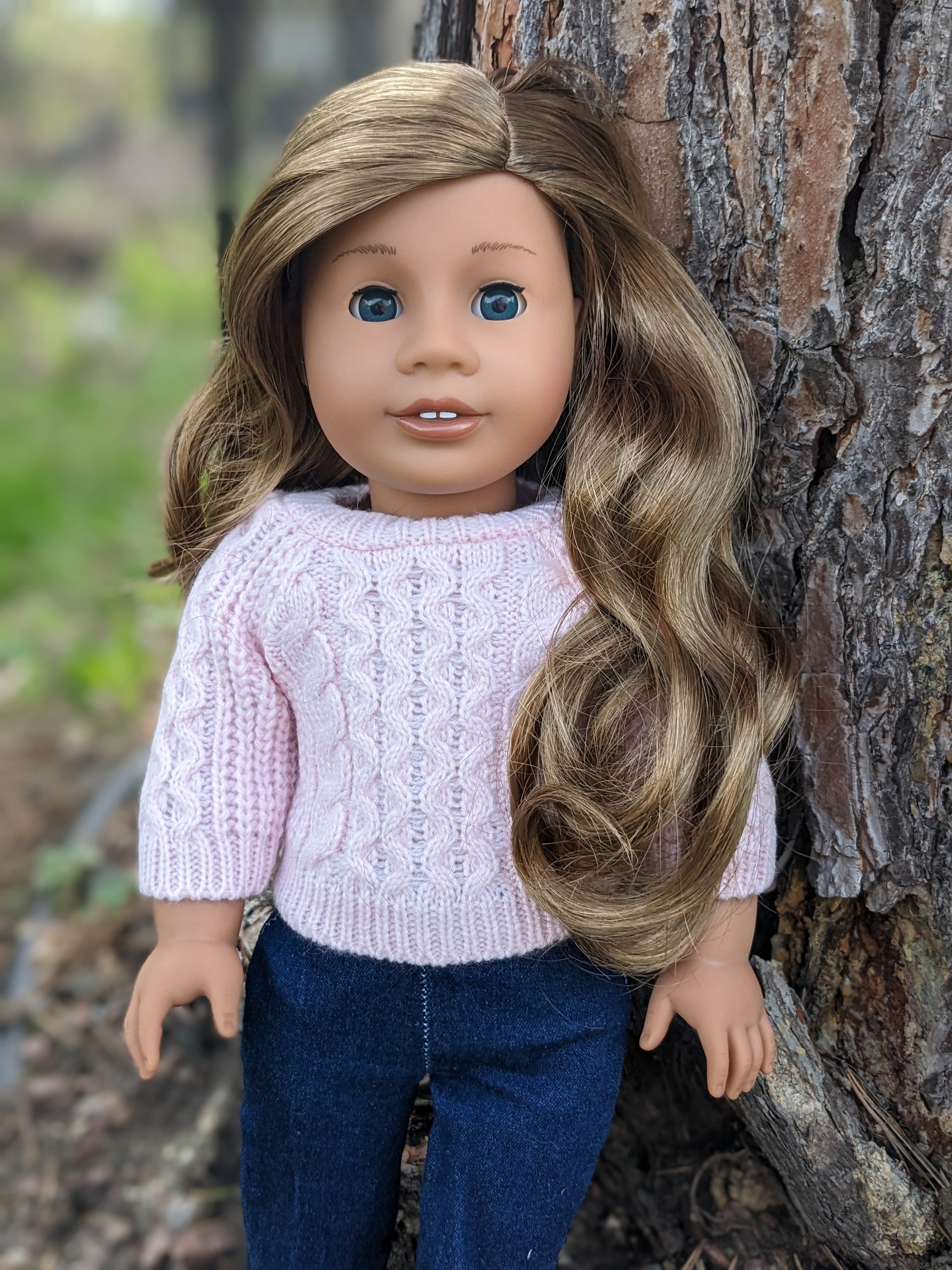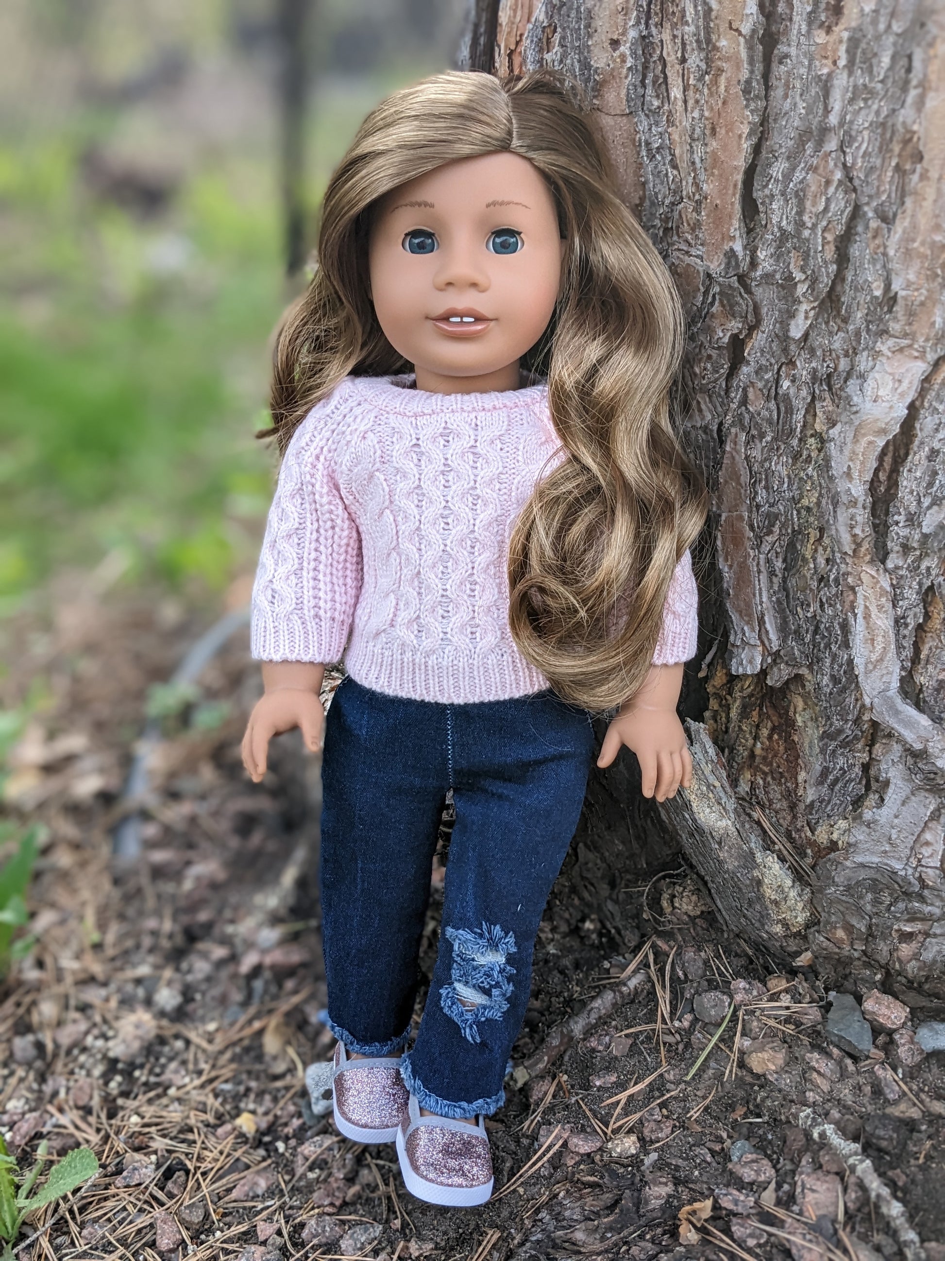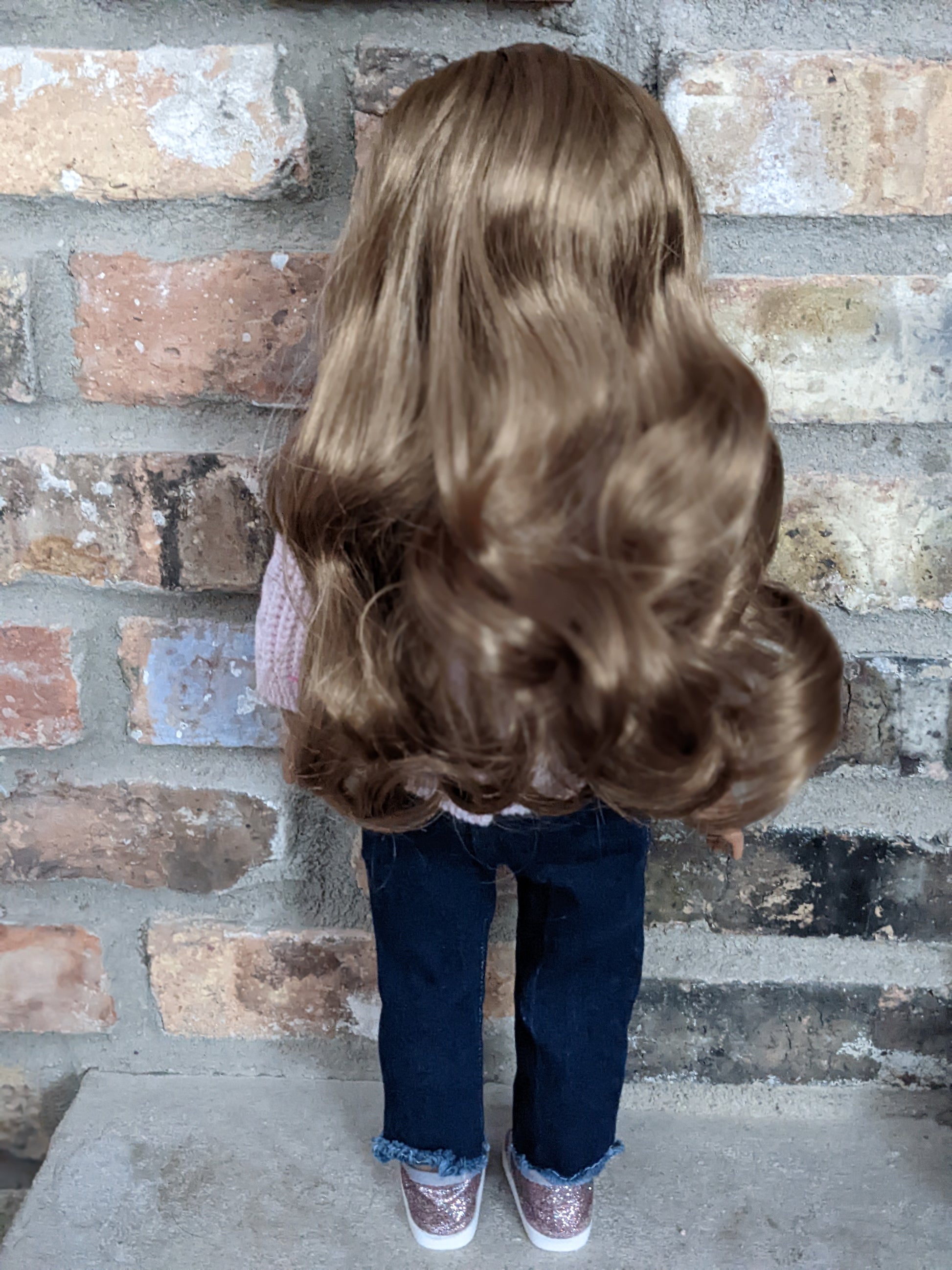 This one of a kind OOAK custom American Girl doll was created with a brand new TM doll, a caramel brown wig from a new TM doll, and dark blue eyes. She has lip gloss that was hand painted and sealed. She may have some minor shine marks from handling. She comes with the outfit pictured. She has the microfiber cloth body with permapanties and a tiny x on her bum.