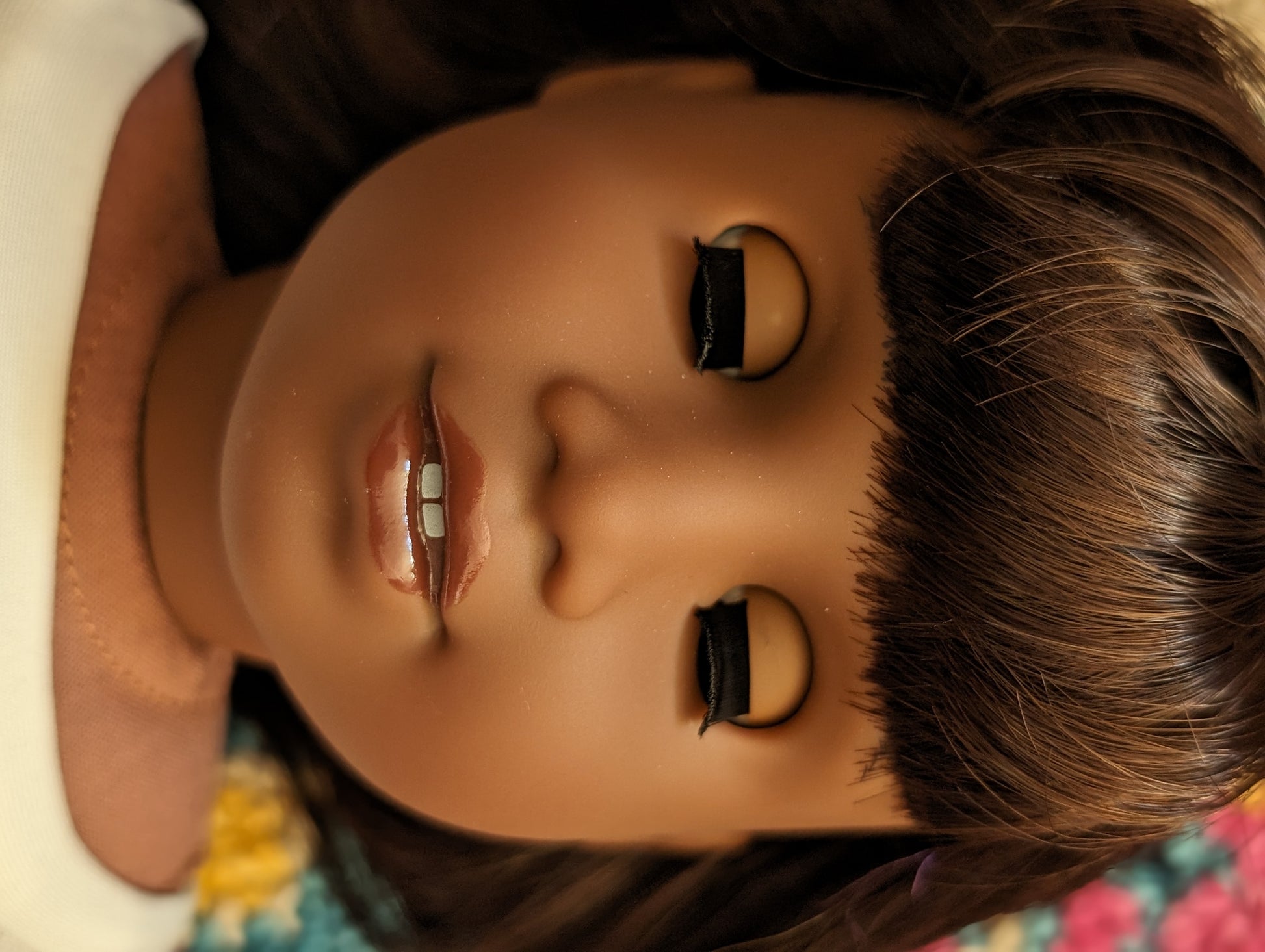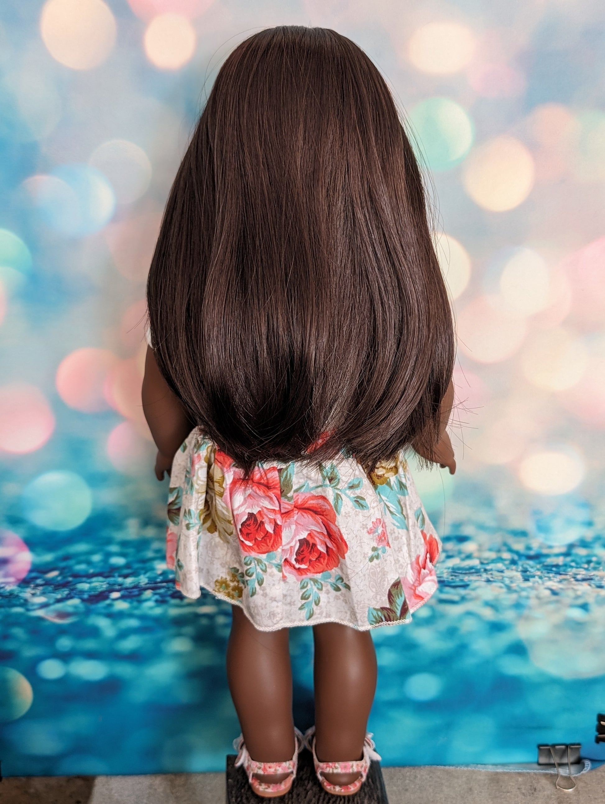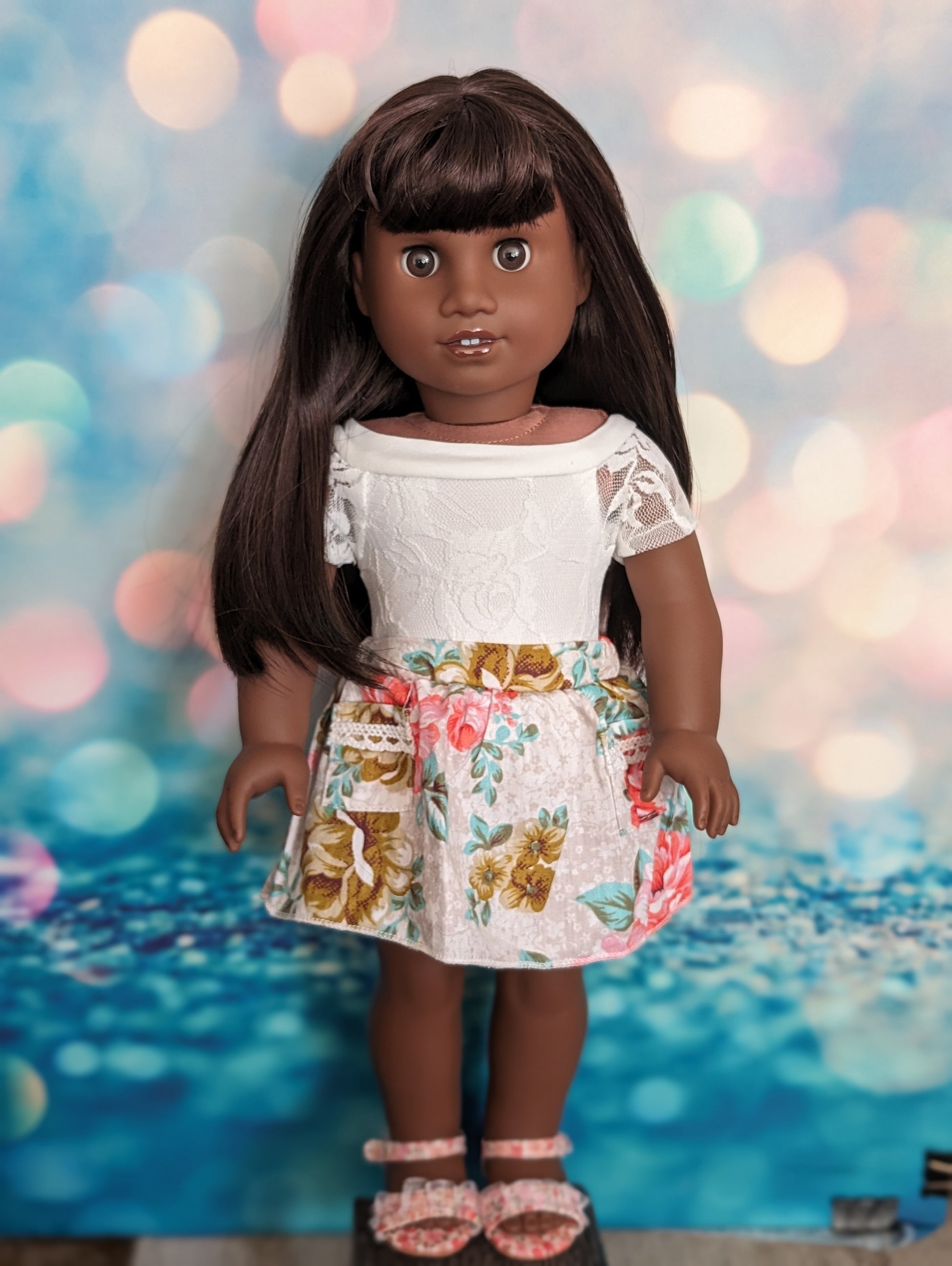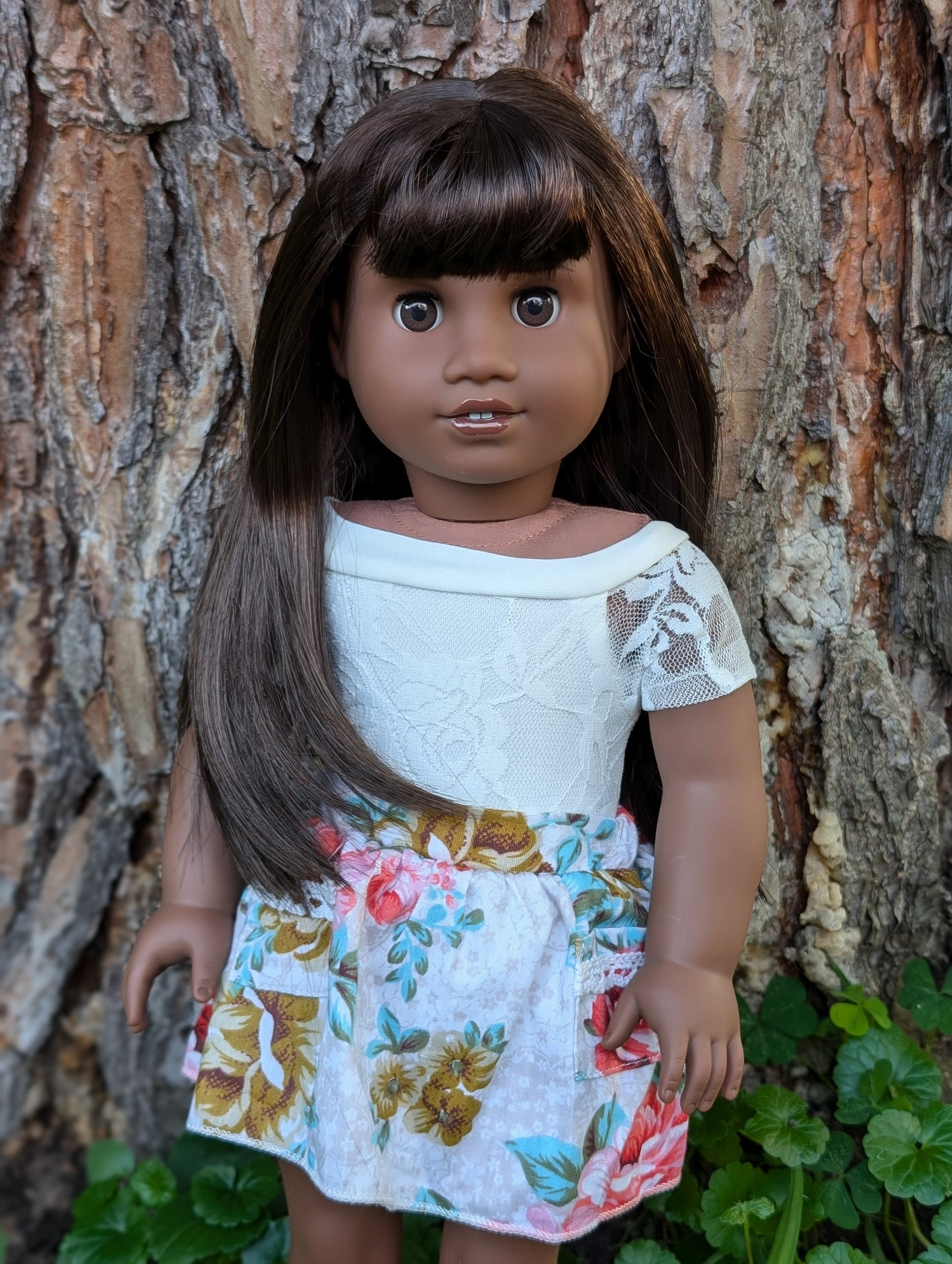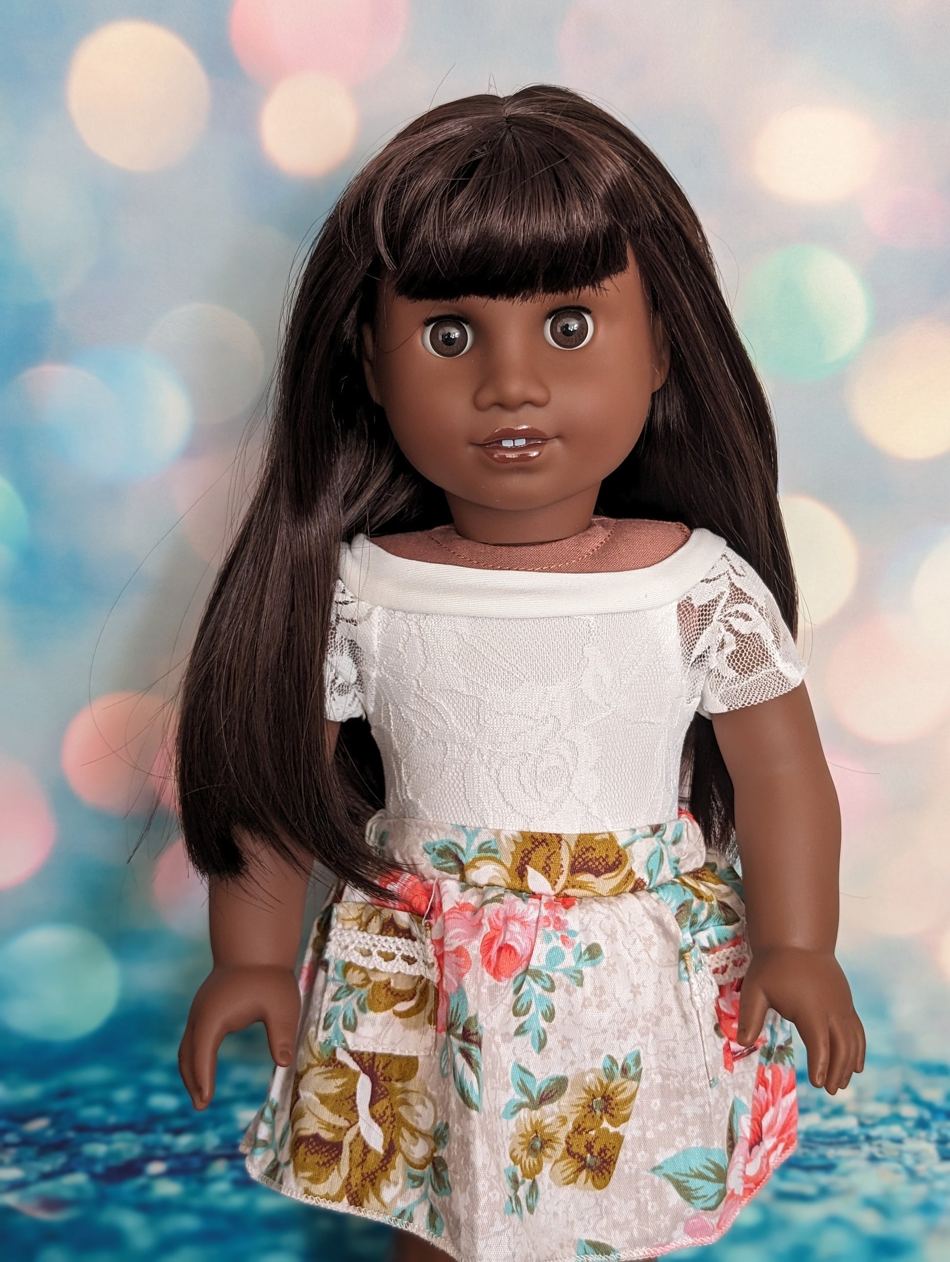 This one of a kind OOAK custom American Girl doll was created with a brand new Truly Me doll, a dark brown wig, and brown eyes. She has lip gloss that was hand painted and sealed. She may have some minor shine marks from handling.