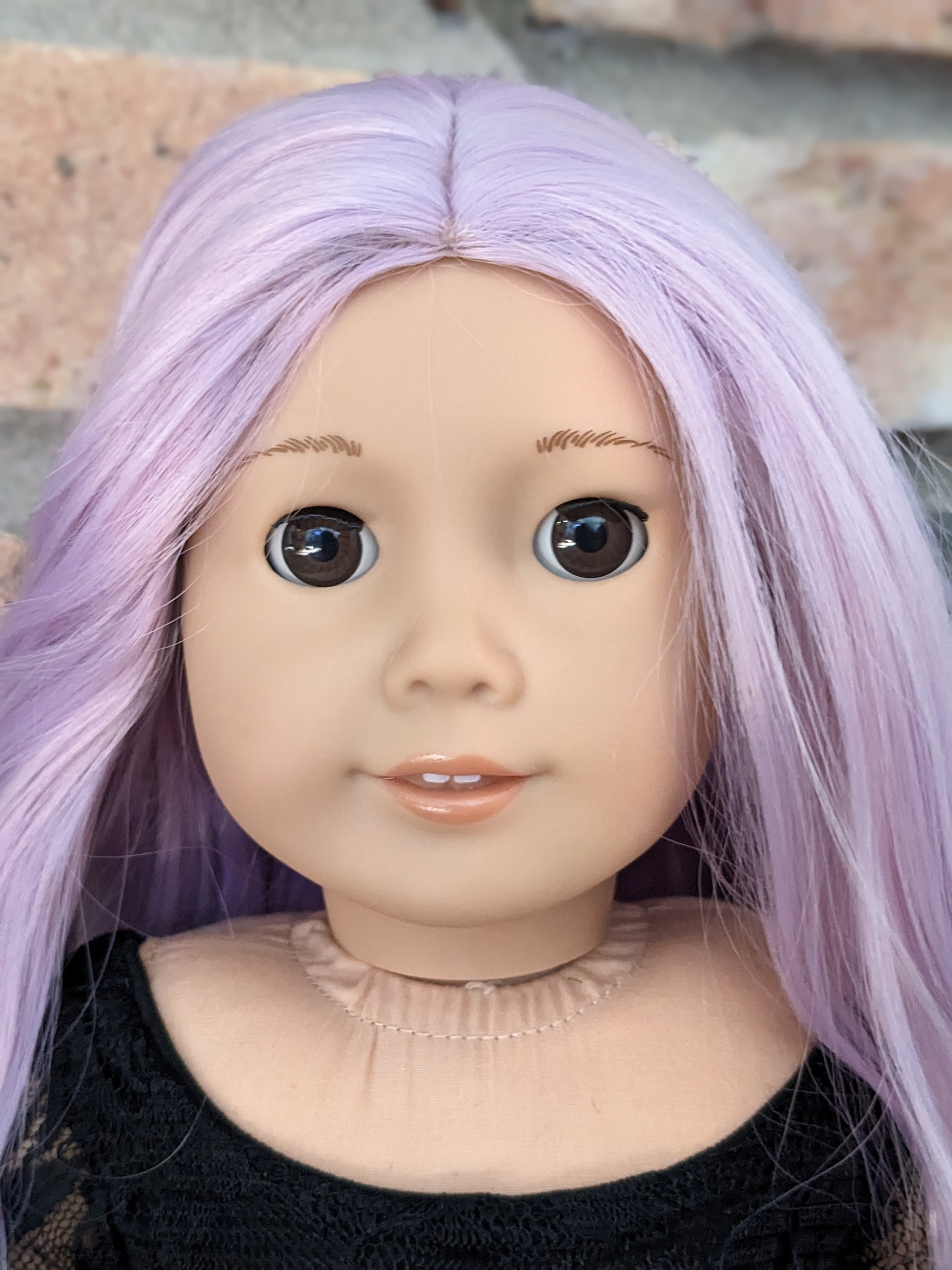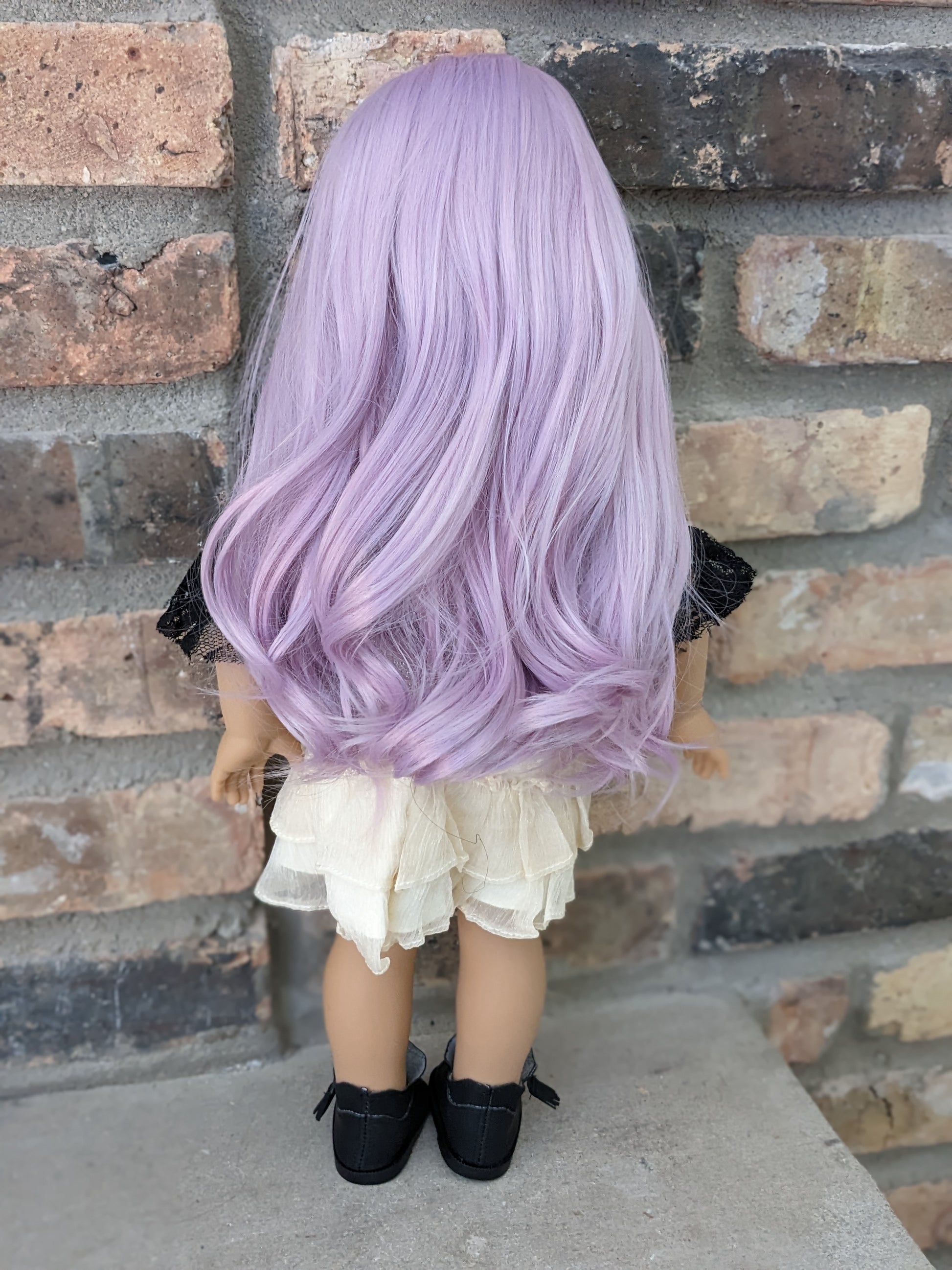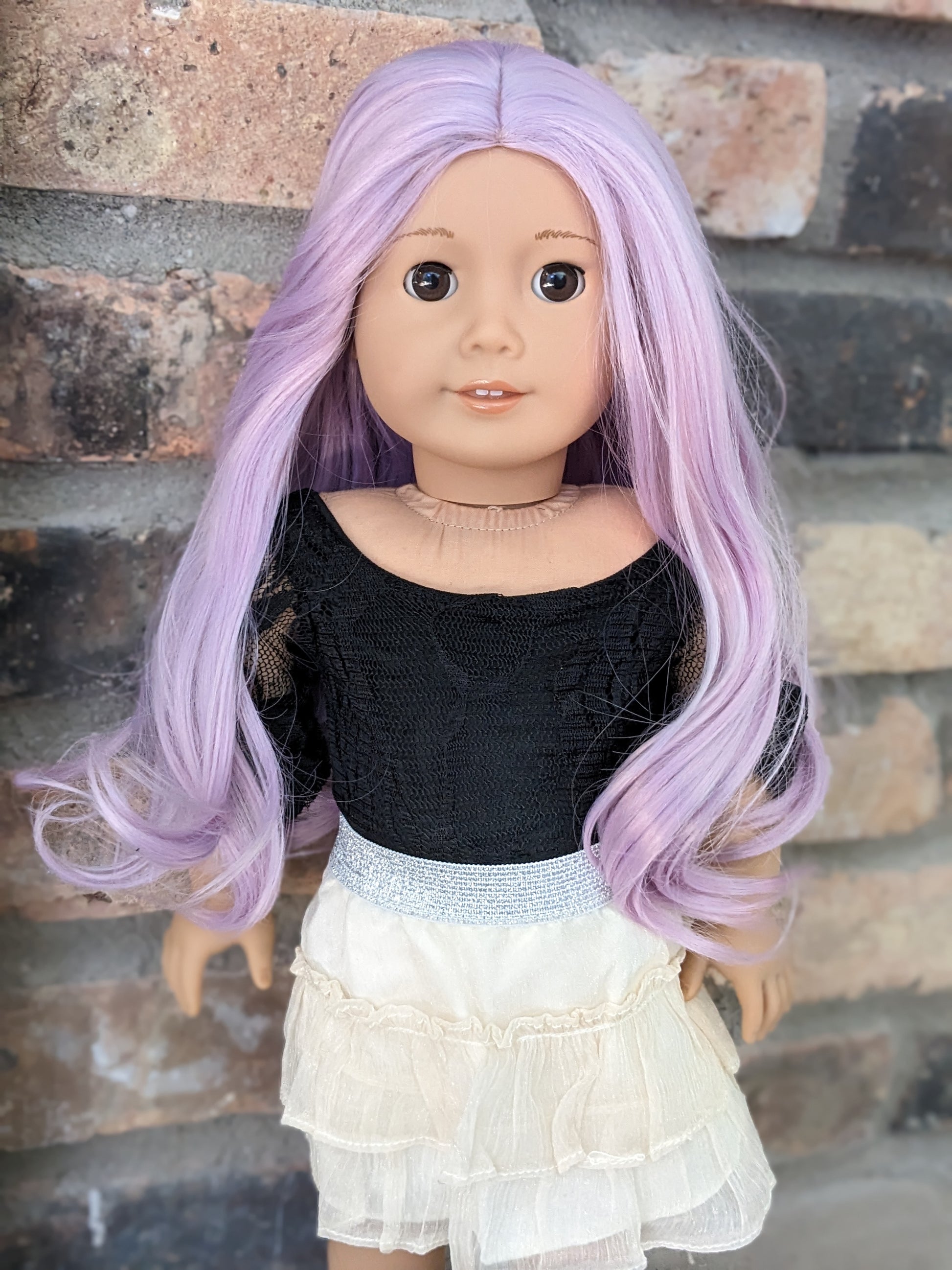 This one of a kind OOAK custom American Girl doll was created with a new doll, a lavender wig, and brown eyes. She has lip gloss that was hand painted and sealed. She may have some minor shine marks from handling. She comes with the outfit pictured. She has the microfiber cloth body with permapanties and a tiny x on her bum.