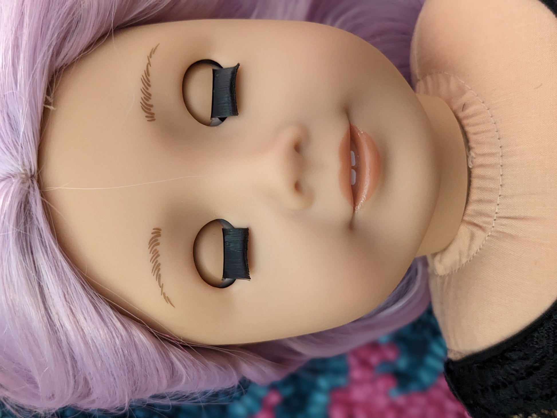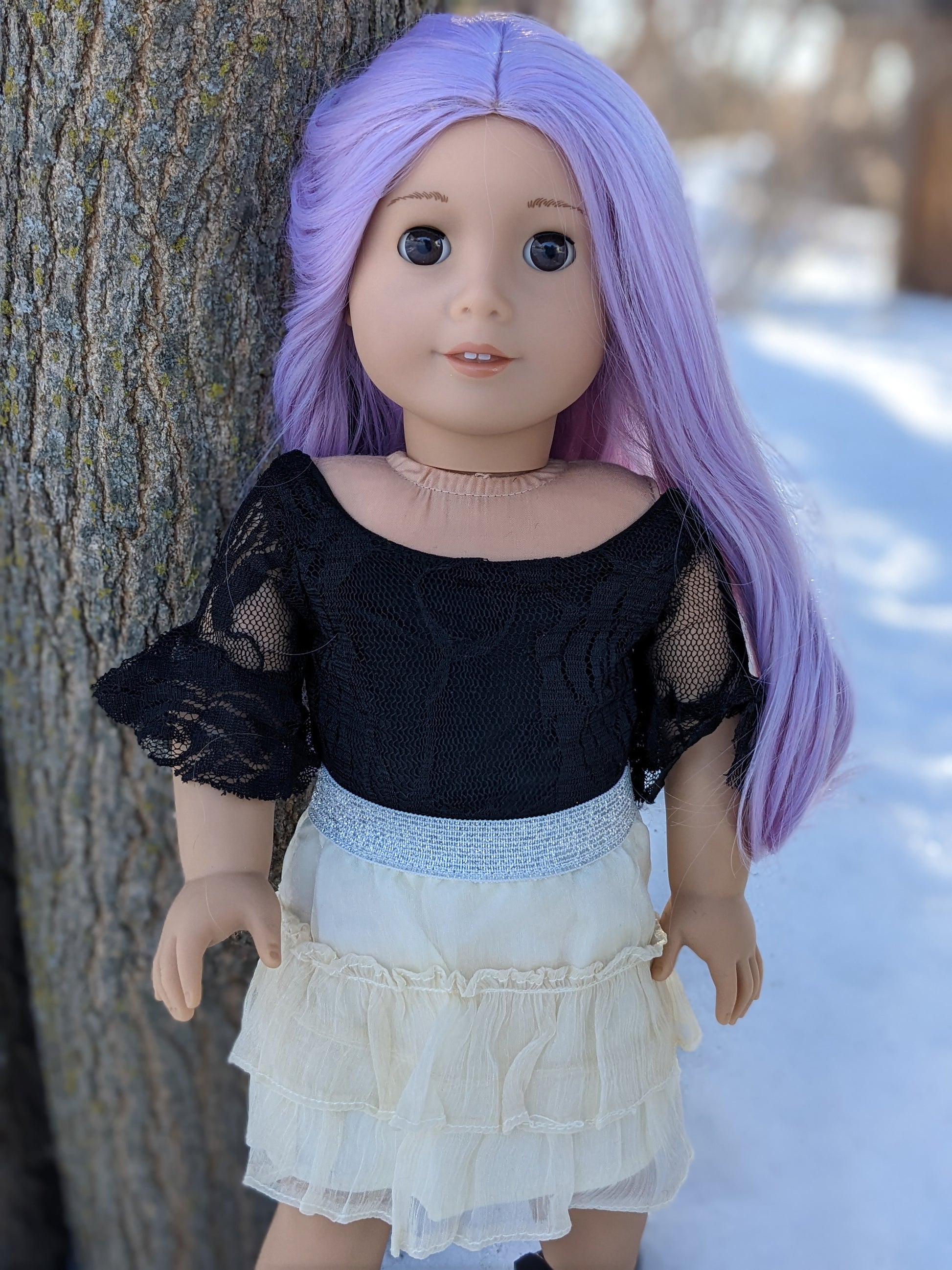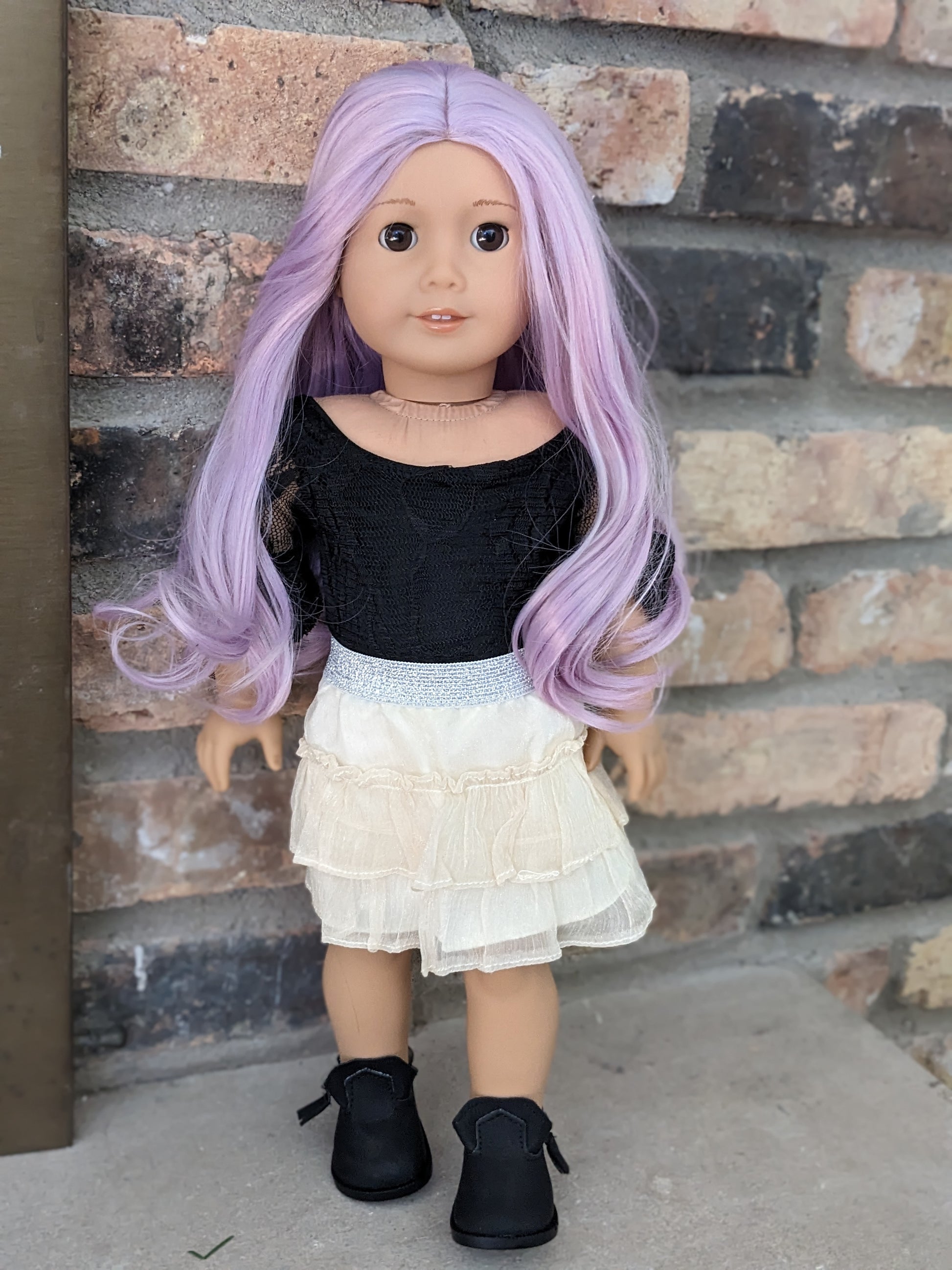 This one of a kind OOAK custom American Girl doll was created with a new doll, a lavender wig, and brown eyes. She has lip gloss that was hand painted and sealed. She may have some minor shine marks from handling. She comes with the outfit pictured. She has the microfiber cloth body with permapanties and a tiny x on her bum.