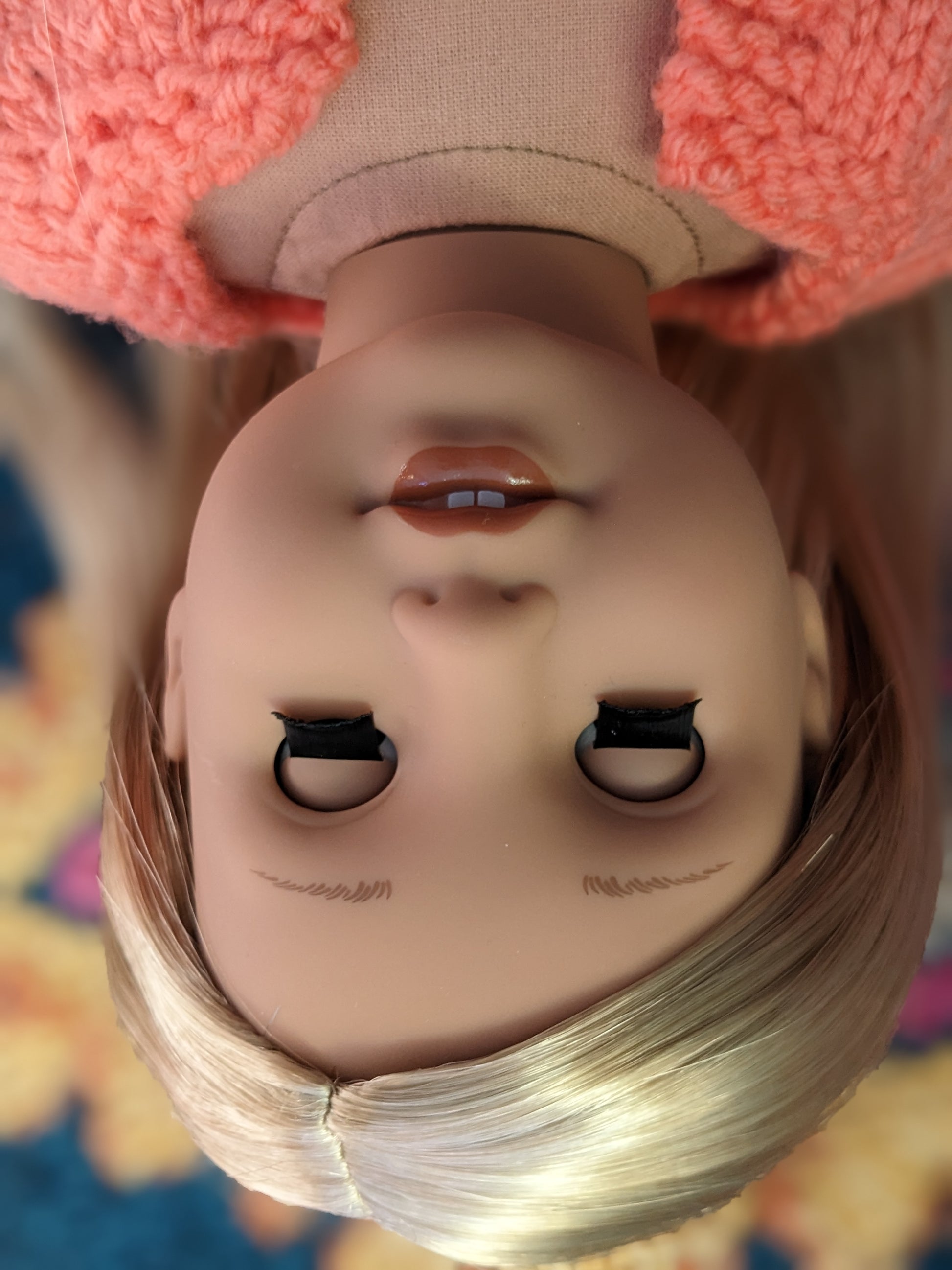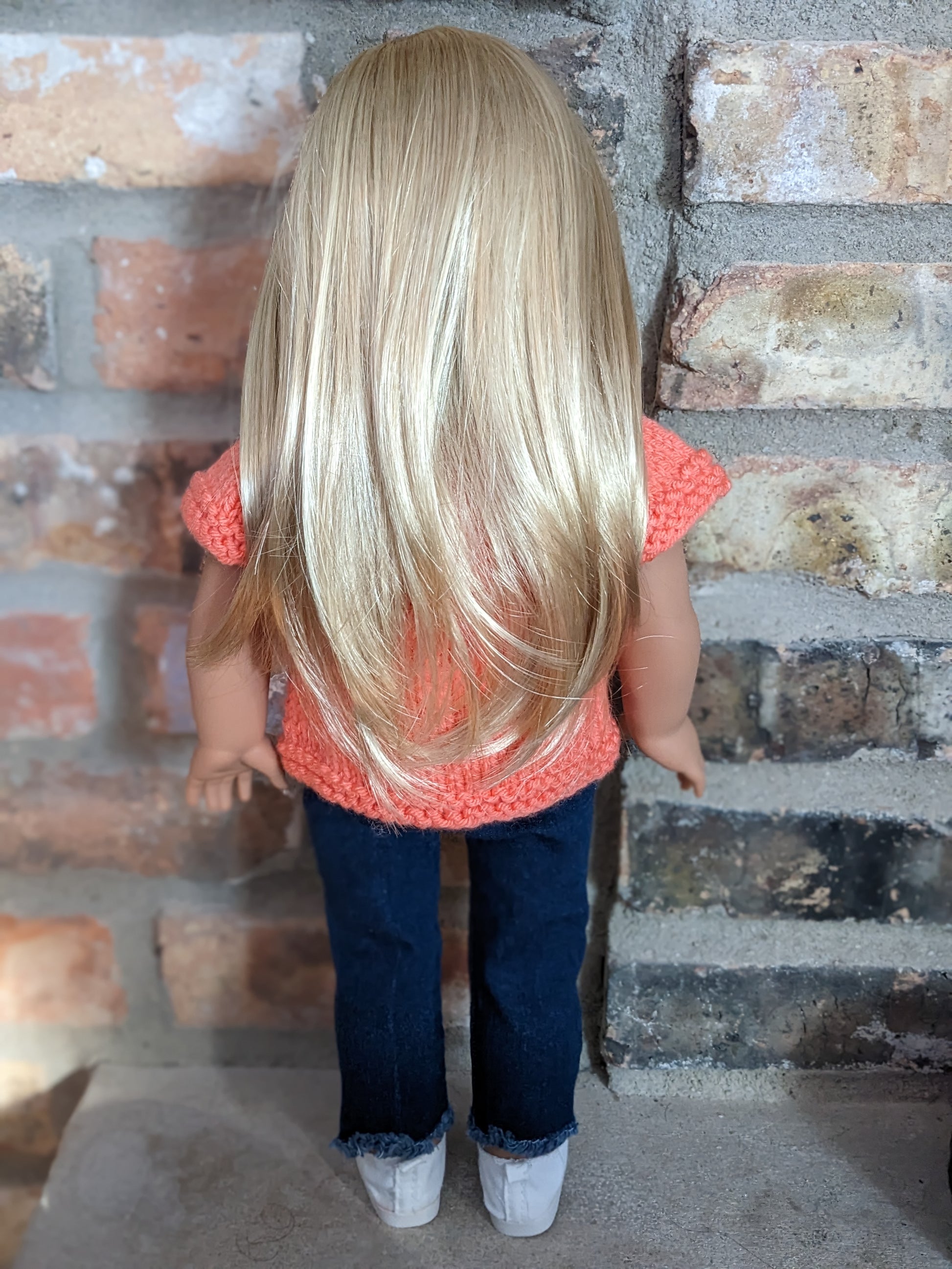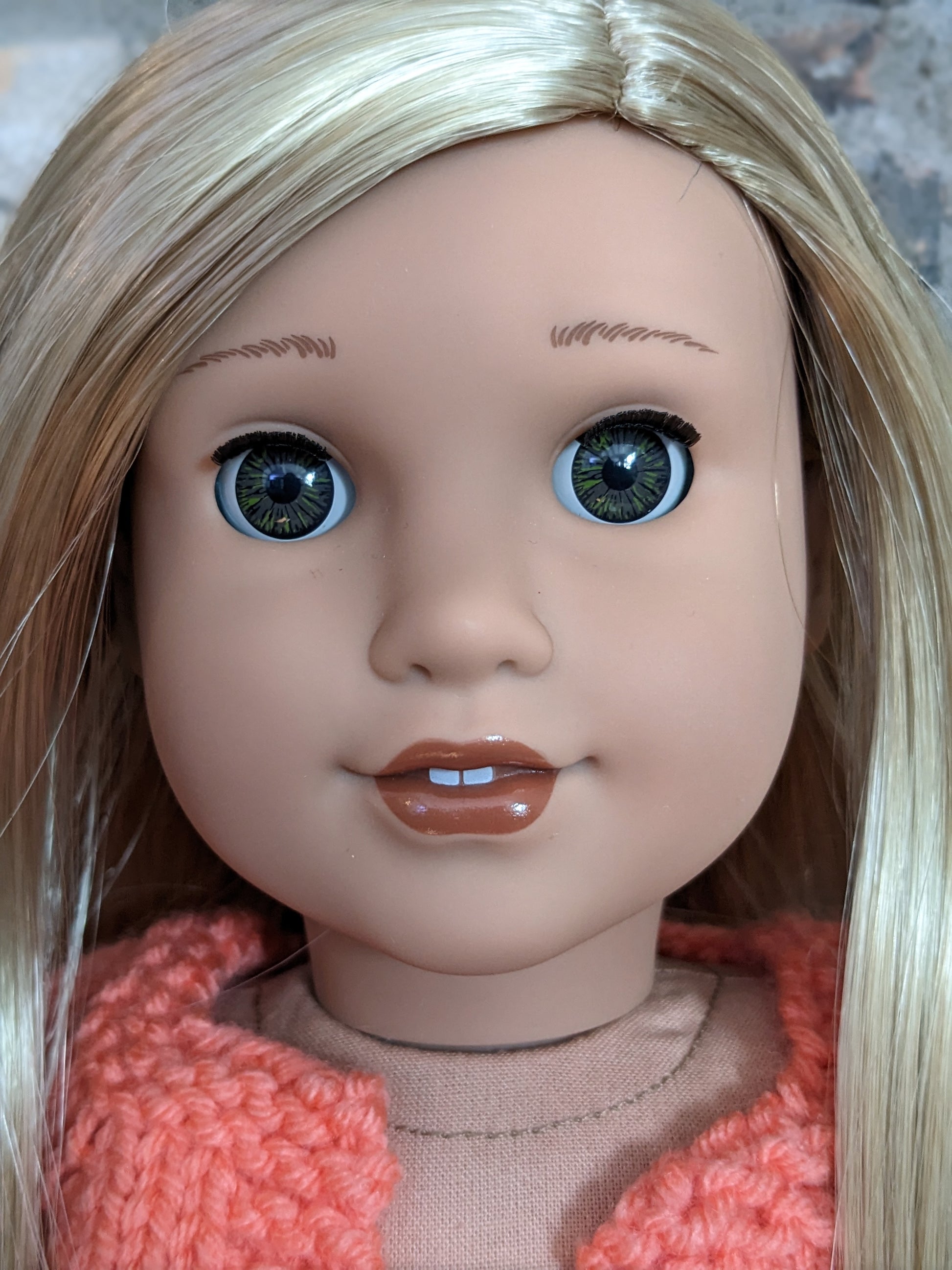 This one of a kind OOAK custom American Girl doll was created with a new doll, a light blonde wig, and hazel eyes. She has lip gloss that was hand painted and sealed. She may have some minor shine marks from handling. She comes with the outfit pictured.