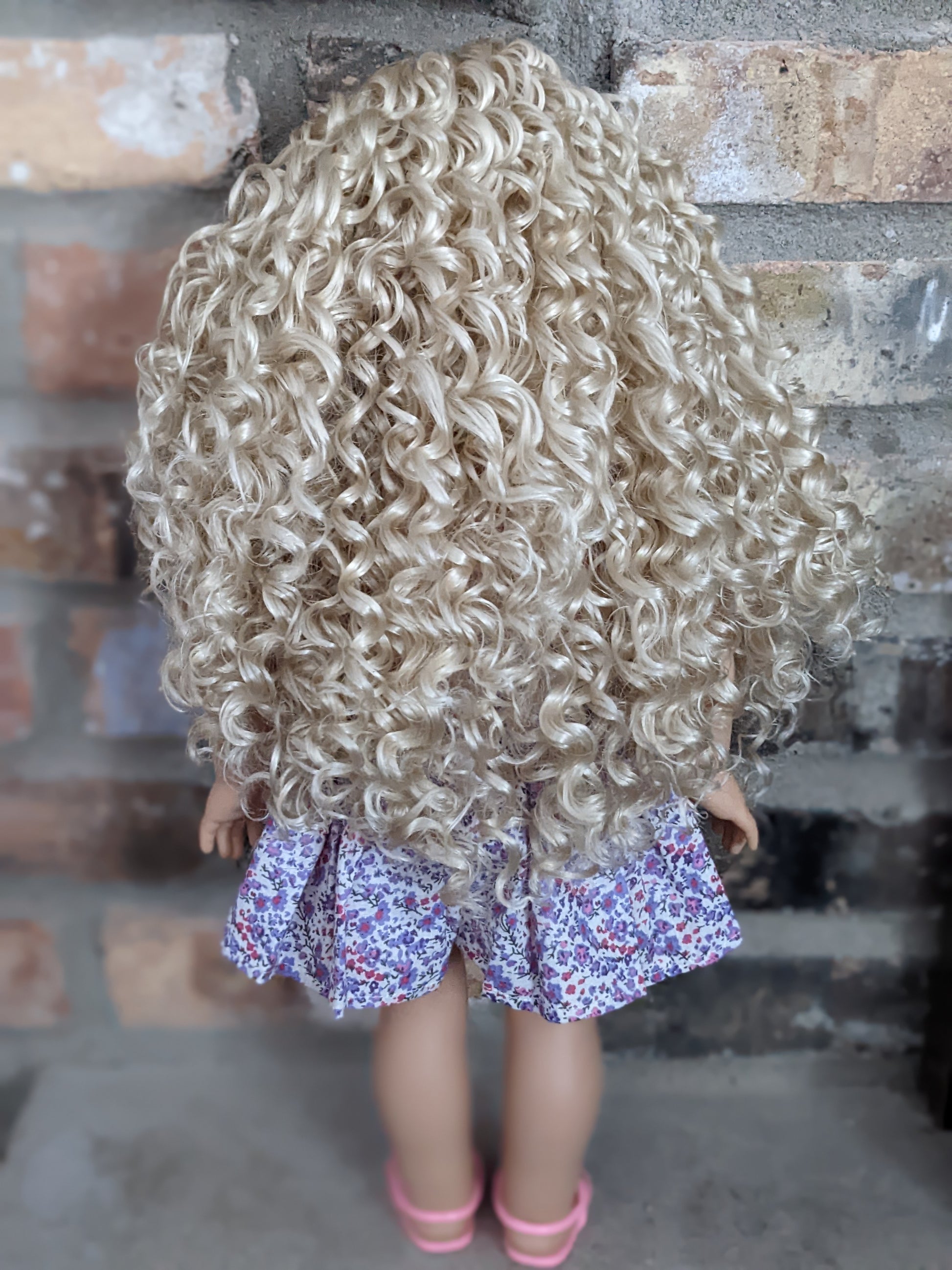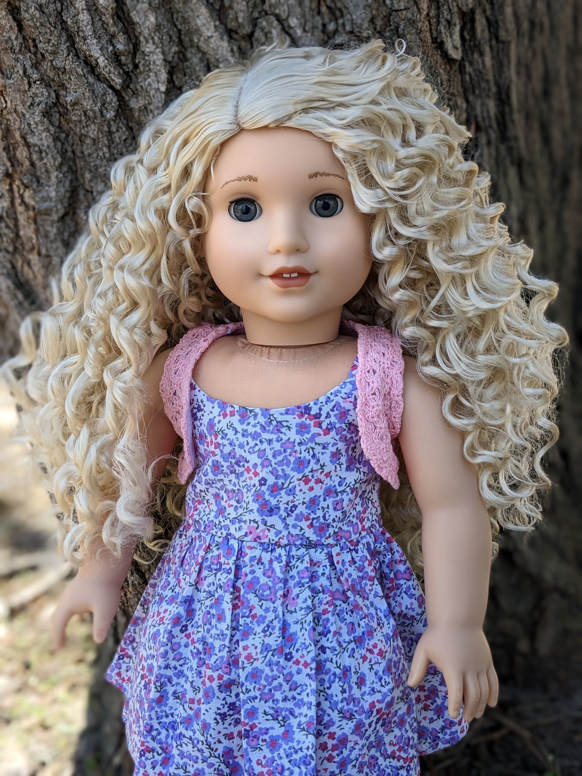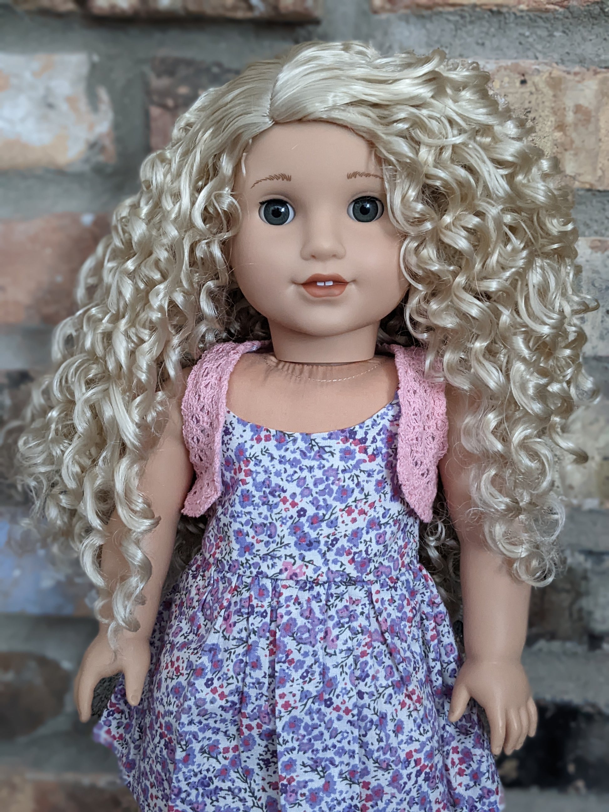 This one of a kind OOAK custom American Girl doll was created with a gently used Blaire doll, a pale blonde curly wig, and grey eyes. She has lip gloss that was hand painted and sealed. She may have some minor shine marks from handling. She comes with the outfit pictured. She has the microfiber cloth body.