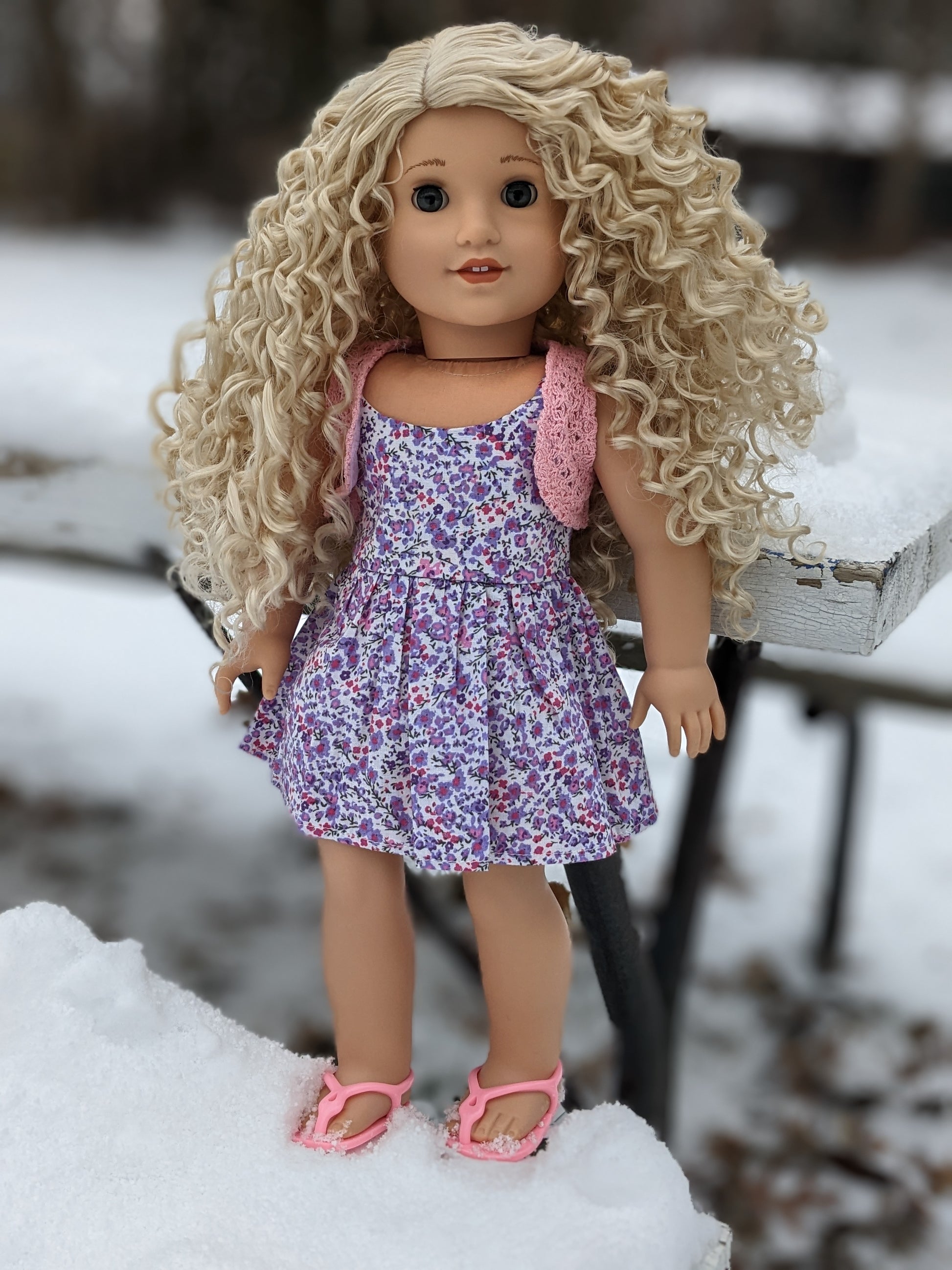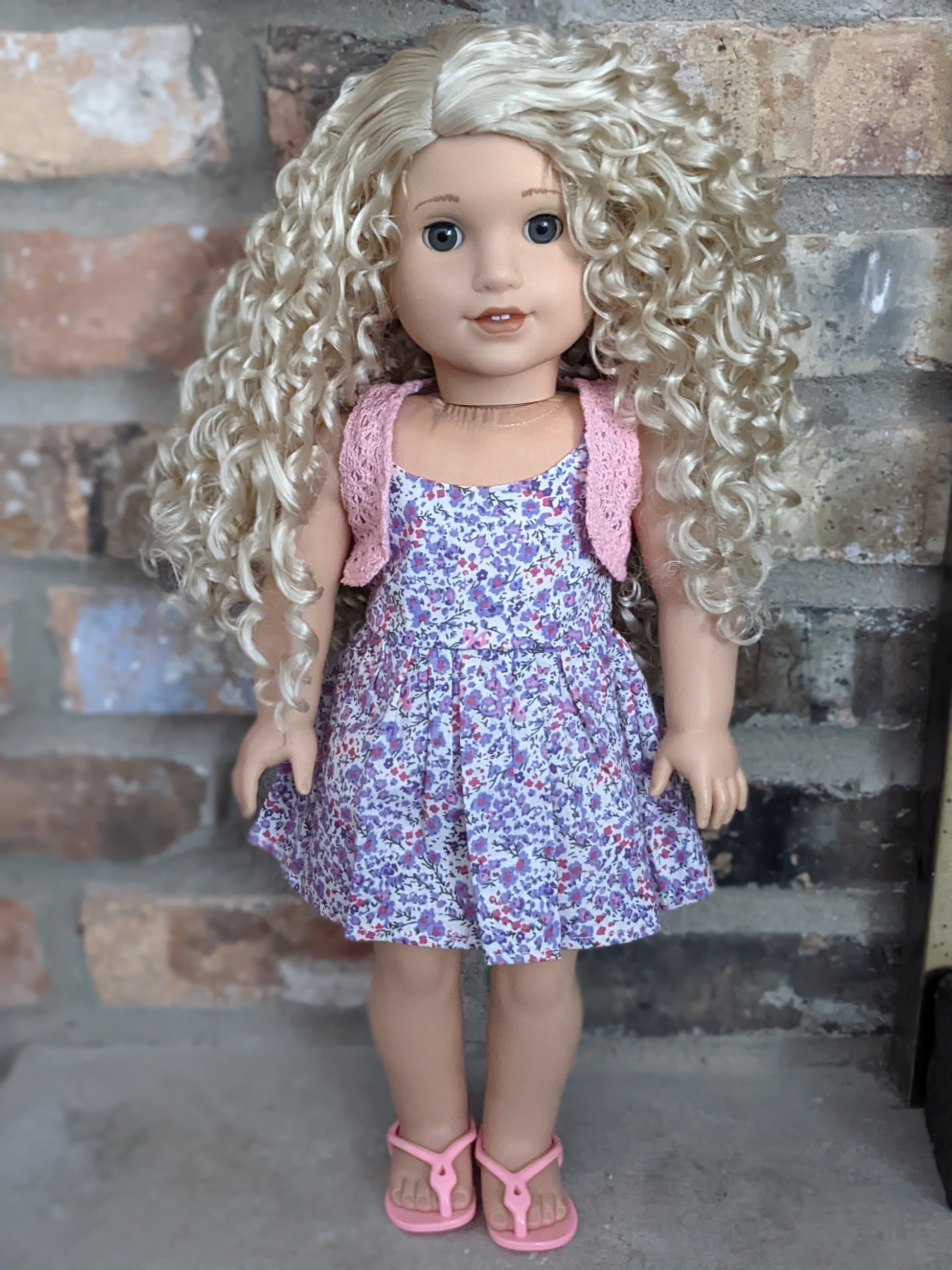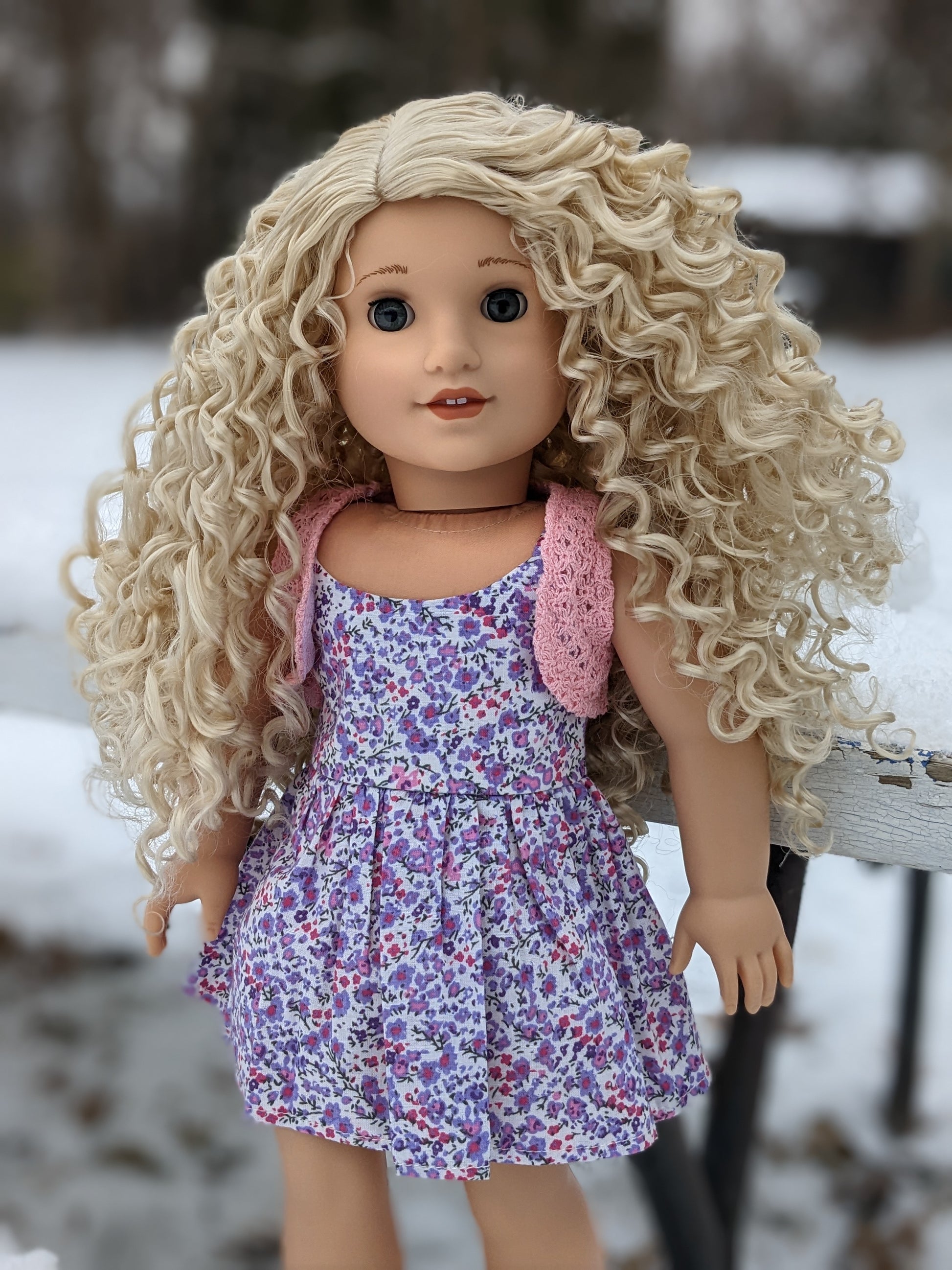 This one of a kind OOAK custom American Girl doll was created with a gently used Blaire doll, a pale blonde curly wig, and grey eyes. She has lip gloss that was hand painted and sealed. She may have some minor shine marks from handling. She comes with the outfit pictured. She has the microfiber cloth body.
