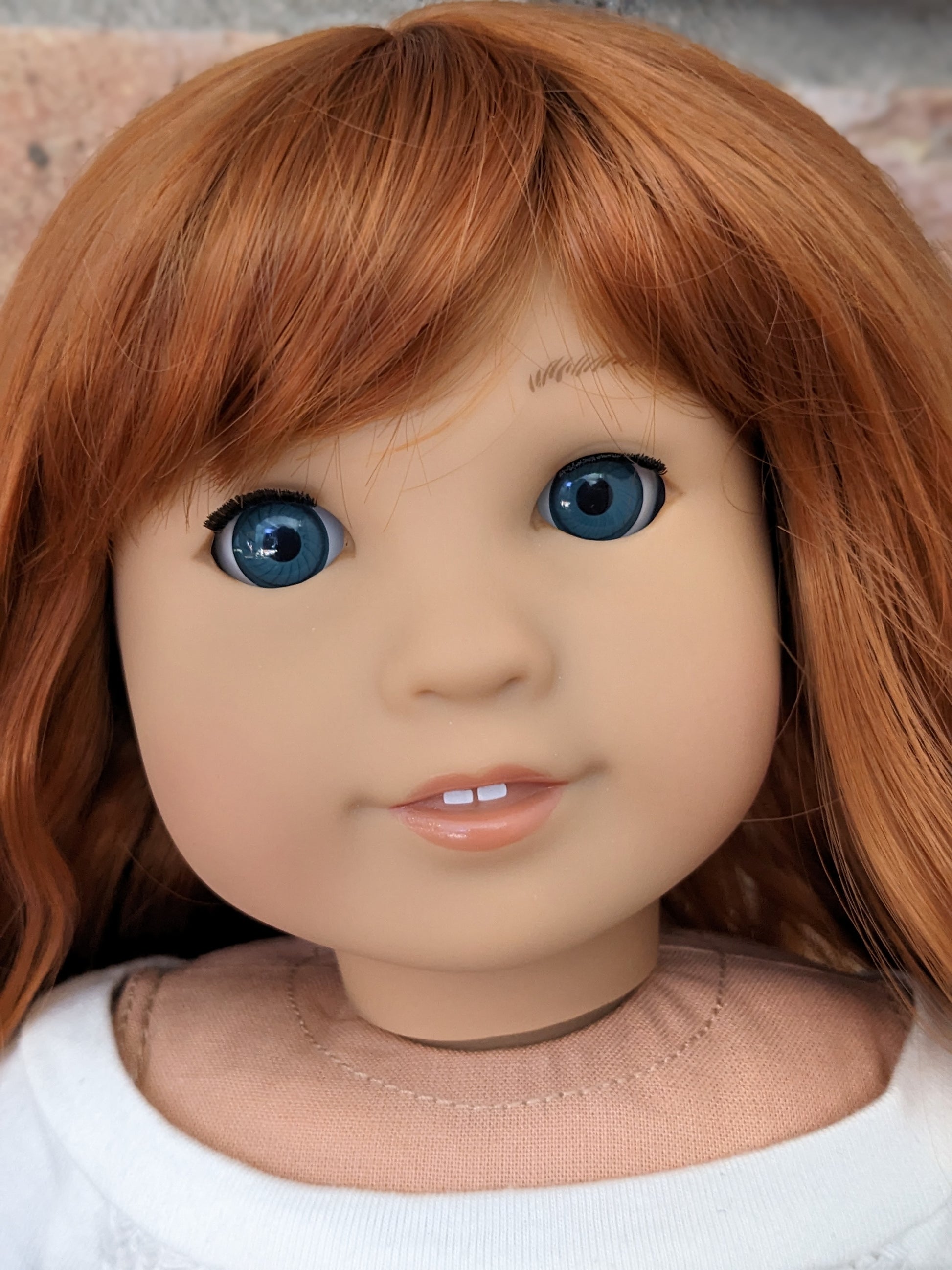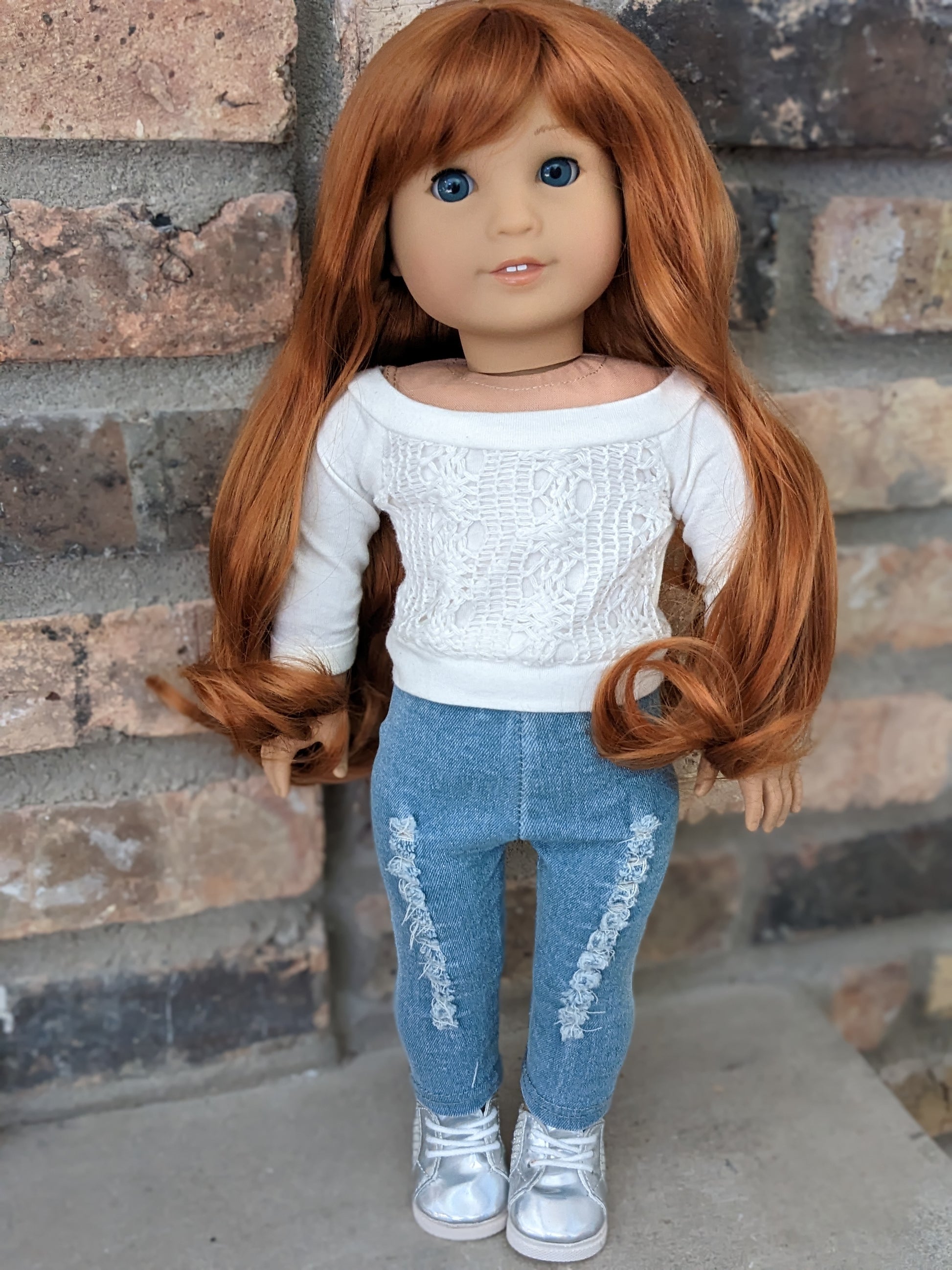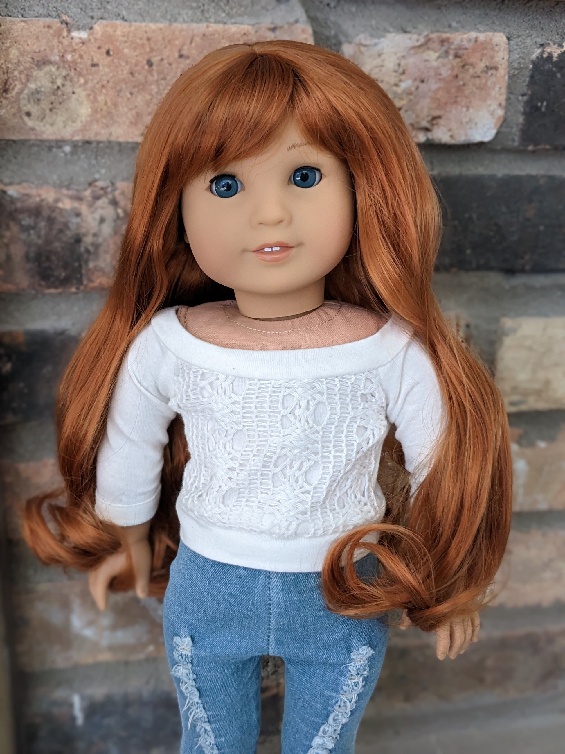 This one of a kind OOAK custom American Girl doll was created with a new doll, a red wig, and blue eyes. She has lip gloss that was hand painted and sealed. She may have some minor shine marks from handling. She comes with the outfit pictured.