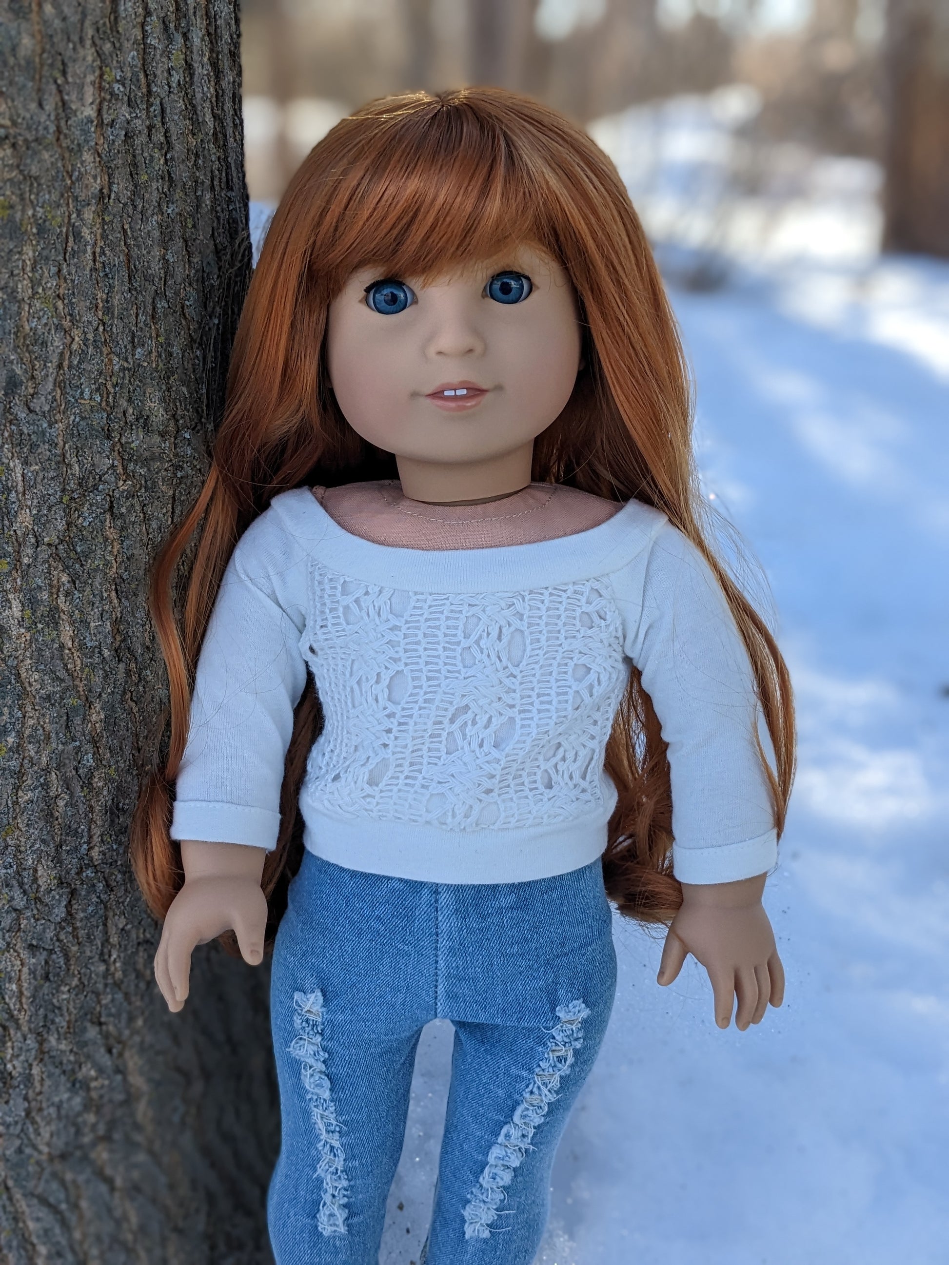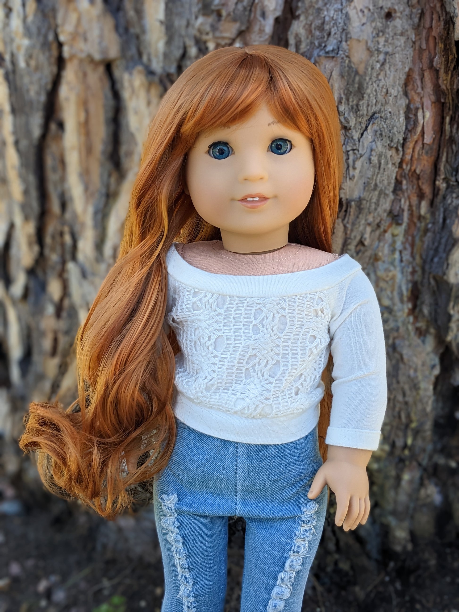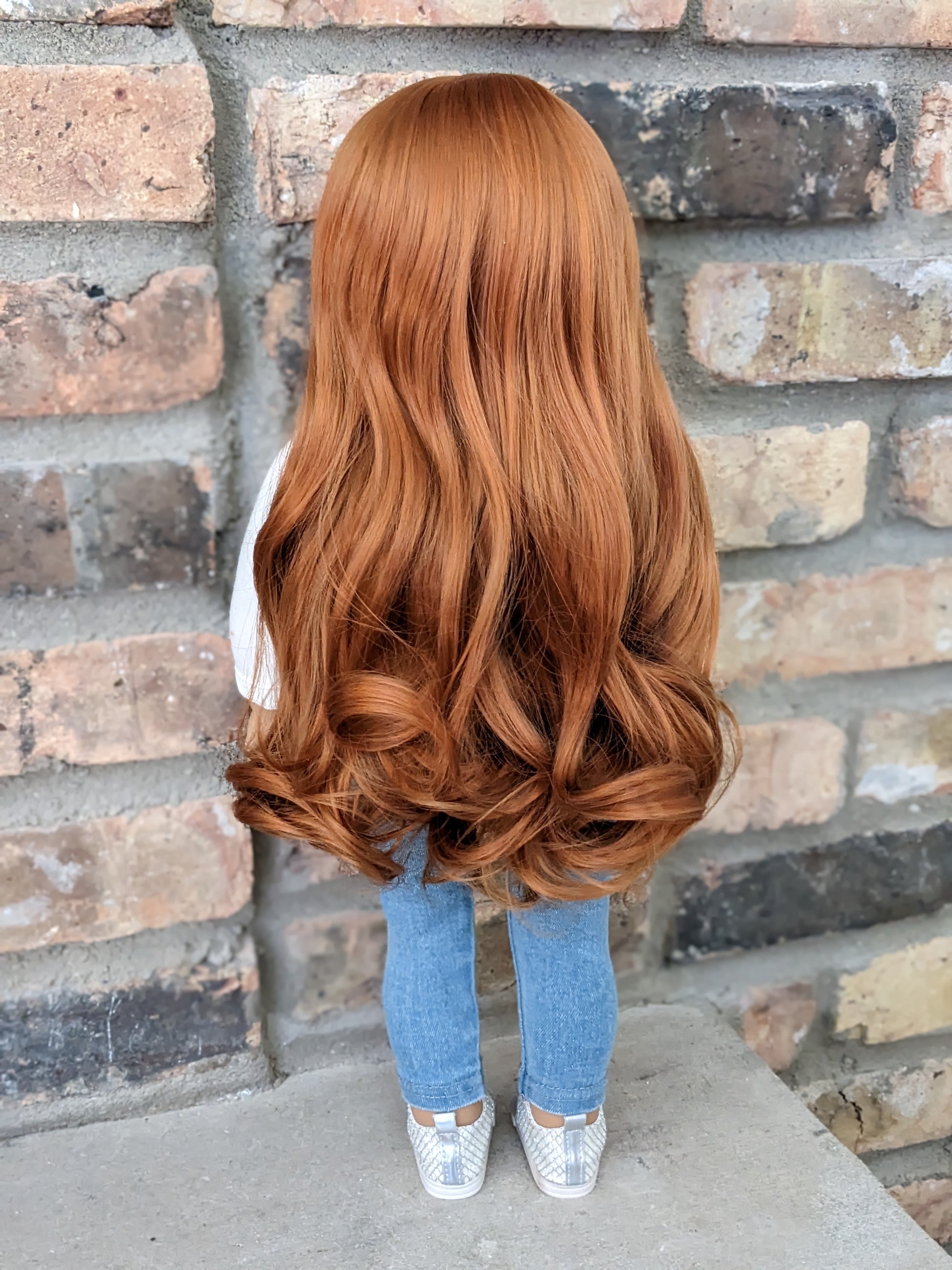 This one of a kind OOAK custom American Girl doll was created with a new doll, a red wig, and blue eyes. She has lip gloss that was hand painted and sealed. She may have some minor shine marks from handling. She comes with the outfit pictured.