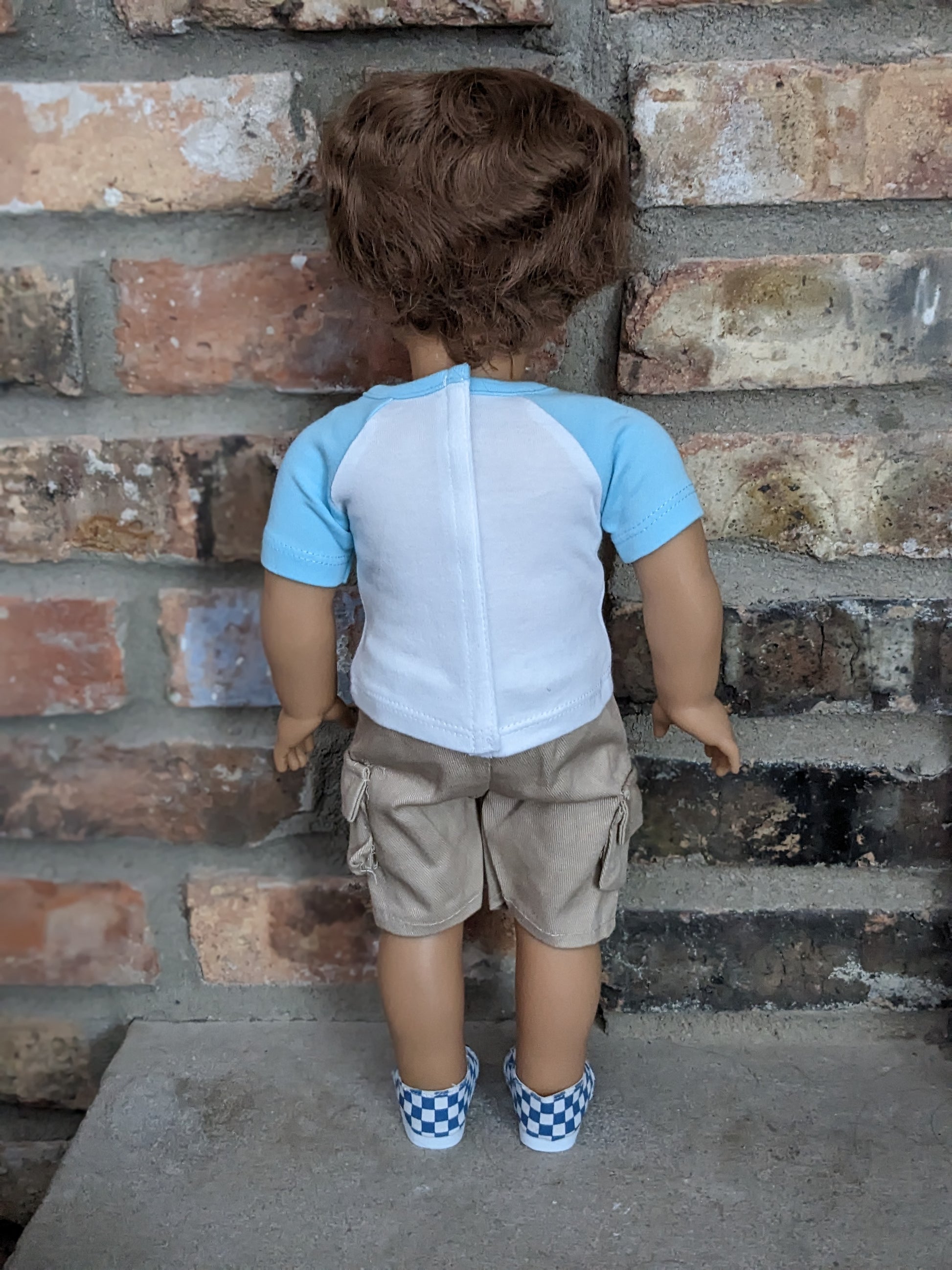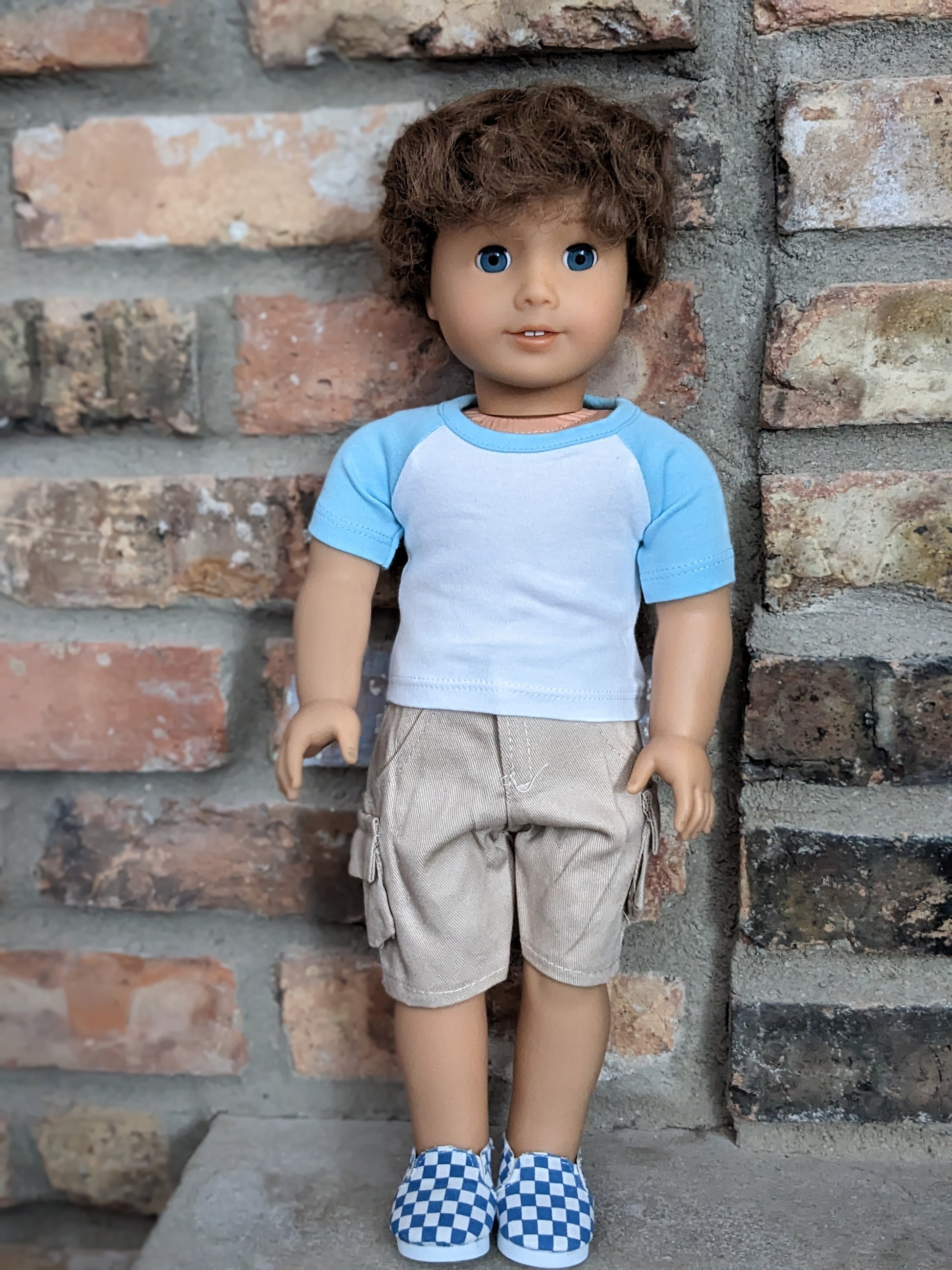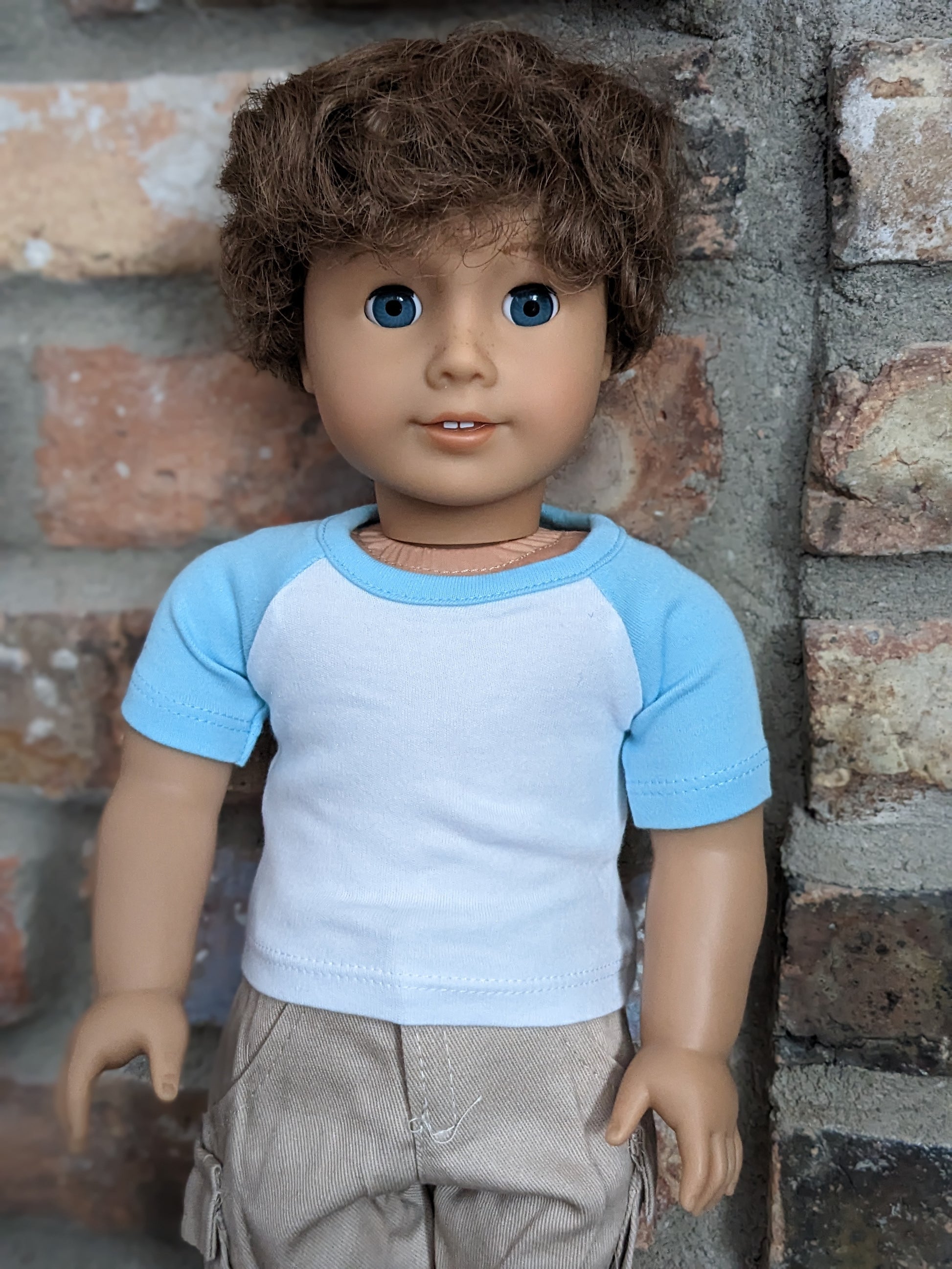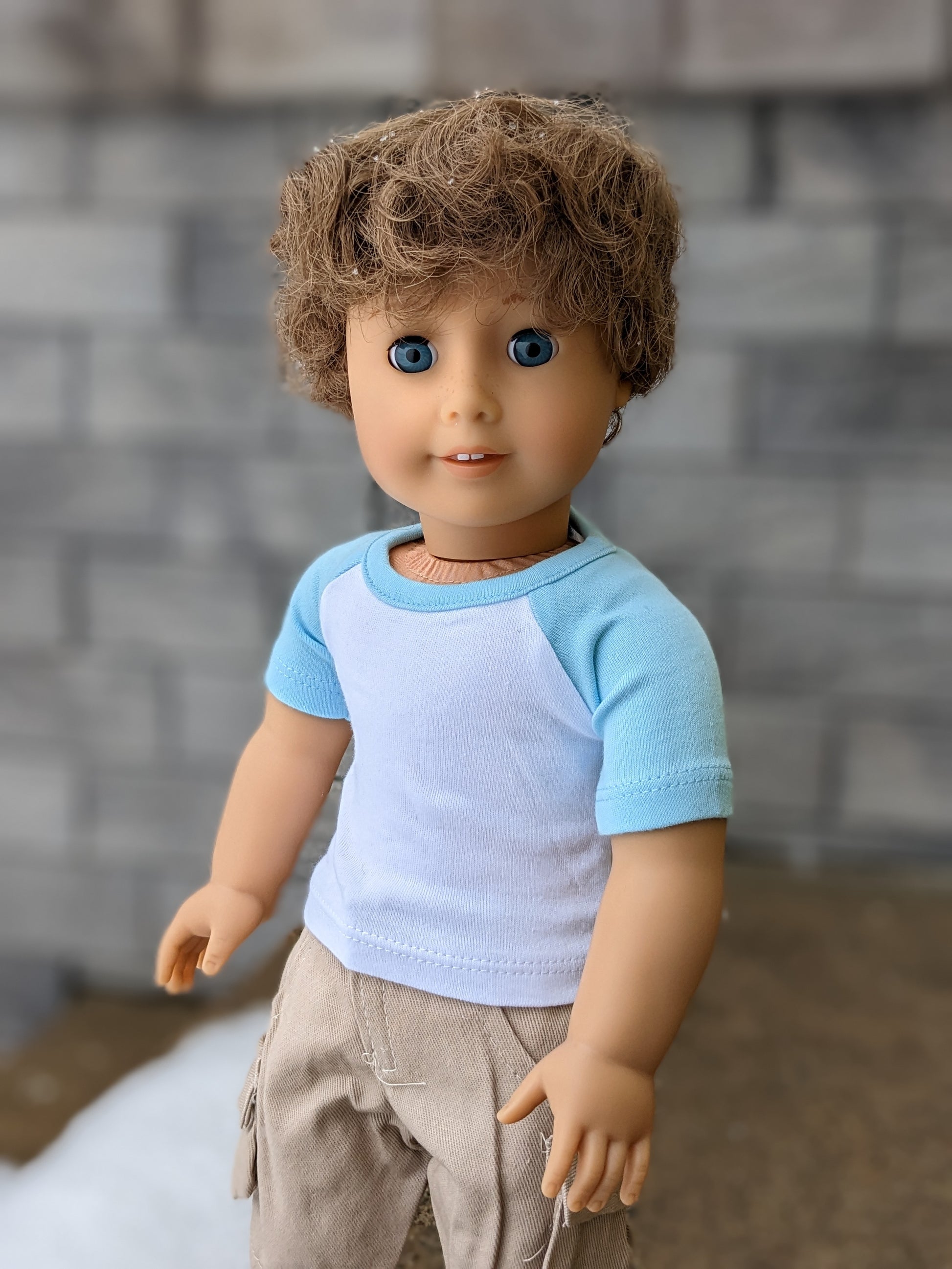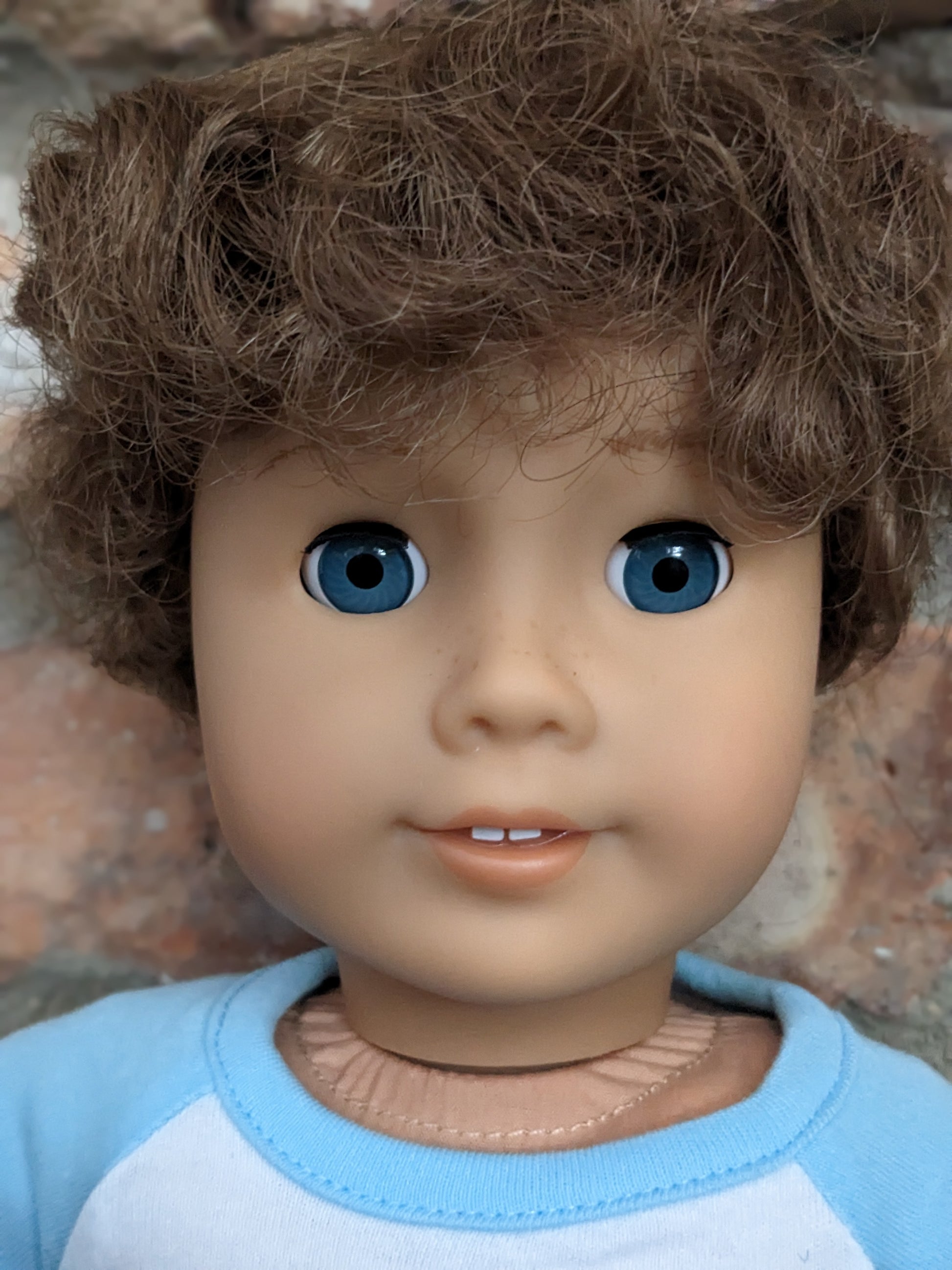 This one of a kind OOAK custom American Girl doll was created with a brand new Truly Me doll, a brown wig, and blue eyes. He may have some minor shine marks from handling. He comes with the outfit pictured. He has the two part eyes used by American Girl from around 2017-2019. He also has a microfiber cloth body.