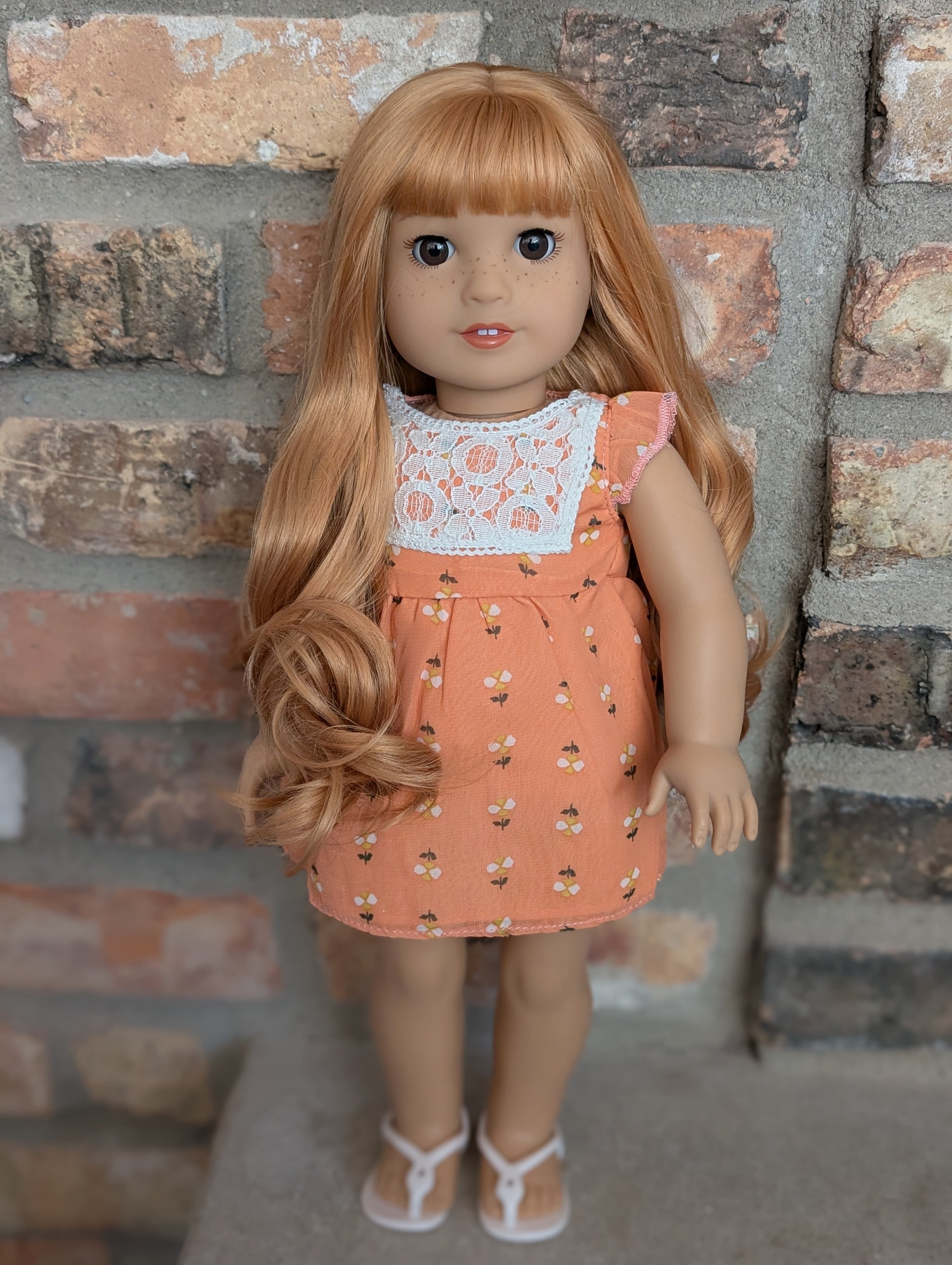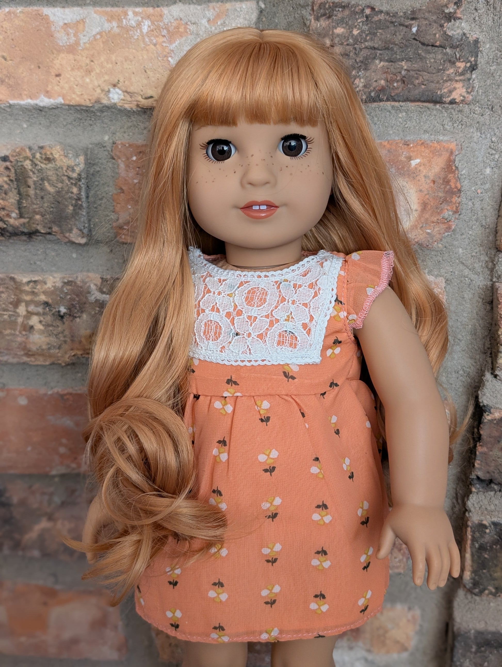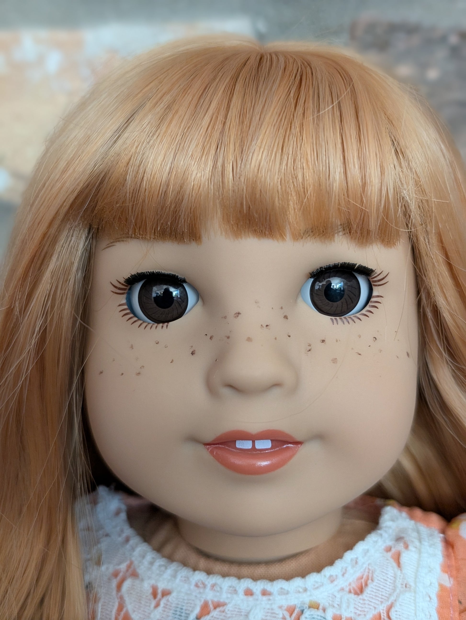 This one of a kind OOAK custom American Girl doll was created with a brand new doll, a light red wig, and brown eyes. She has lip gloss and freckles that were hand painted and sealed. She may have some minor shine marks from handling. She comes with the outfit pictured.