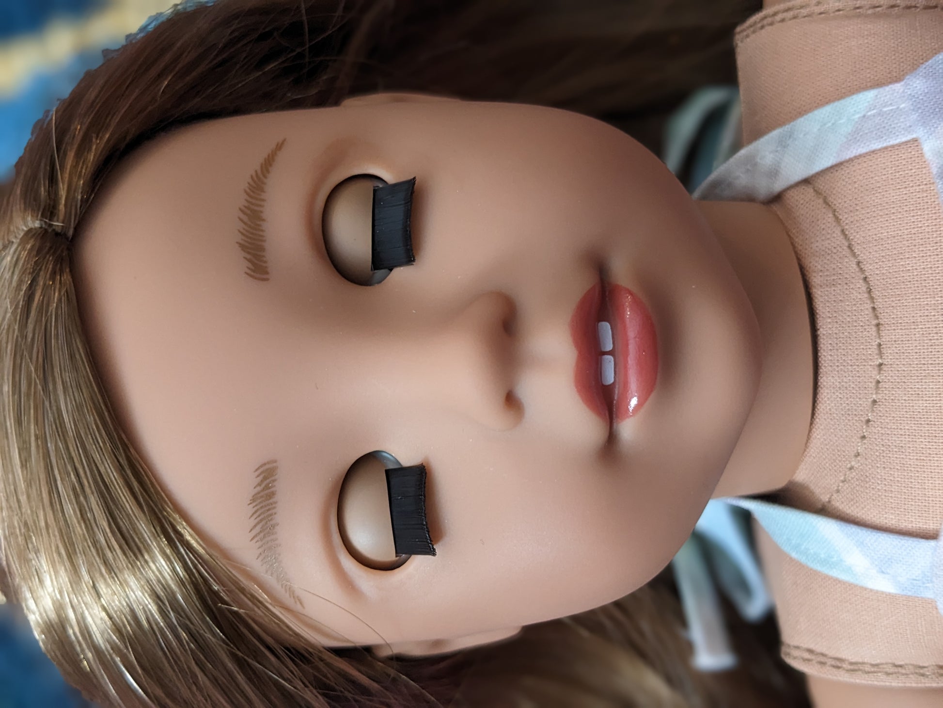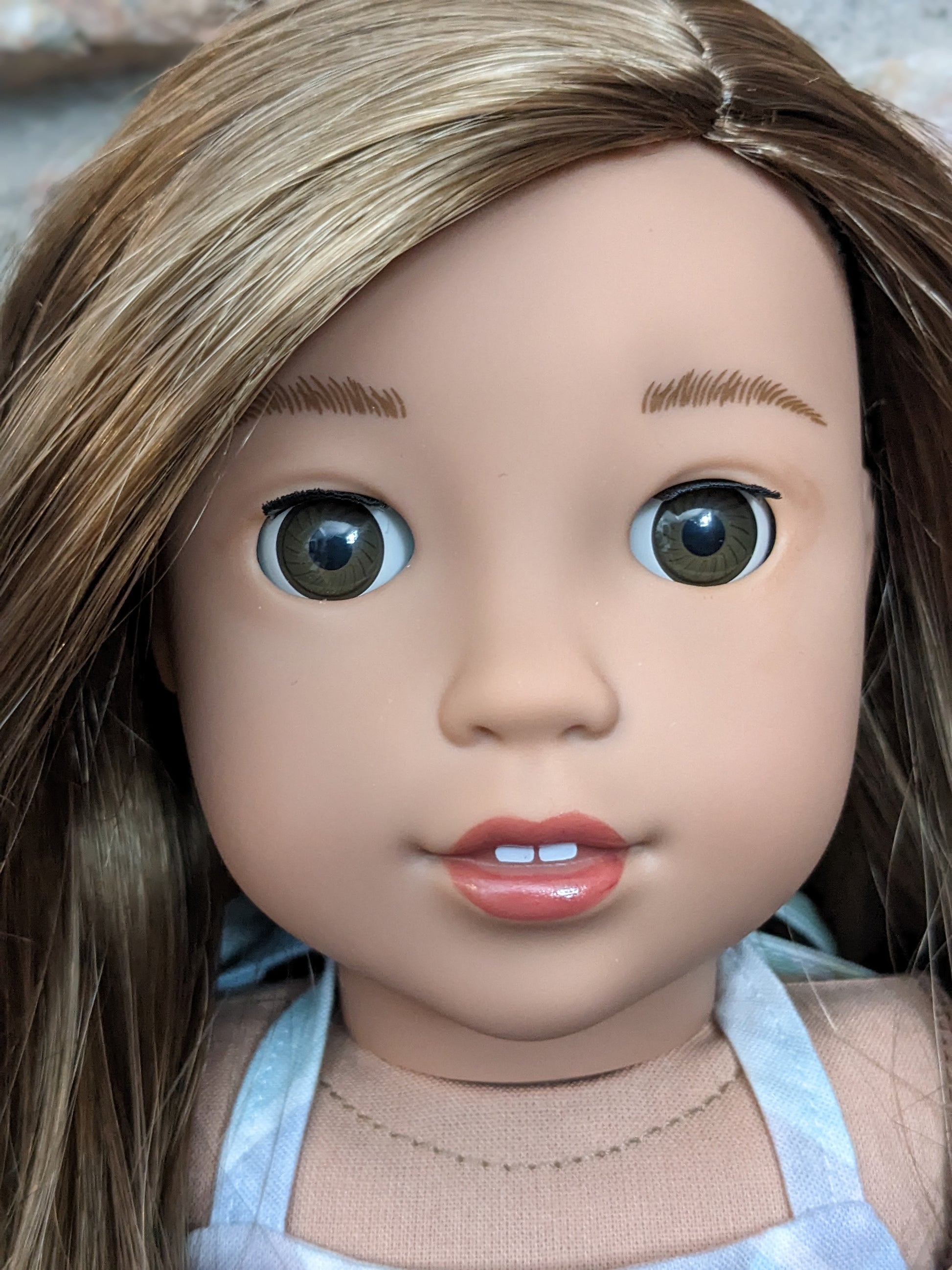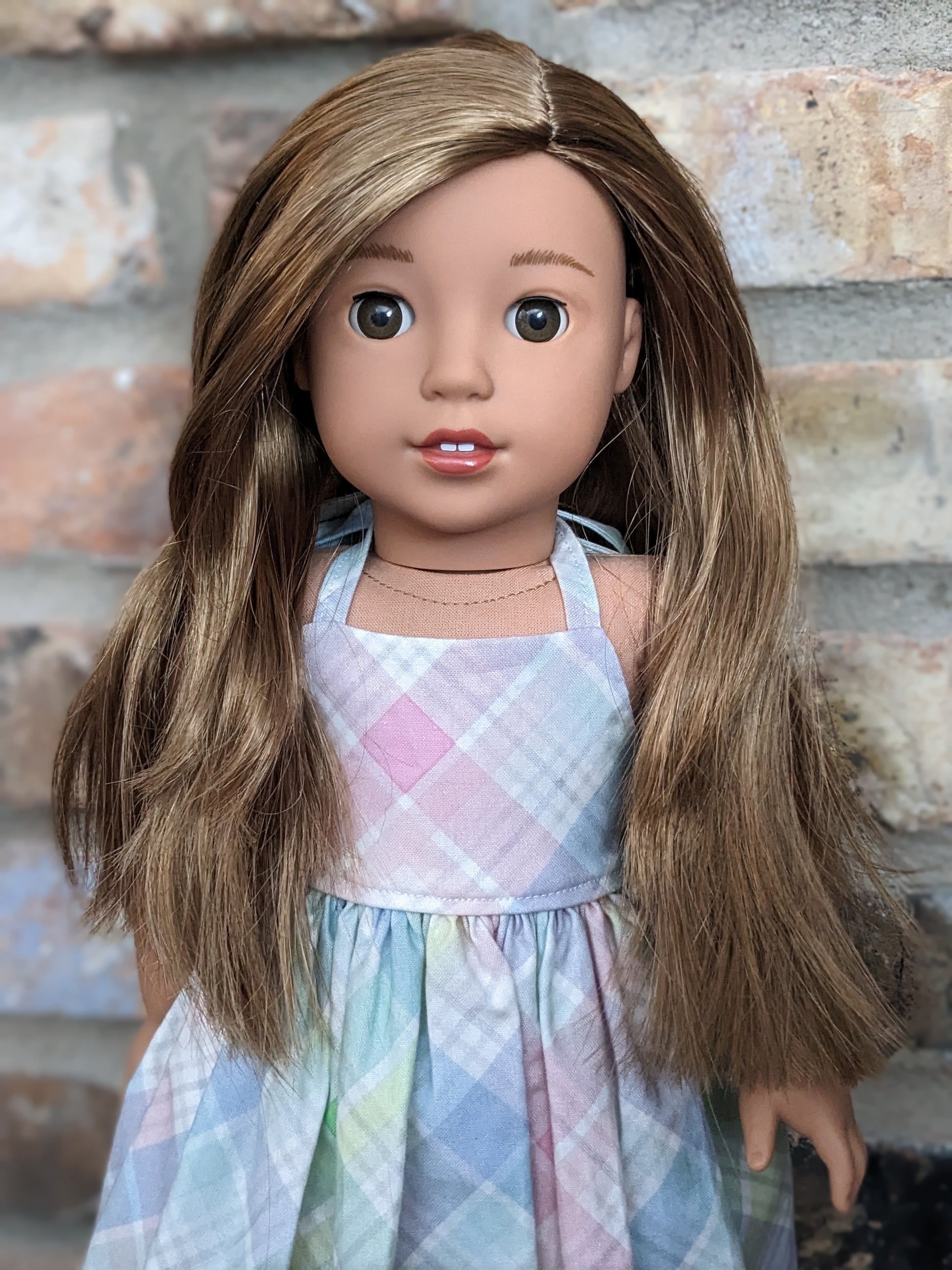 This one of a kind OOAK custom American Girl doll was created with a new doll, a caramel brown wig, and amber eyes. She has lip gloss that was hand painted and sealed. She may have some minor shine marks from handling. She comes with the outfit pictured. Her painted on eyelashes have been removed.