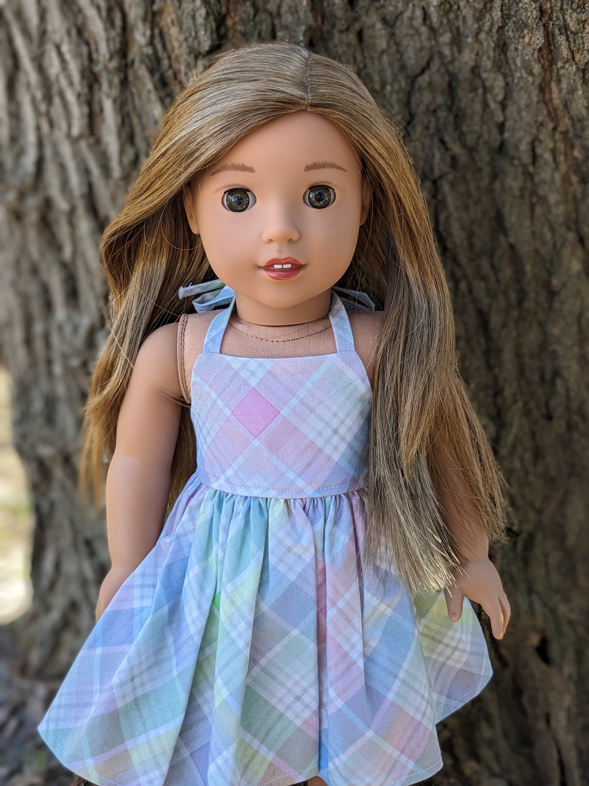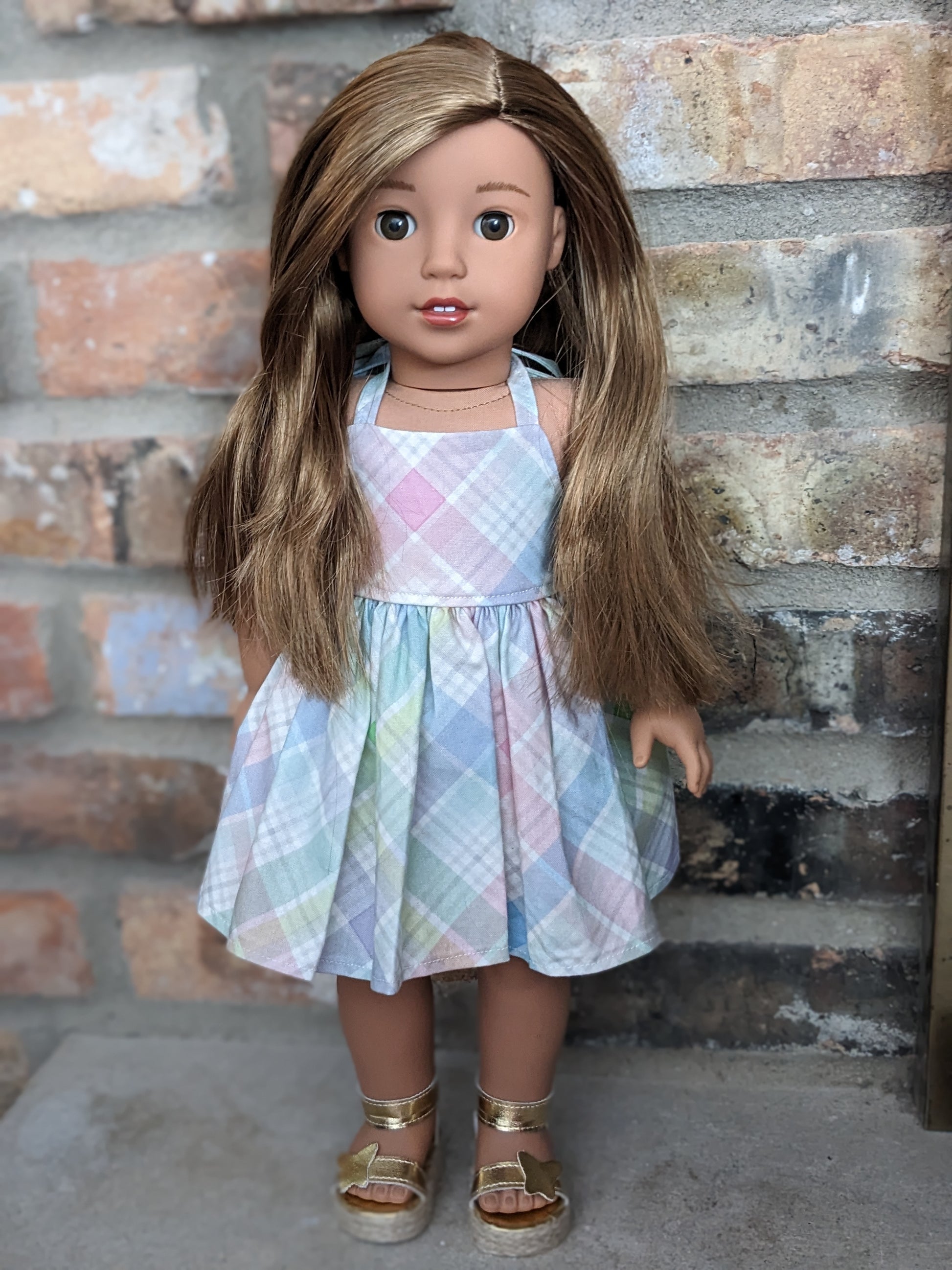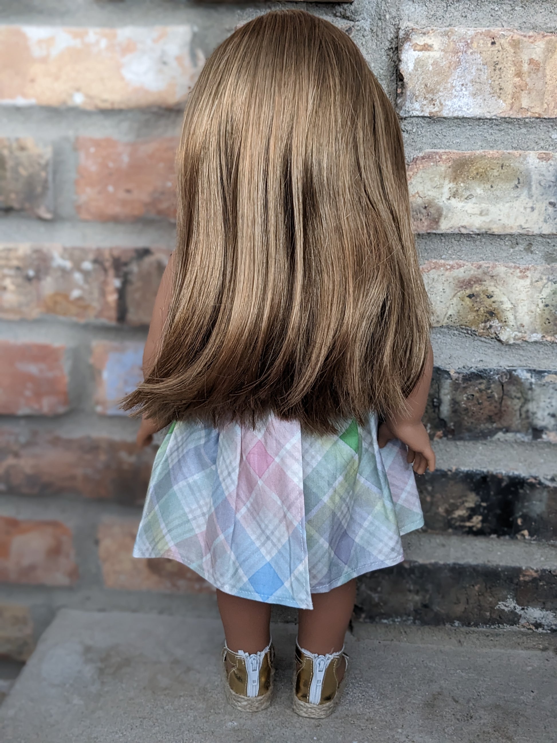 This one of a kind OOAK custom American Girl doll was created with a new doll, a caramel brown wig, and amber eyes. She has lip gloss that was hand painted and sealed. She may have some minor shine marks from handling. She comes with the outfit pictured. Her painted on eyelashes have been removed.