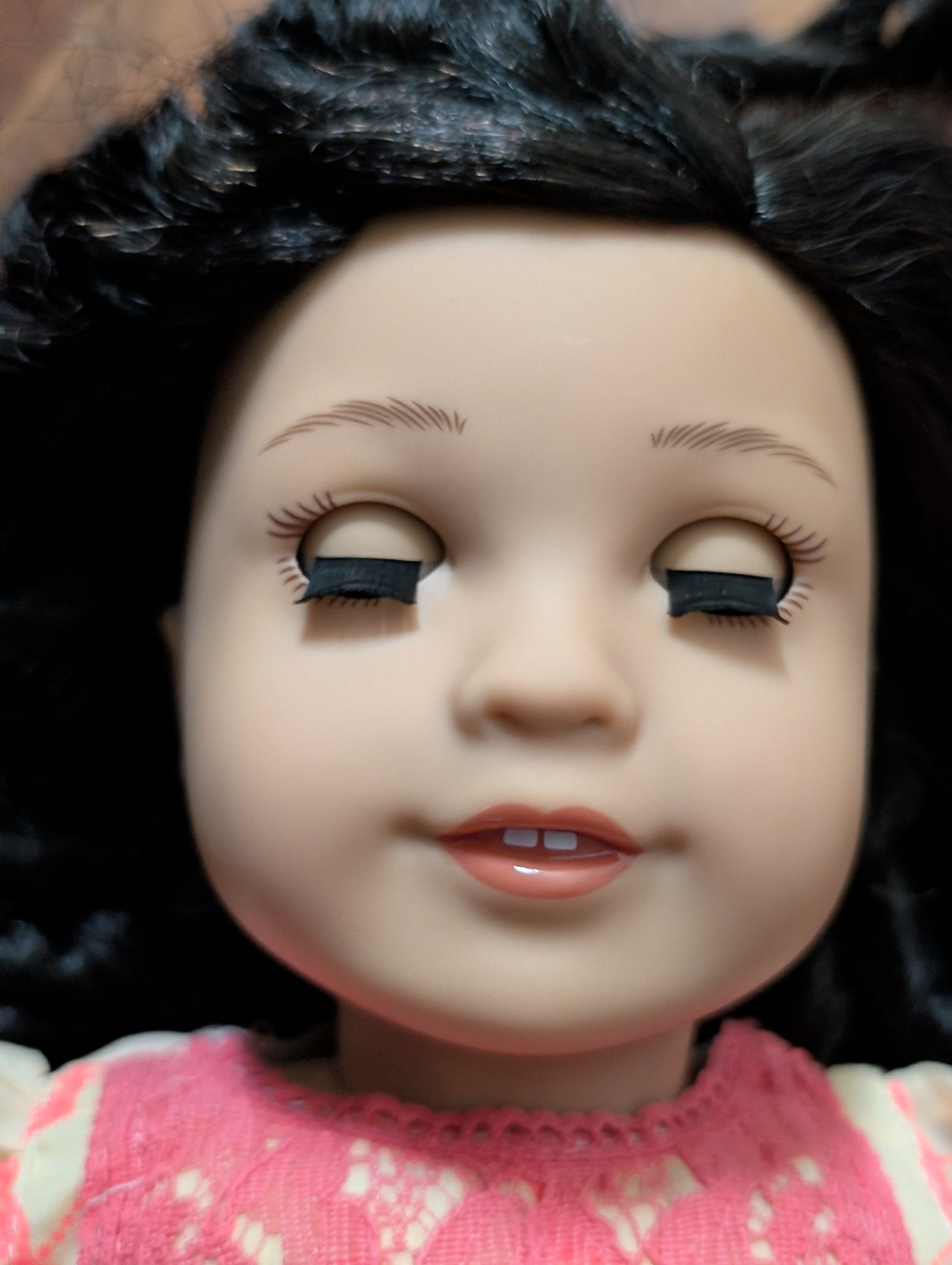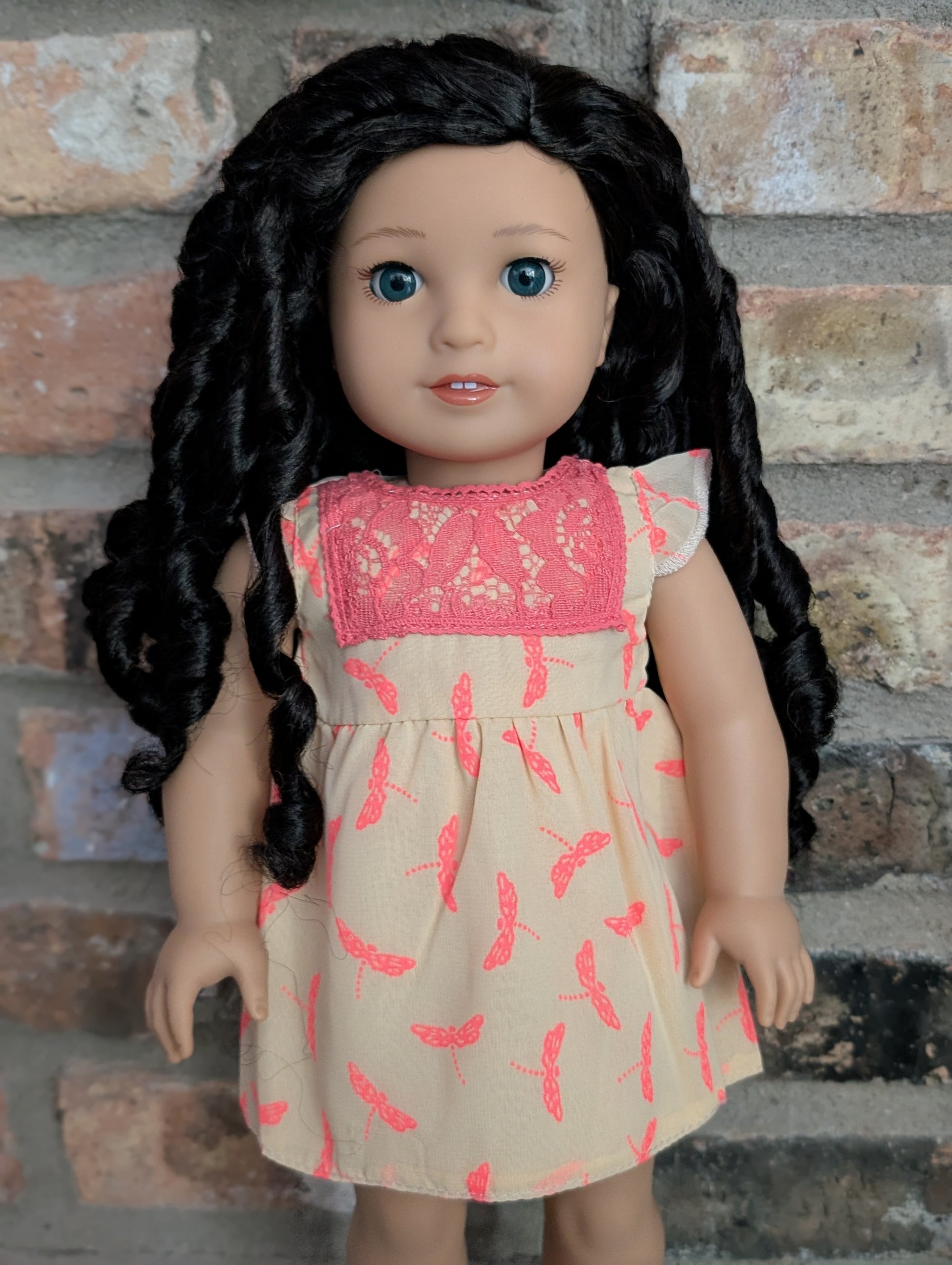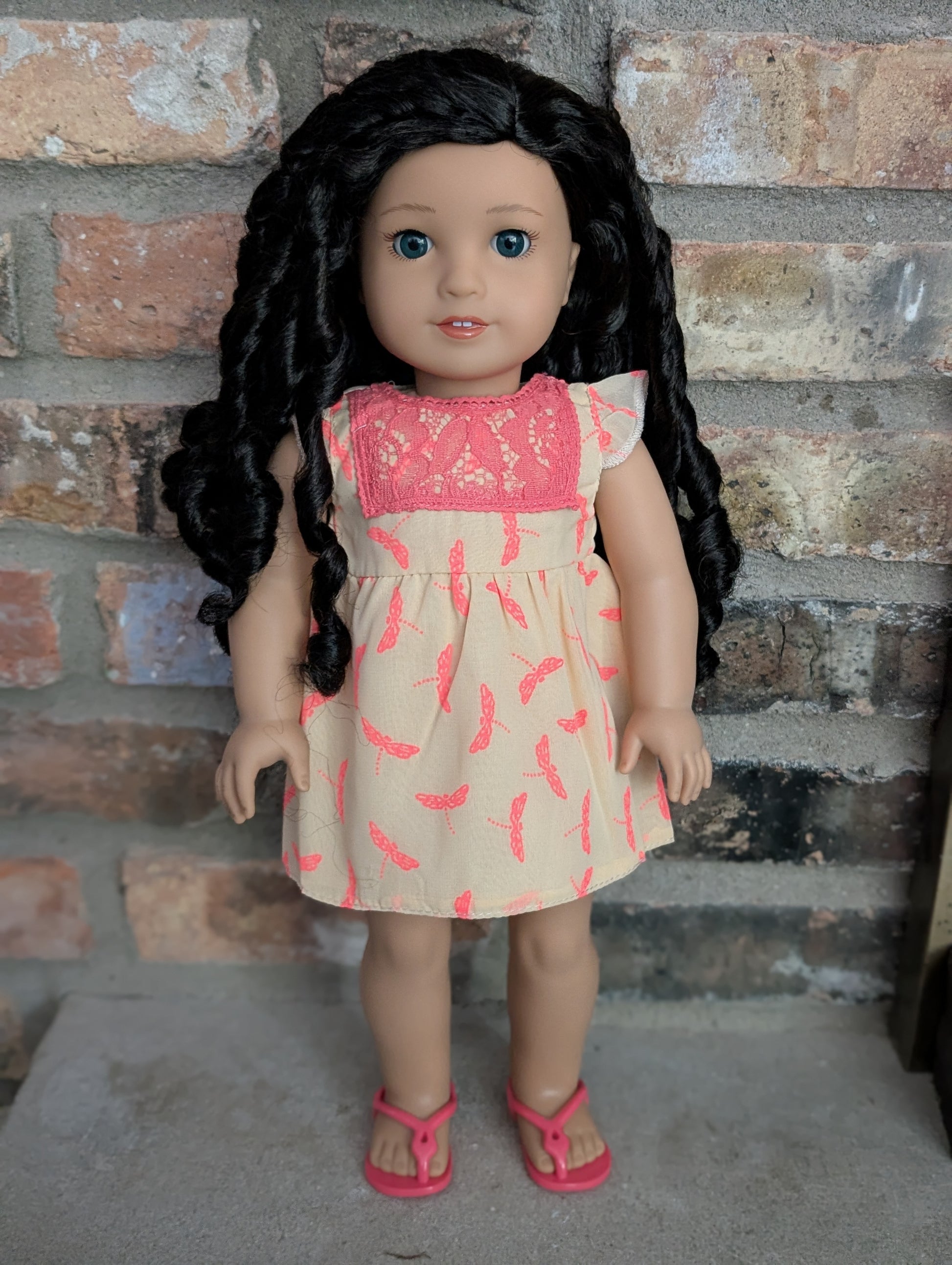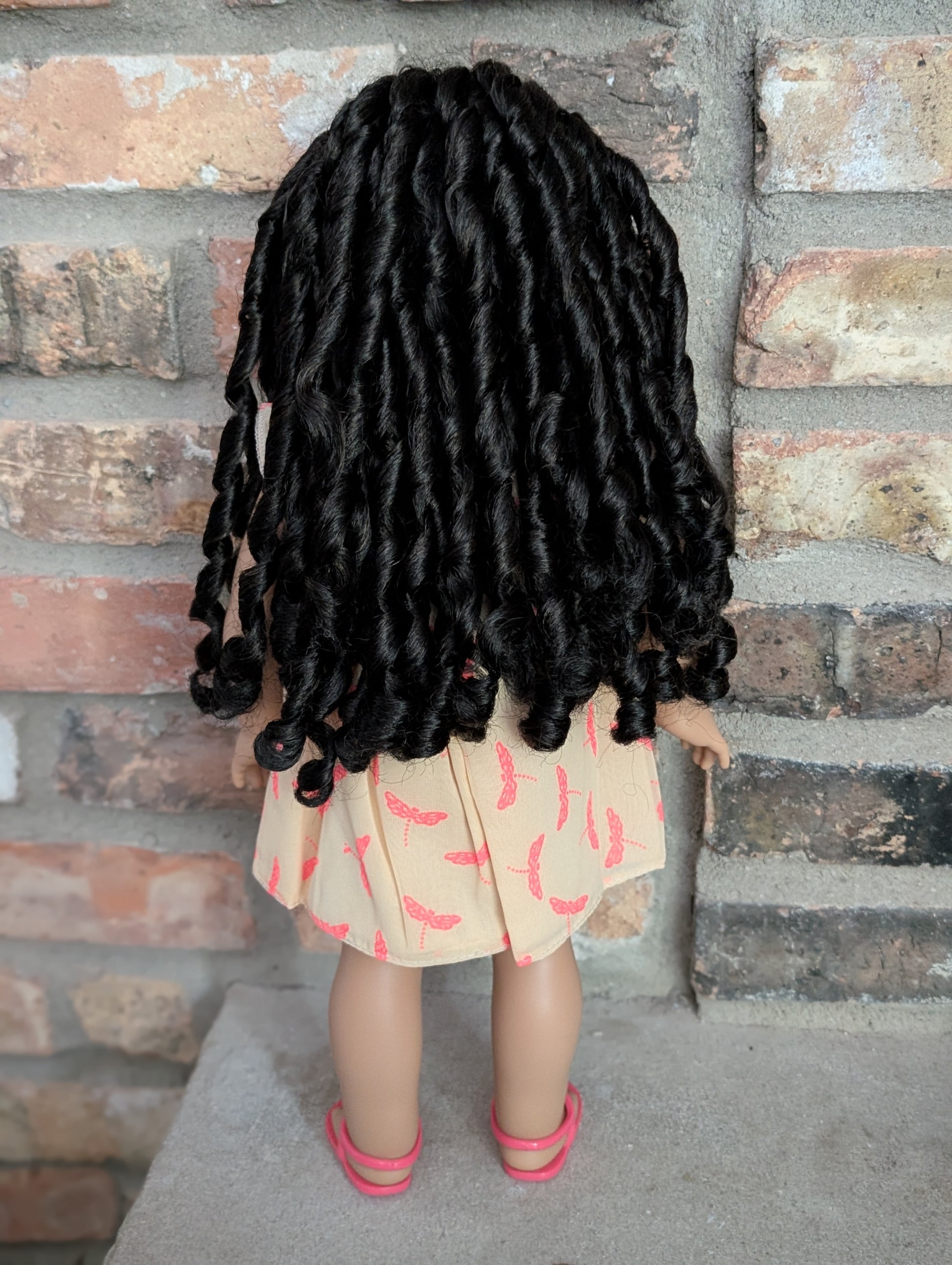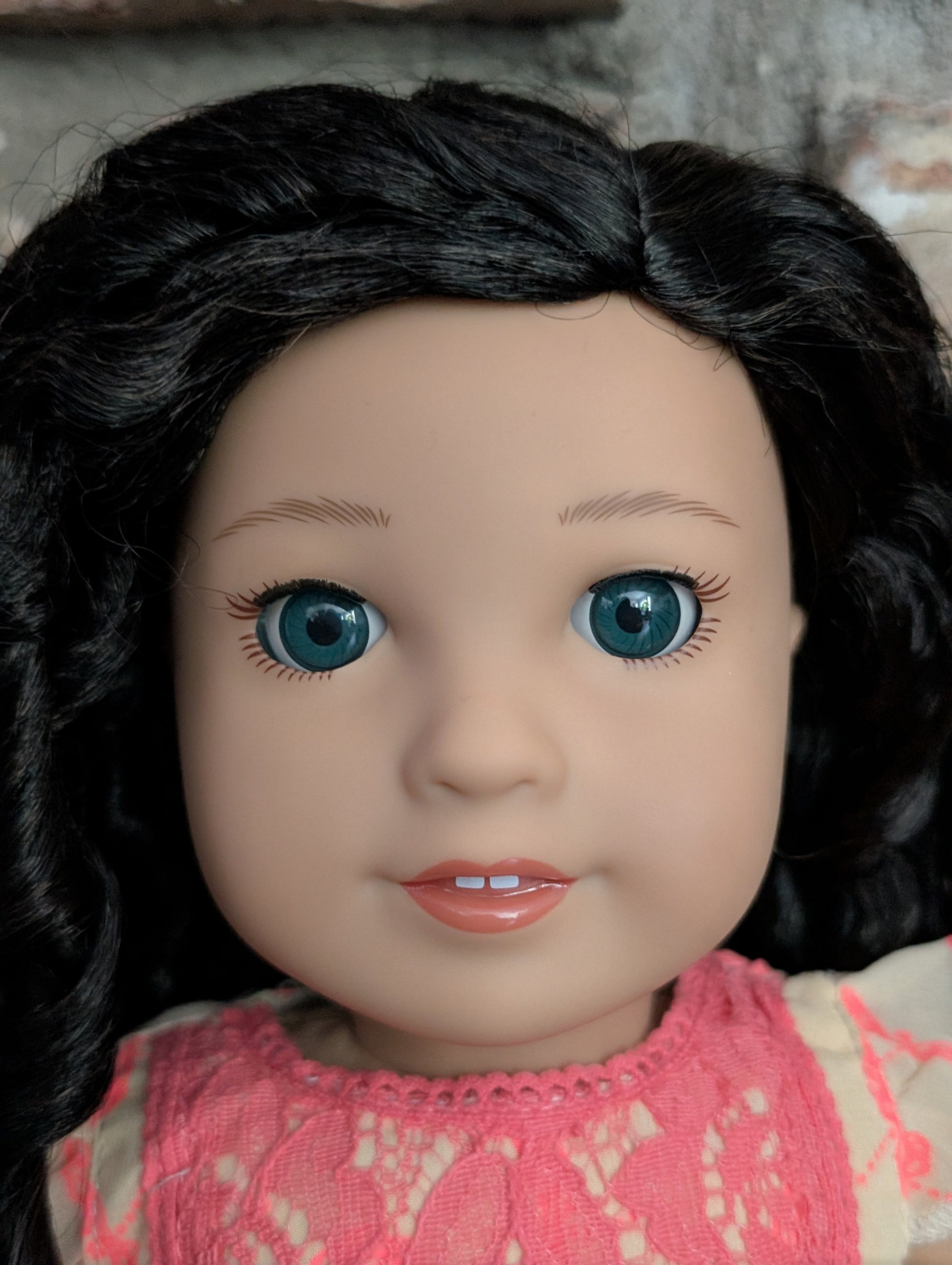 This one of a kind OOAK custom American Girl doll was created with a brand new doll, a black wig, and dark blue eyes. She has lip gloss that was hand painted and sealed. She may have some minor shine marks from handling. She comes with the outfit pictured.