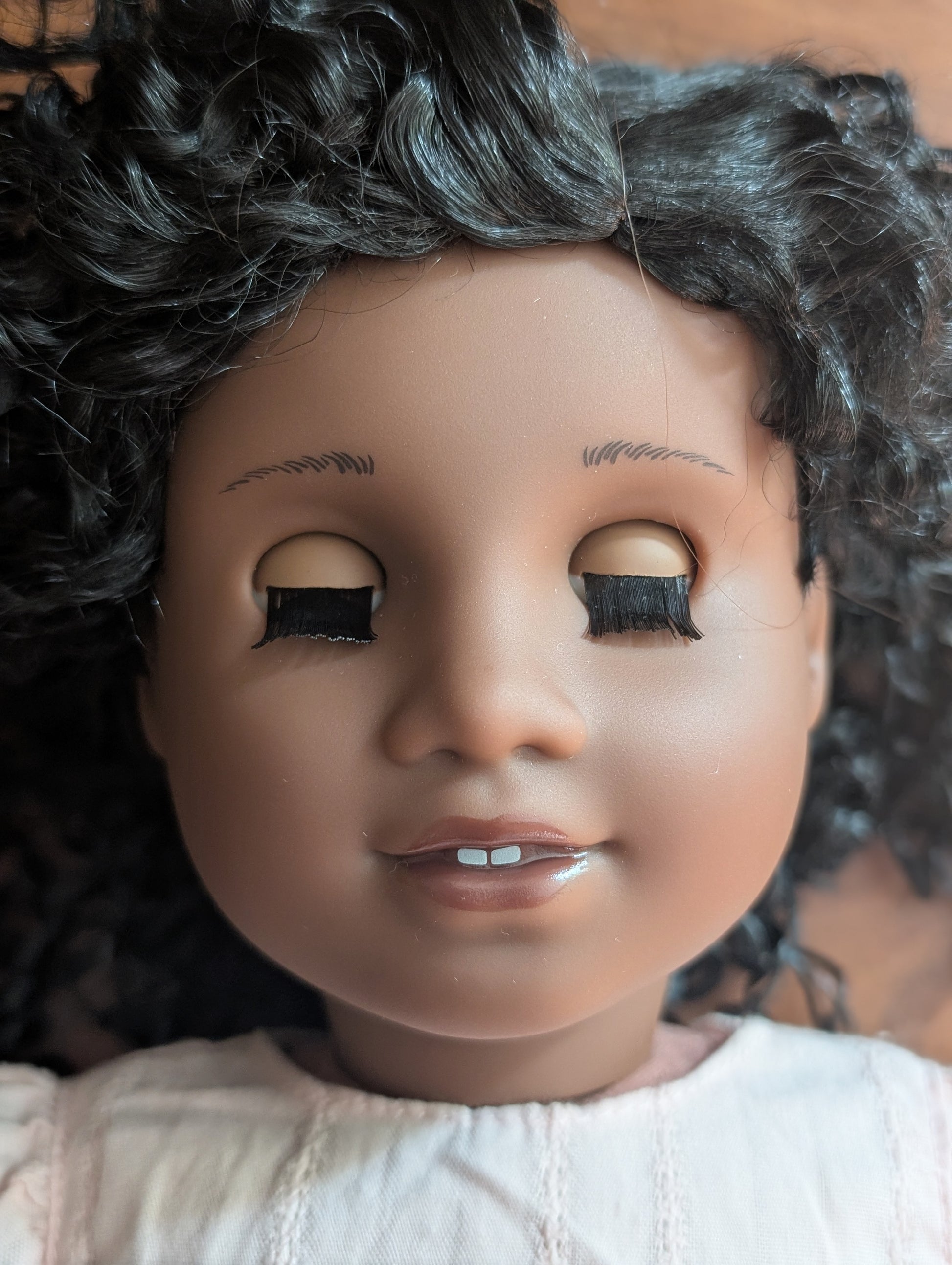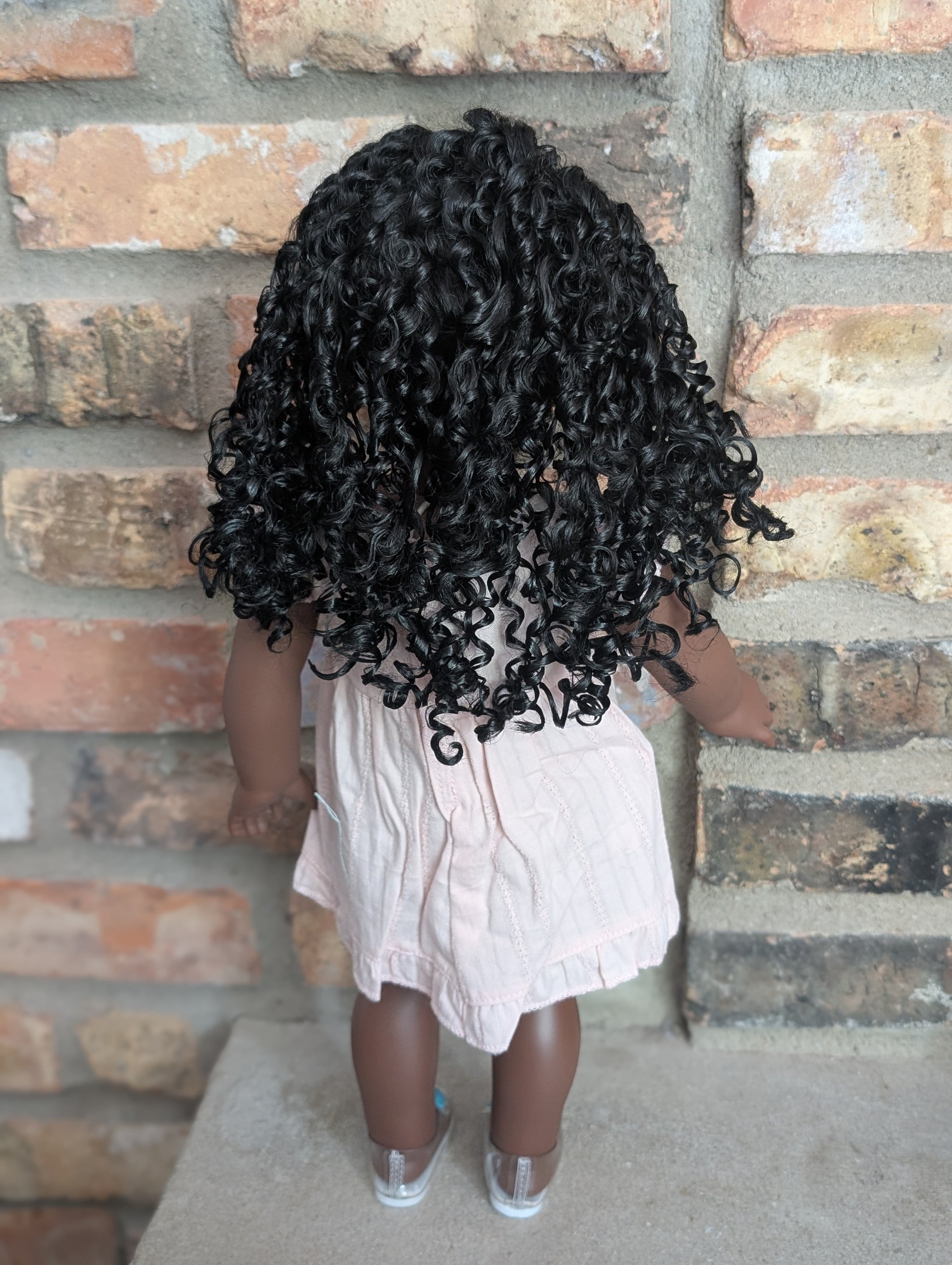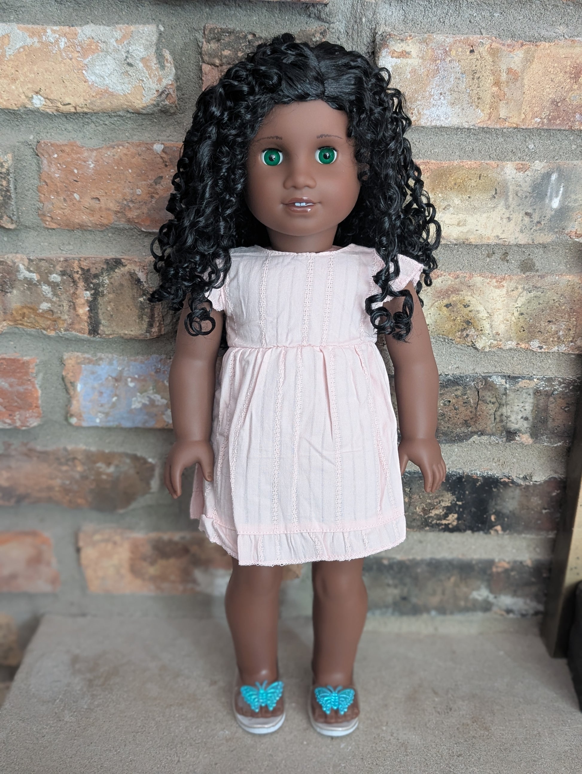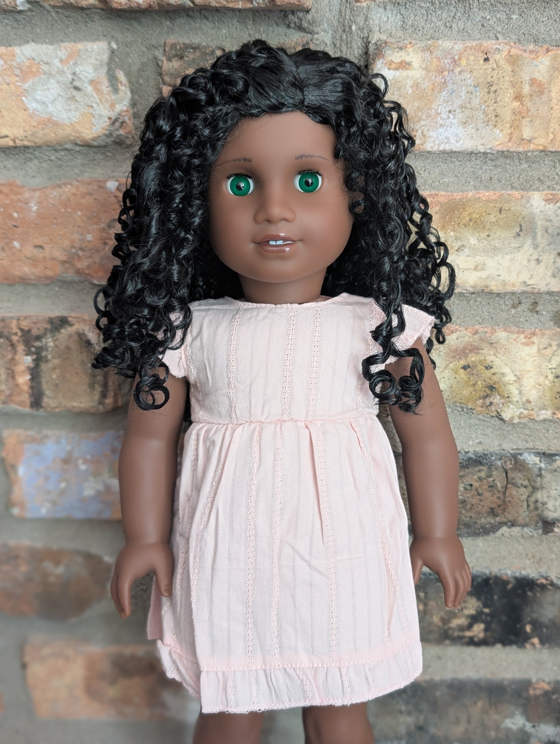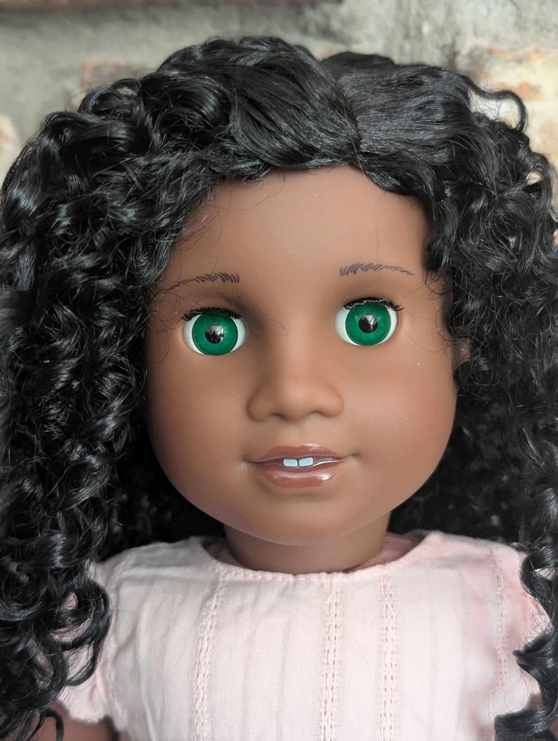 This one of a kind OOAK custom American Girl doll was created with a brand new doll, a black wig, and bright green eyes from Etsy. She has lip gloss that was hand painted and sealed. She may have some minor shine marks from handling. She comes with the outfit pictured.