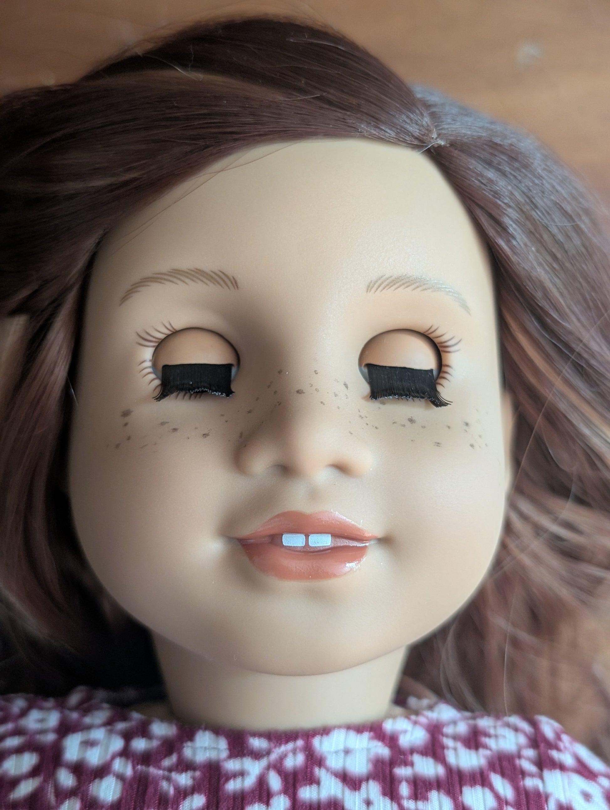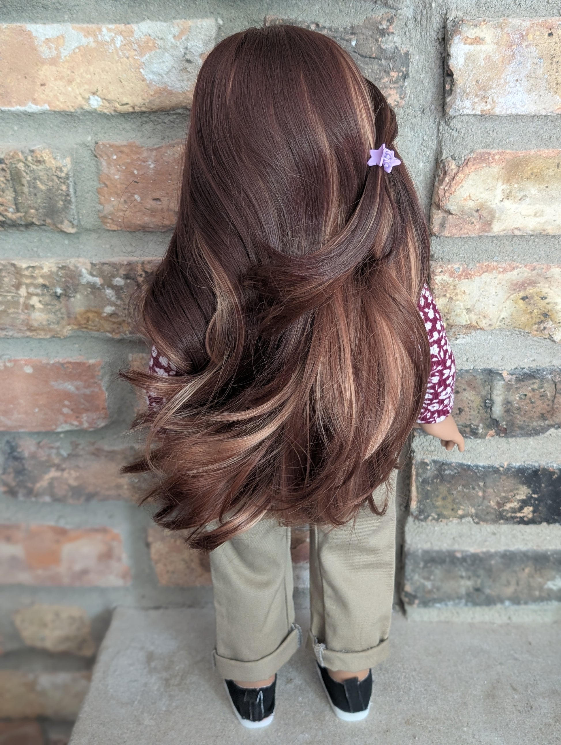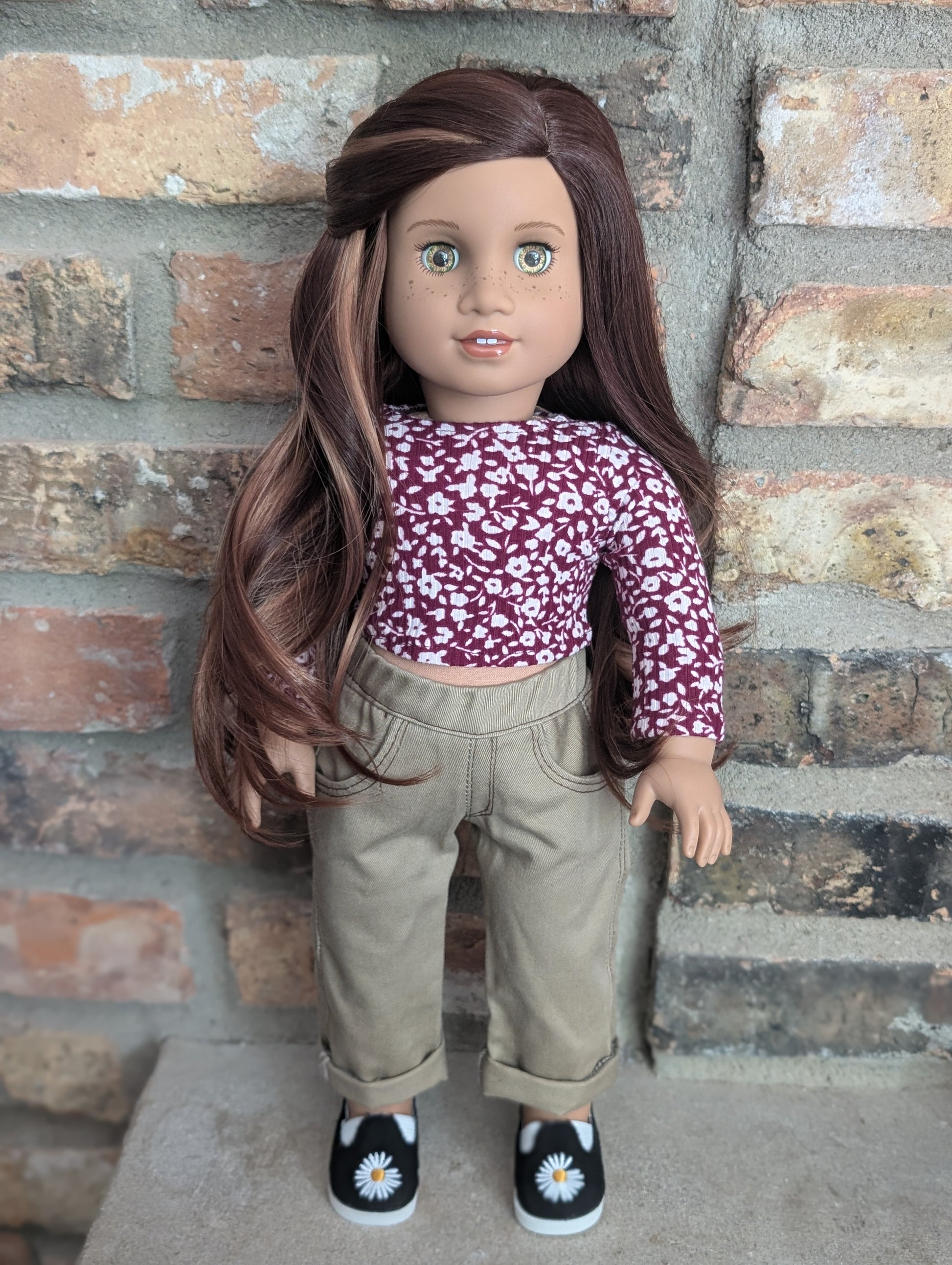 This one of a kind OOAK custom American Girl doll was created with a brand new doll, a reddish brown wig, and premium glass golden eyes from Etsy. She has lip gloss and freckles that were hand painted and sealed. She may have some minor shine marks from handling. She comes with the outfit pictured.