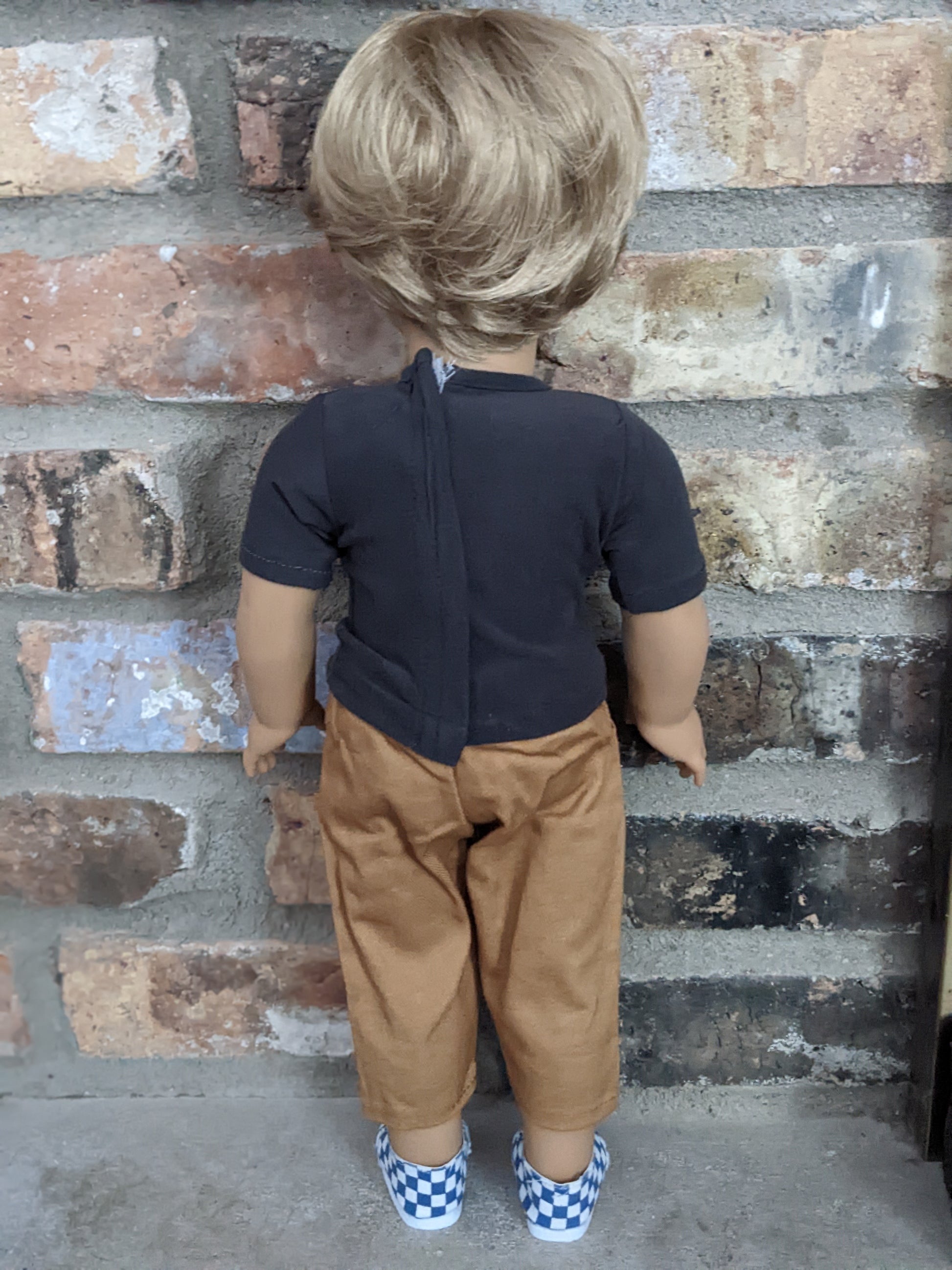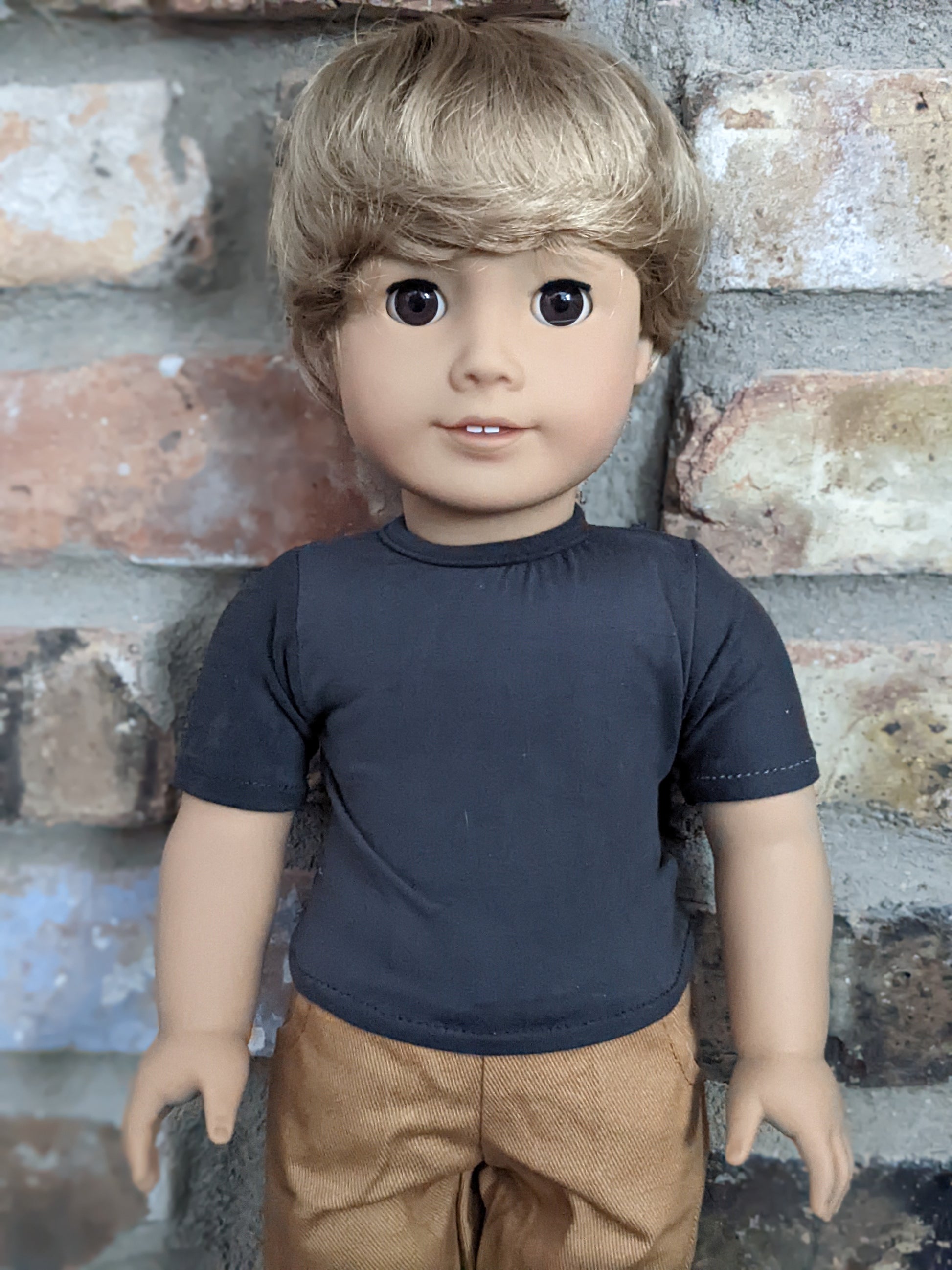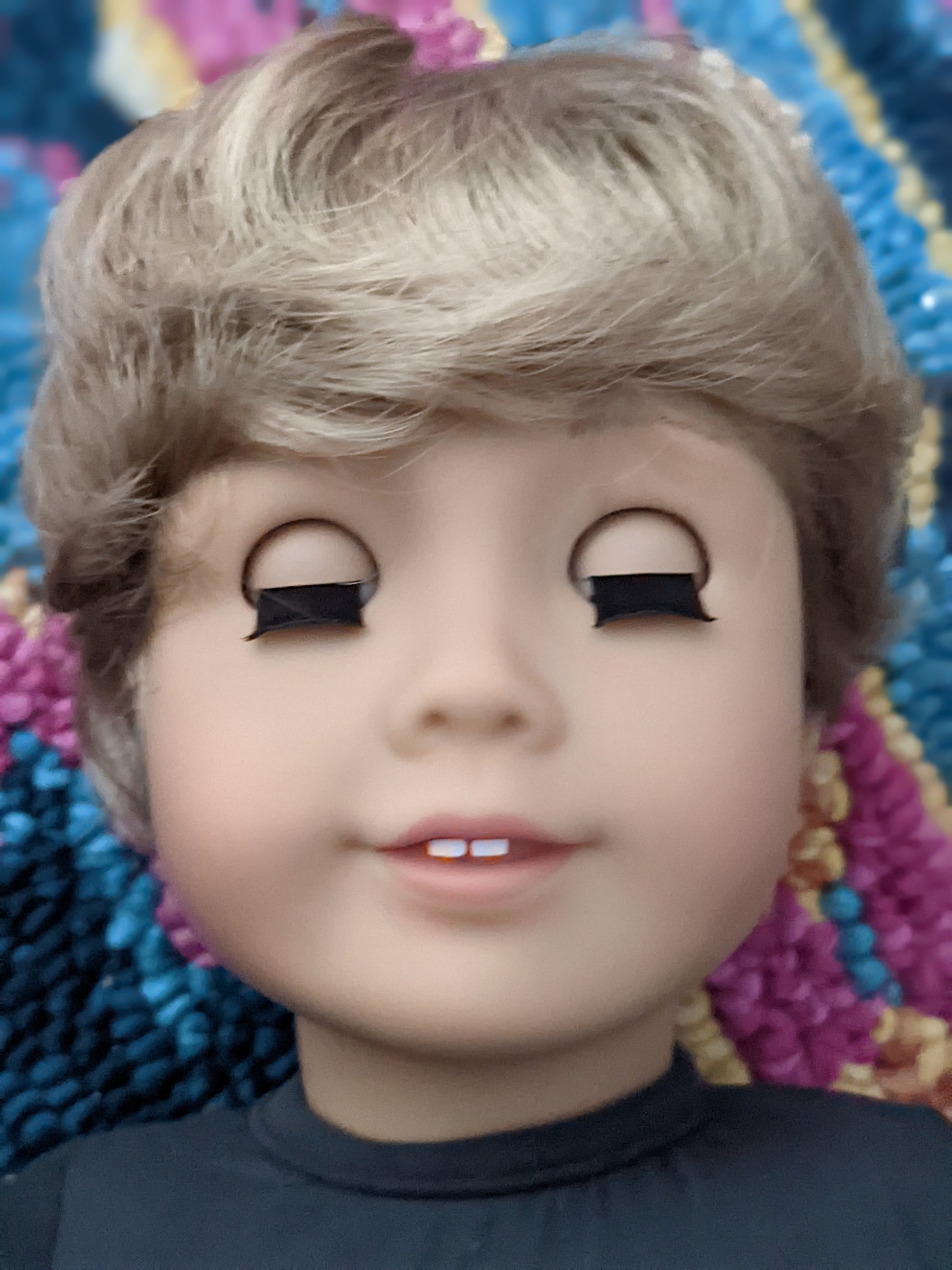 This one of a kind OOAK custom American Girl doll was created with a brand new Truly Me doll, a blonde wig, and brown eyes. He may have some minor shine marks from handling. He comes with the outfit pictured.