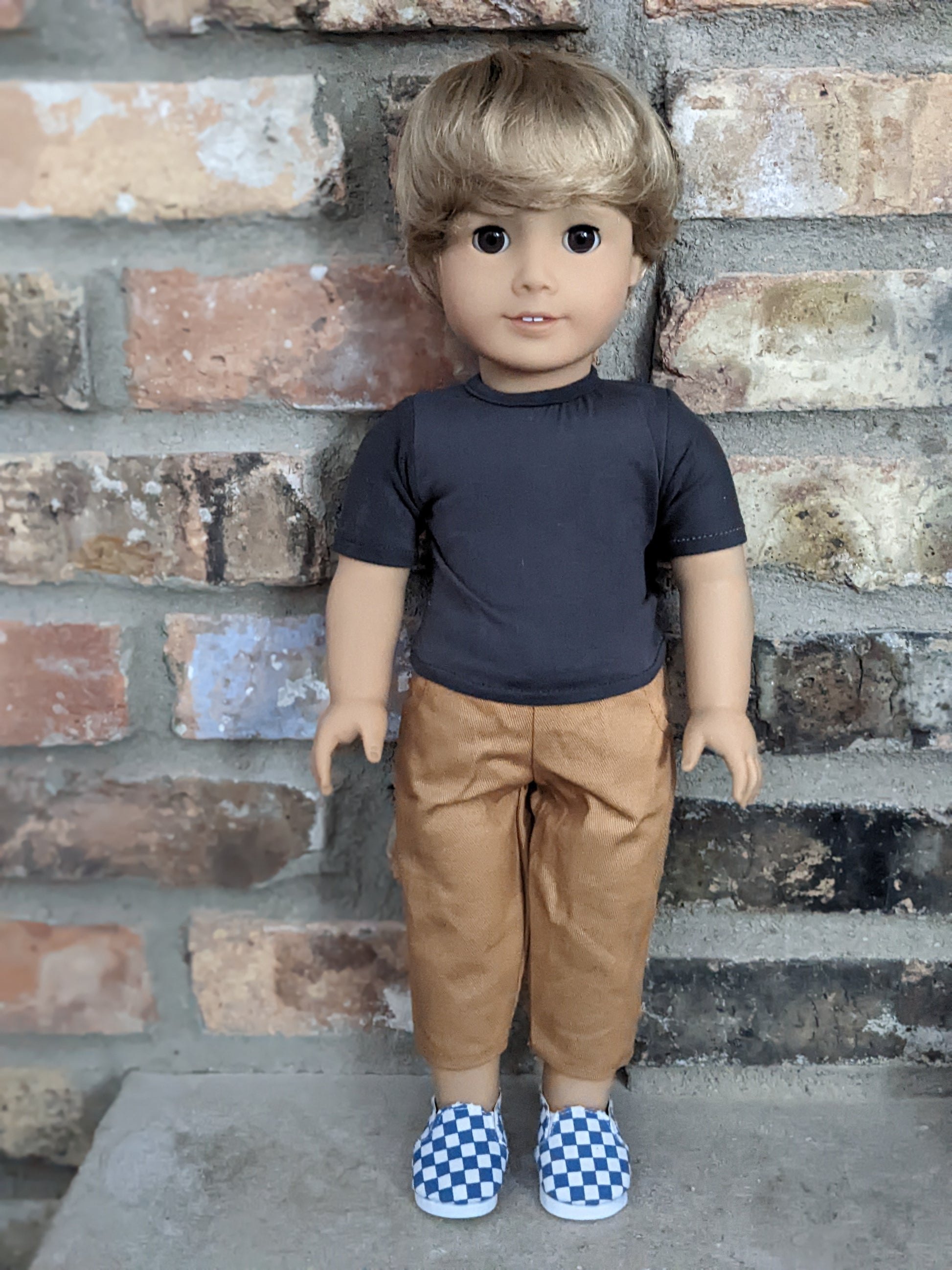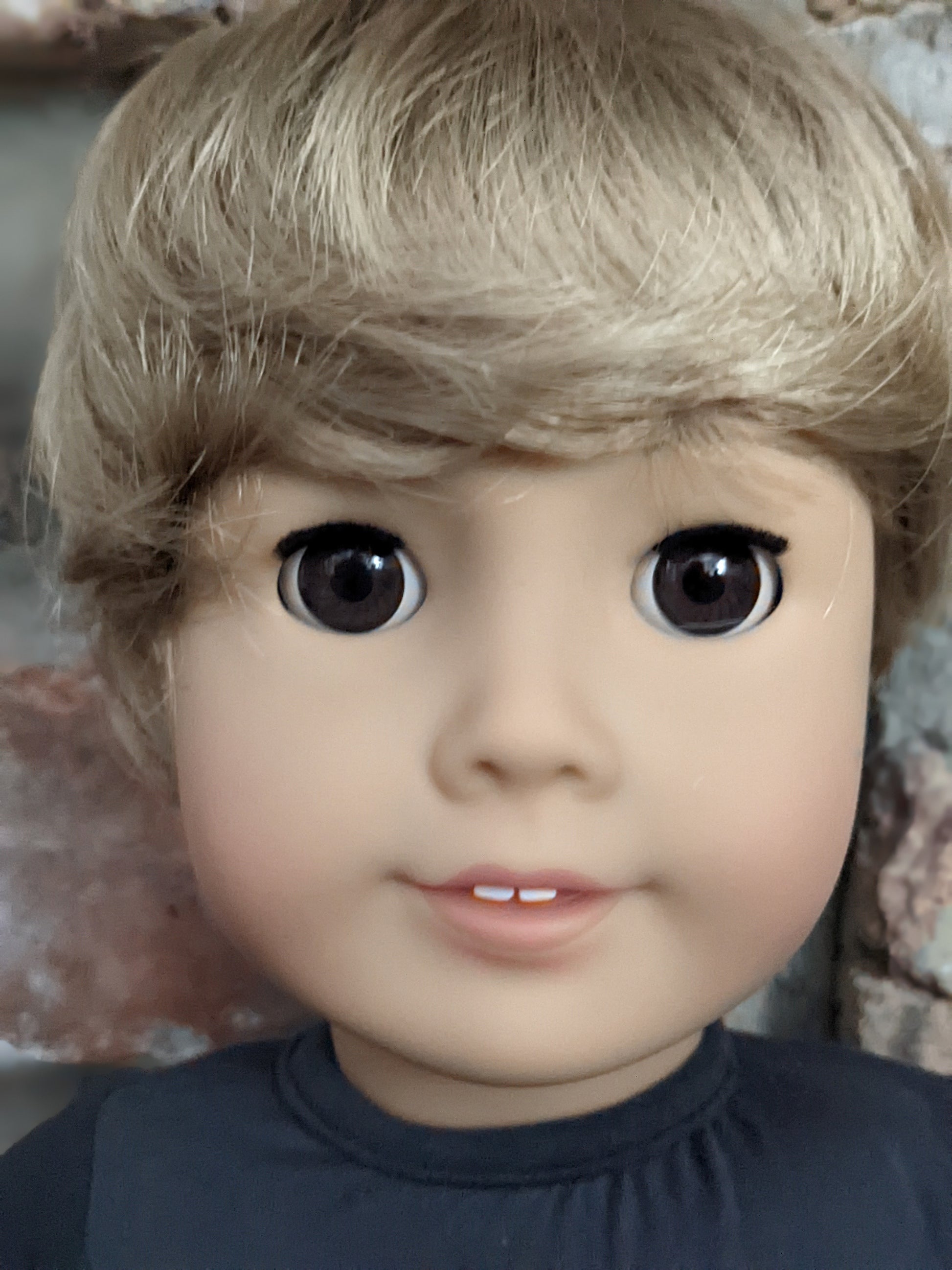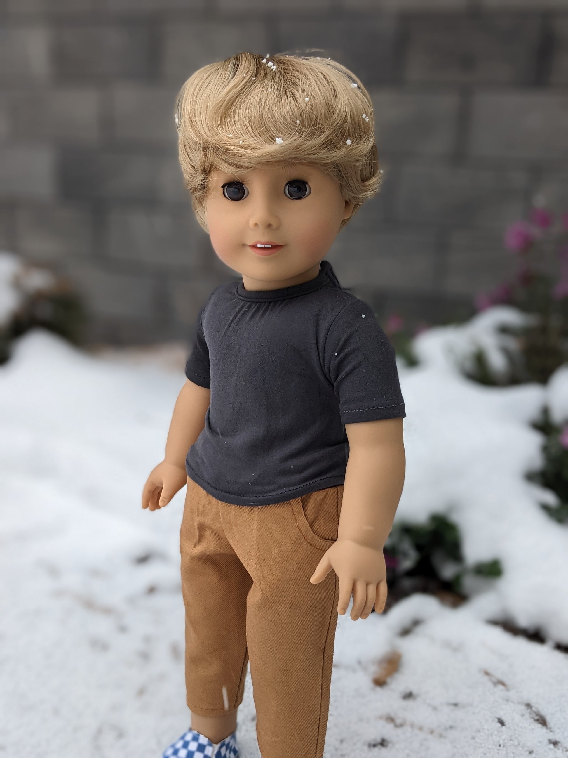This one of a kind OOAK custom American Girl doll was created with a brand new Truly Me doll, a blonde wig, and brown eyes. He may have some minor shine marks from handling. He comes with the outfit pictured.