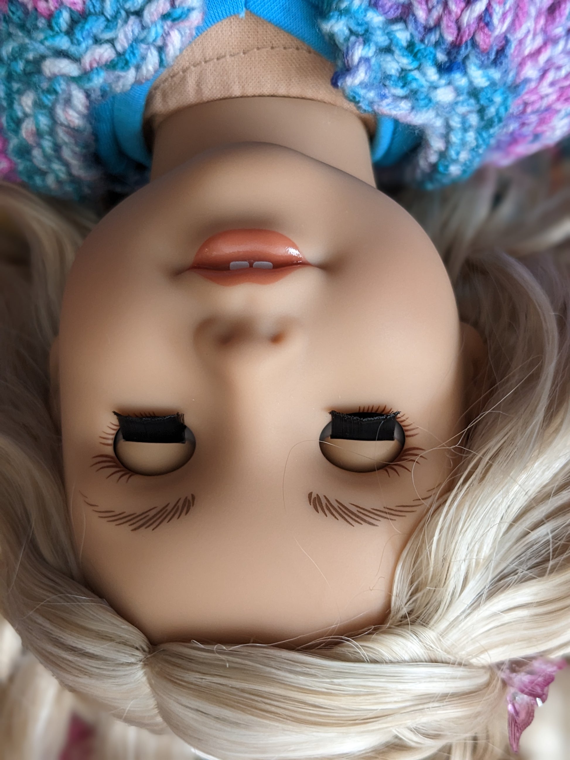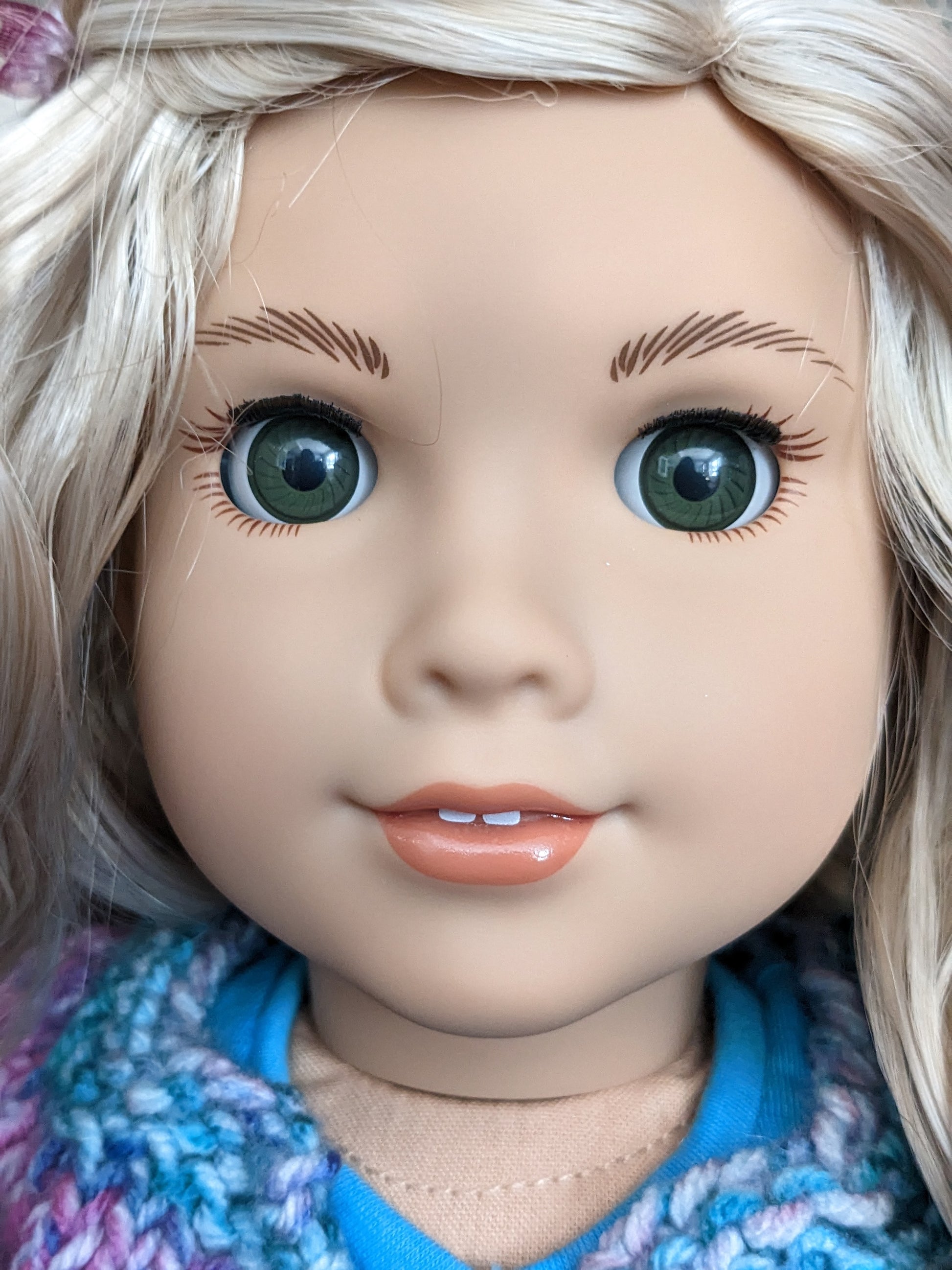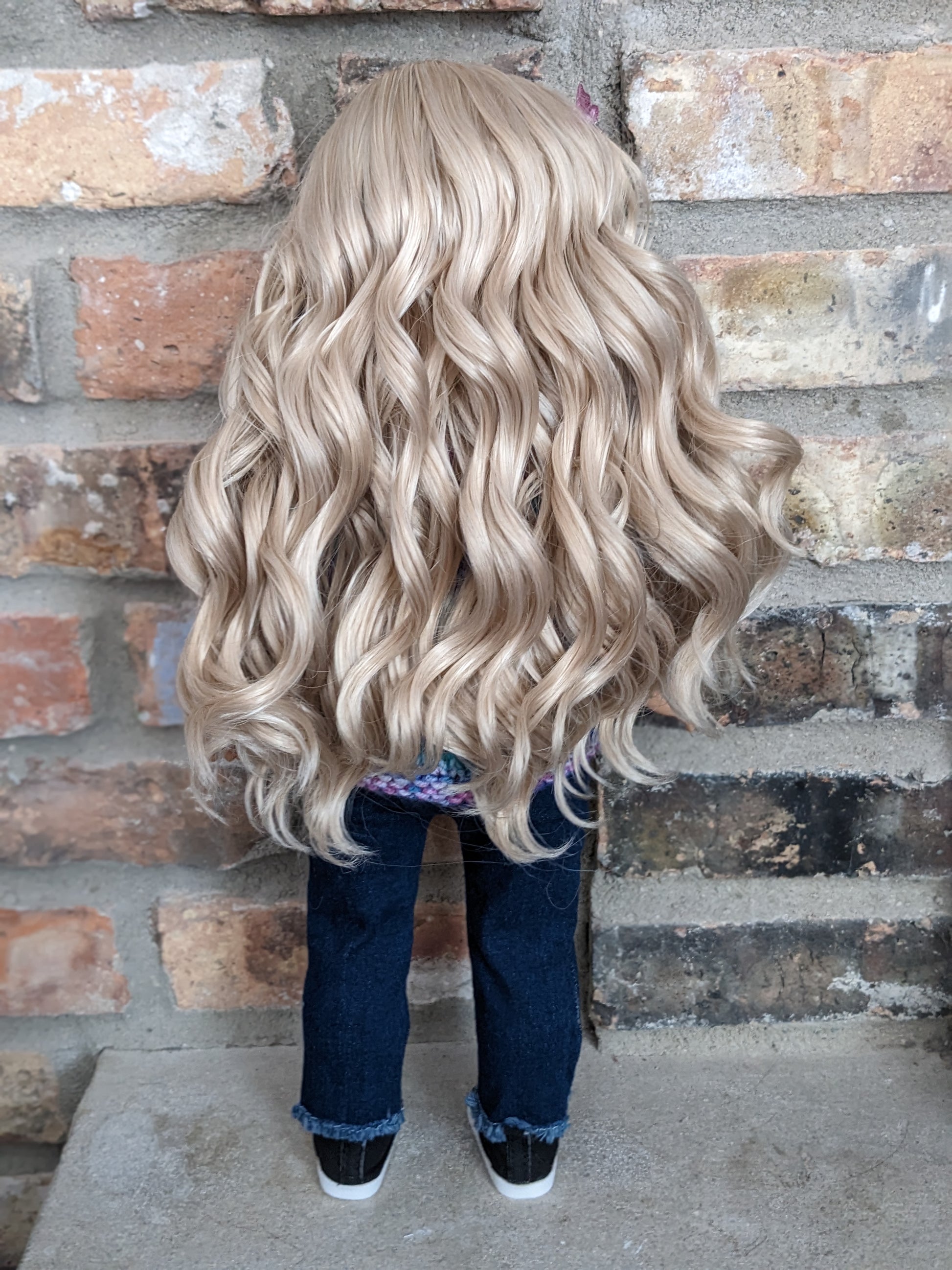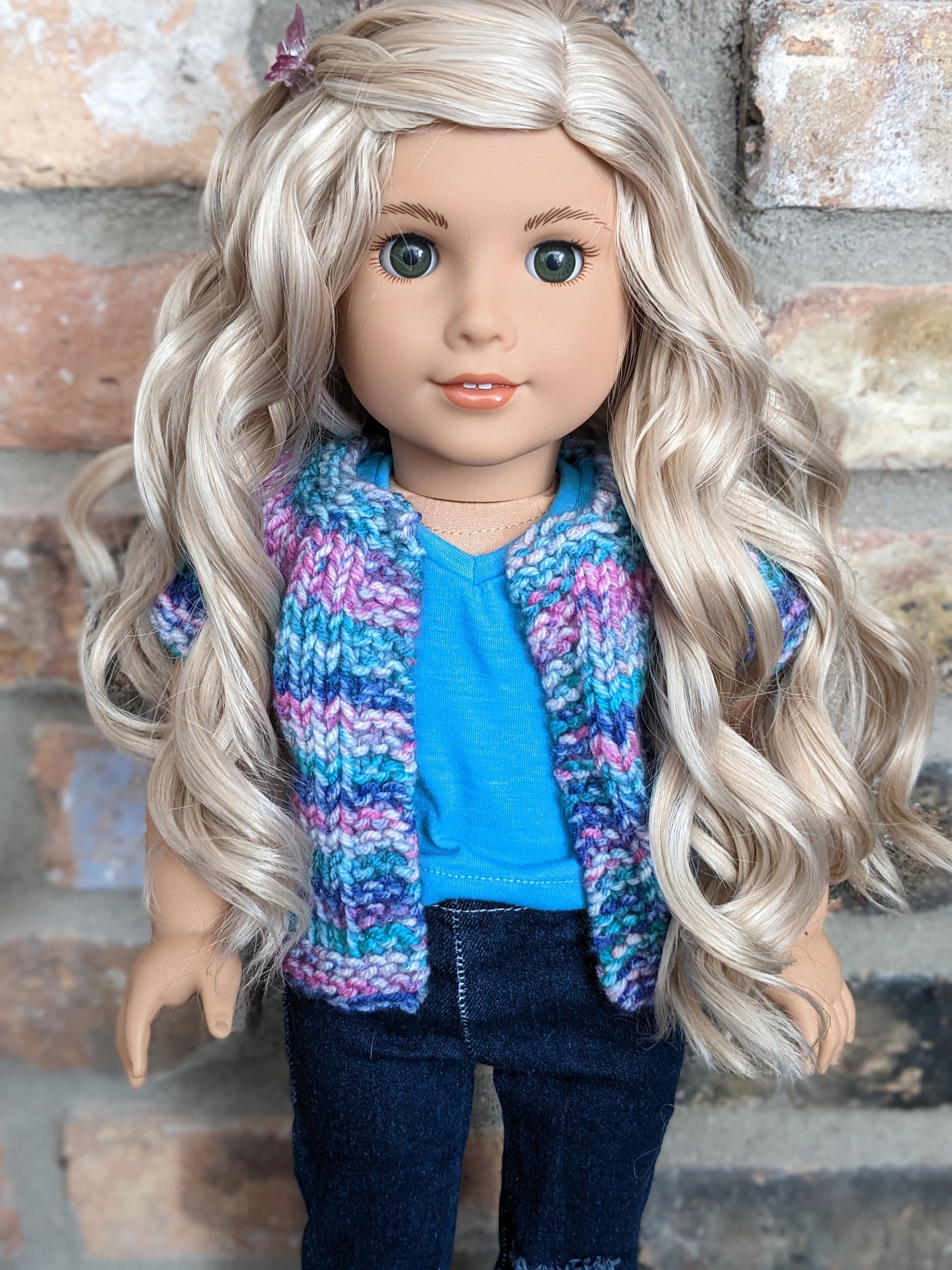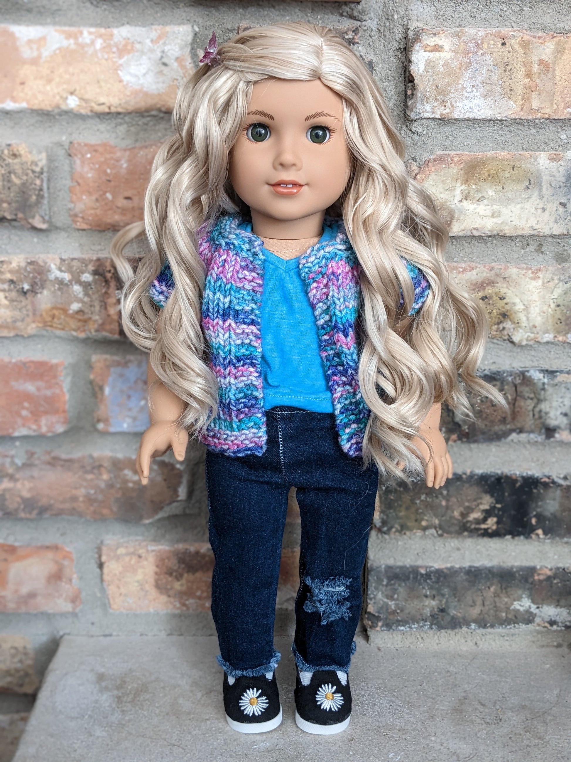 This one of a kind OOAK custom American Girl doll was created with a brand new doll, a blonde wig, and green eyes. She has lip gloss that was hand painted and sealed. She may have some minor shine marks from handling. She comes with the outfit pictured.
