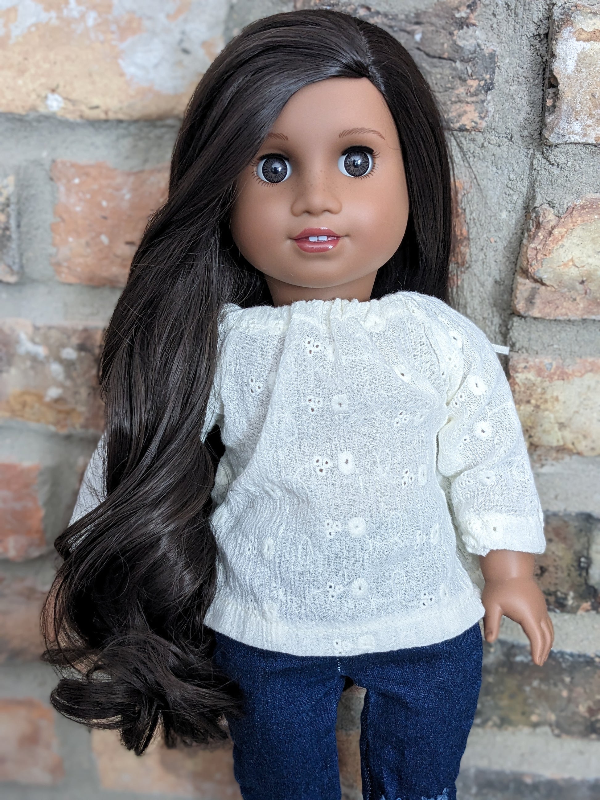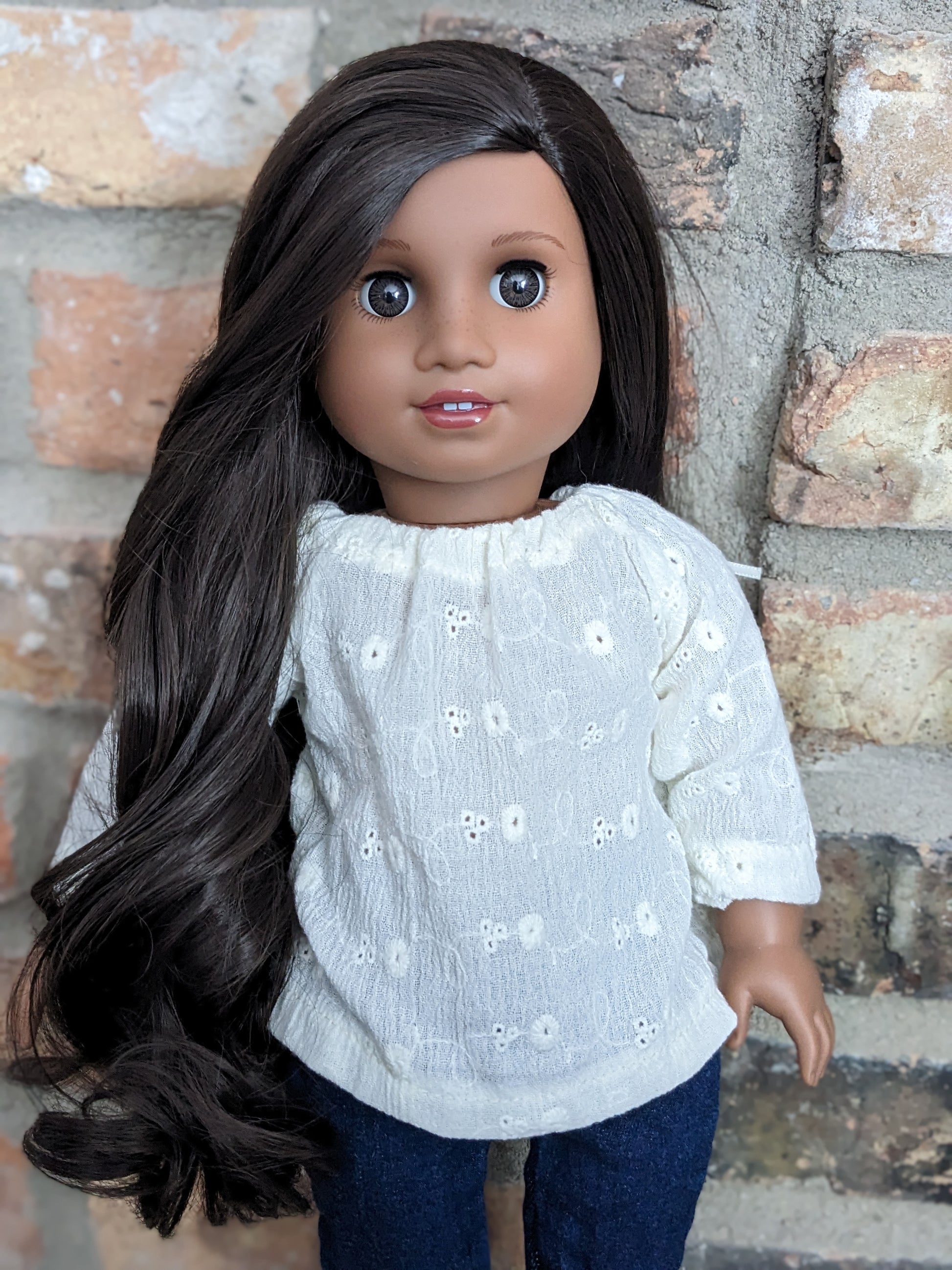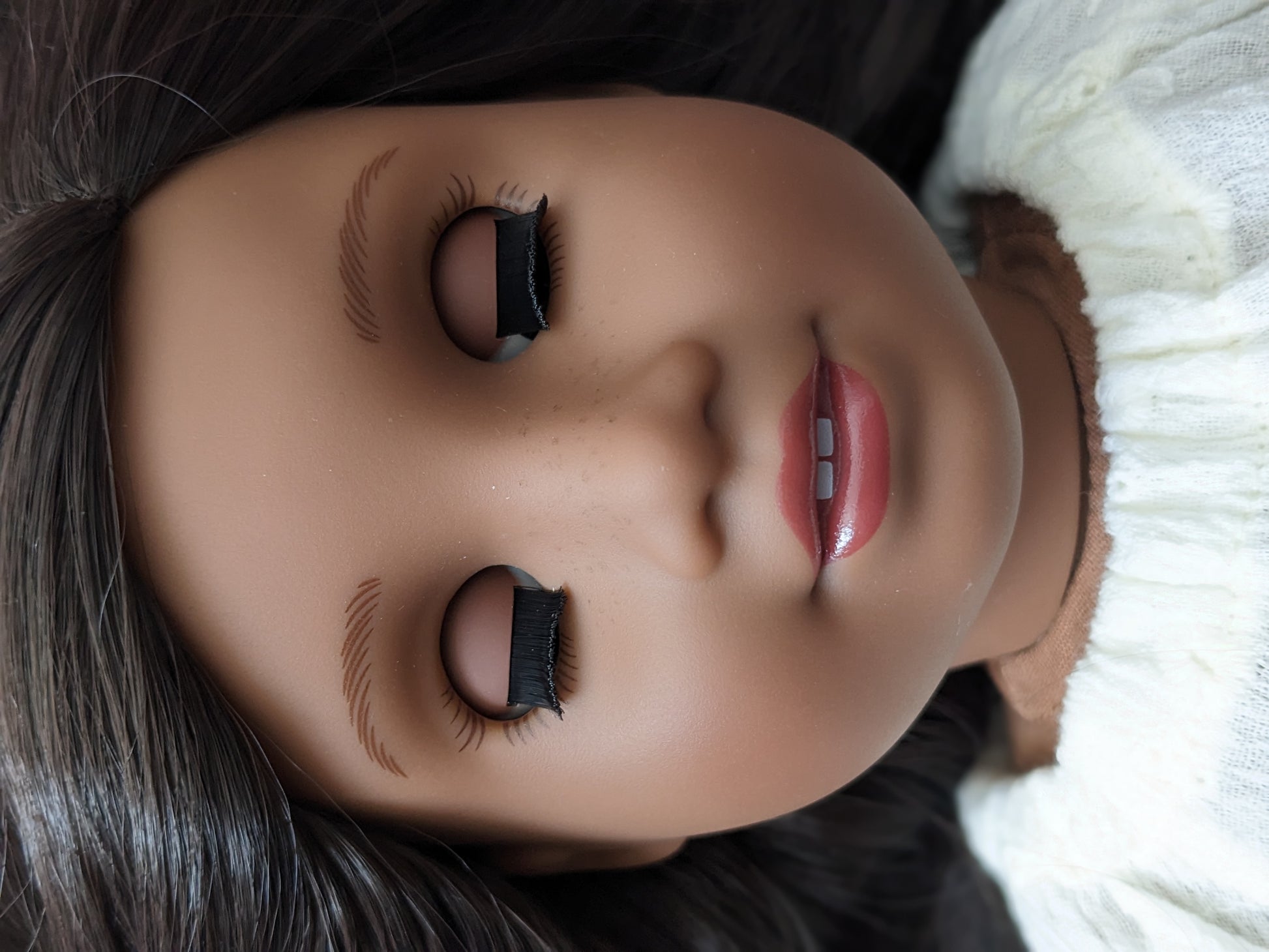 This one of a kind OOAK custom American Girl doll was created with a brand new doll, a dark brown wig, and brown decal eyes from a new Claudie doll. She has lip gloss and freckles that were hand painted and sealed. She may have some minor shine marks from handling. She comes with the outfit pictured.