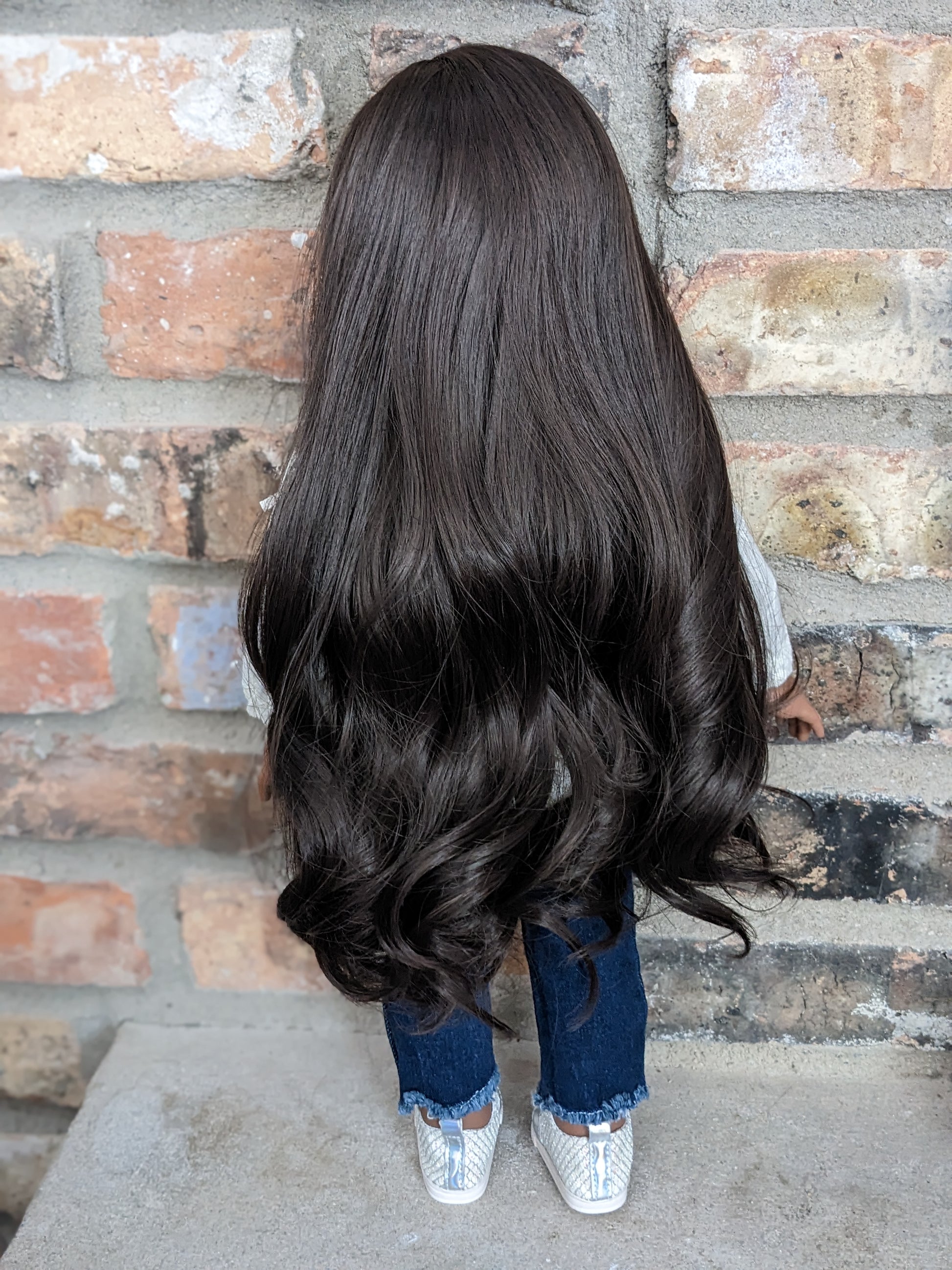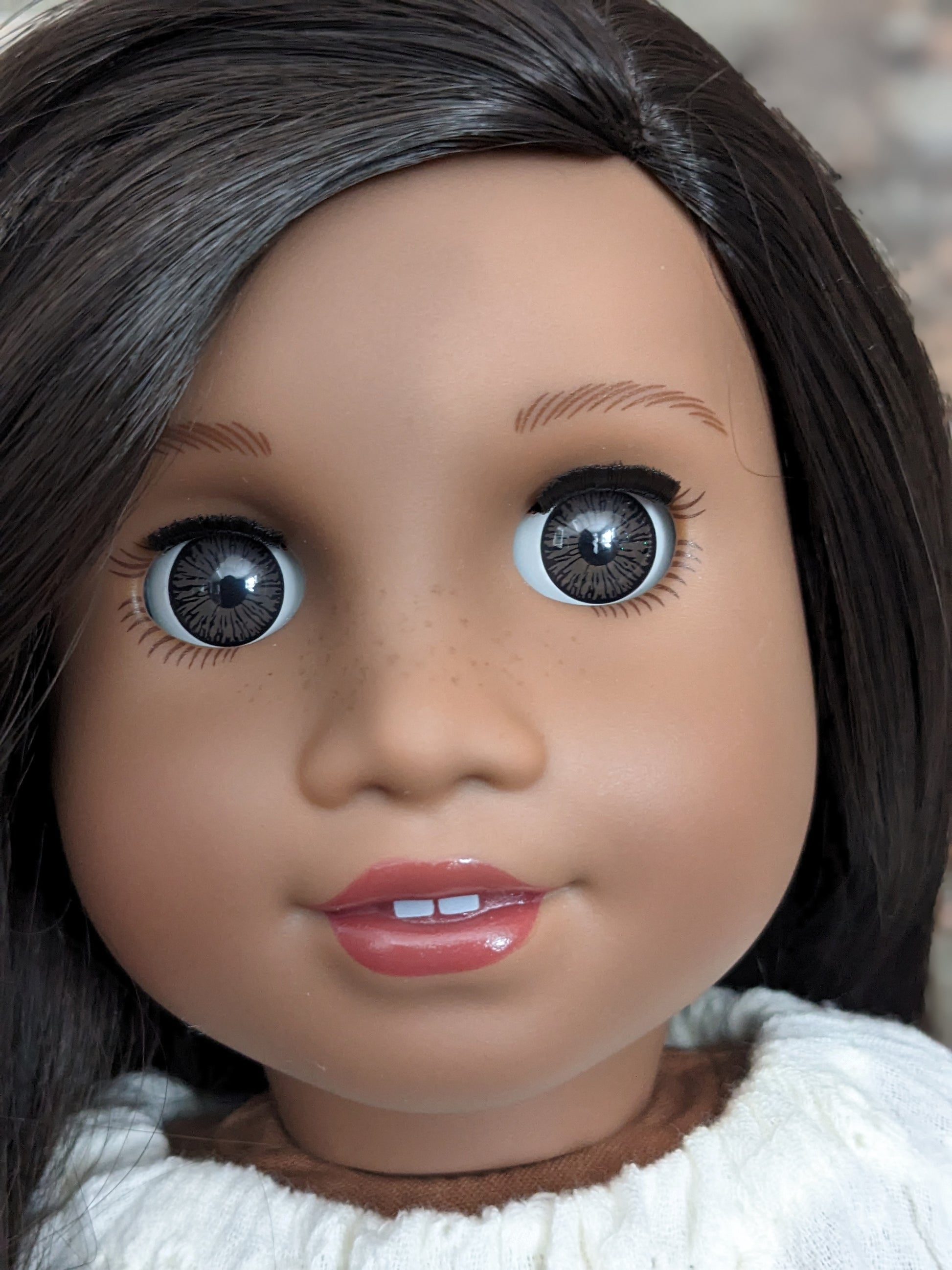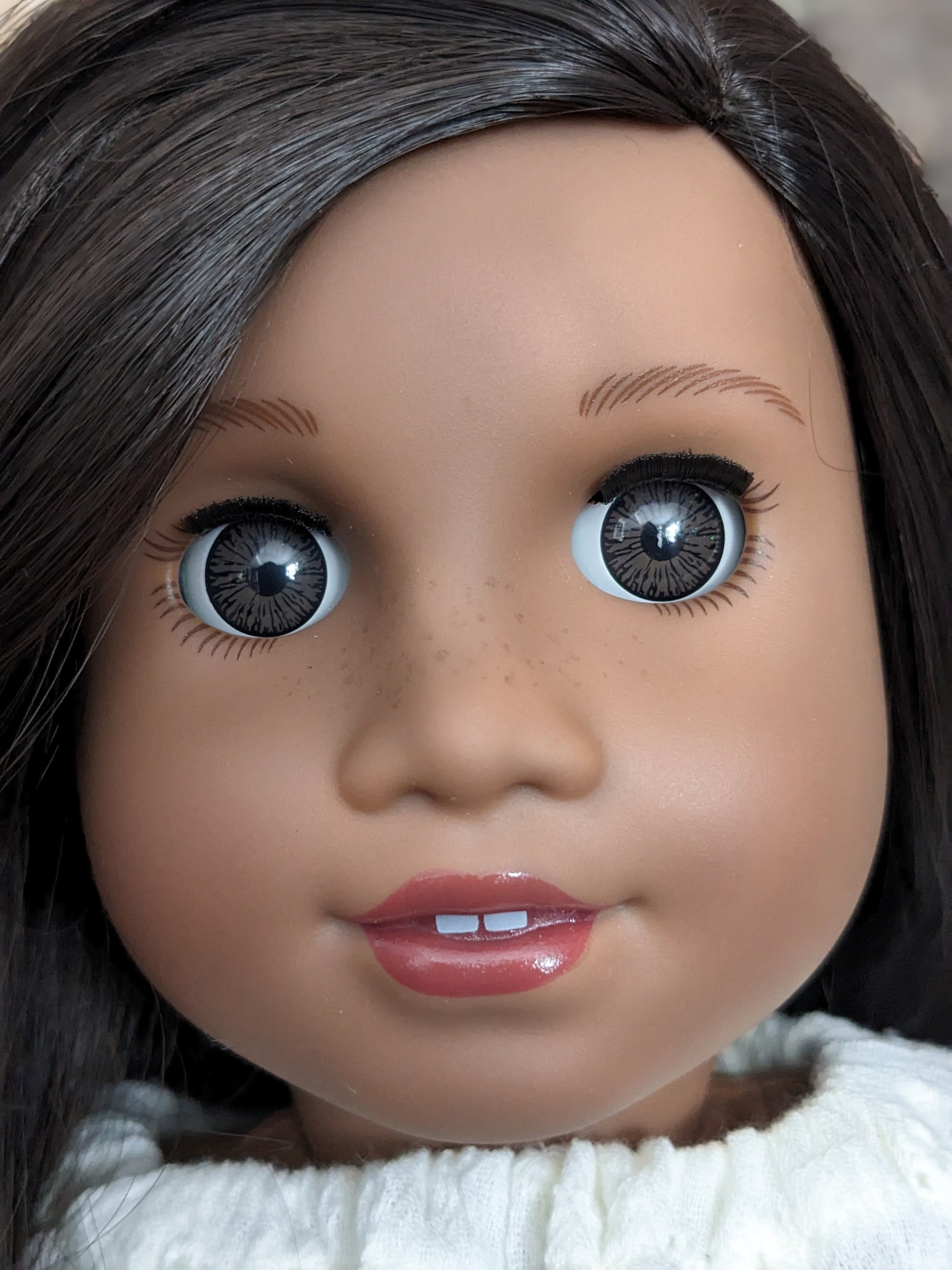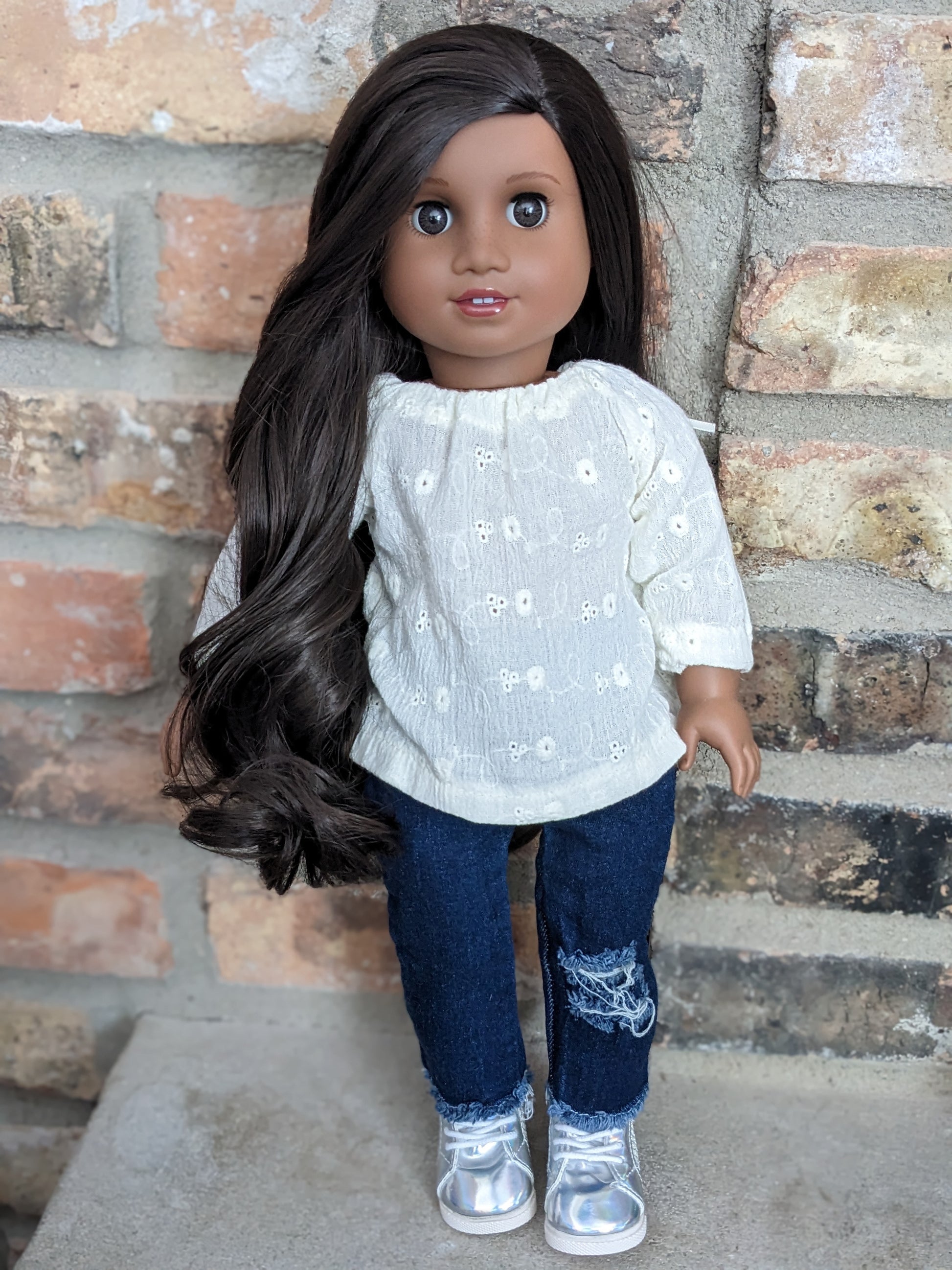 This one of a kind OOAK custom American Girl doll was created with a brand new doll, a dark brown wig, and brown decal eyes from a new Claudie doll. She has lip gloss and freckles that were hand painted and sealed. She may have some minor shine marks from handling. She comes with the outfit pictured.