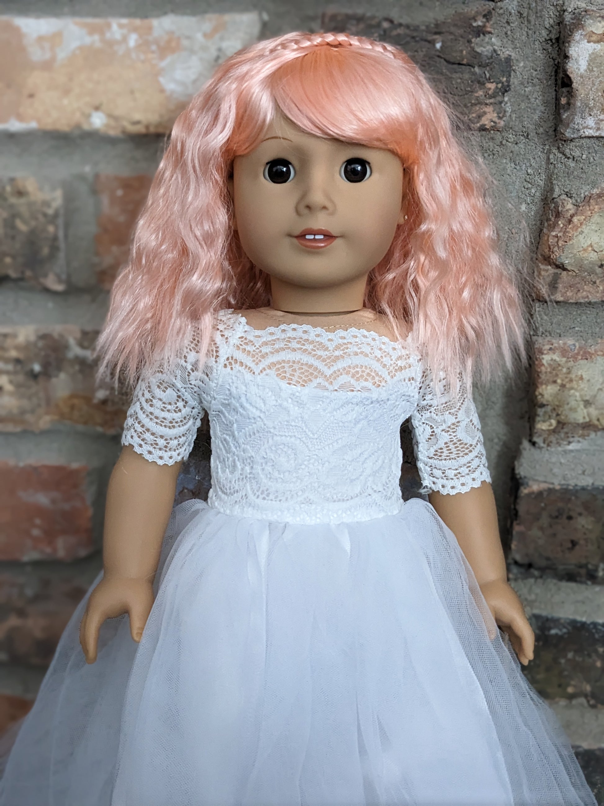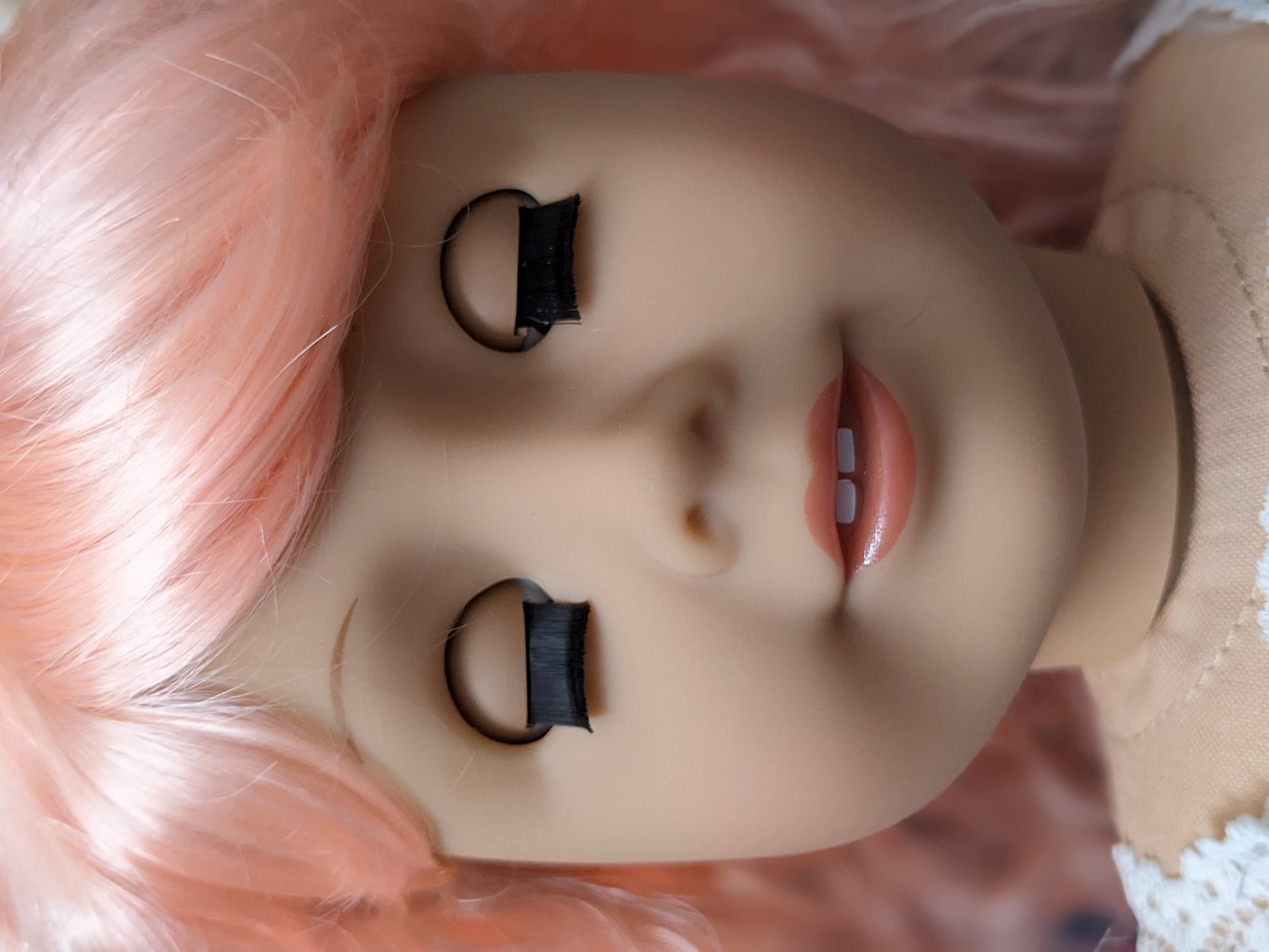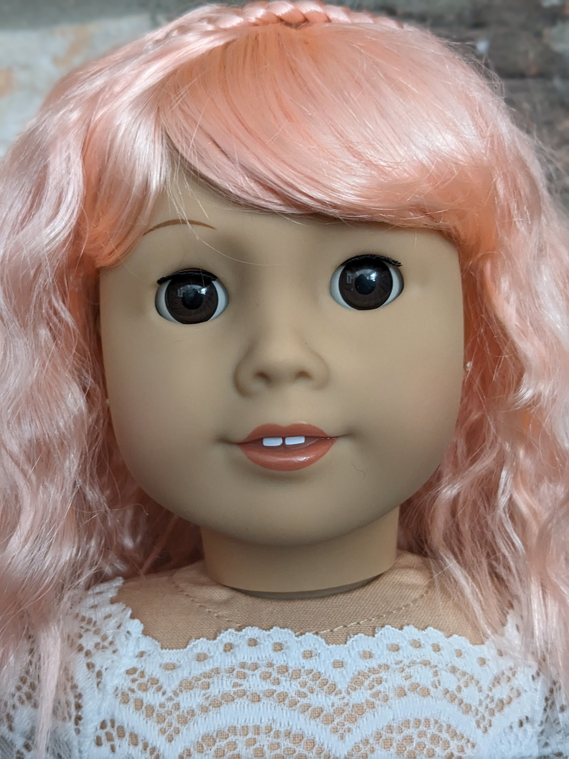 This one of a kind OOAK custom American Girl doll was created with a brand new doll, a pink vegan mohair wig, and brown eyes. She has lip gloss that was hand painted and sealed. She may have some minor shine marks from handling. She comes with the outfit pictured. Her ears are pierced with normal earrings and the tiny diamond look studs are included.