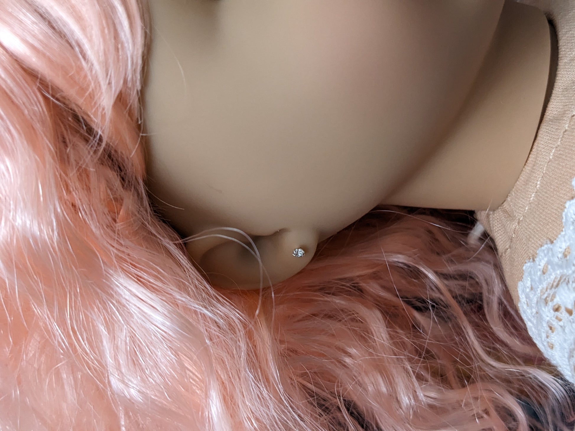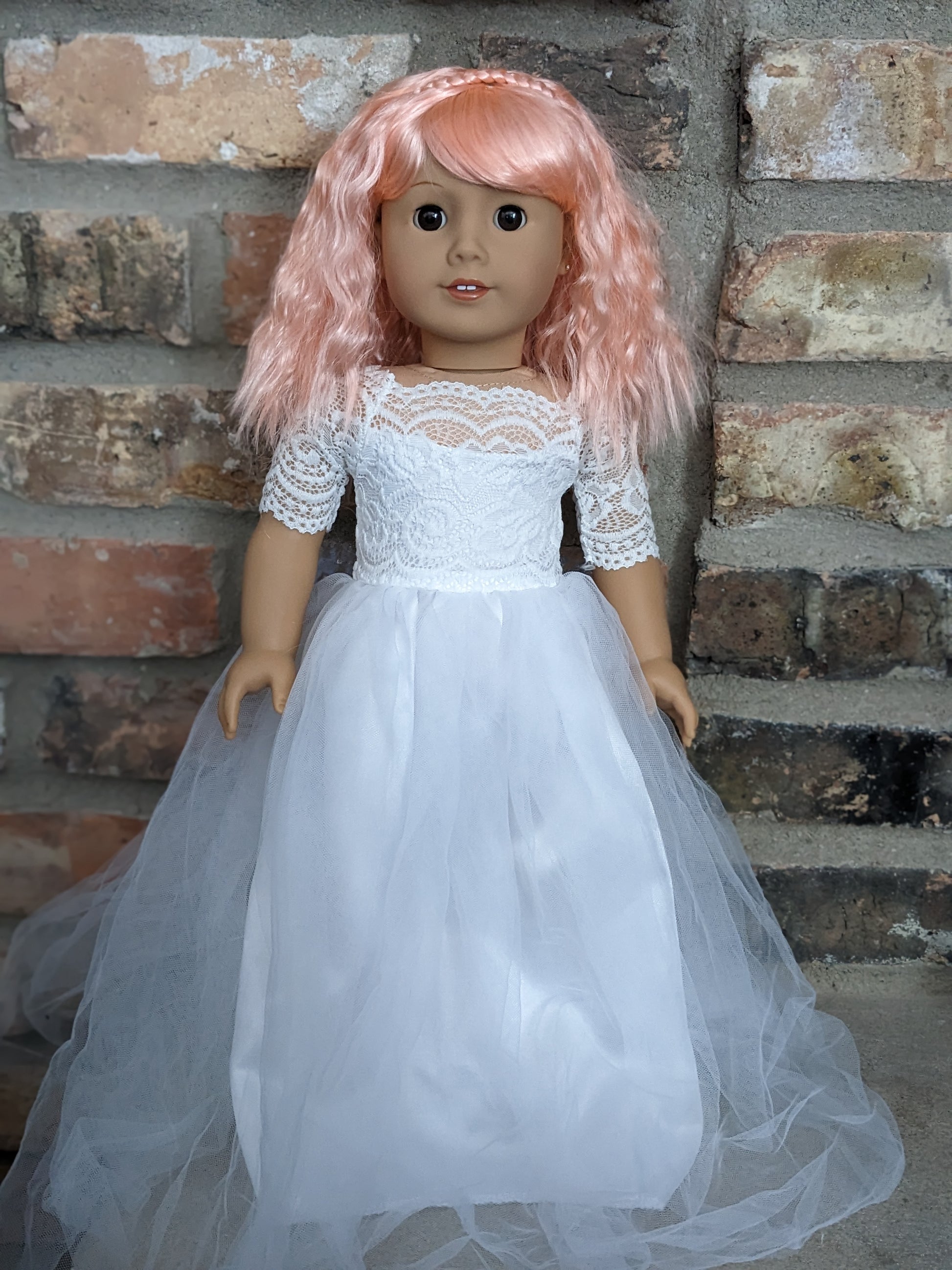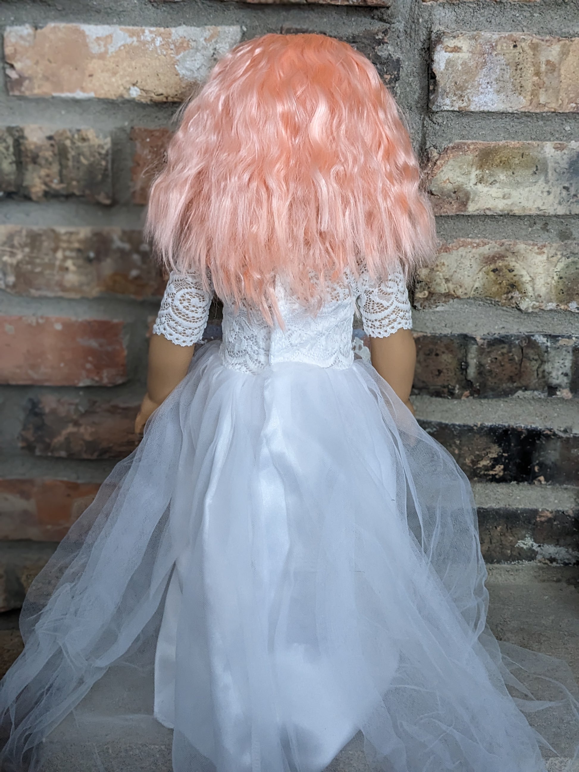 This one of a kind OOAK custom American Girl doll was created with a brand new doll, a pink vegan mohair wig, and brown eyes. She has lip gloss that was hand painted and sealed. She may have some minor shine marks from handling. She comes with the outfit pictured. Her ears are pierced with normal earrings and the tiny diamond look studs are included.