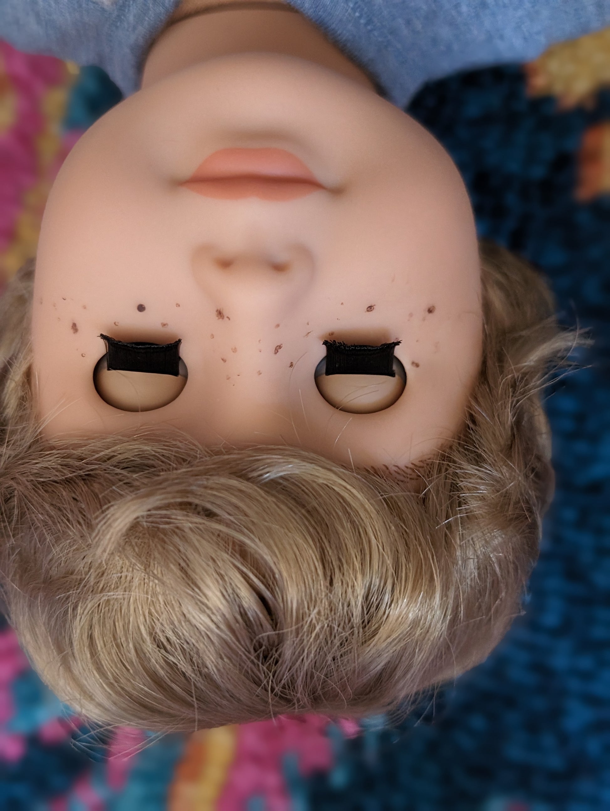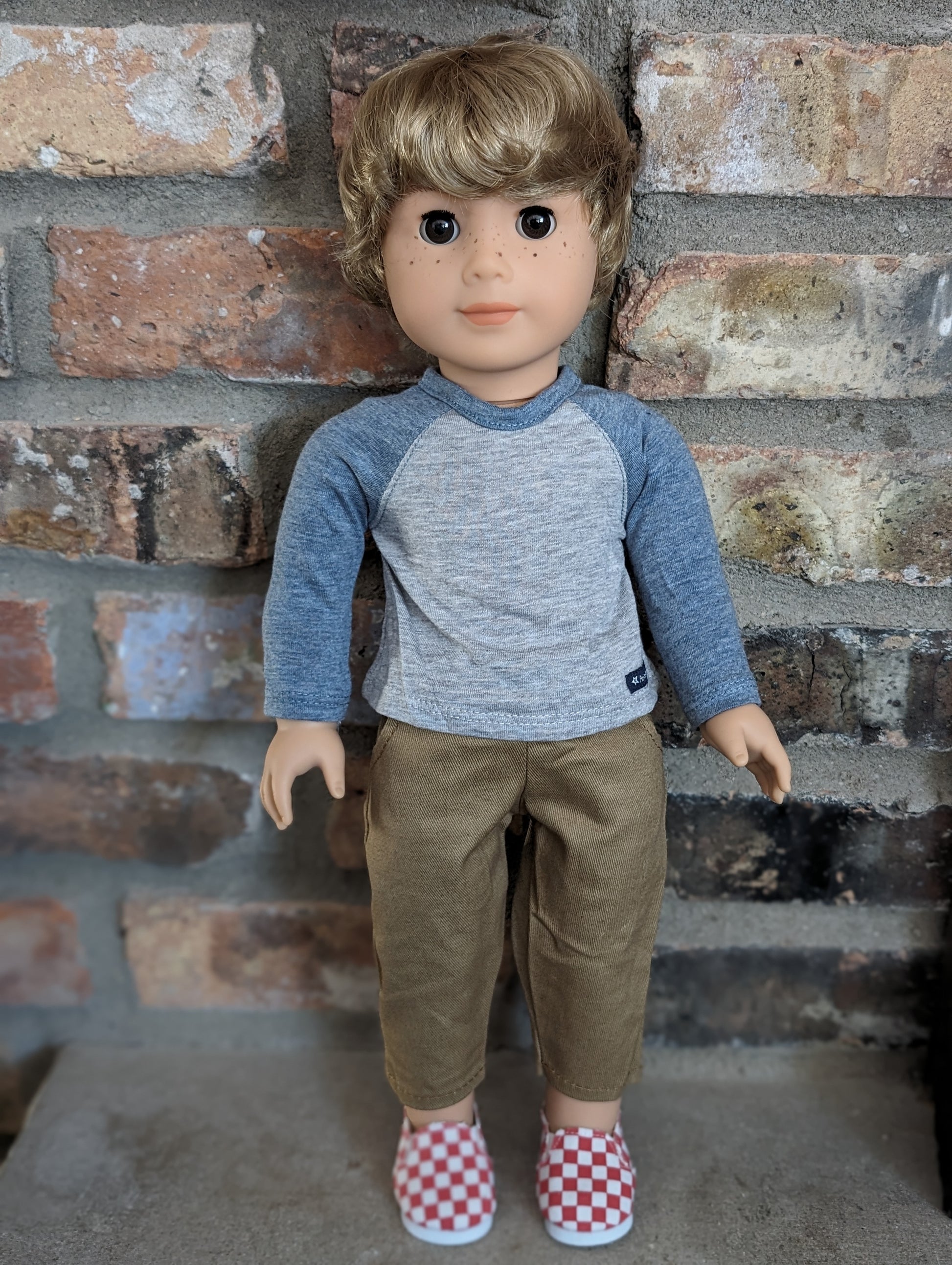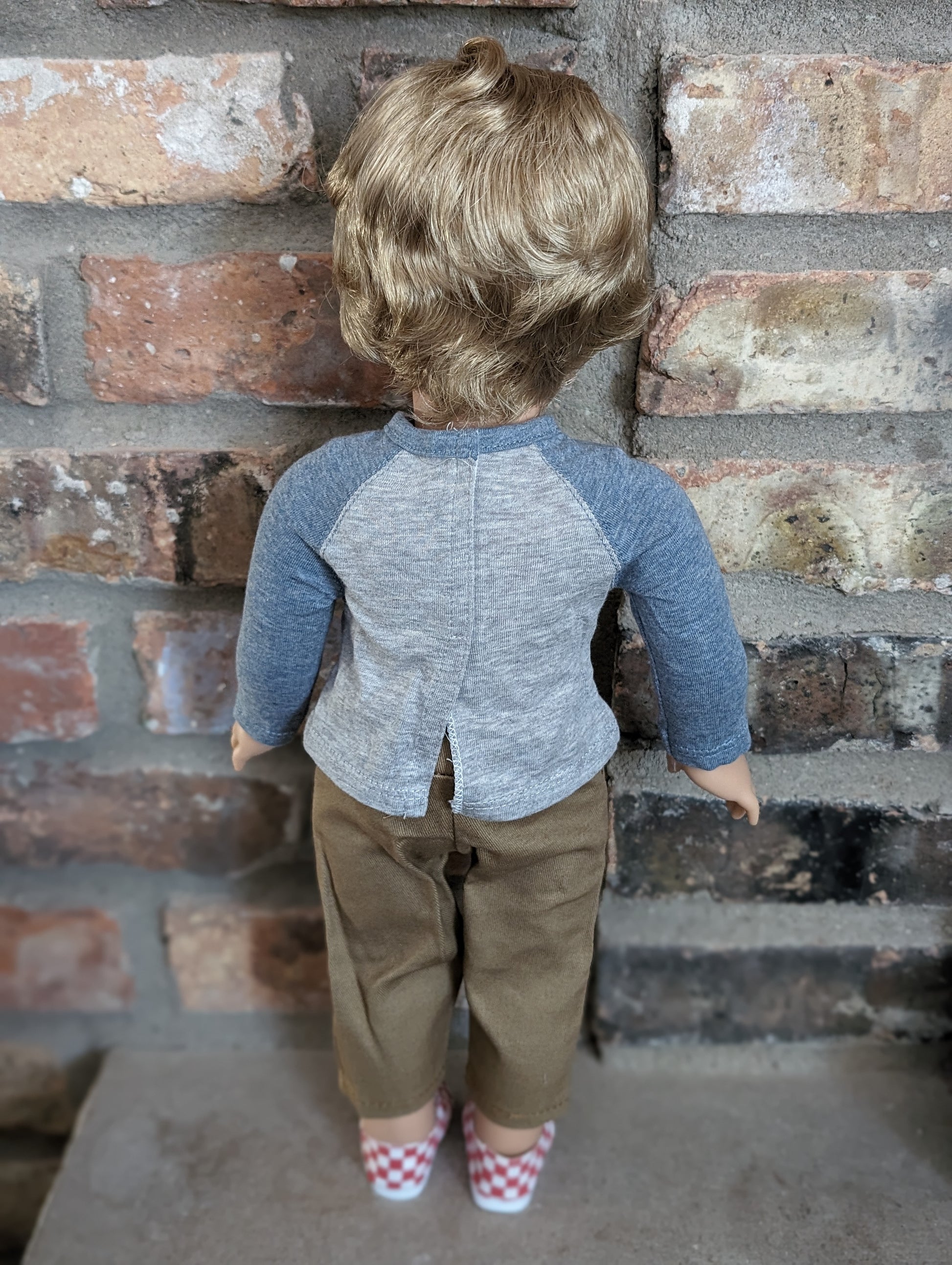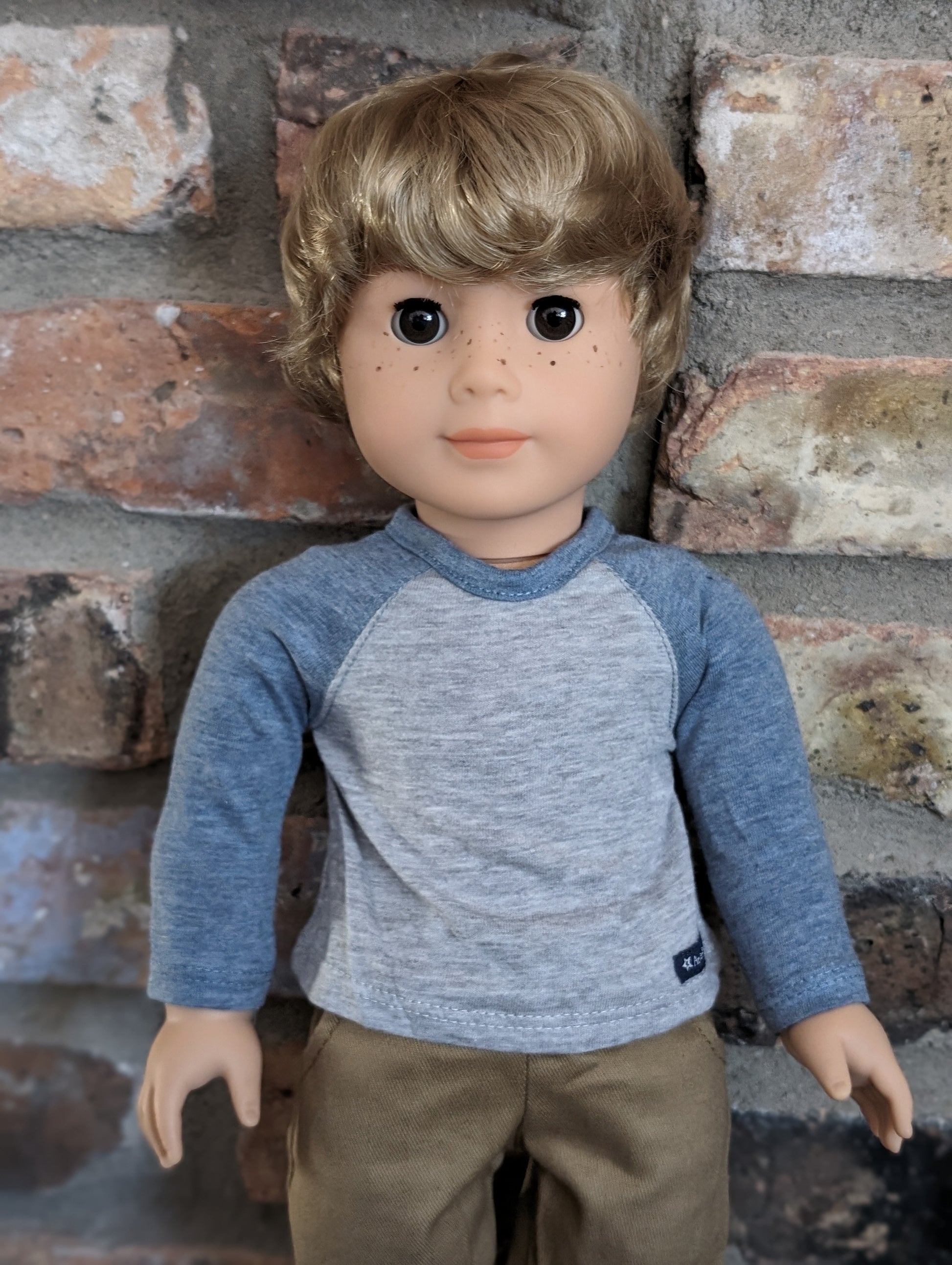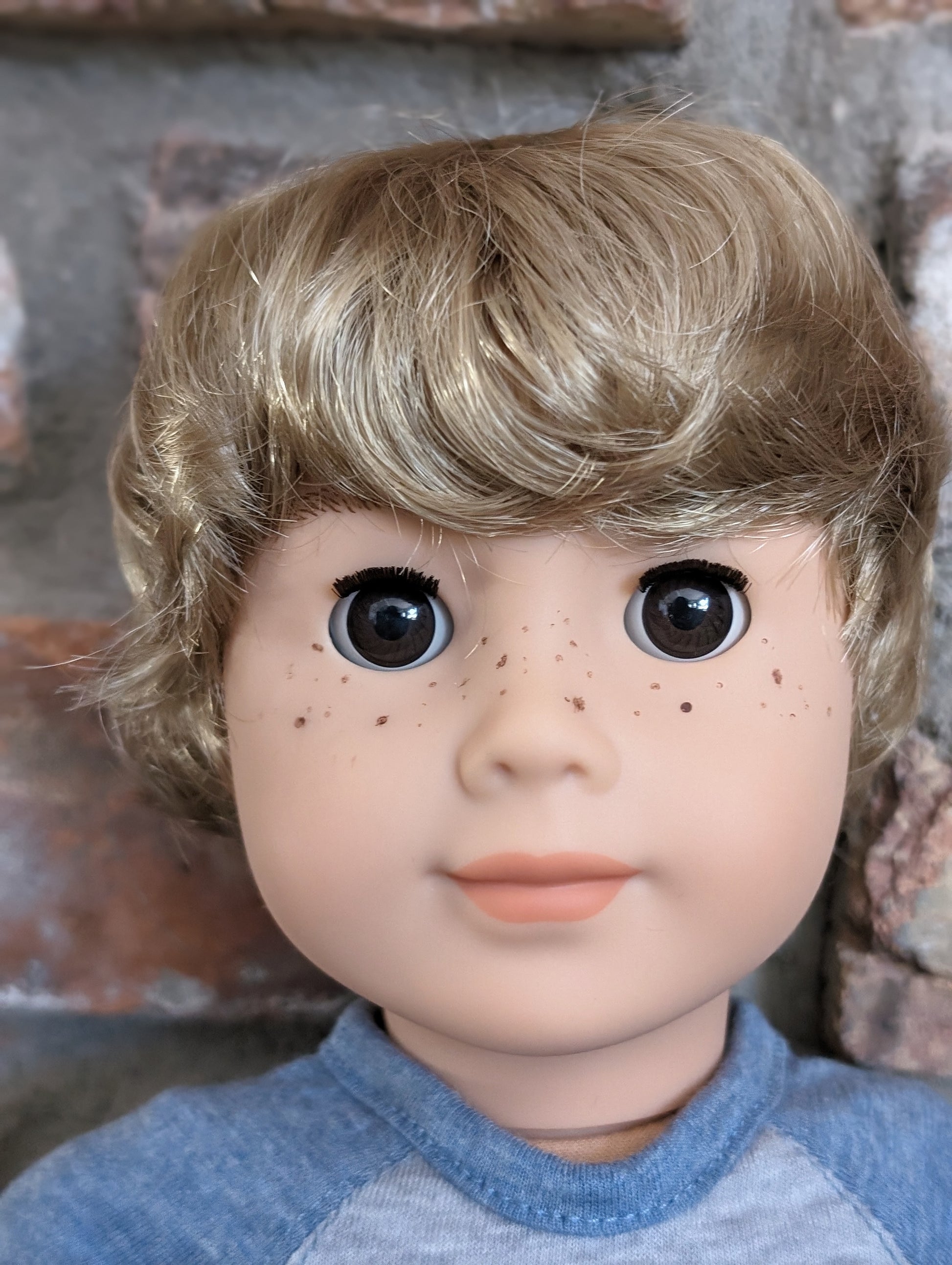 This one of a kind OOAK custom boy American Girl doll was created with a brand new doll, a blonde wig, and brown eyes. He has freckles that were hand painted and sealed. He may have some minor shine marks from handling. He comes with the outfit pictured.