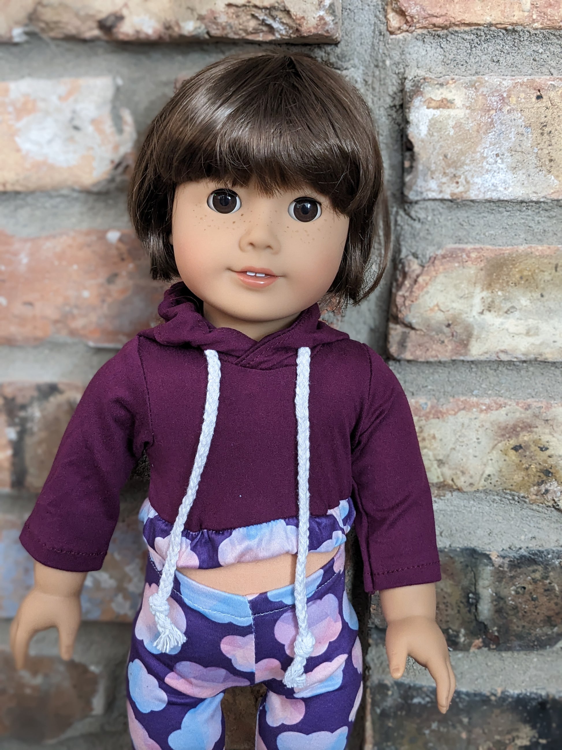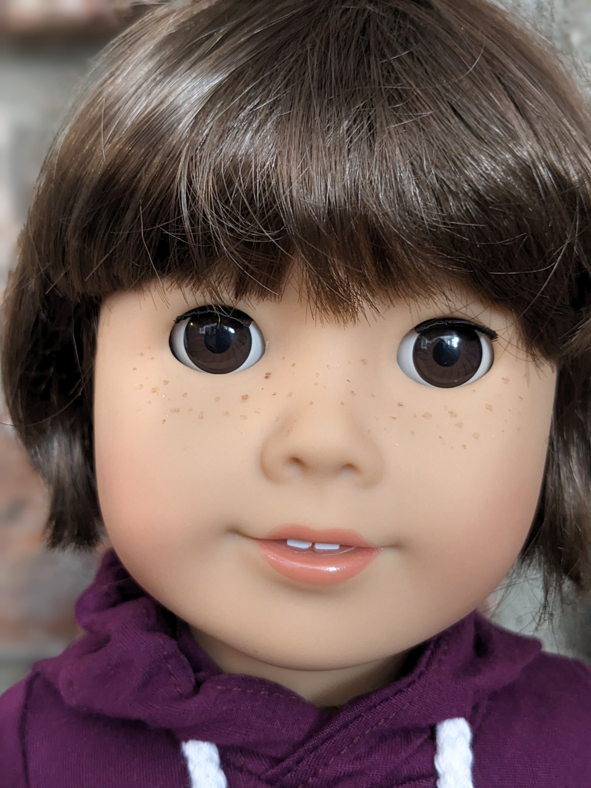 This one of a kind OOAK custom American Girl doll was created with a brand new doll, a brown vegan mohair wig, and brown eyes. She has lip gloss and freckles that were hand painted and sealed. She may have some minor shine marks from handling. She comes with the outfit pictured. She has a microfiber cloth body with permapanties.