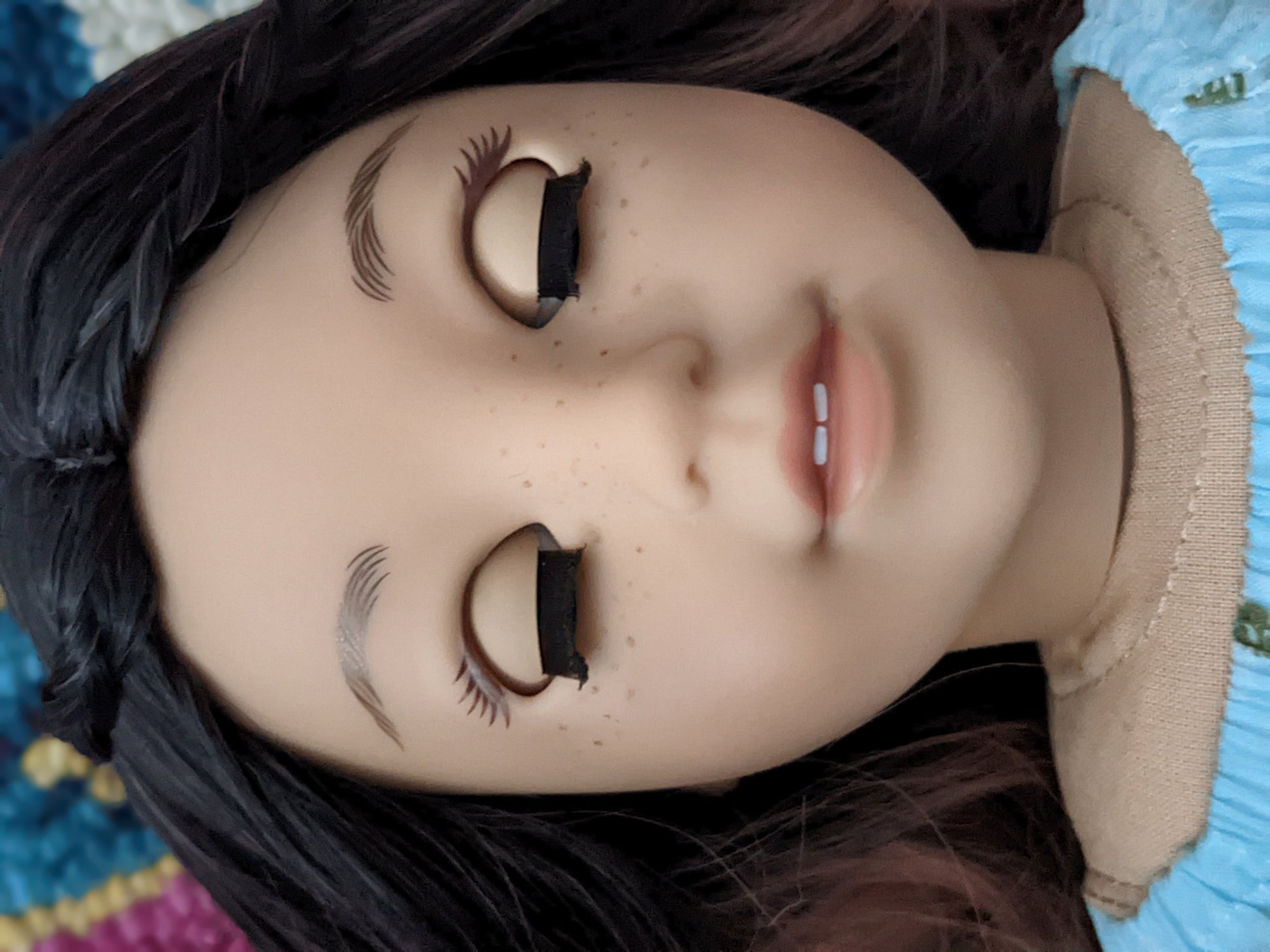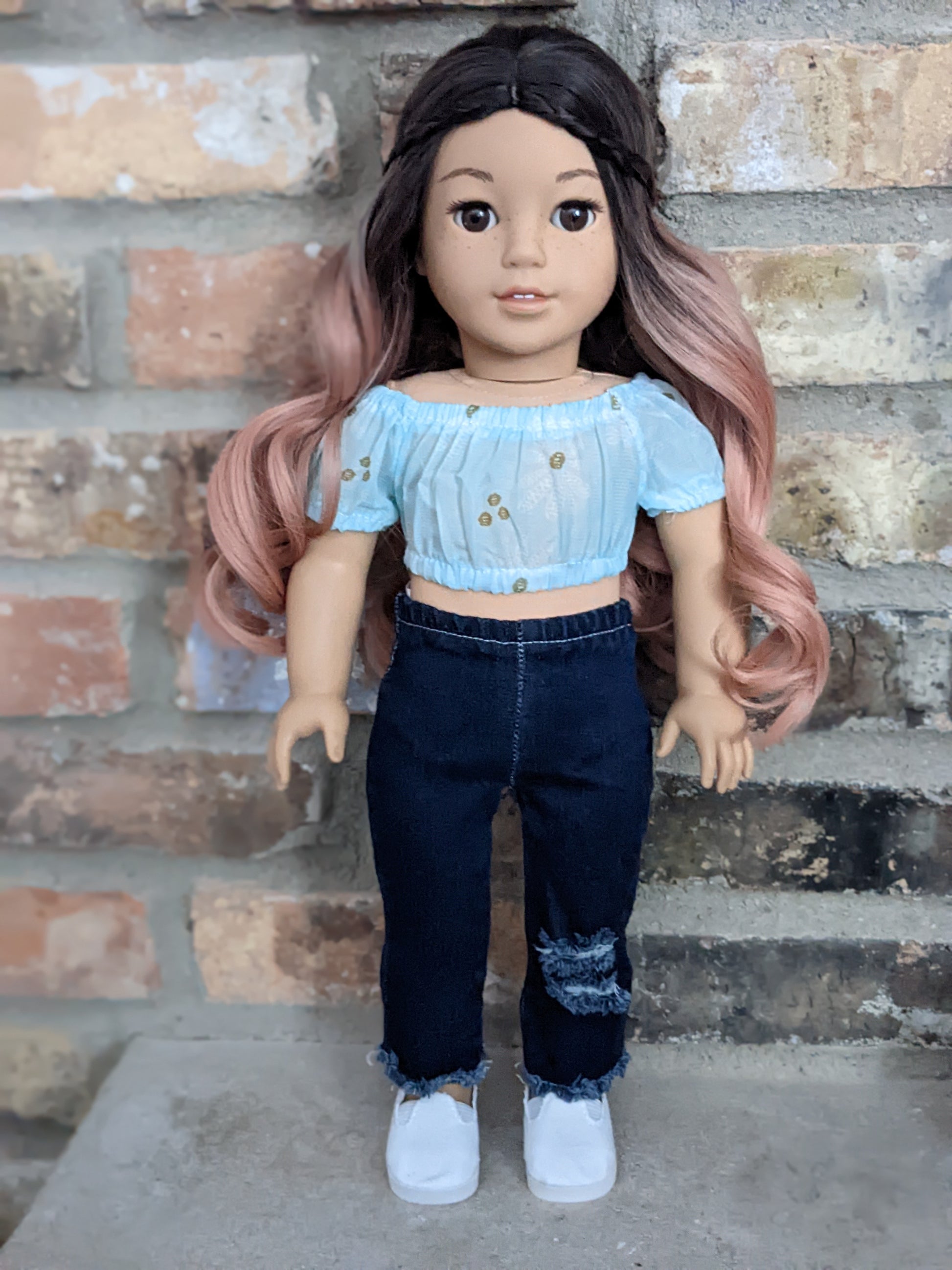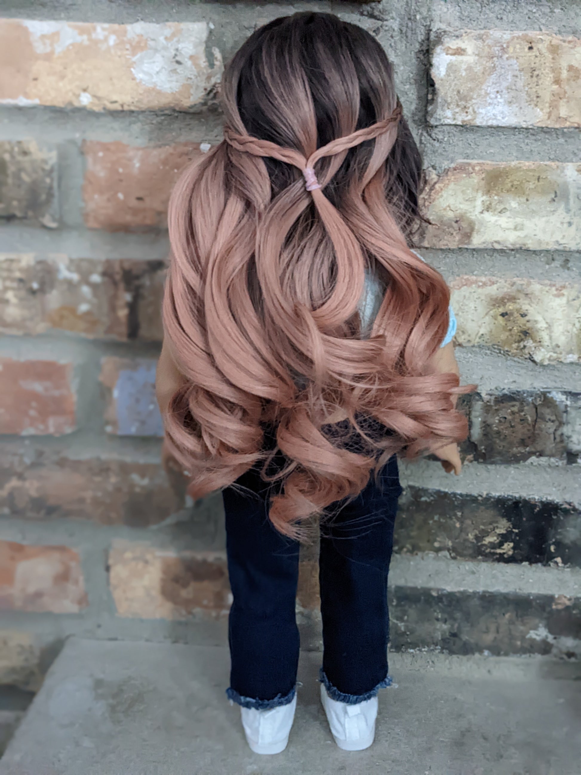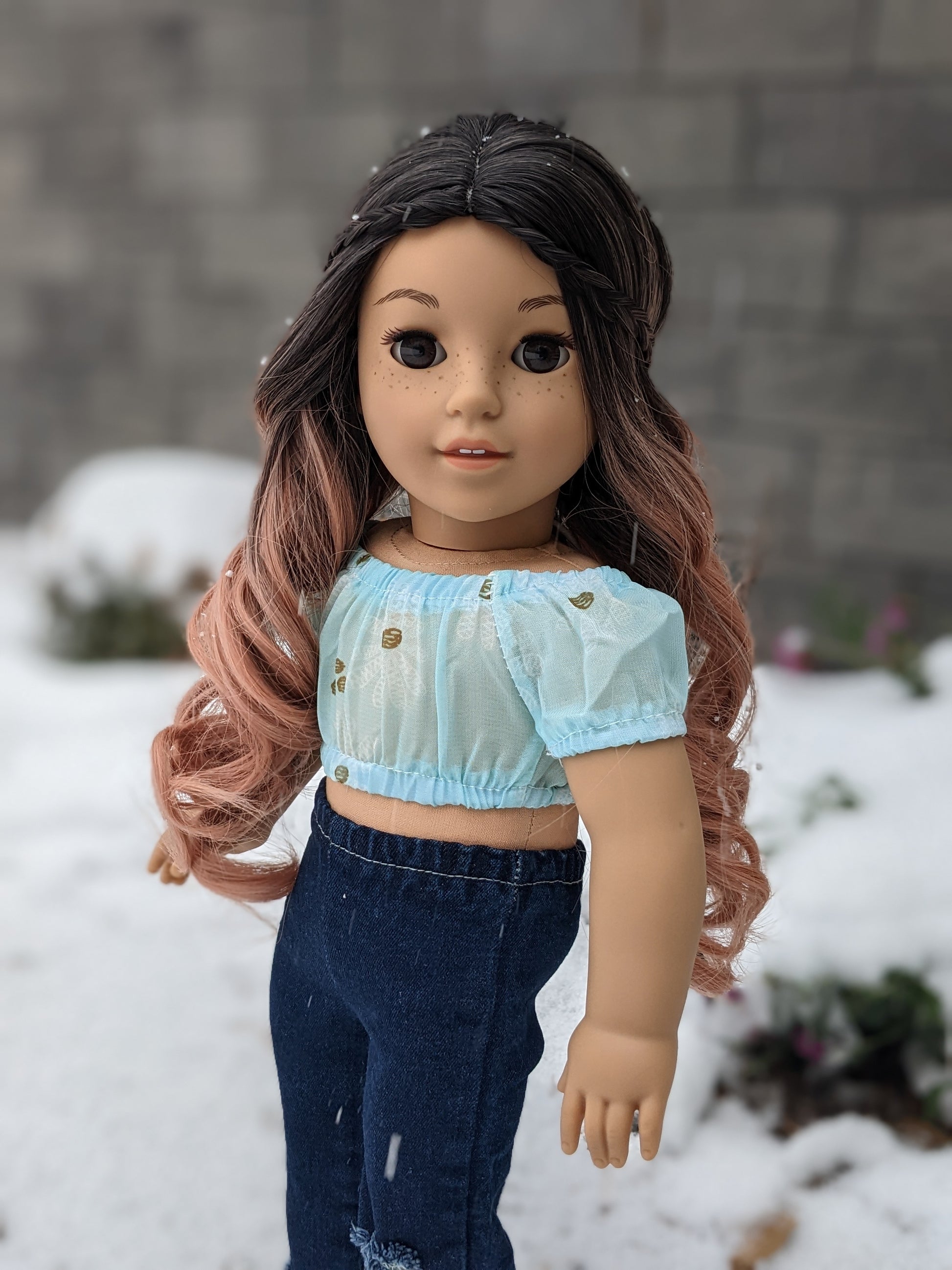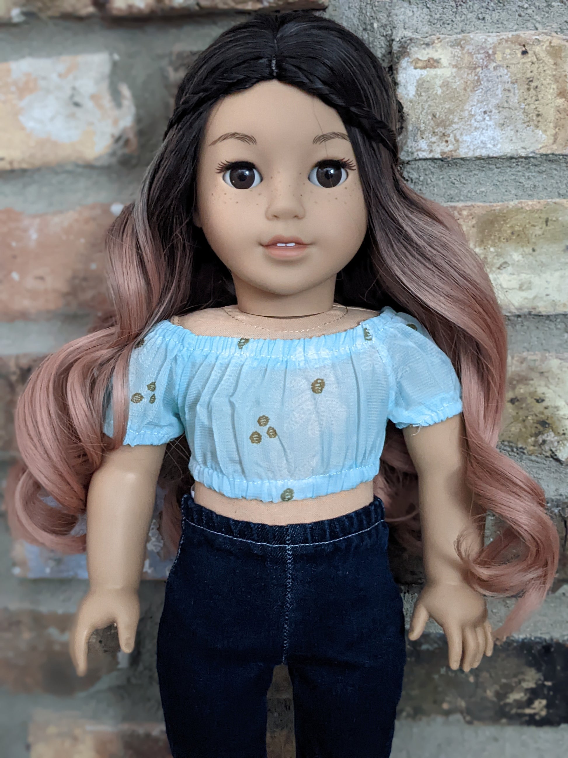 This one of a kind OOAK custom American Girl doll was created with a brand new Corinne doll, a black to dusty rose ombre wig, and brown eyes. She has lip gloss and freckles that were hand painted and sealed. She may have some minor shine marks from handling. She will ship nude..