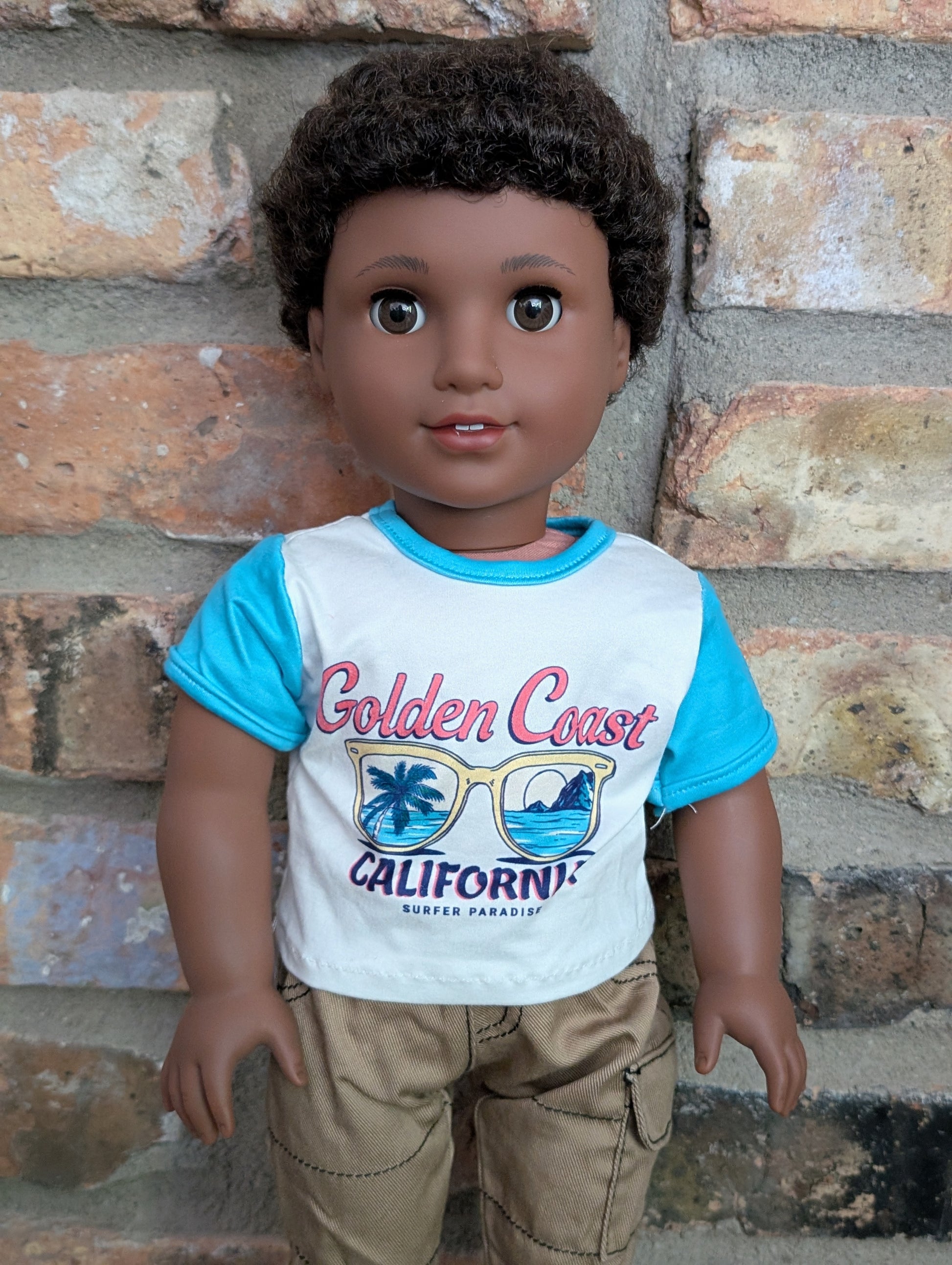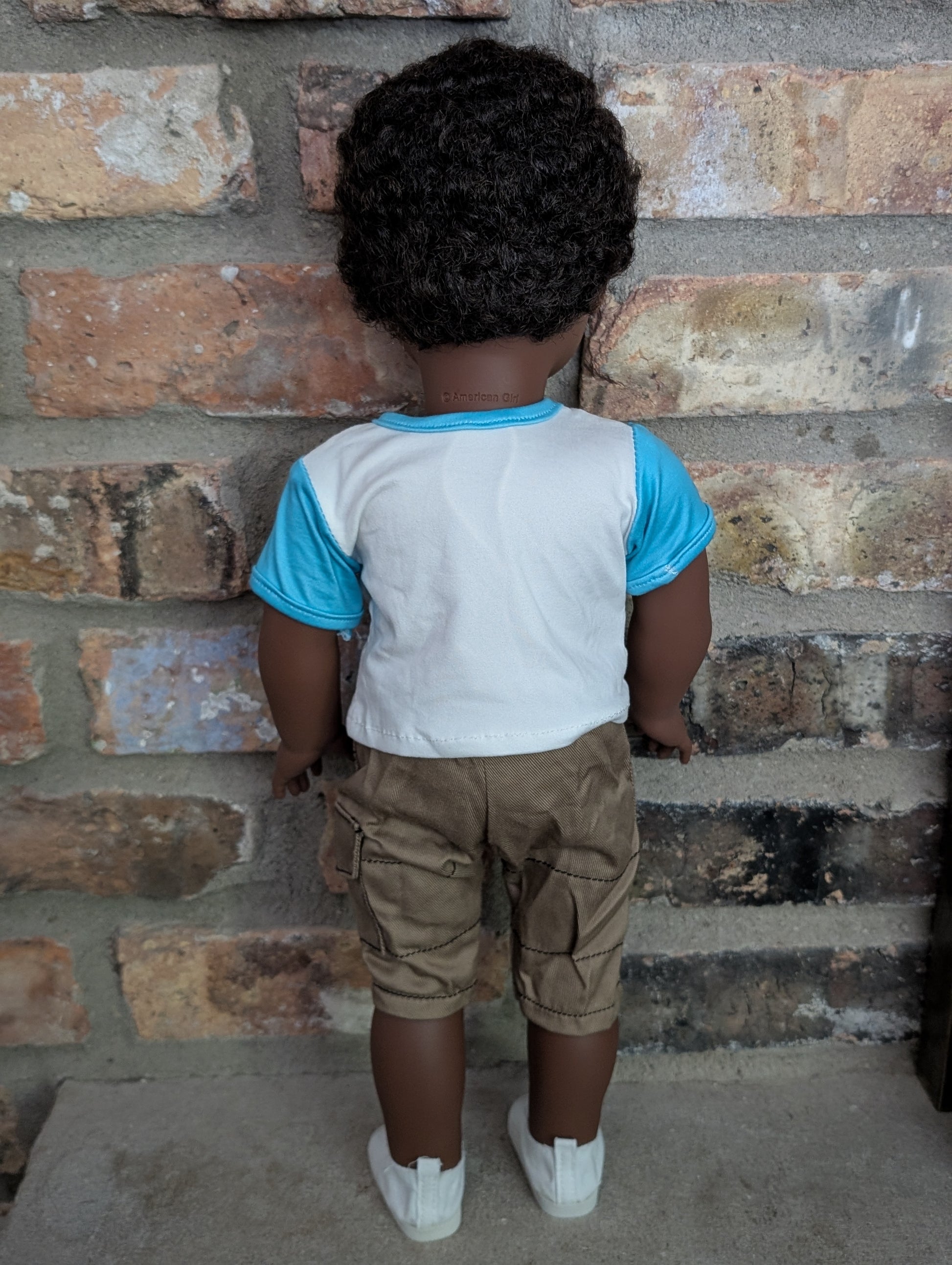 This one of a kind OOAK custom boy American Girl doll was created with a brand new doll, a dark brown wig, and brown eyes. He may have some minor shine marks from handling. He comes with the outfit pictured.