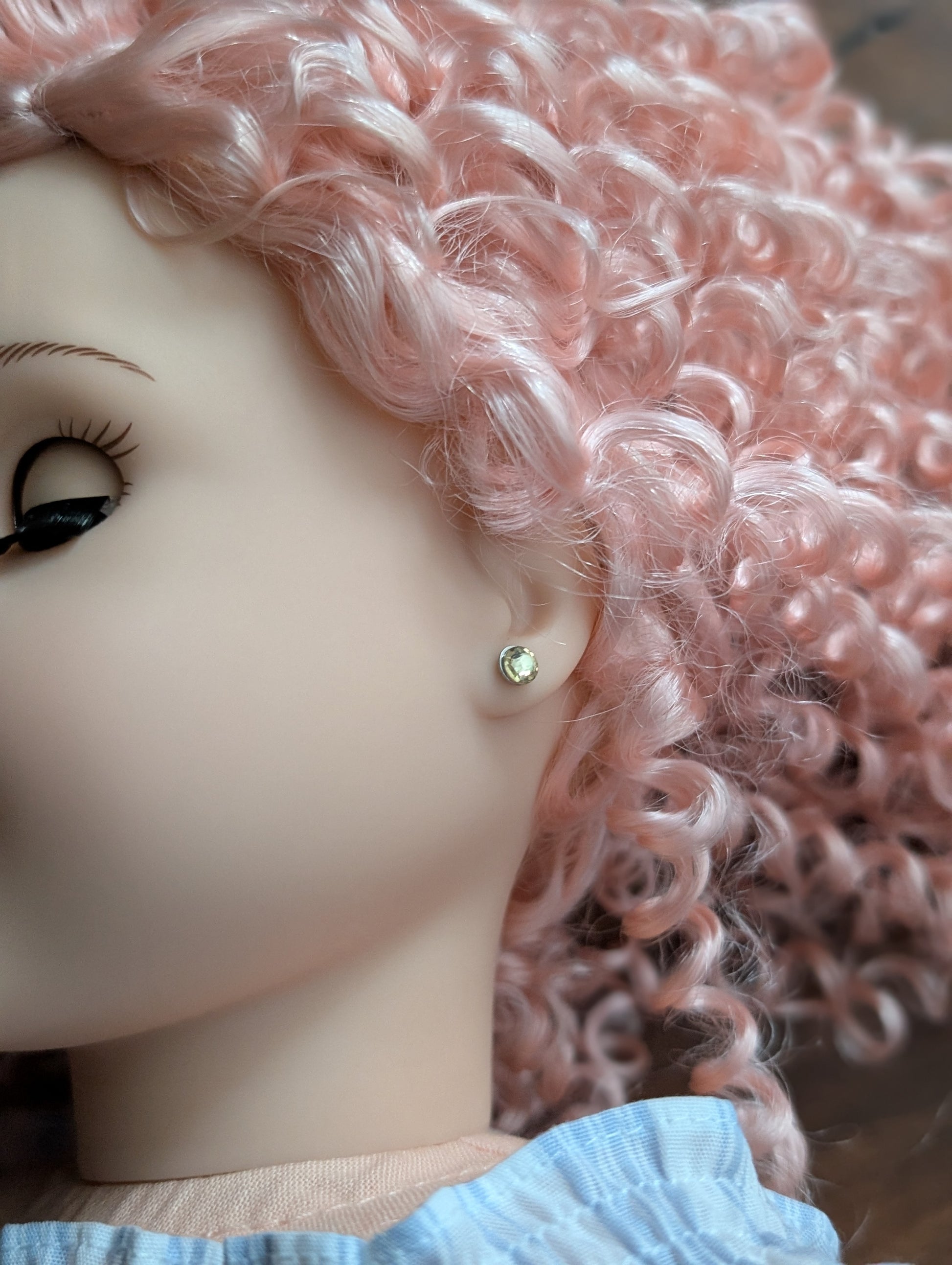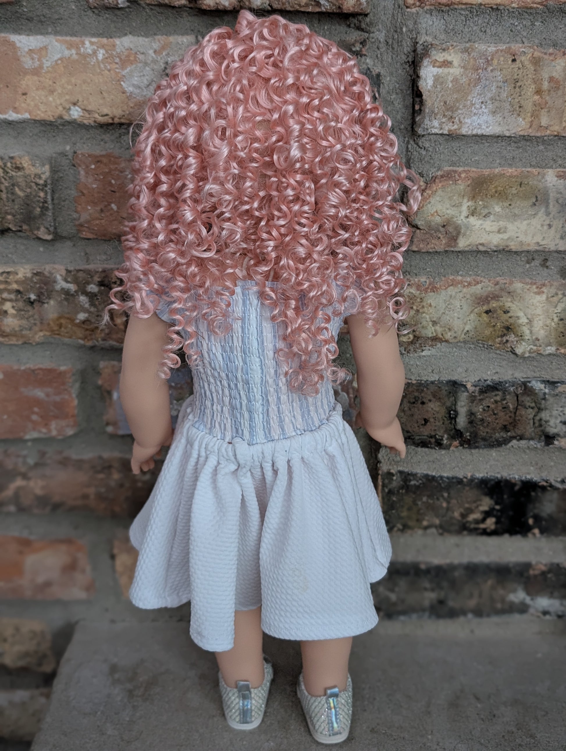 This one of a kind OOAK custom American Girl doll was created with a brand new Cinderella doll, a pink wig, and blue eyes. She has lip gloss that was hand painted and sealed. She may have some minor shine marks from handling. She comes with the outfit pictured. Her ears are pierced with American Girl doll sized earrings.