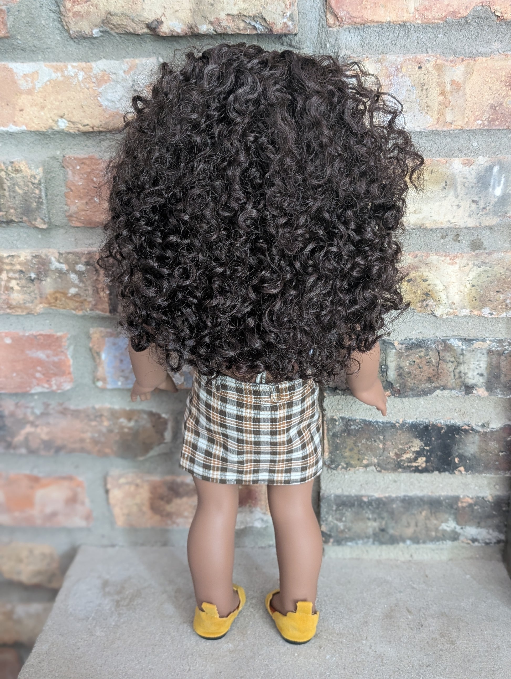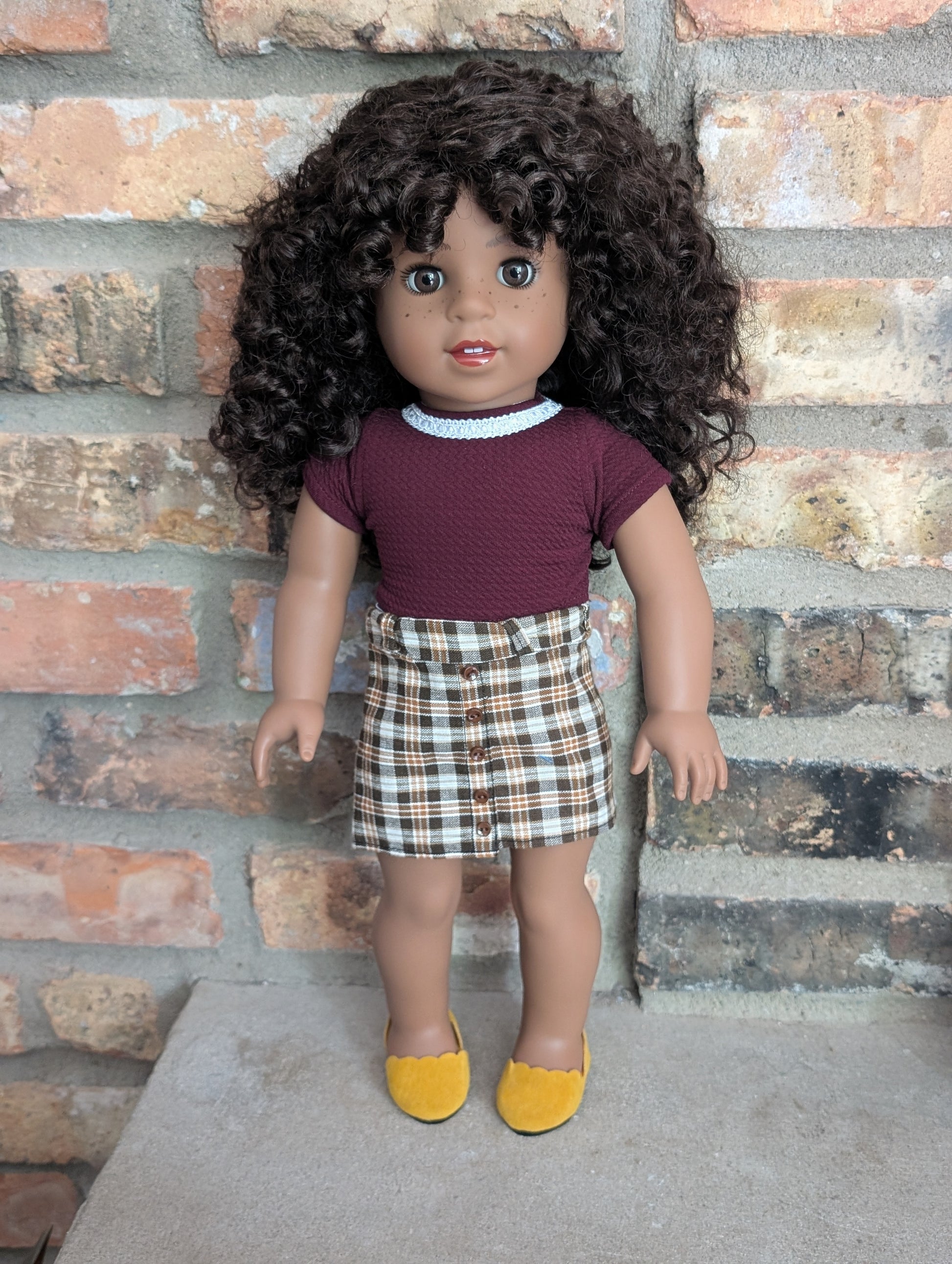 This one of a kind OOAK custom American Girl doll was created with a brand new doll, a brown wig, and brown eyes. She has lip gloss and freckles that were hand painted and sealed. She may have some minor shine marks from handling. She comes with the outfit pictured.