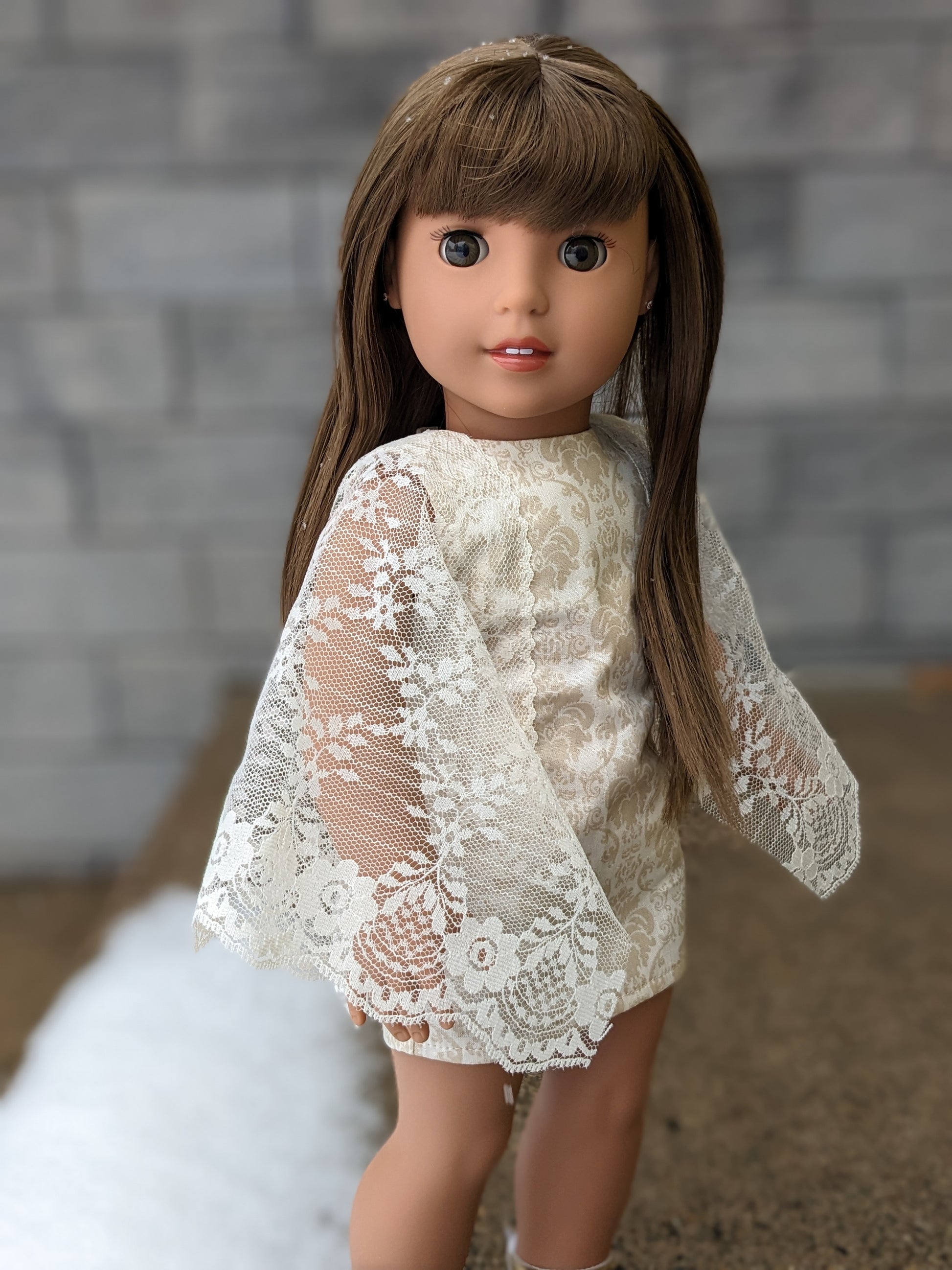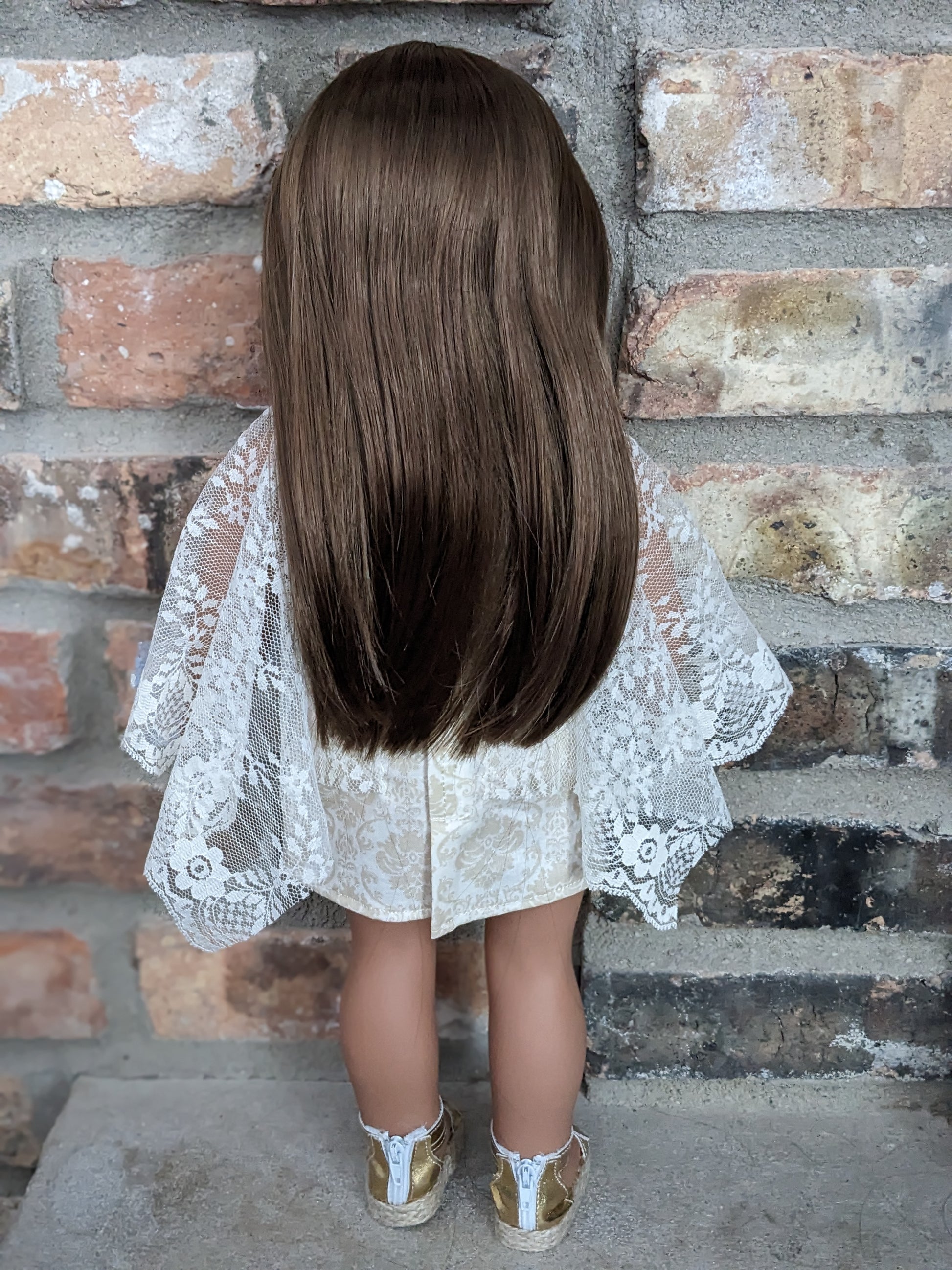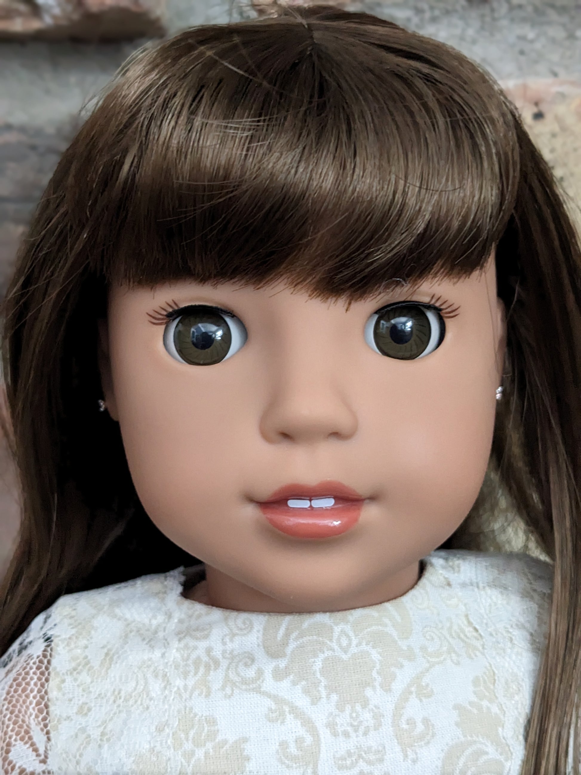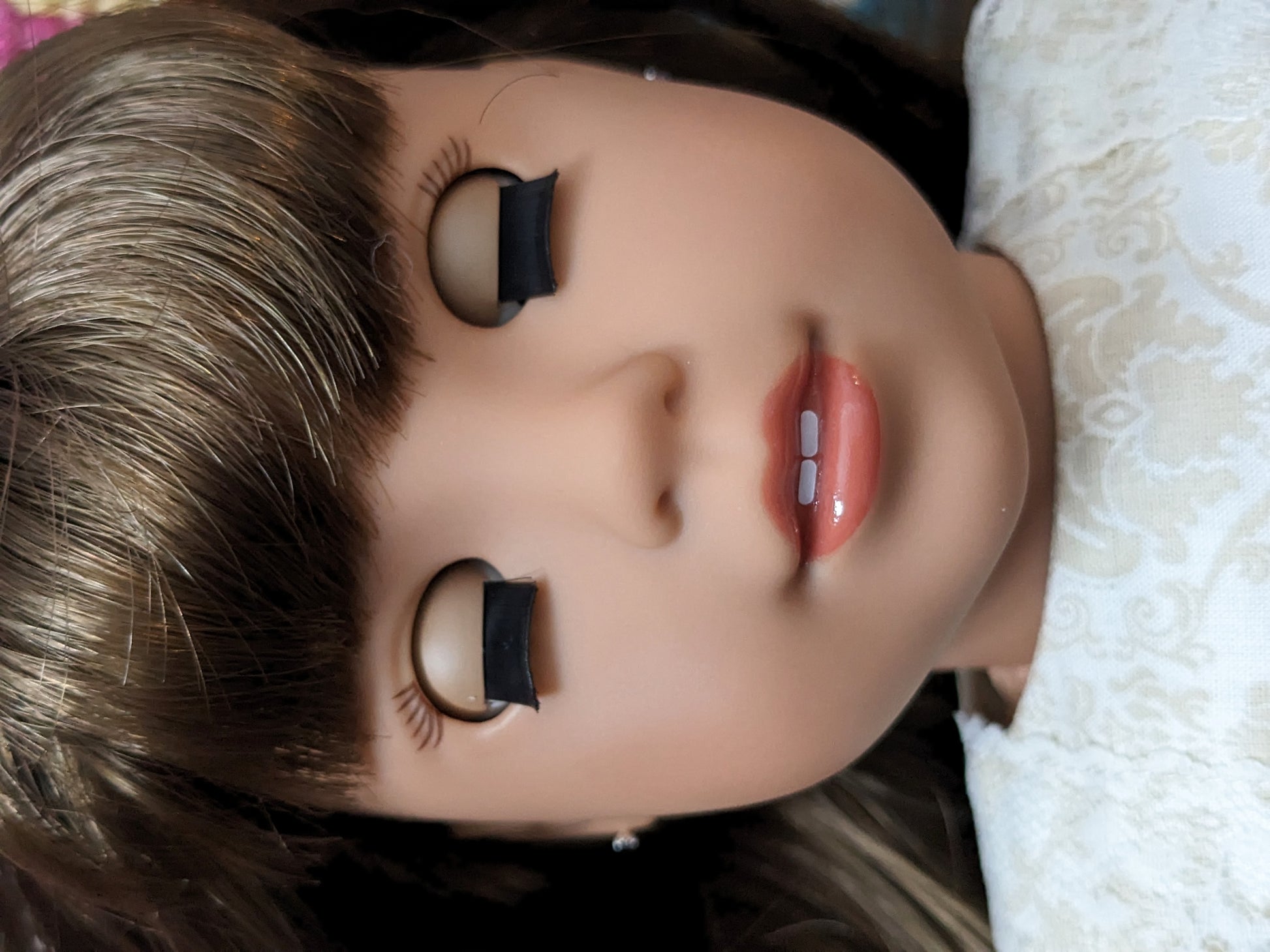 This one of a kind OOAK custom American Girl doll was created with a brand new Truly Me doll, a brown wig, and brown eyes. She has lip gloss that was hand painted and sealed. She may have some minor shine marks from handling. She comes with the outfit pictured made by Sashali on Etsy. Her painted on eyelashes have been removed. Her ears are pierced with normal earrings and the tiny diamond look studs are included.