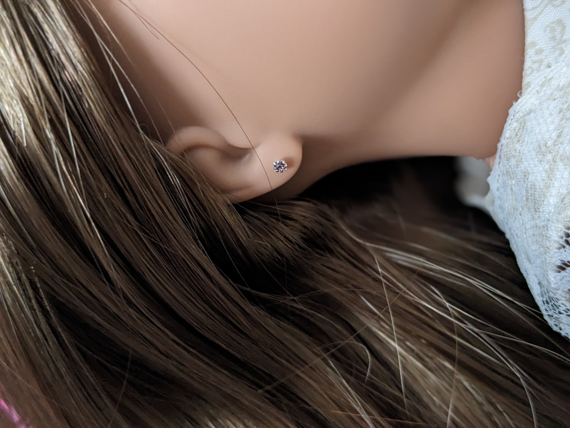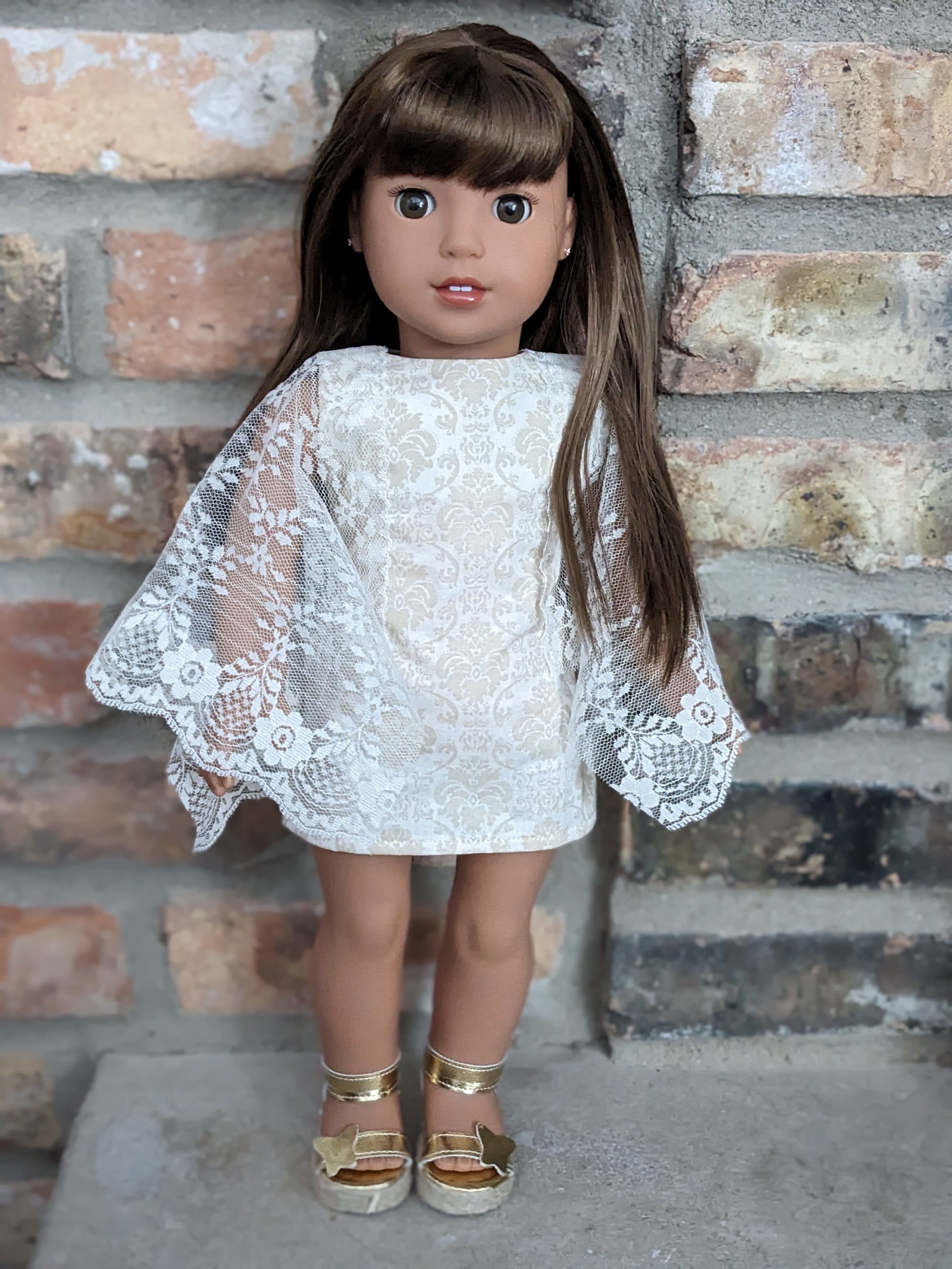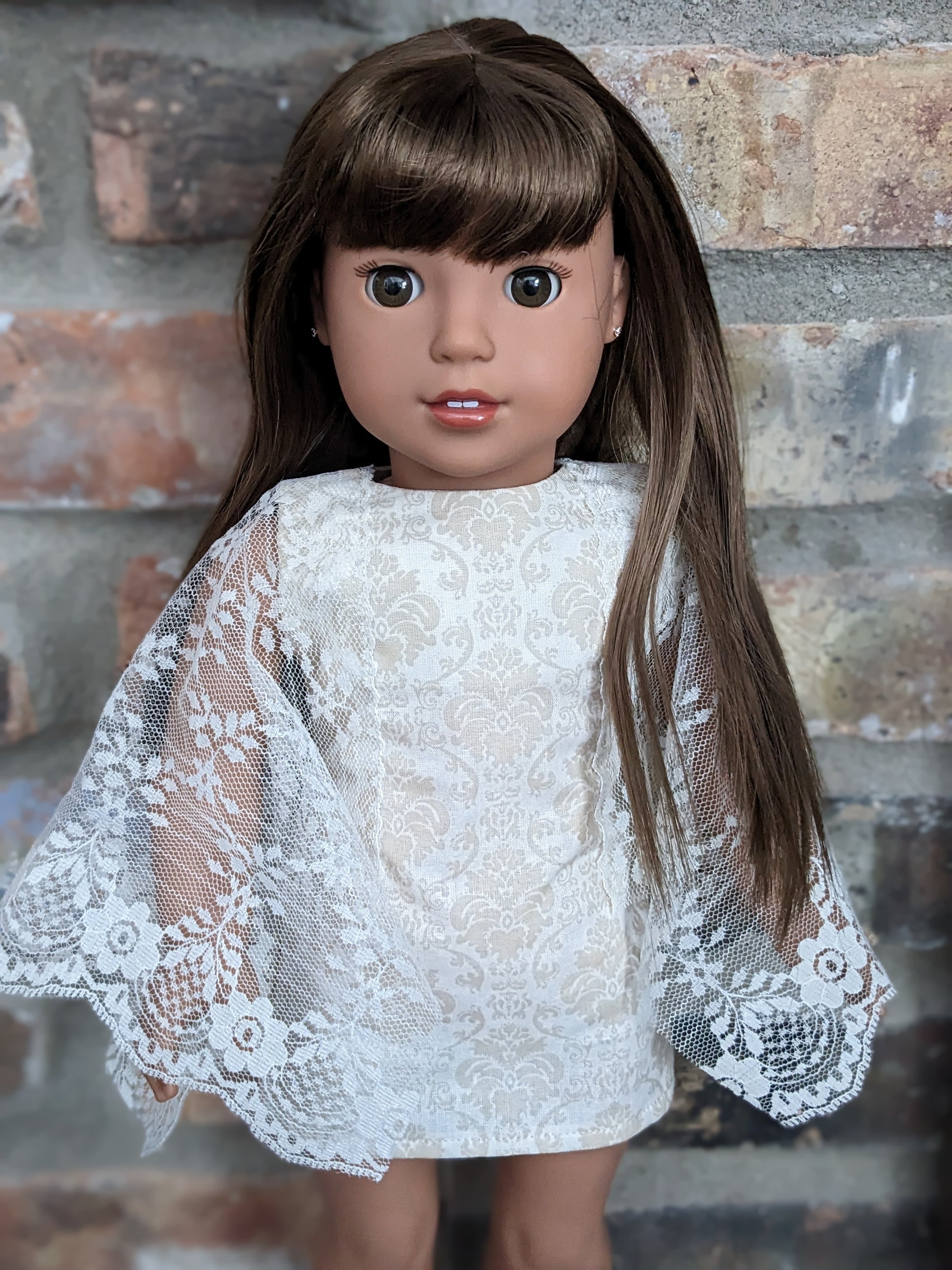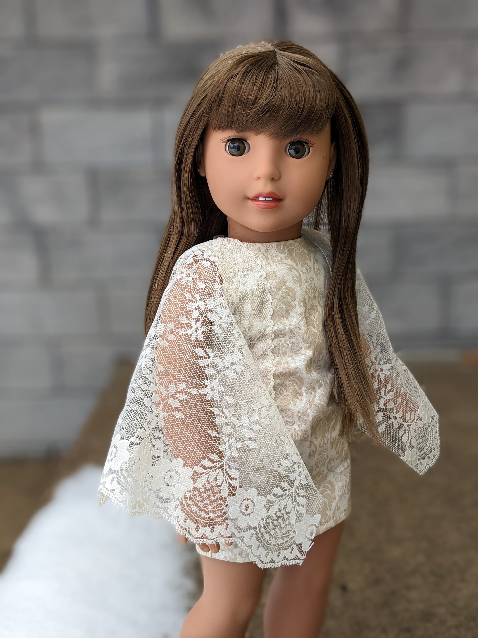 This one of a kind OOAK custom American Girl doll was created with a brand new Truly Me doll, a brown wig, and brown eyes. She has lip gloss that was hand painted and sealed. She may have some minor shine marks from handling. She comes with the outfit pictured made by Sashali on Etsy. Her painted on eyelashes have been removed. Her ears are pierced with normal earrings and the tiny diamond look studs are included.
