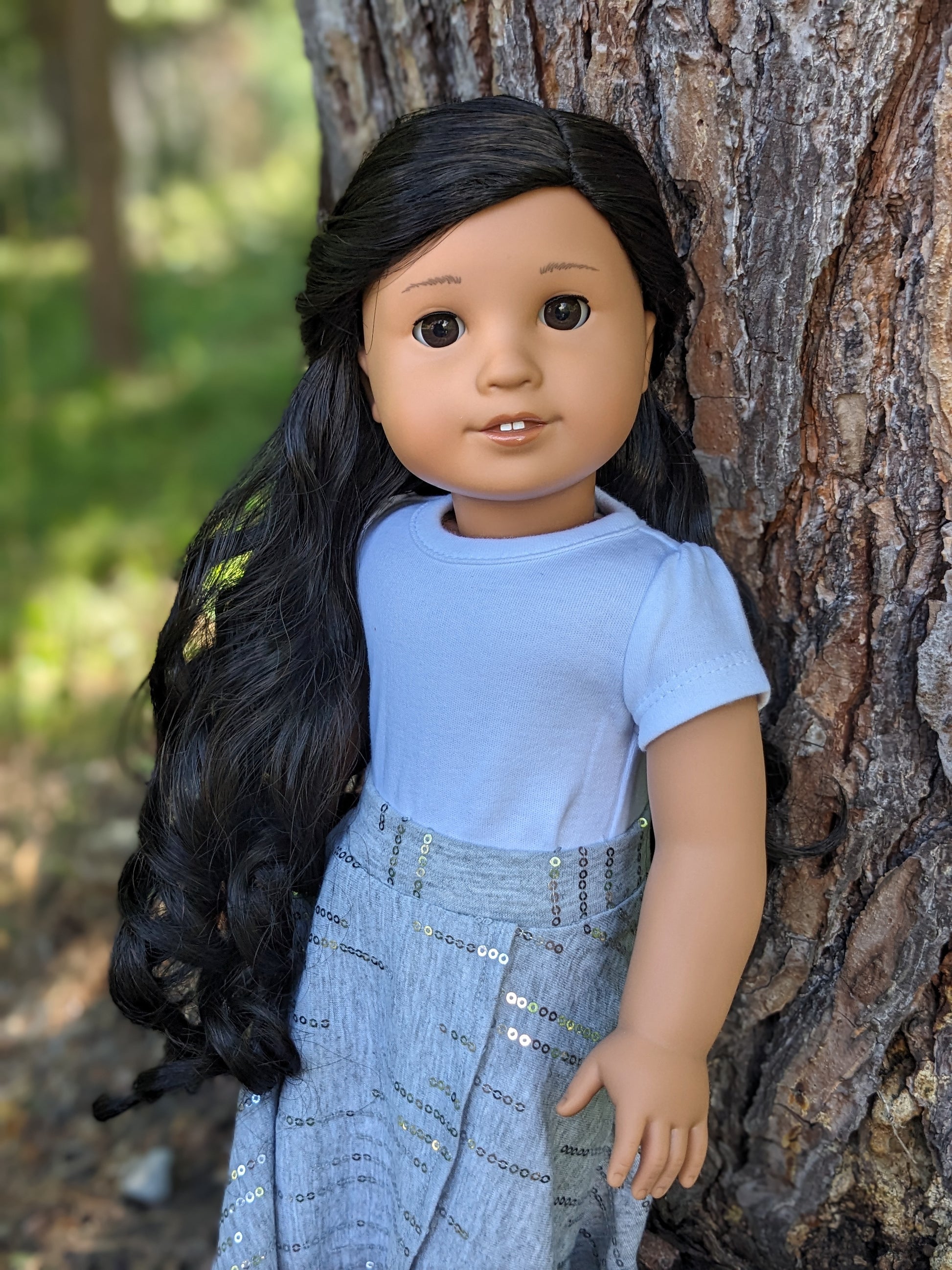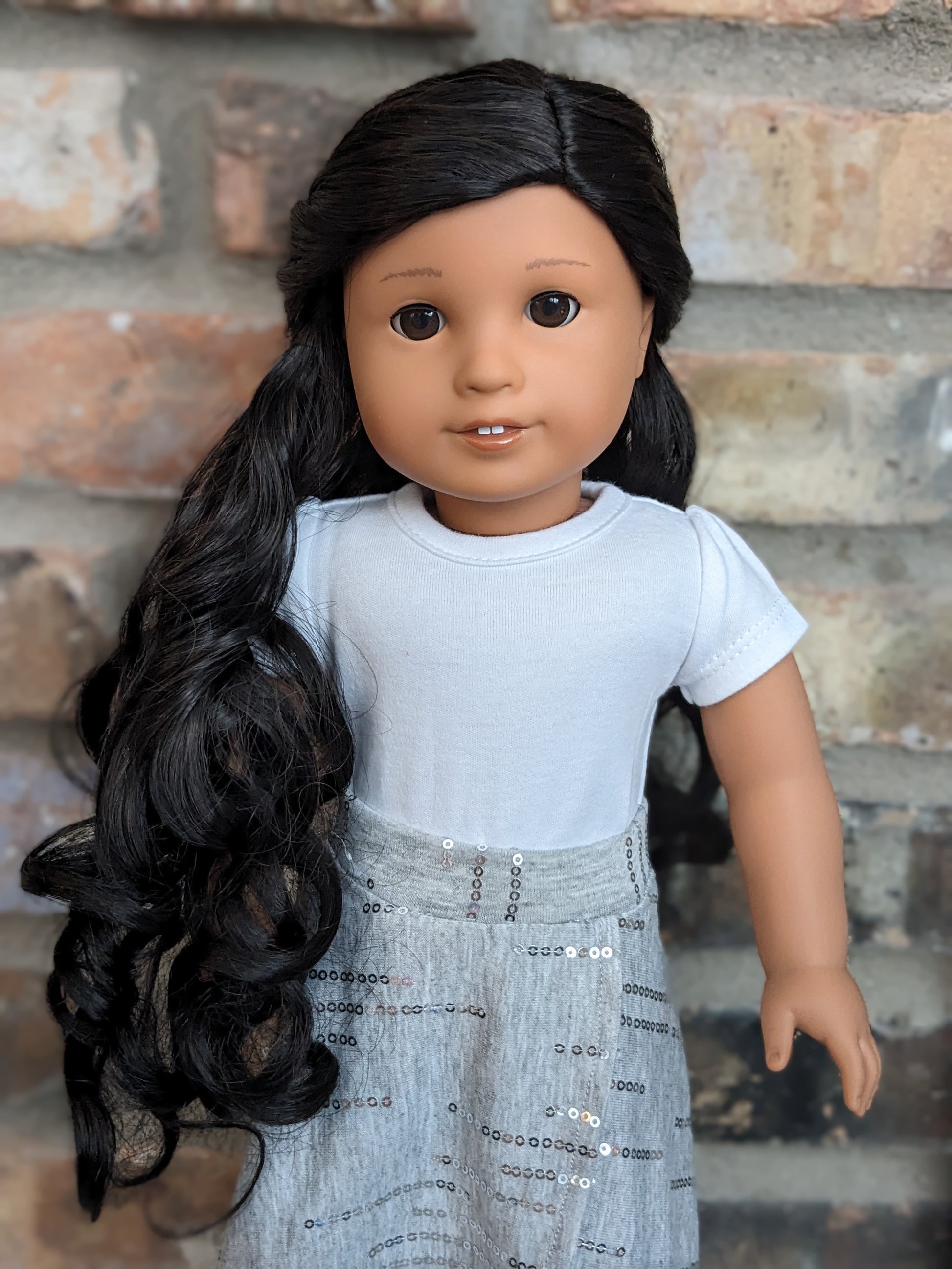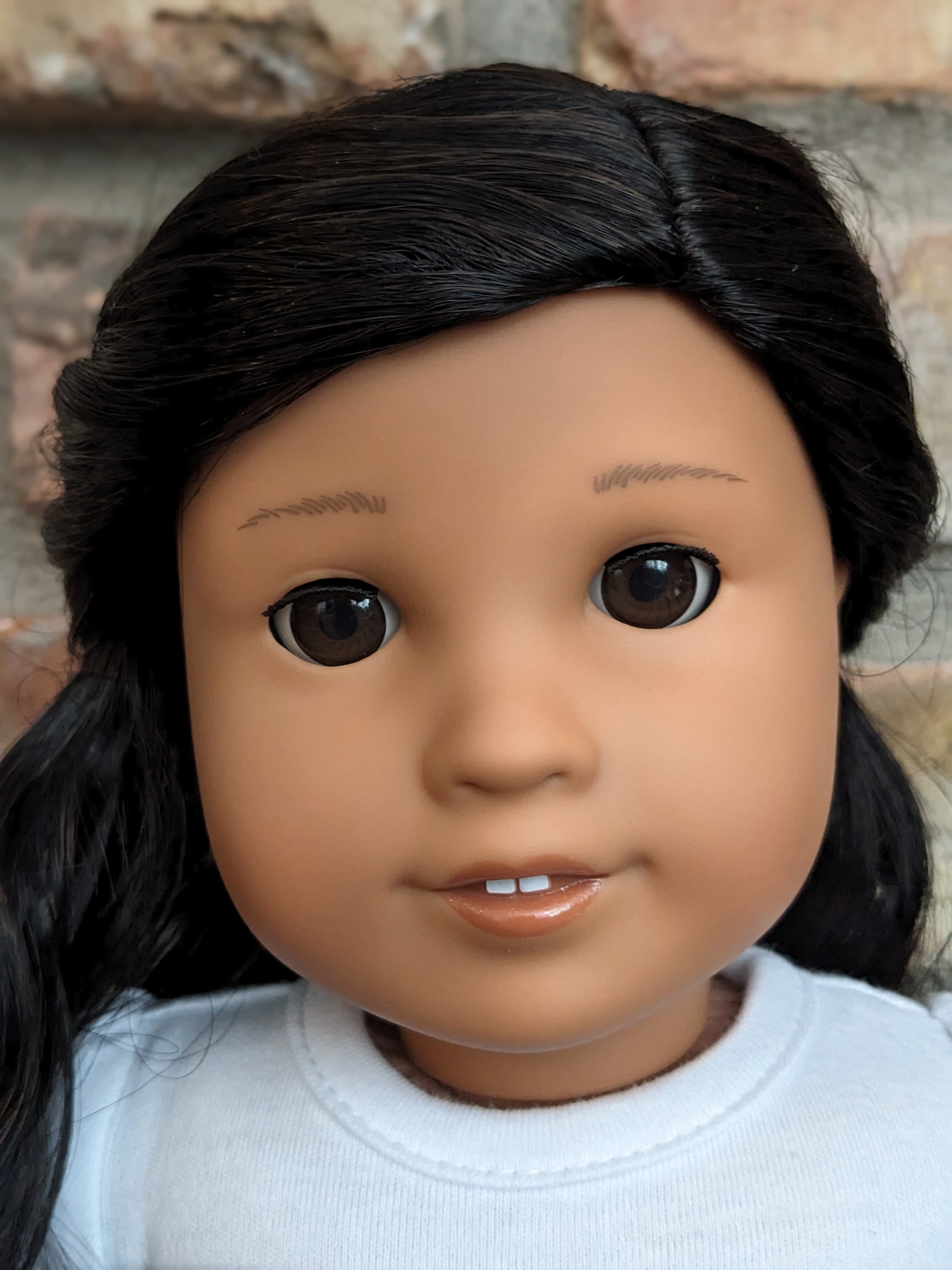 This one of a kind OOAK custom American Girl doll was created with a new doll, a brown wig, and brown eyes. She has lip gloss that was hand painted and sealed. She may have some minor shine marks from handling. She comes with the outfit pictured. She has the microfiber cloth body.