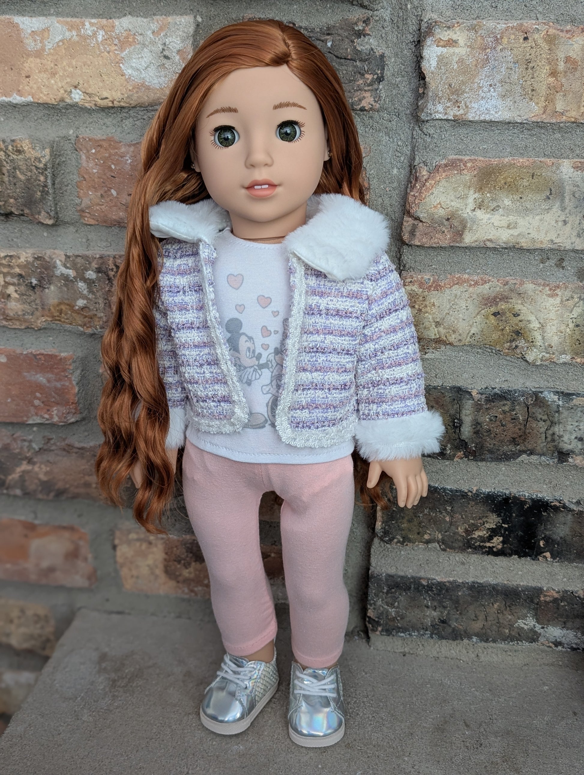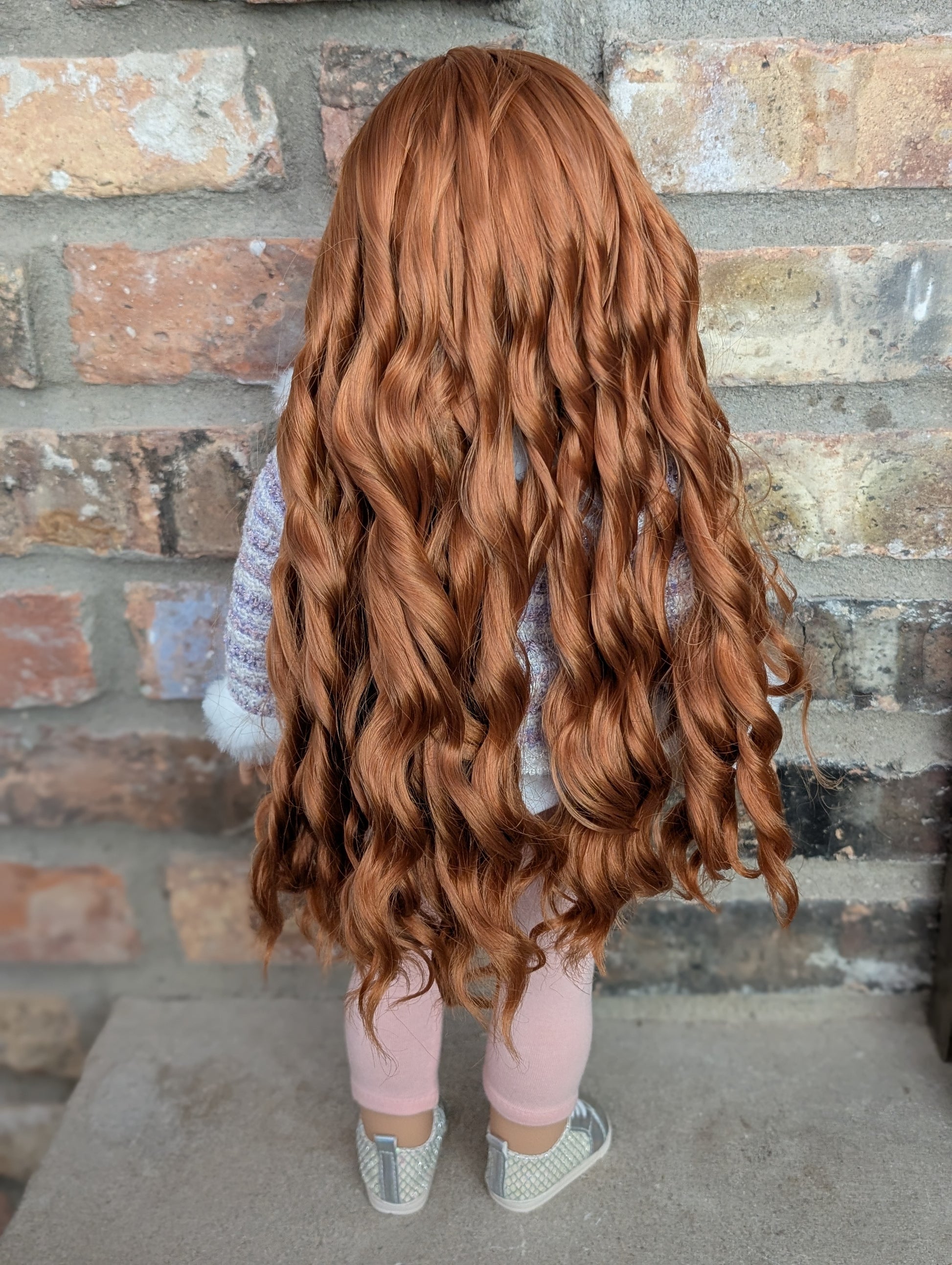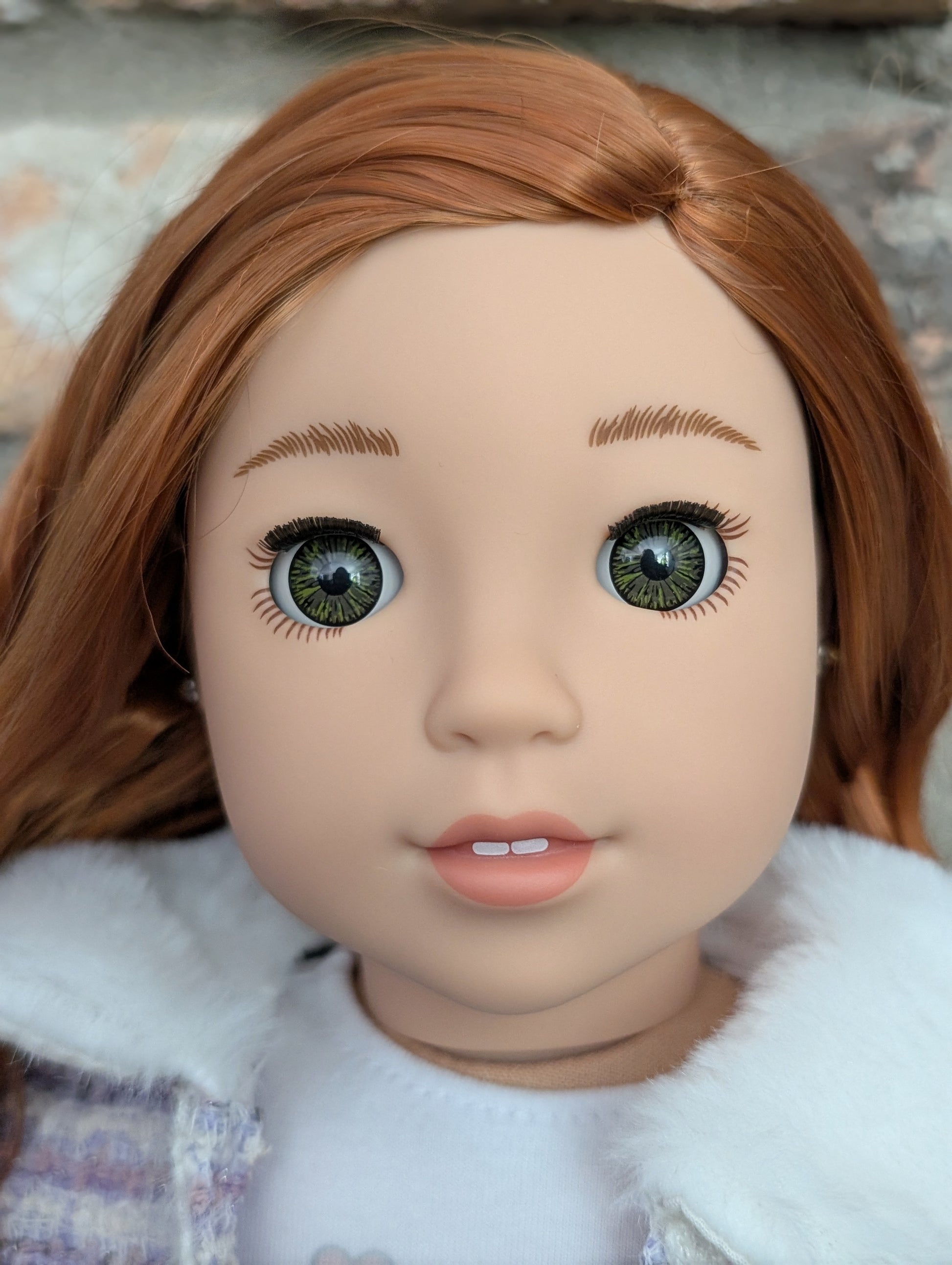 This one of a kind OOAK custom American Girl doll was created with a brand new doll, a red wig, and hazel eyes. She may have some minor shine marks from handling. She comes with the outfit pictured. Her ears are pierced with American Girl doll sized earrings.