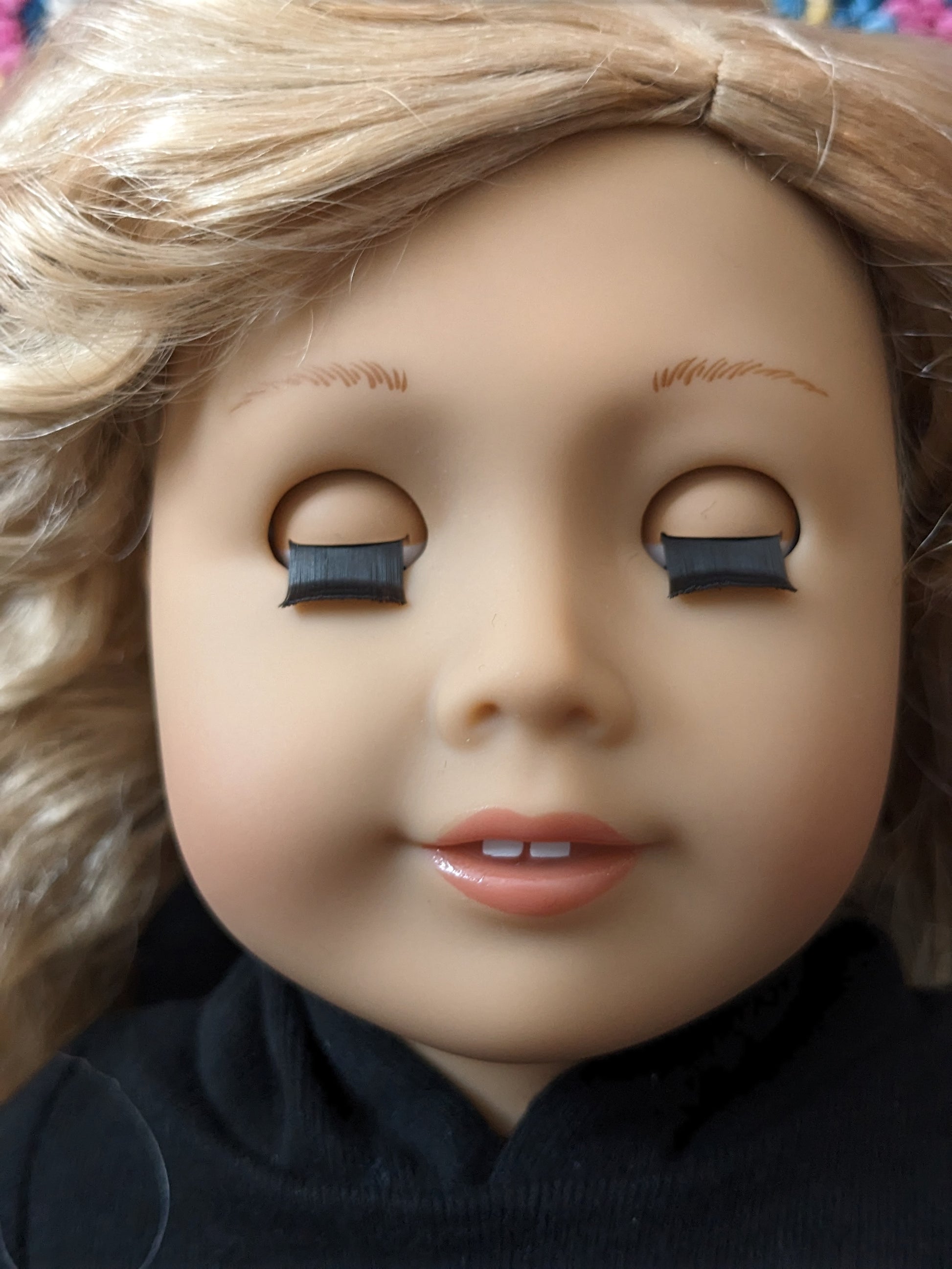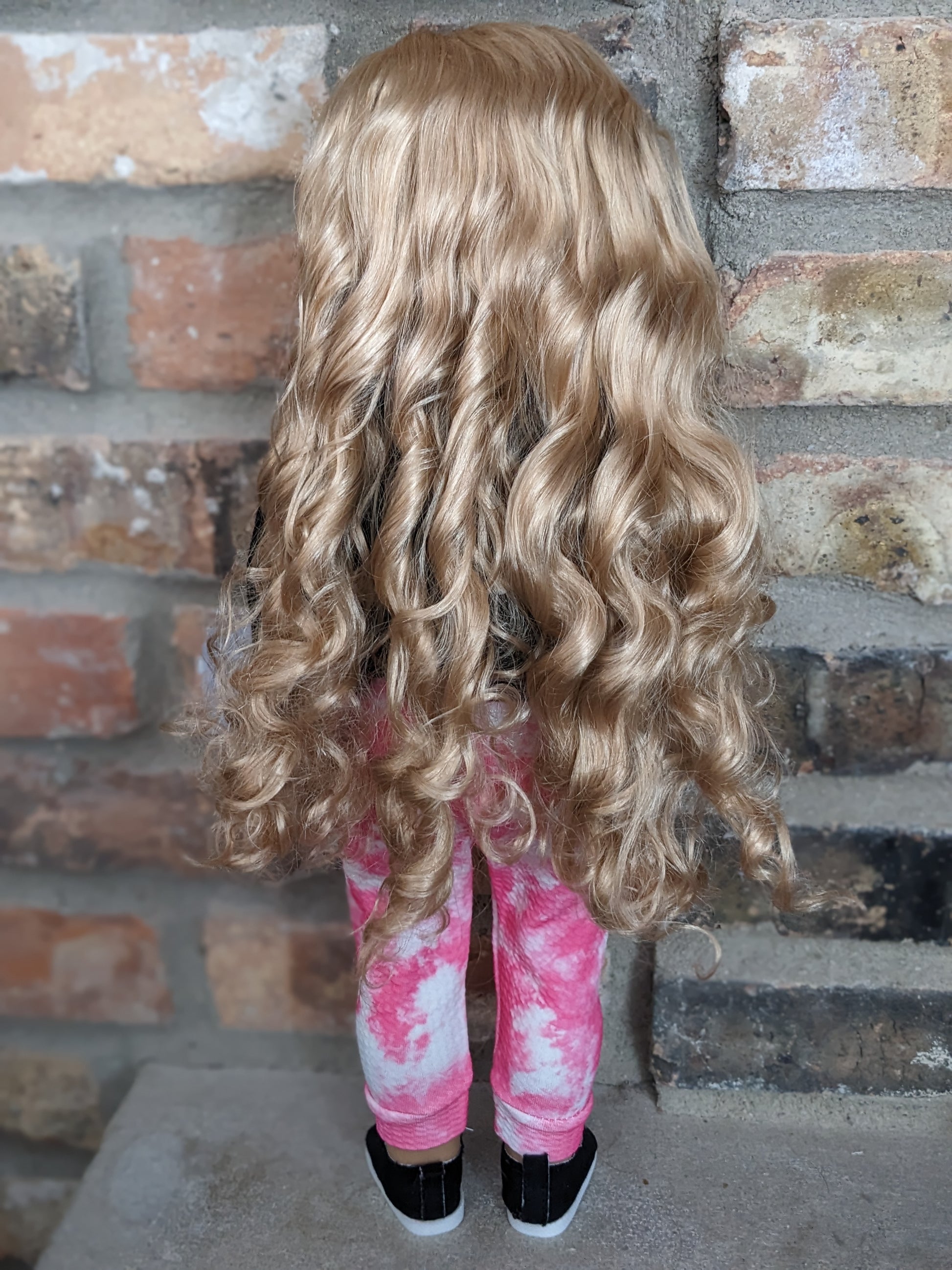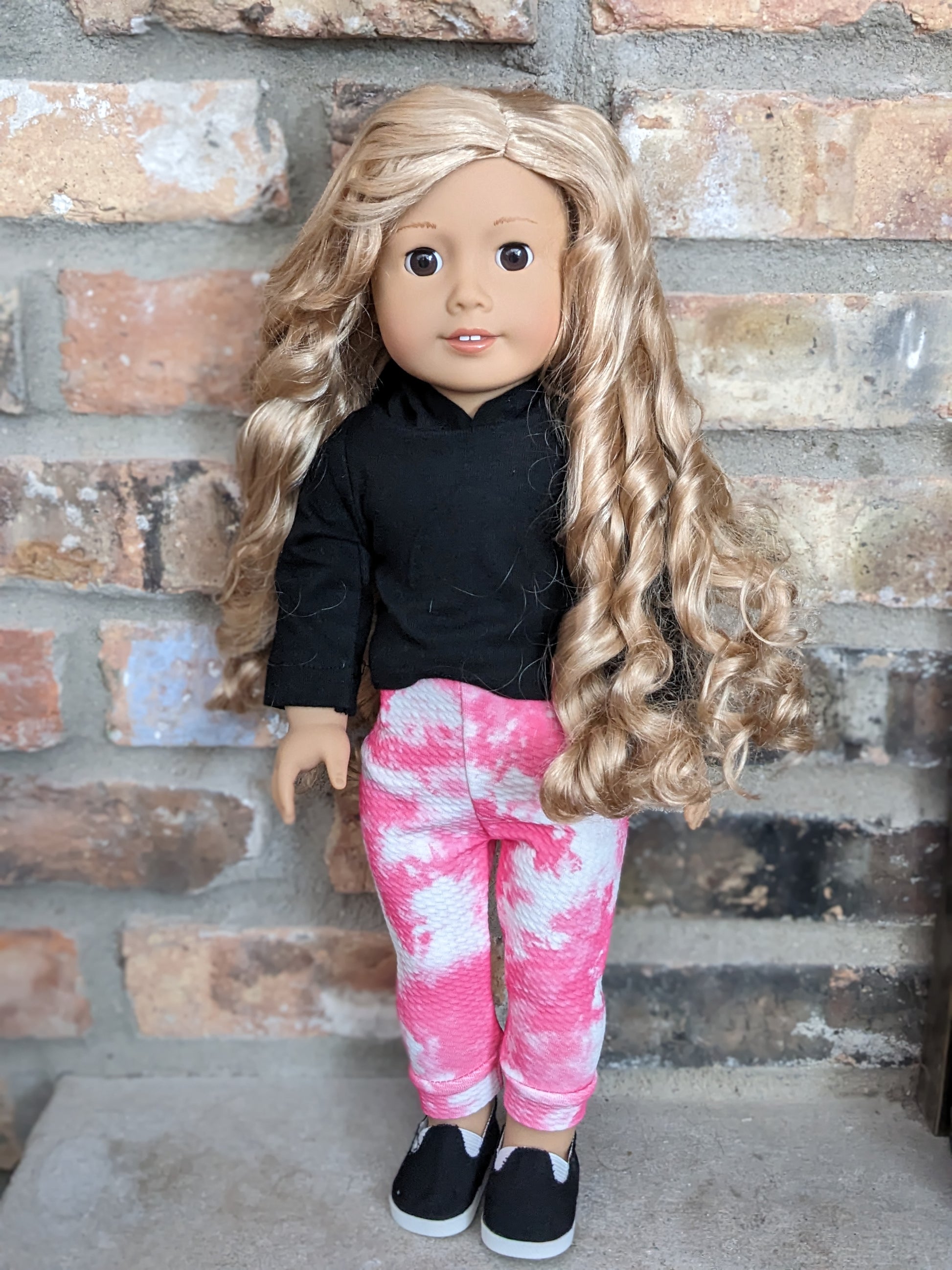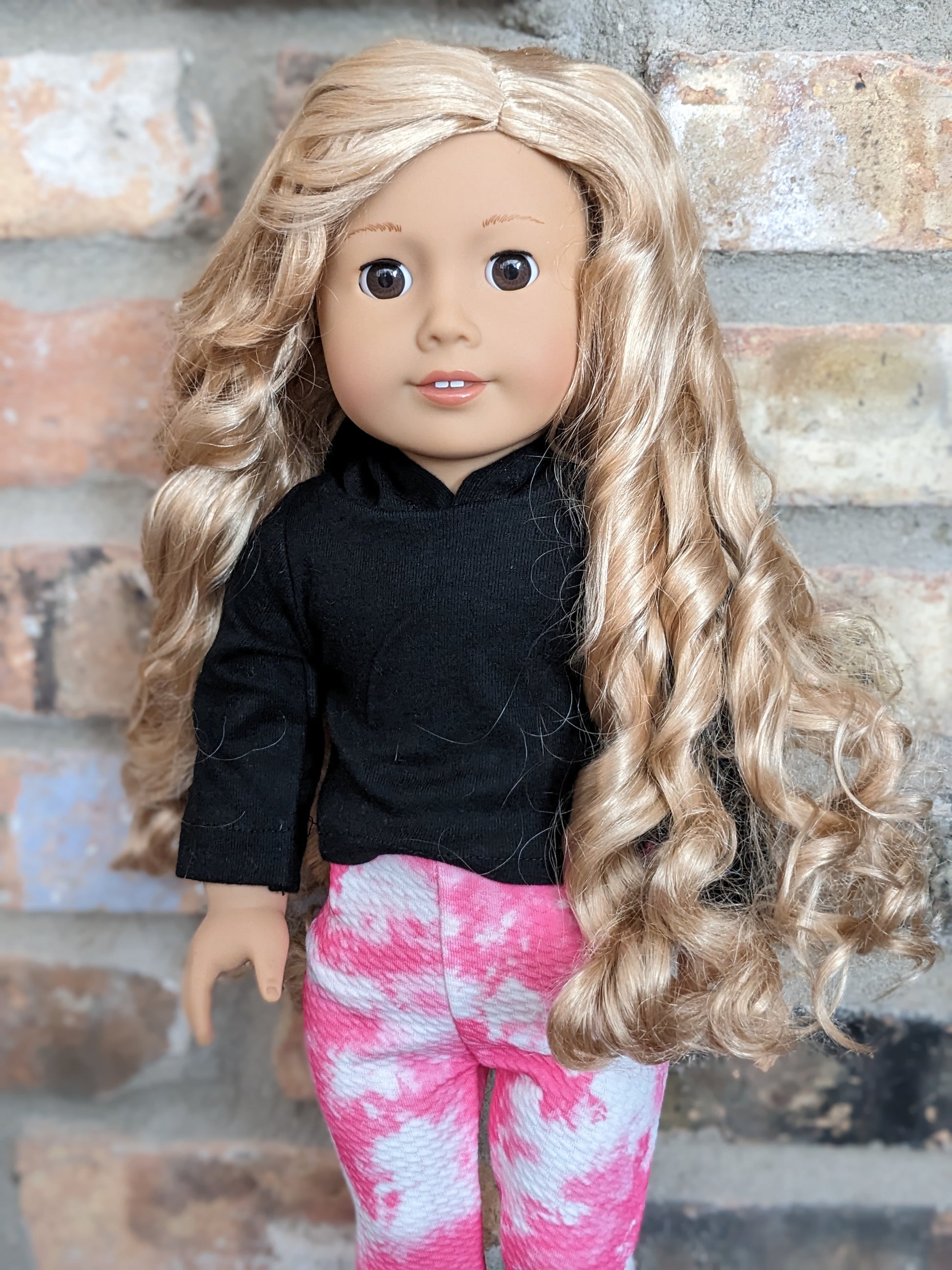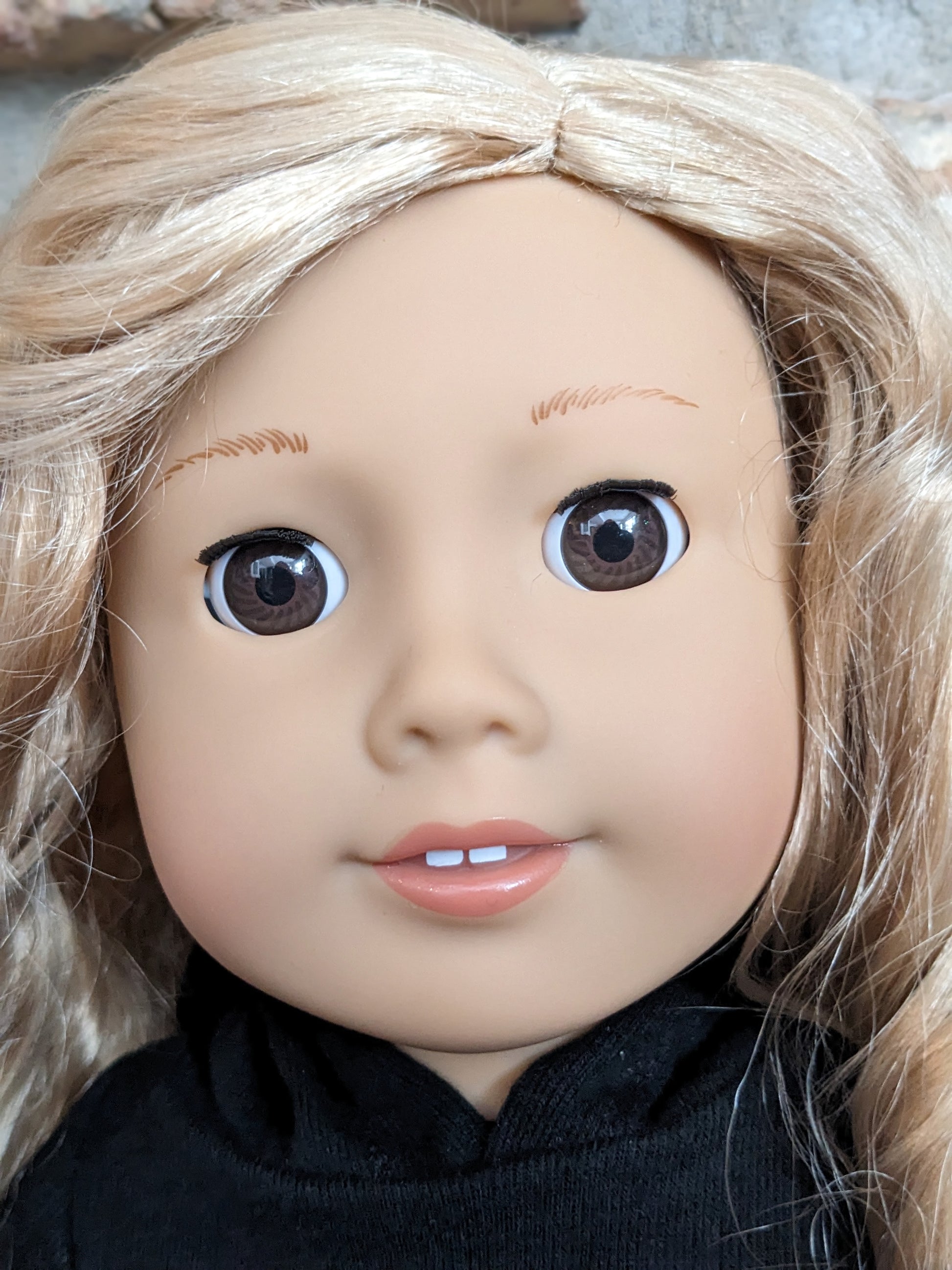This one of a kind OOAK custom American Girl doll was created with a brand new doll, a blonde vegan mohair wig, and brown eyes. She has lip gloss that was hand painted and sealed. She may have some minor shine marks from handling. She comes with the outfit pictured. She has the two part eyes with the white posts used by American Girl from 2017-2019.