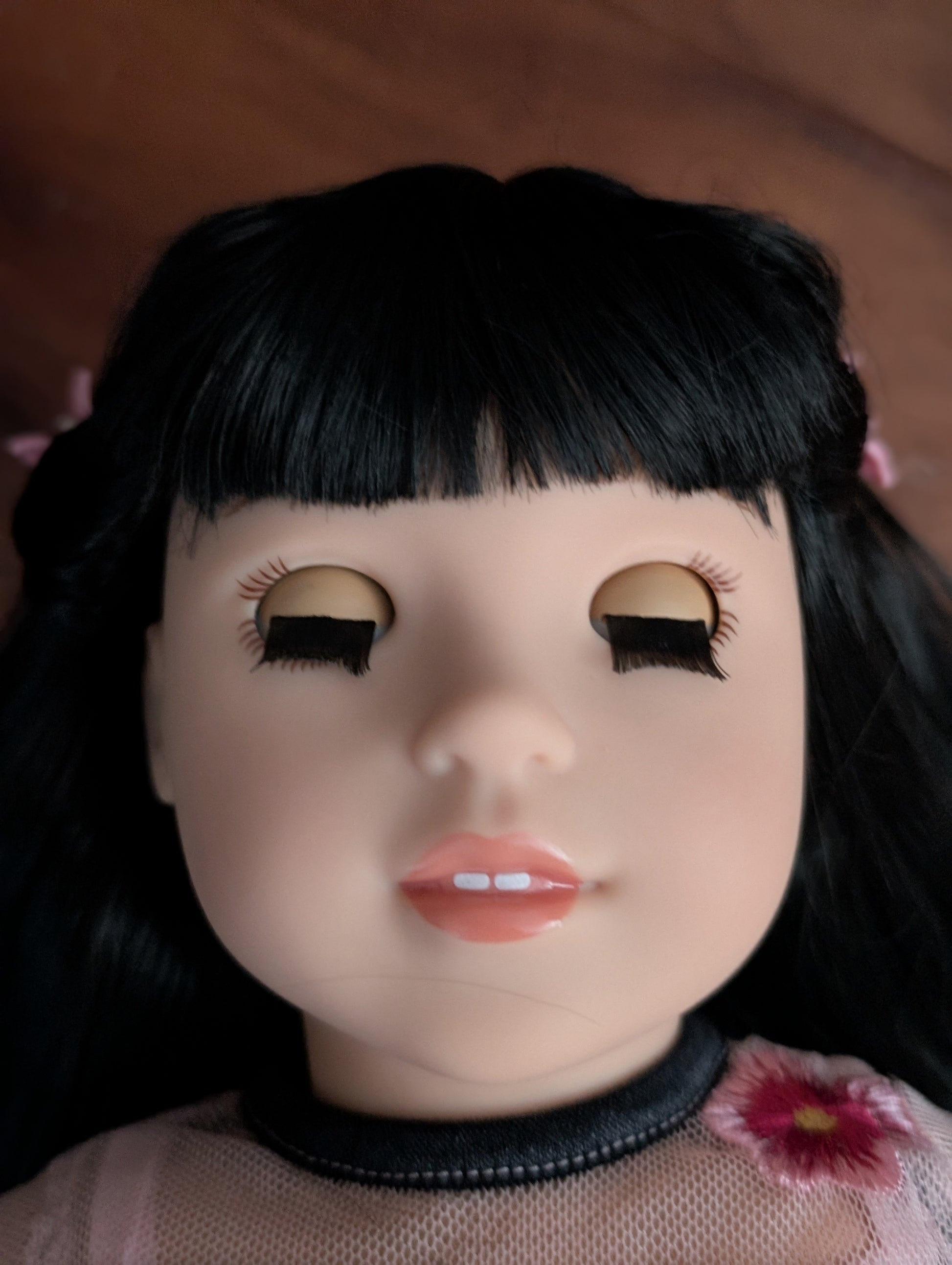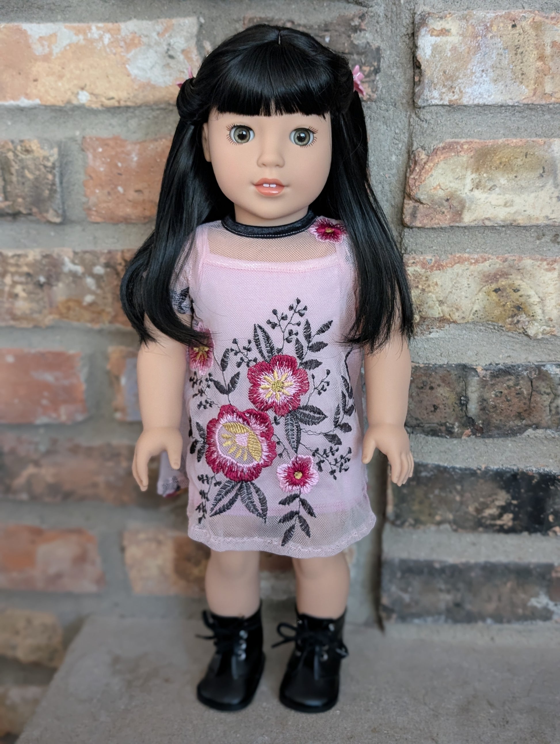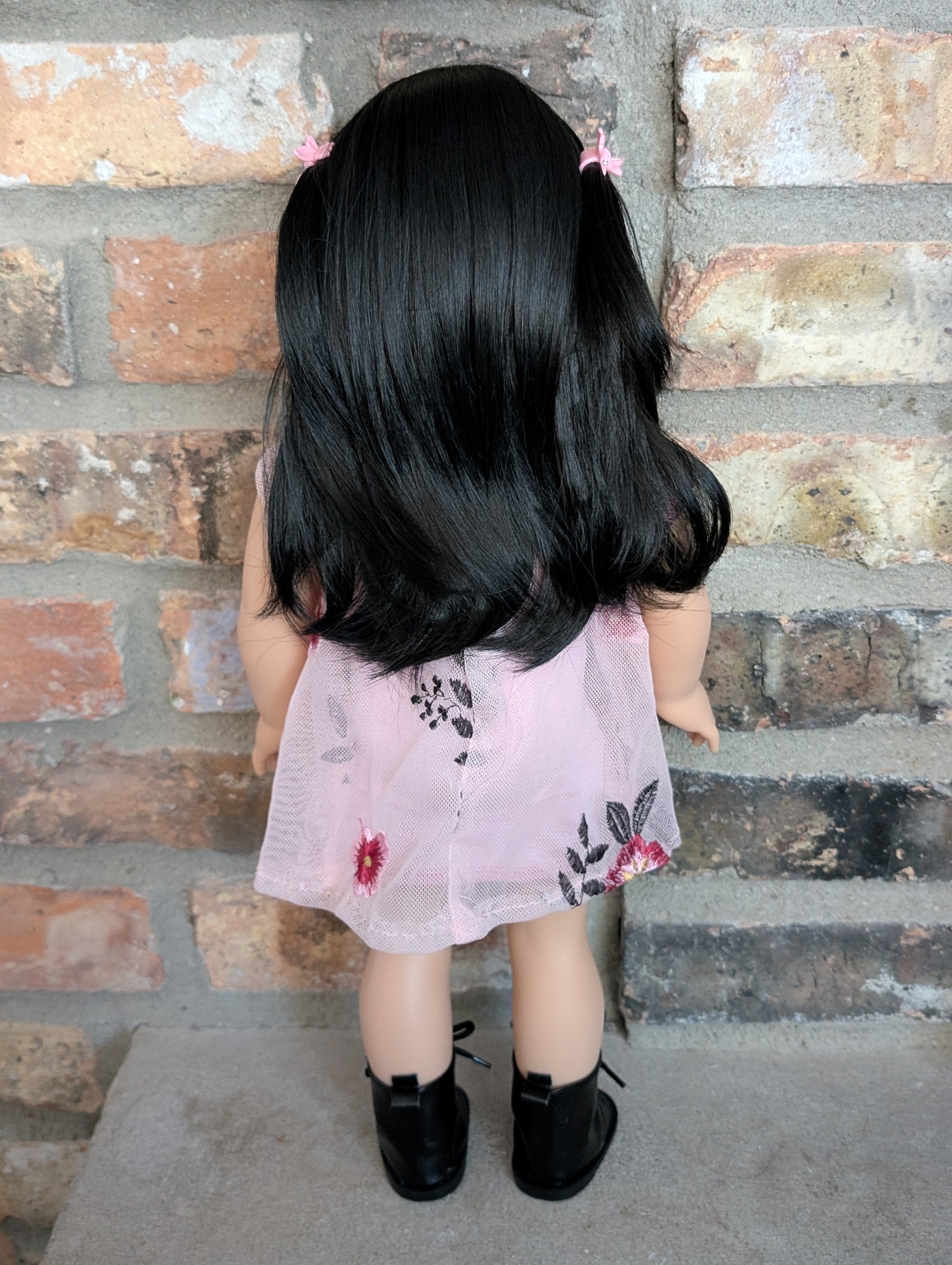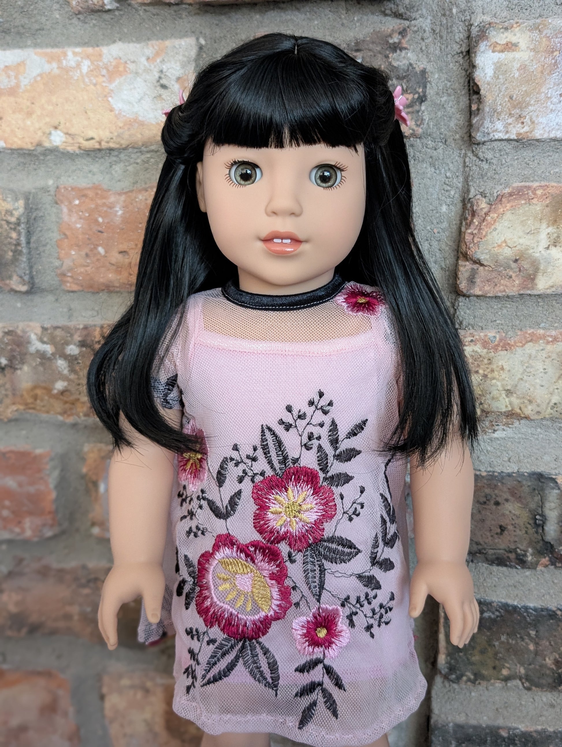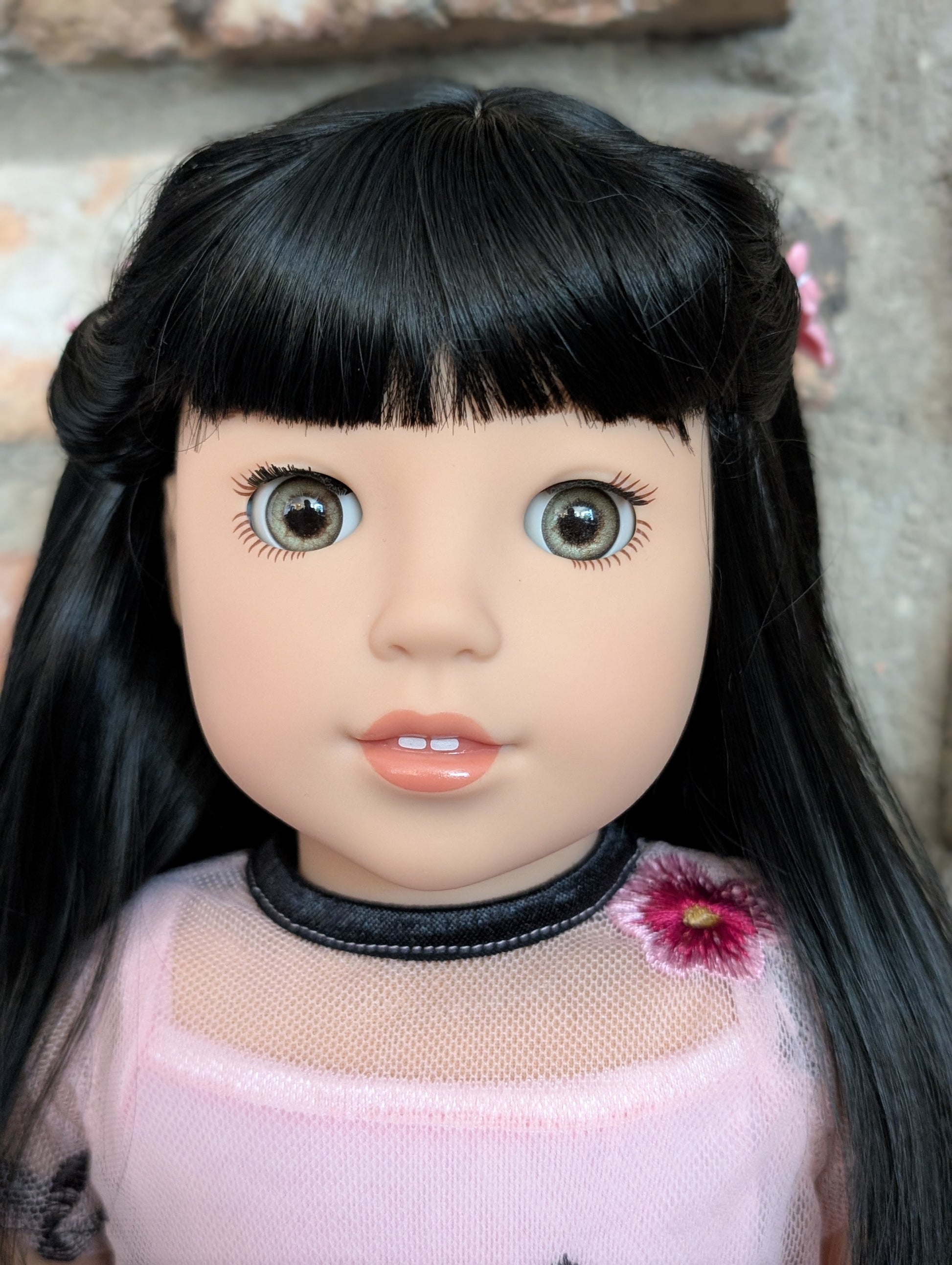 This one of a kind OOAK custom American Girl doll was created with a brand new doll, a black wig, and grey premium glass eyes from Etsy. She has lip gloss that was hand painted and sealed. She may have some minor shine marks from handling. She comes with the outfit pictured.