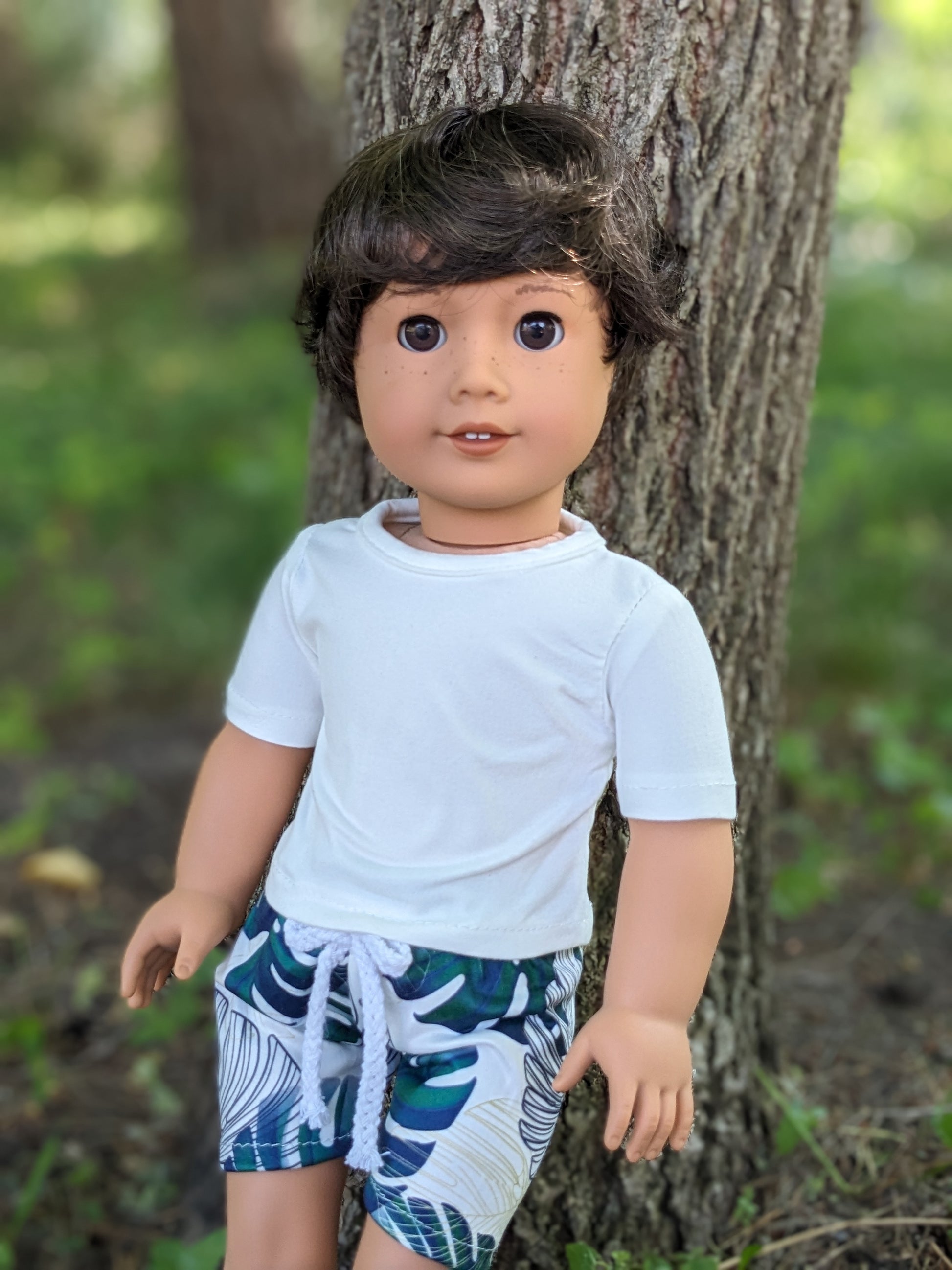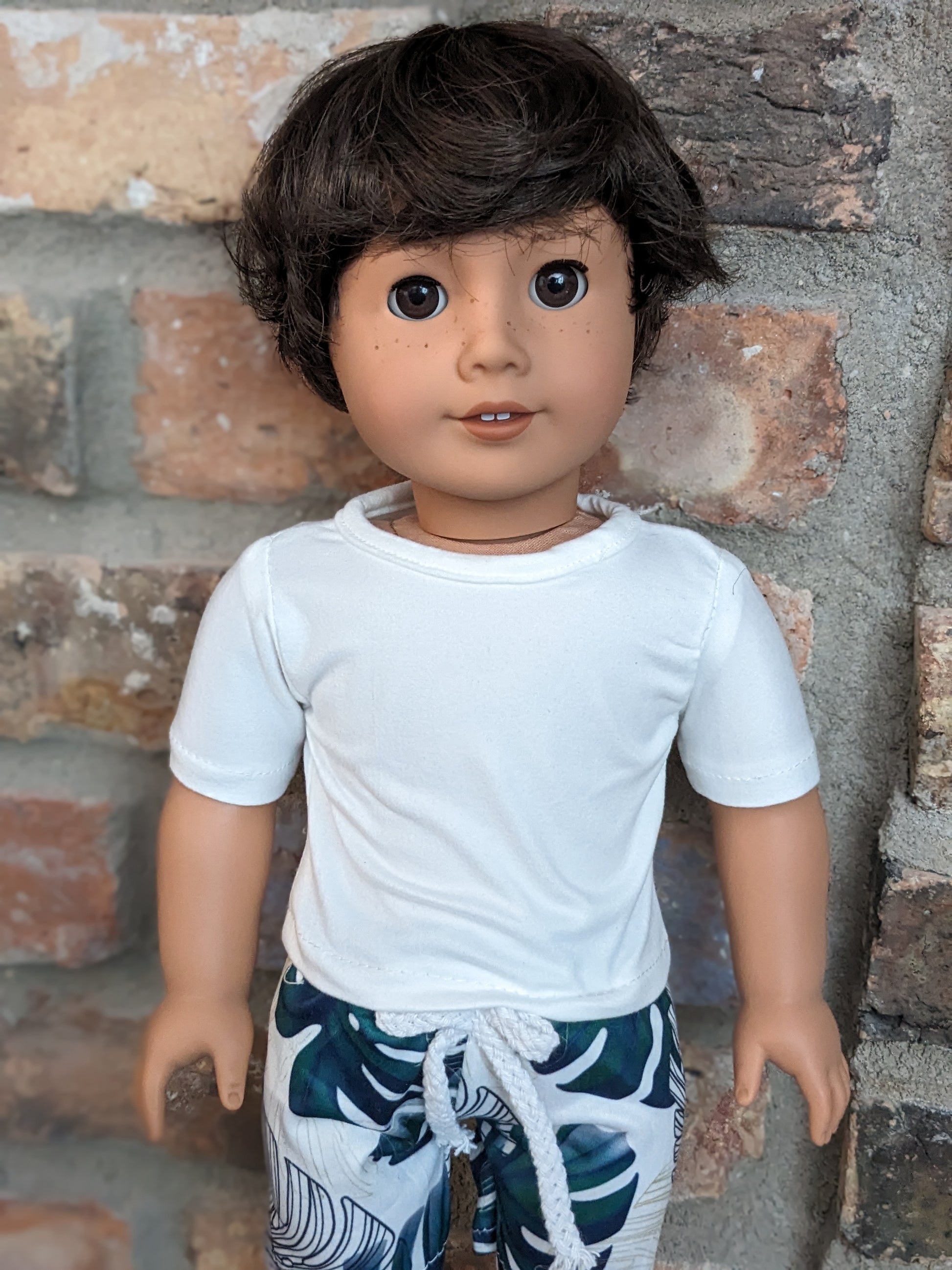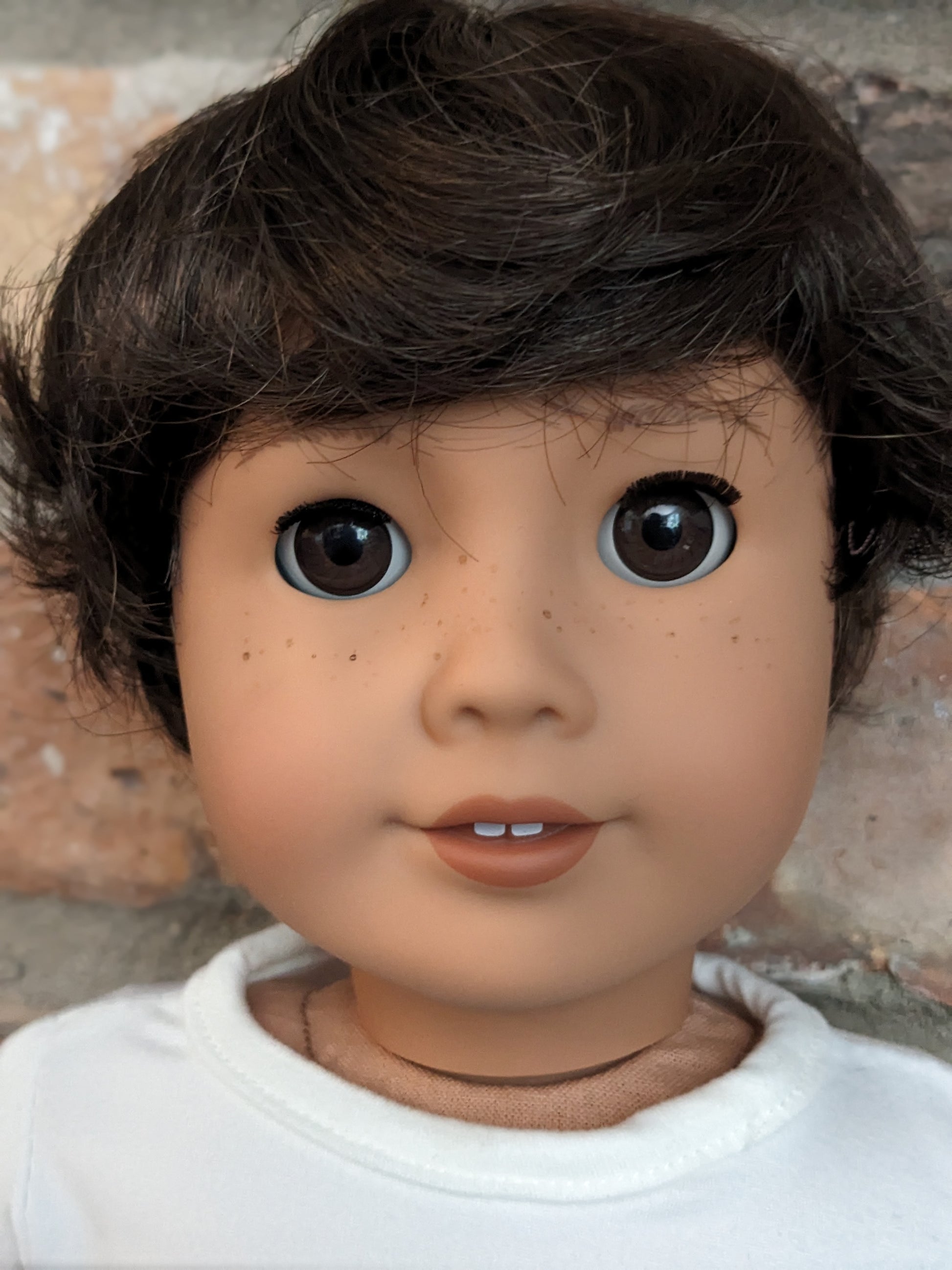 This one of a kind OOAK custom American Girl doll was created with a new doll, a brown wig, and brown eyes. He may have some minor shine marks from handling. He comes with the outfit pictured. He has hand painted freckles.