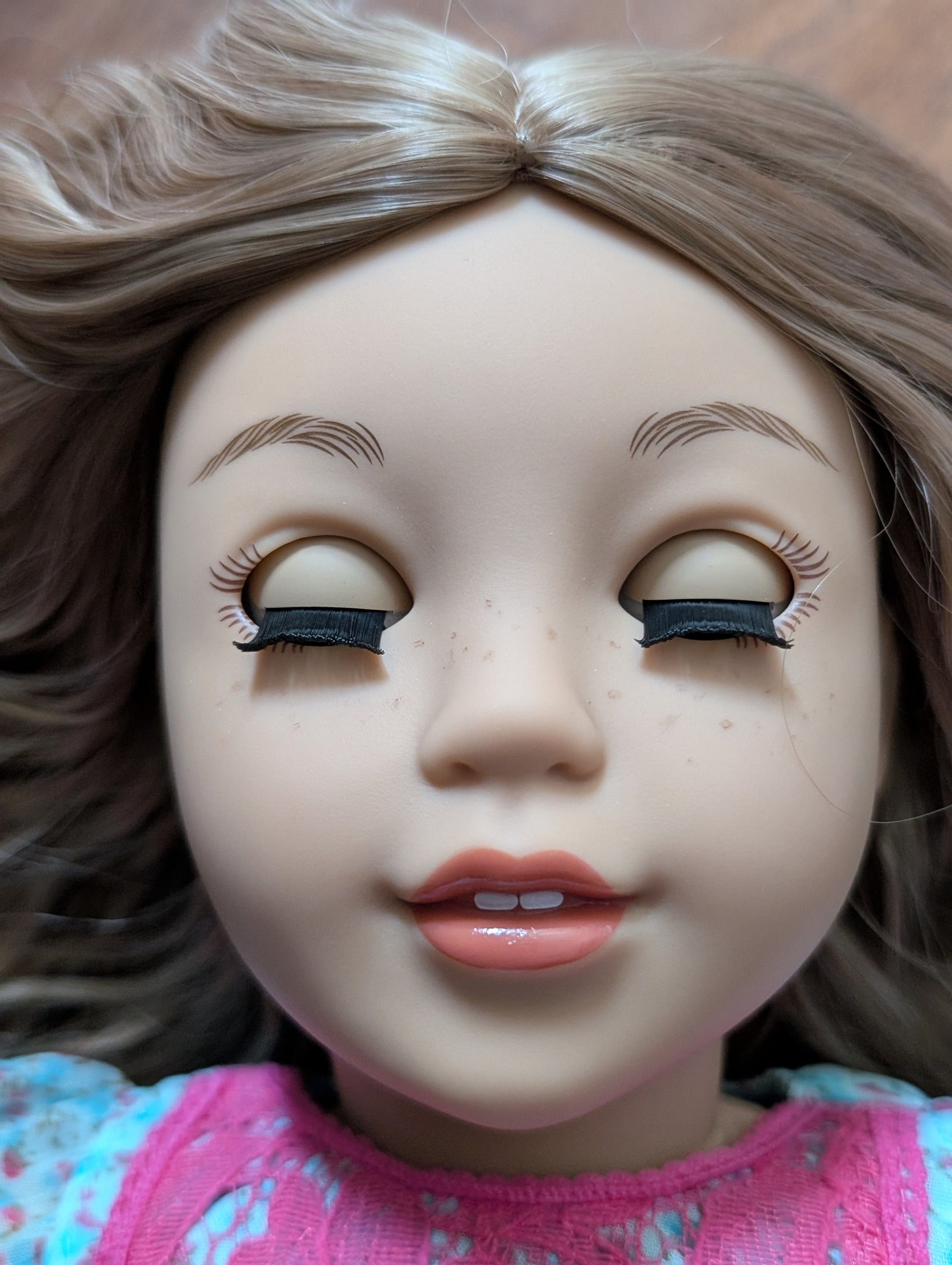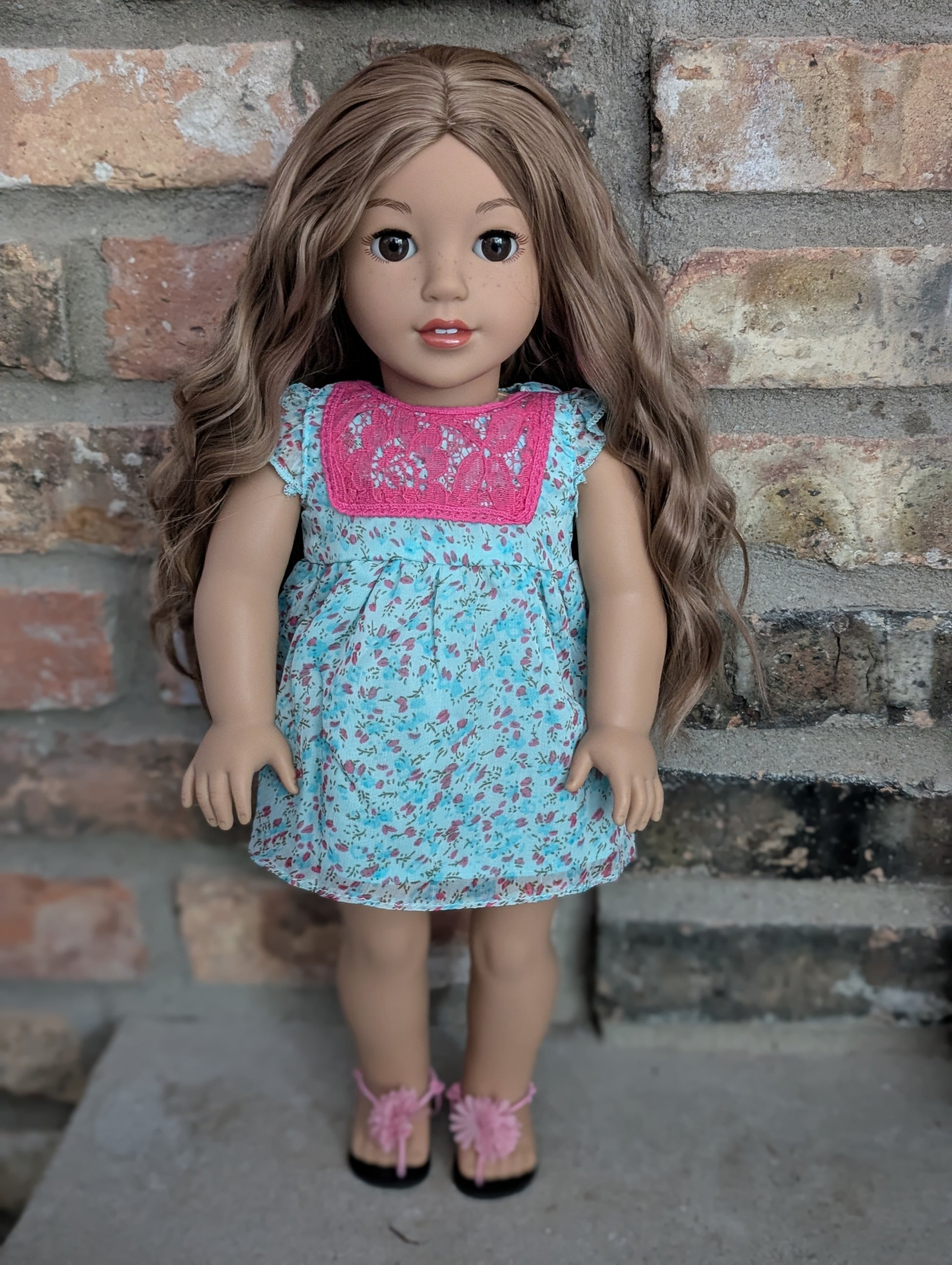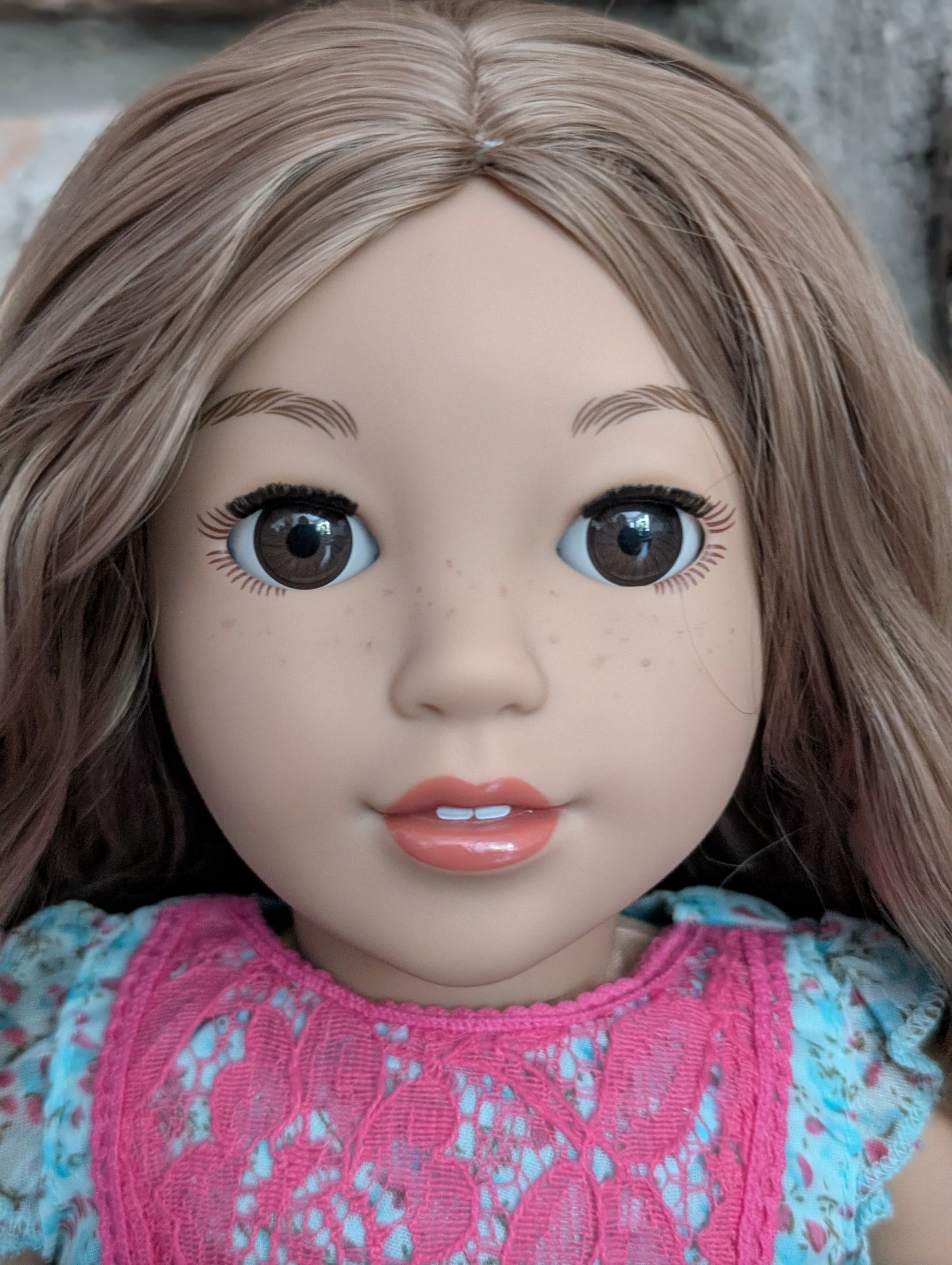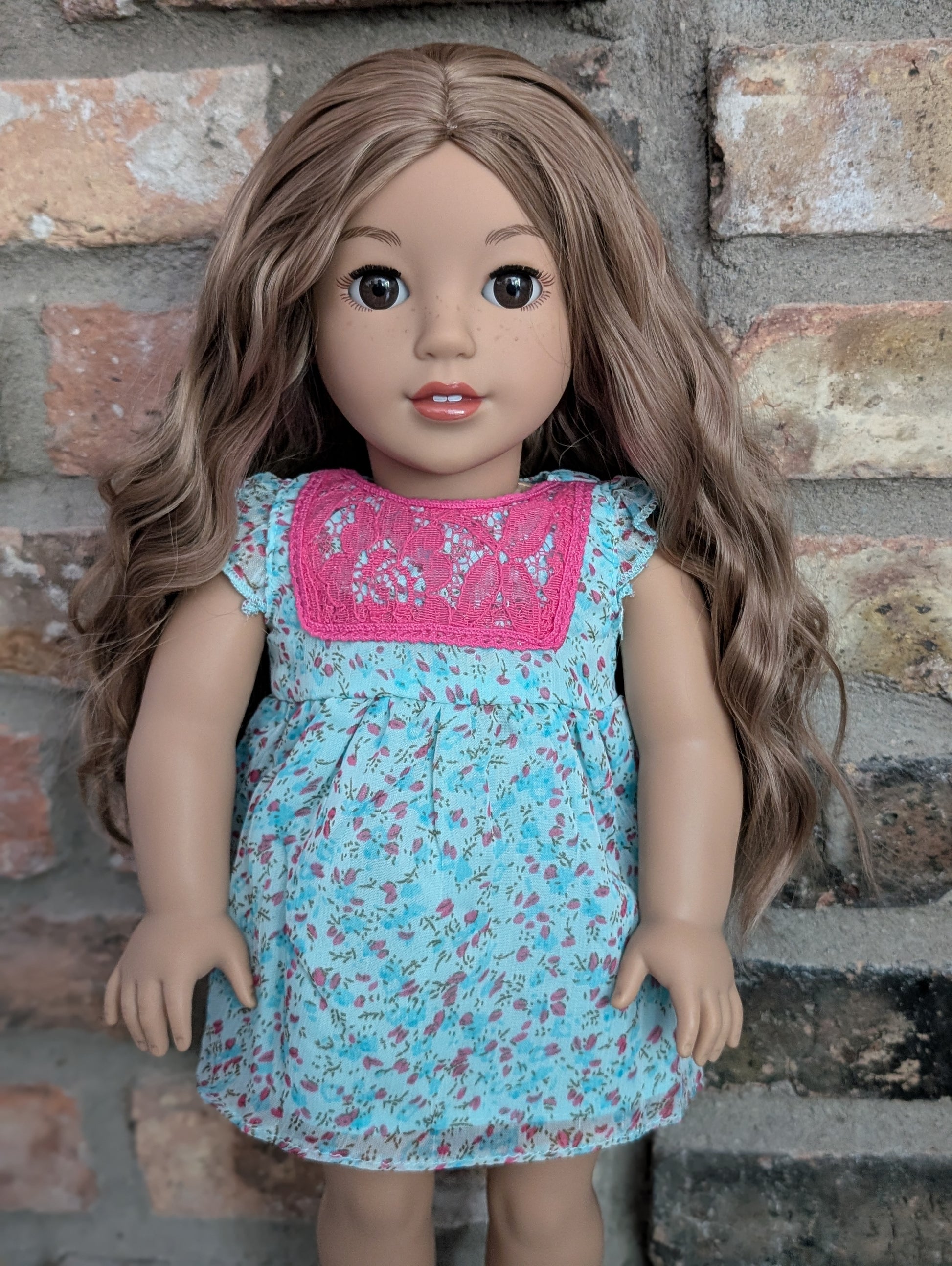 This one of a kind OOAK custom American Girl doll was created with a brand new doll, a brown wig, and brown eyes. She has lip gloss and freckles that were hand painted and sealed. She may have some minor shine marks from handling. She comes with the outfit pictured.