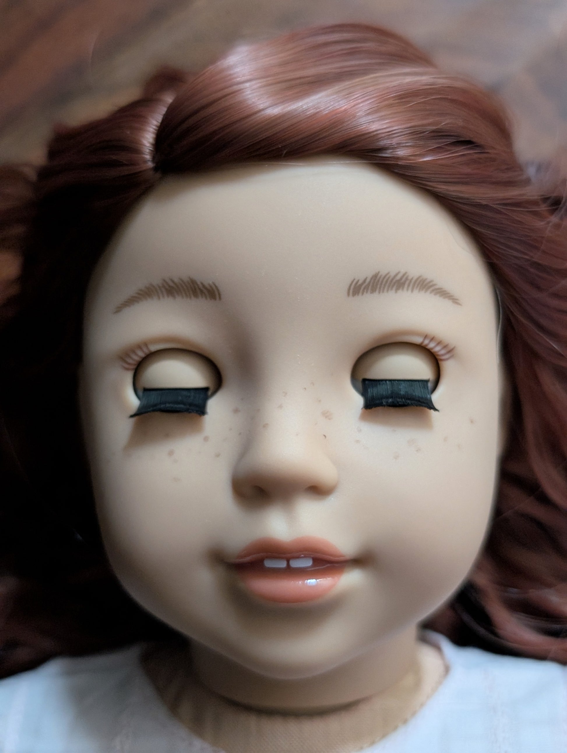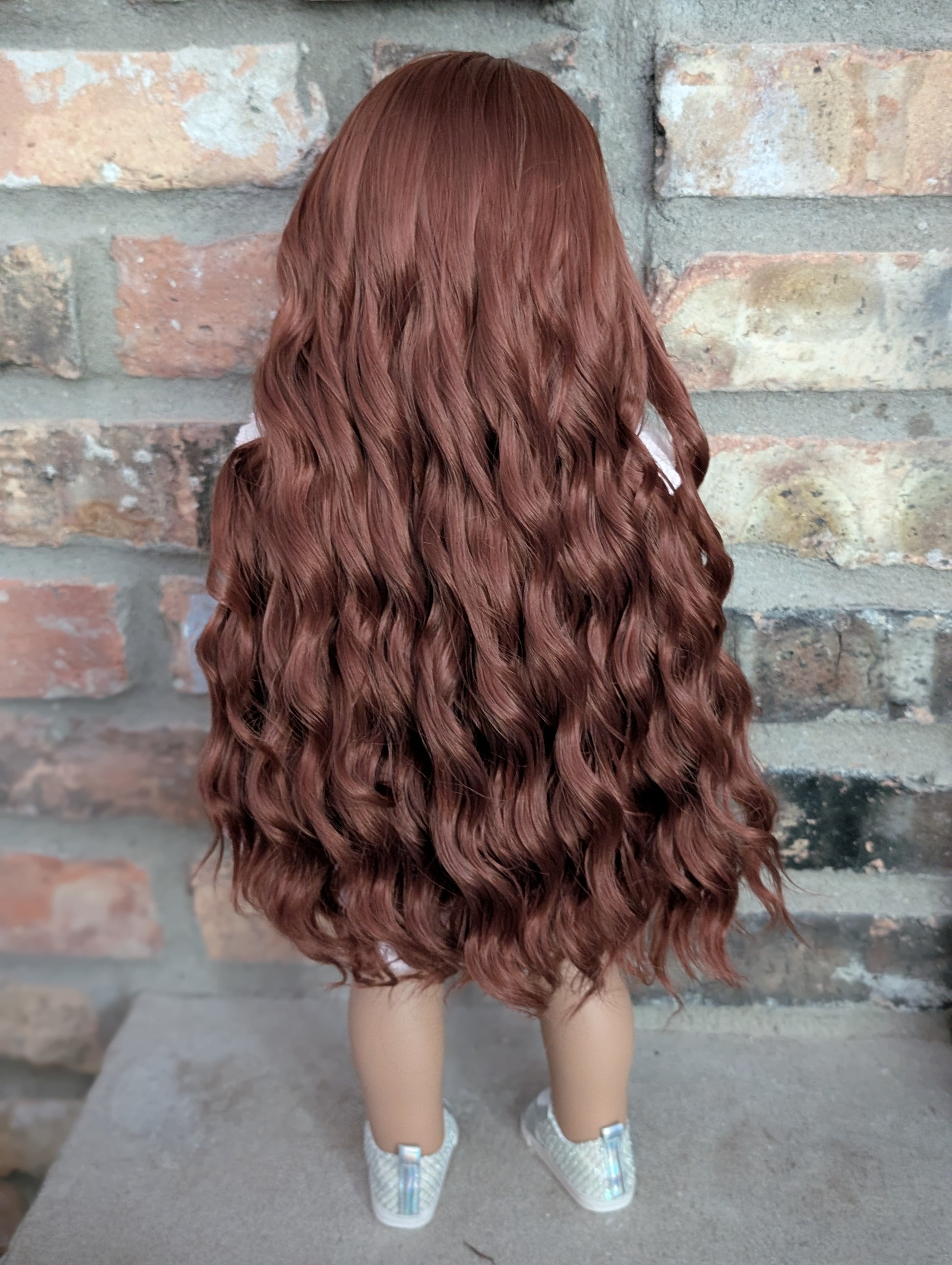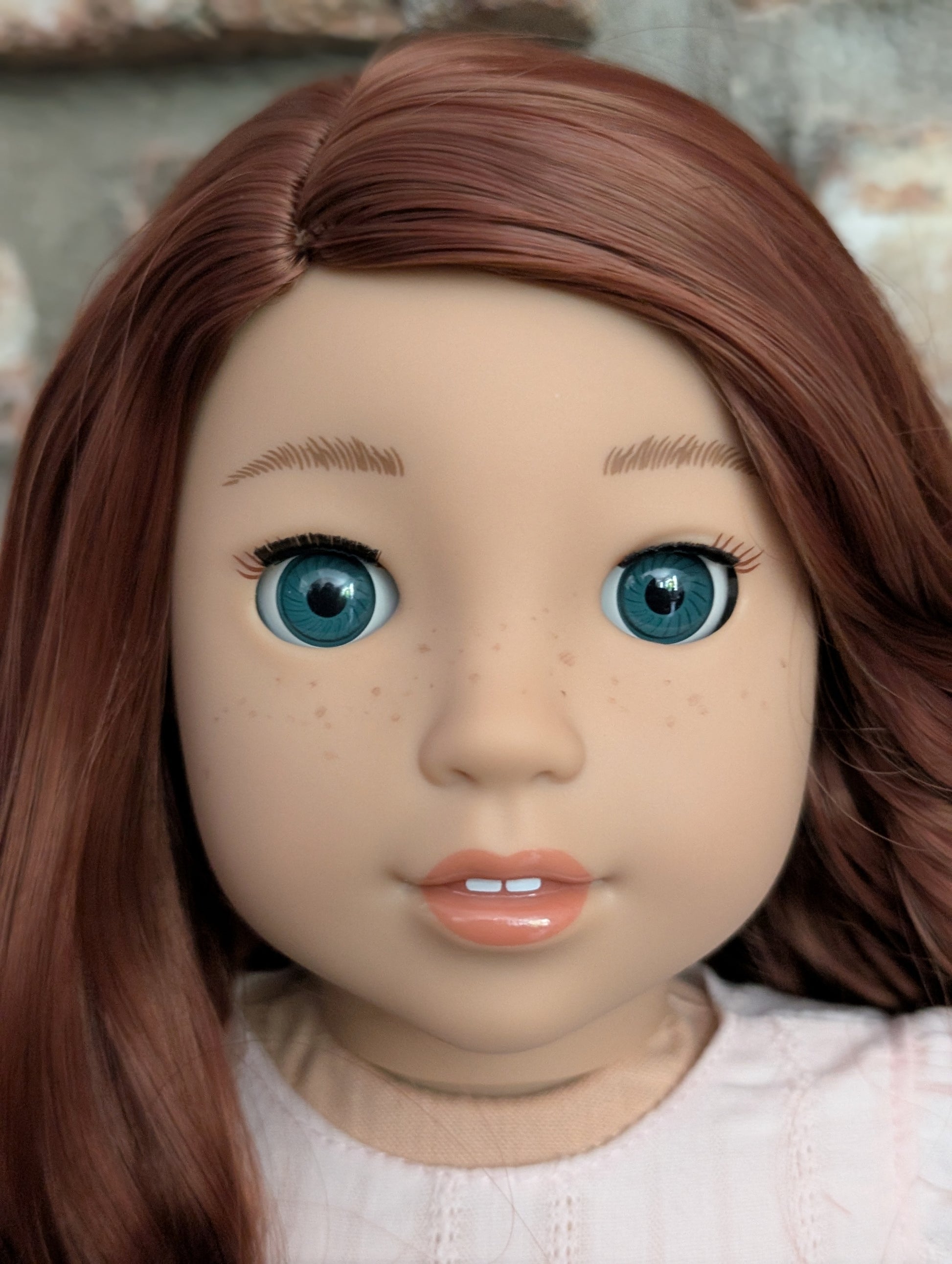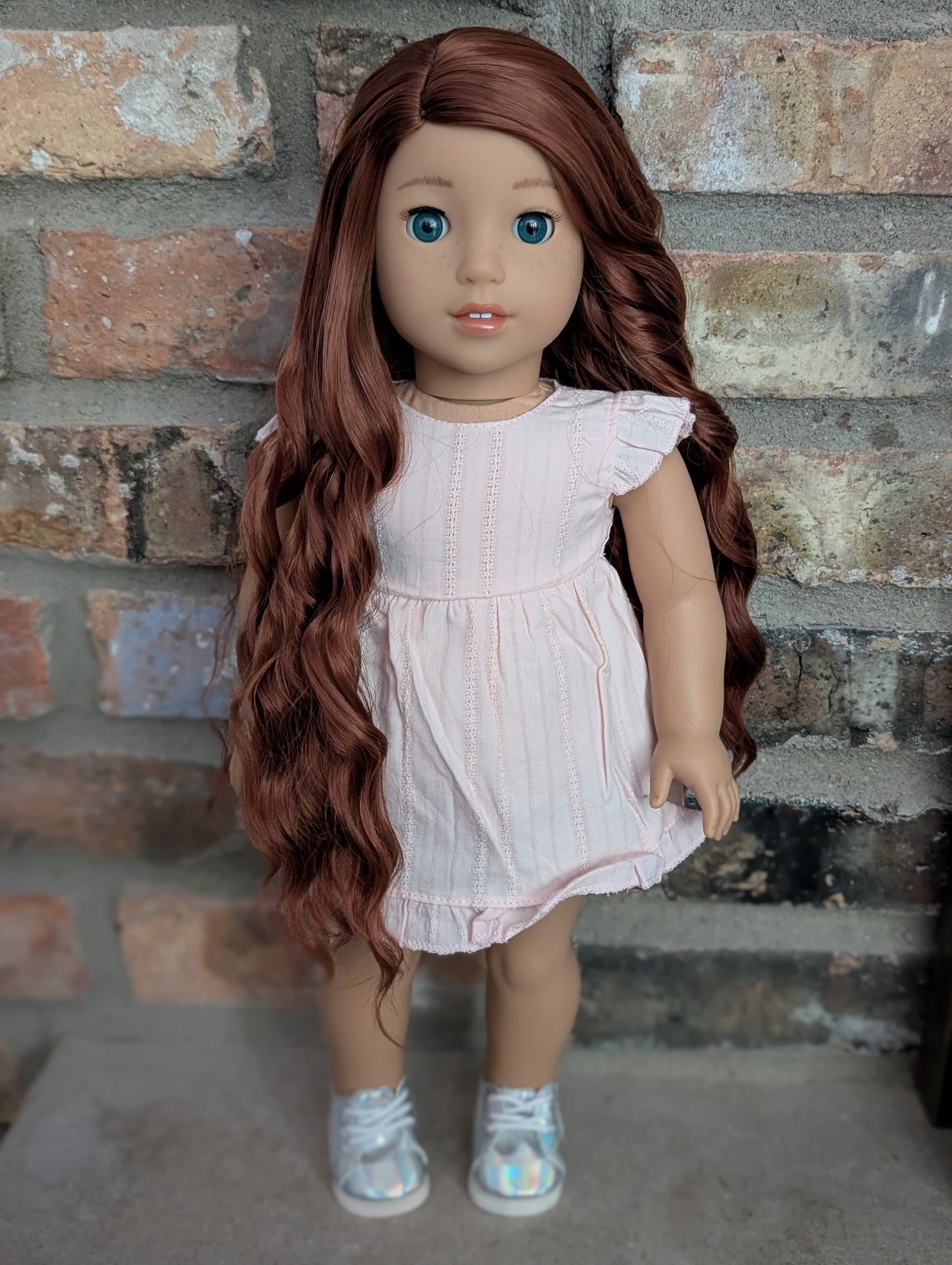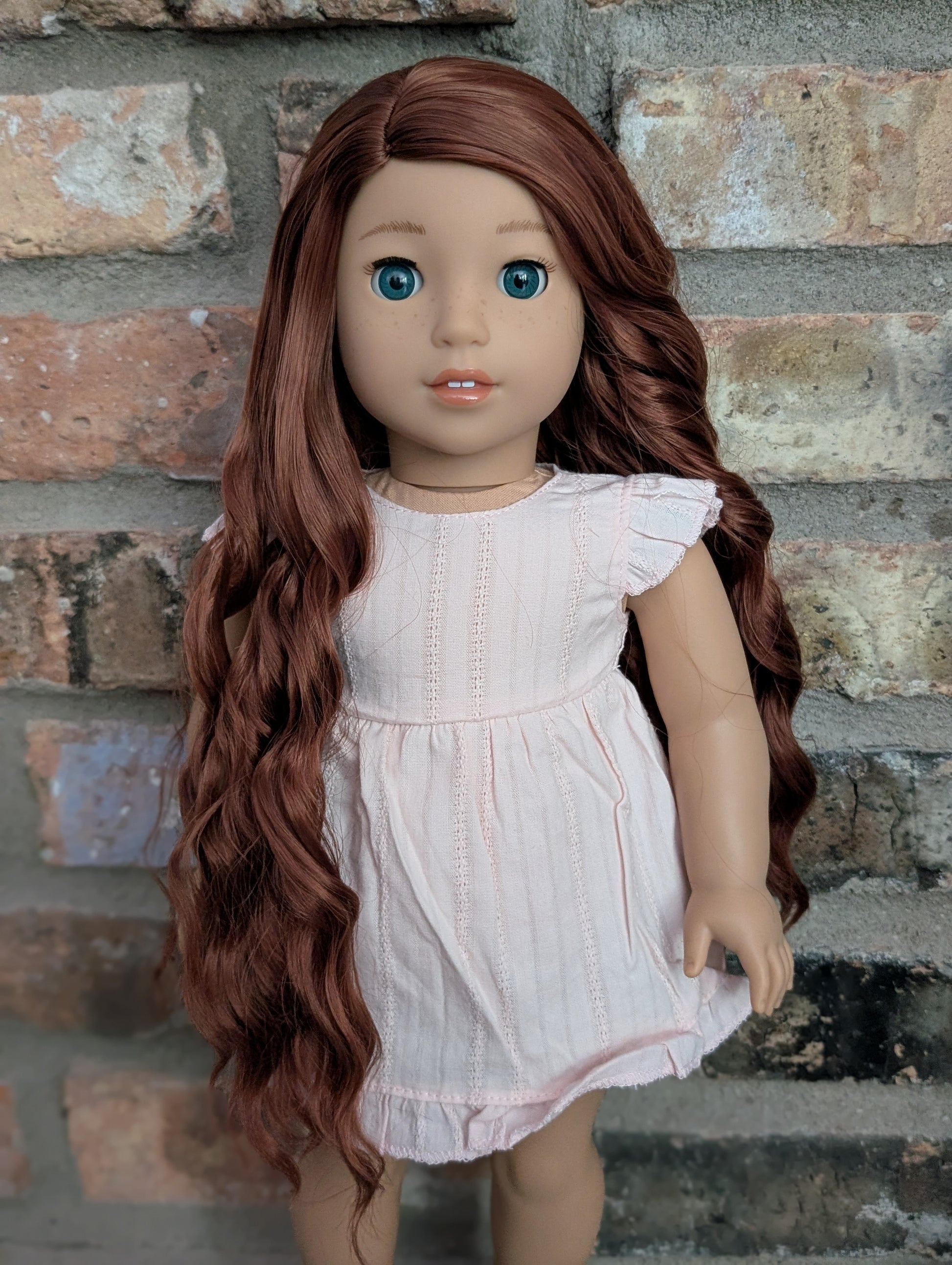 This one of a kind OOAK custom American Girl doll was created with a brand new doll, an auburn wig, and blue eyes. She has lip gloss and freckles that were hand painted and sealed. She may have some minor shine marks from handling. She comes with the outfit pictured.