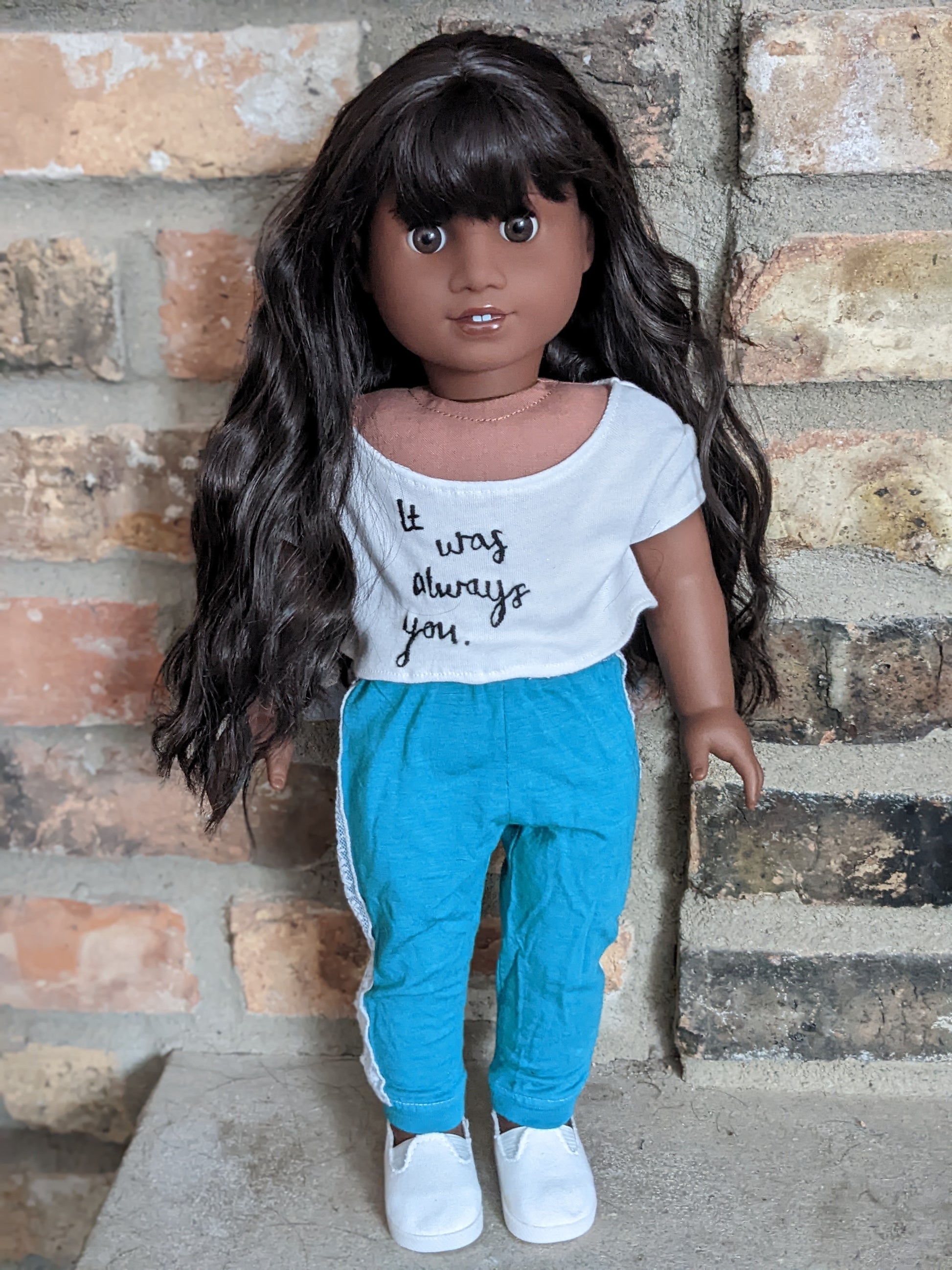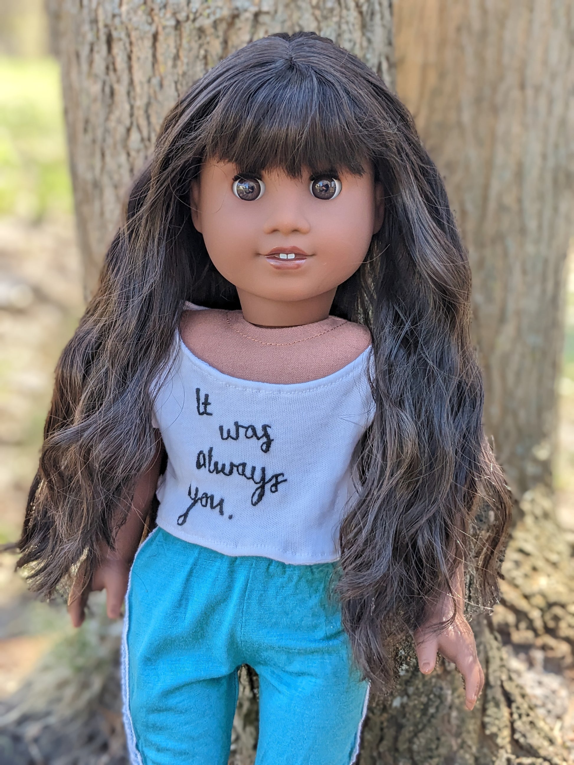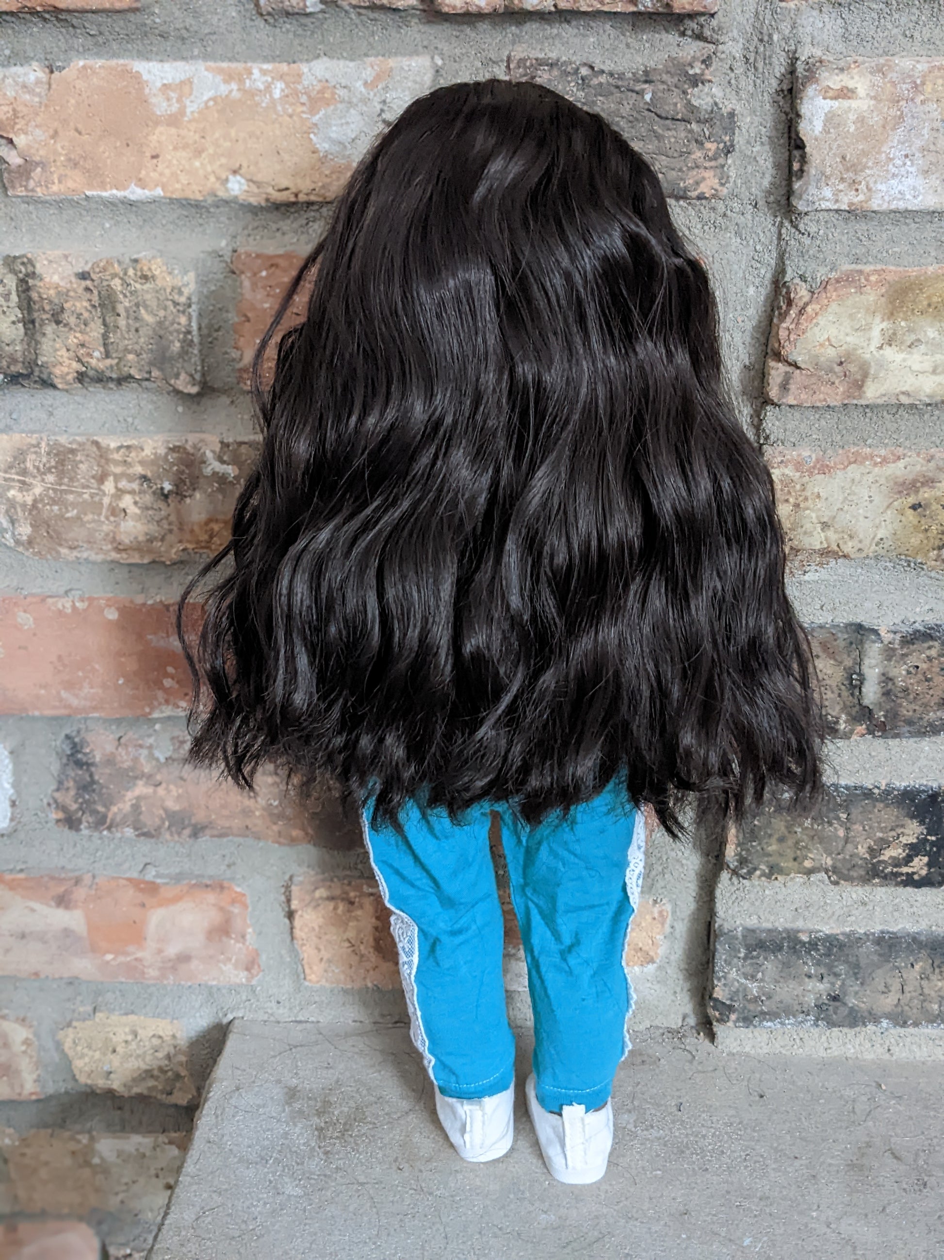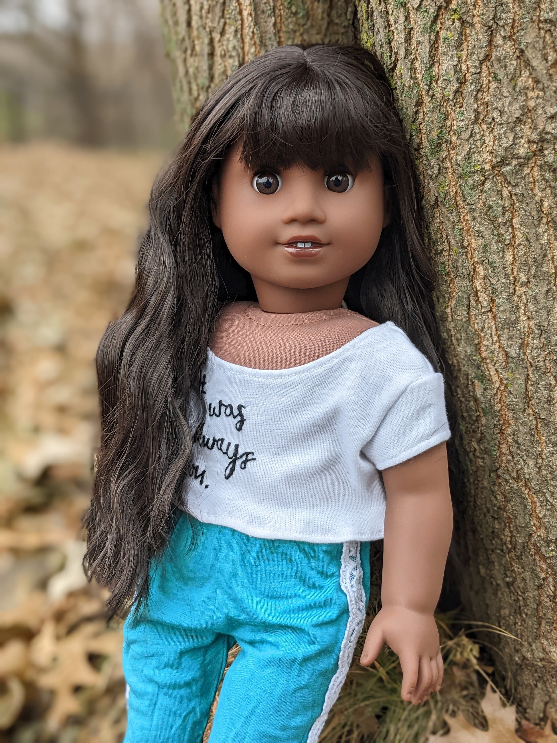 This one of a kind OOAK custom American Girl doll was created with a brand new Truly Me 91 doll, a dark brown wig with bangs, and brown eyes. She has lip gloss that was hand painted and sealed. She may have some minor shine marks from handling. She comes with the outfit pictured.