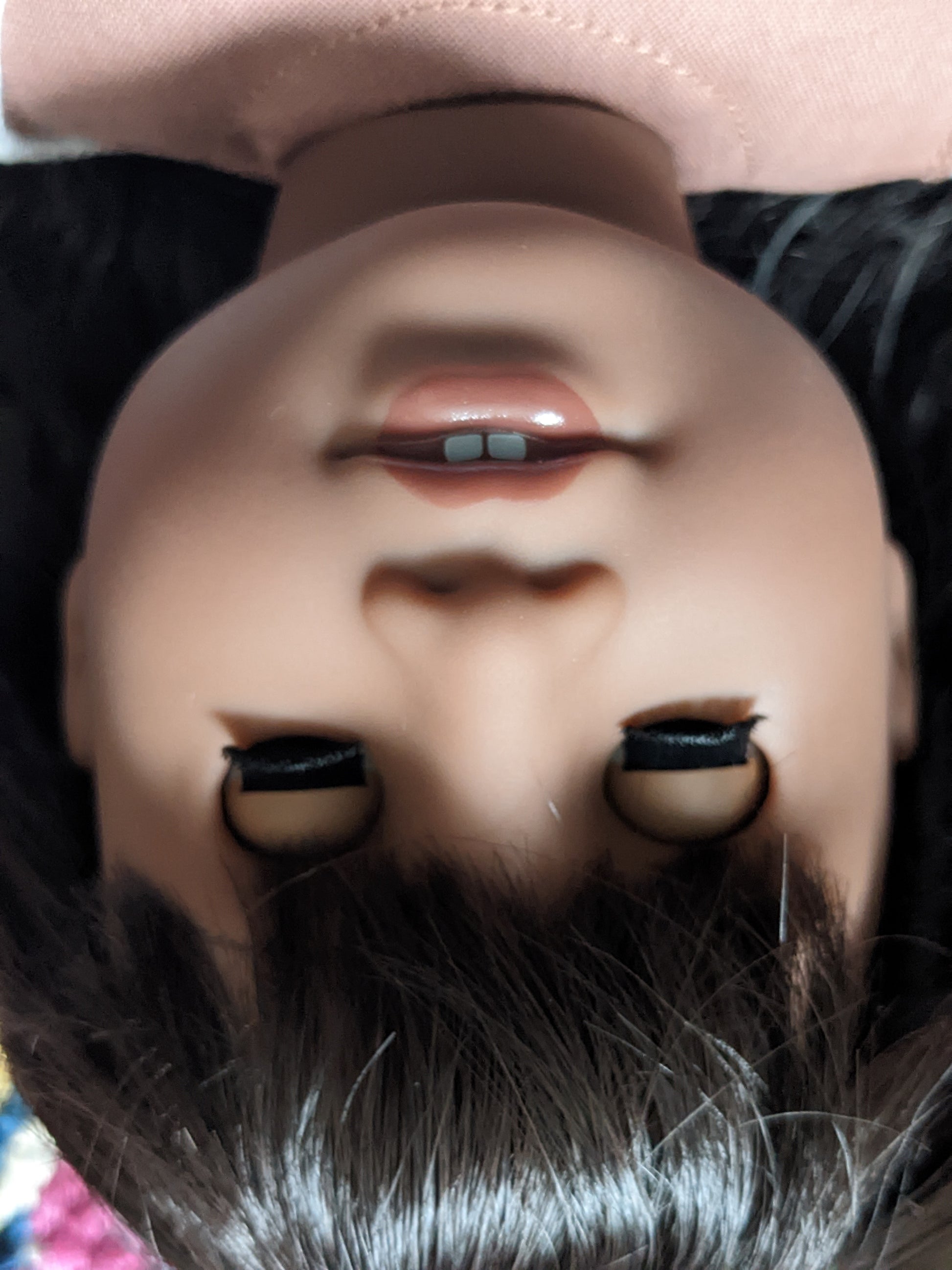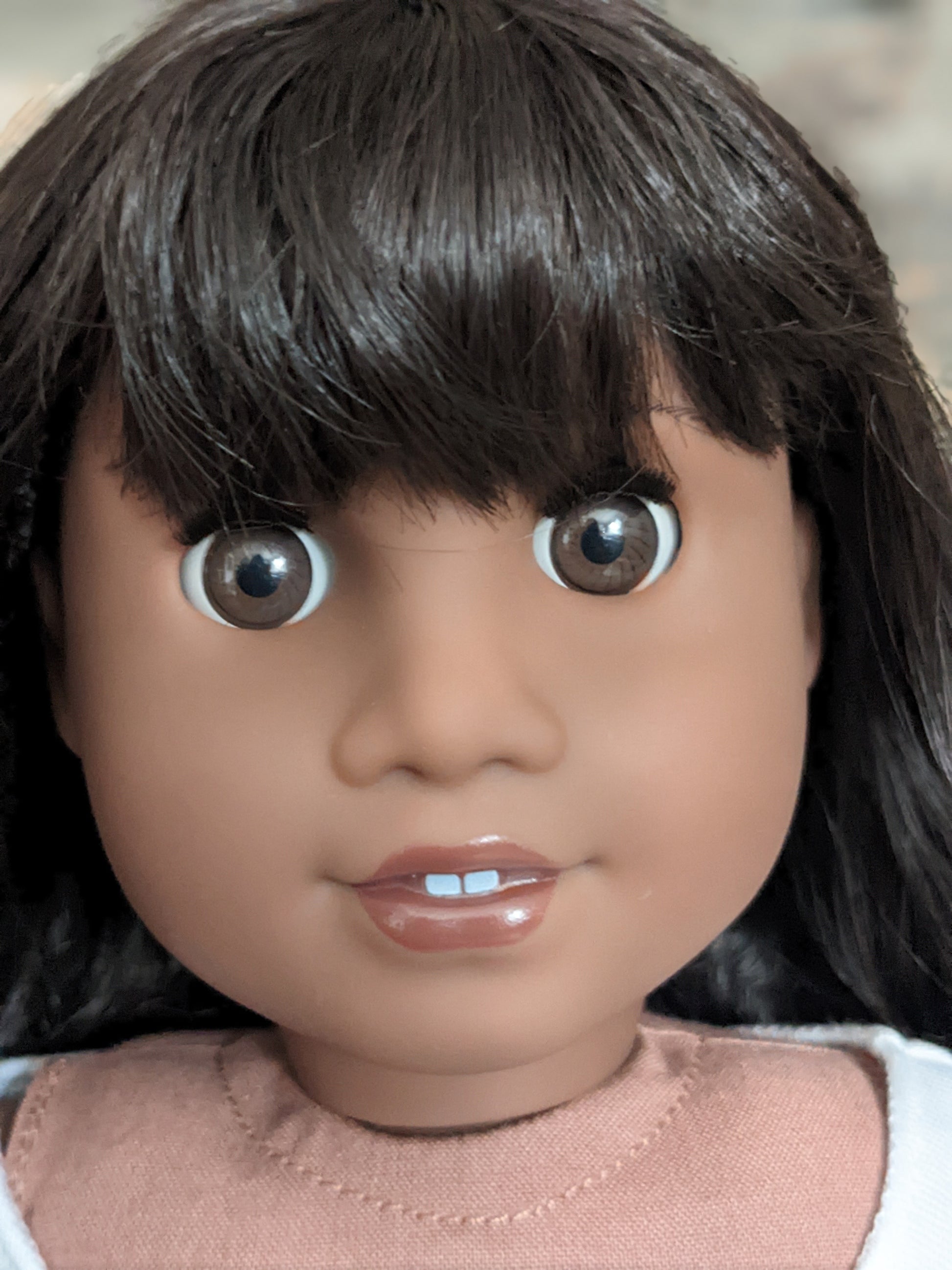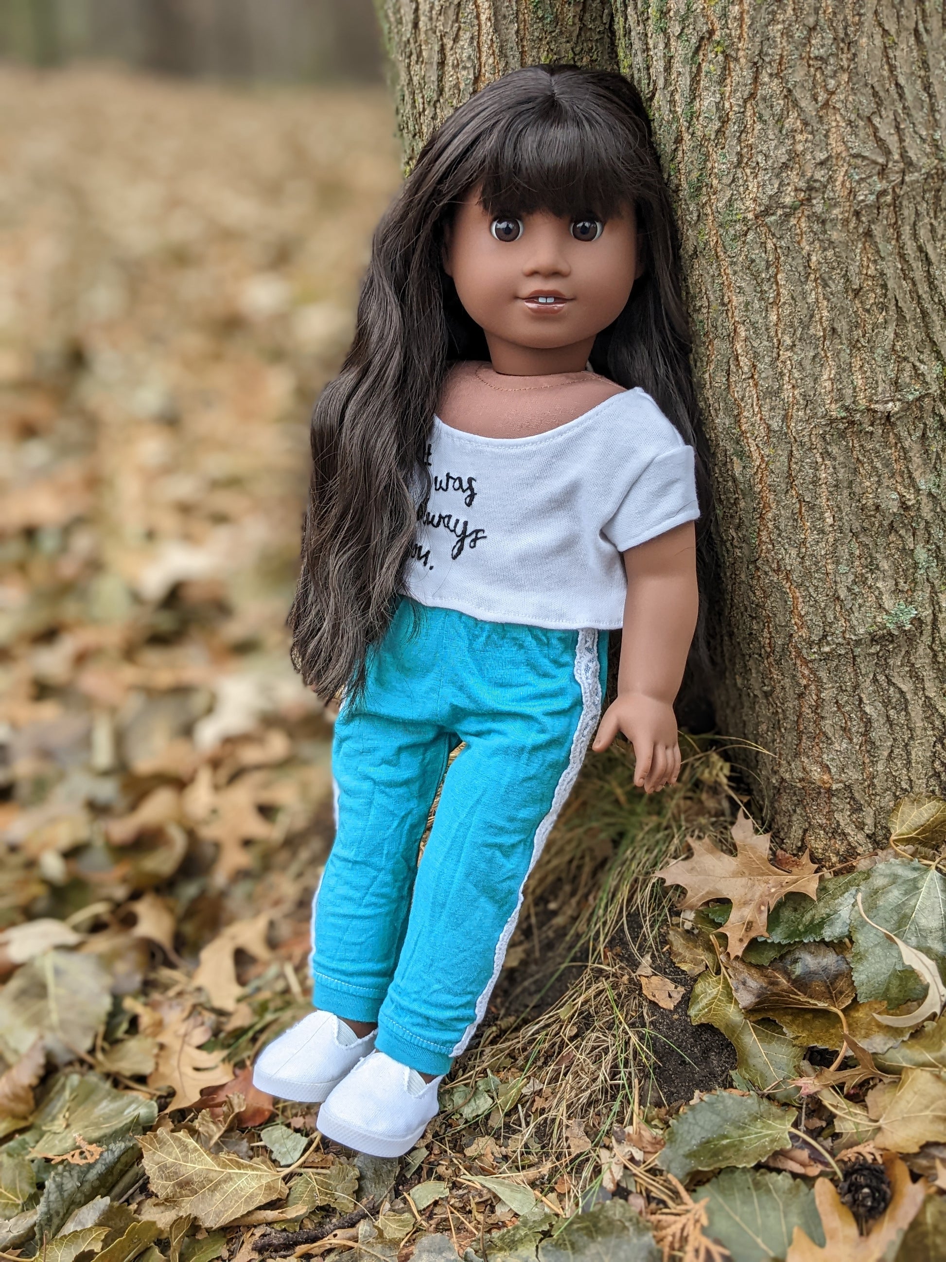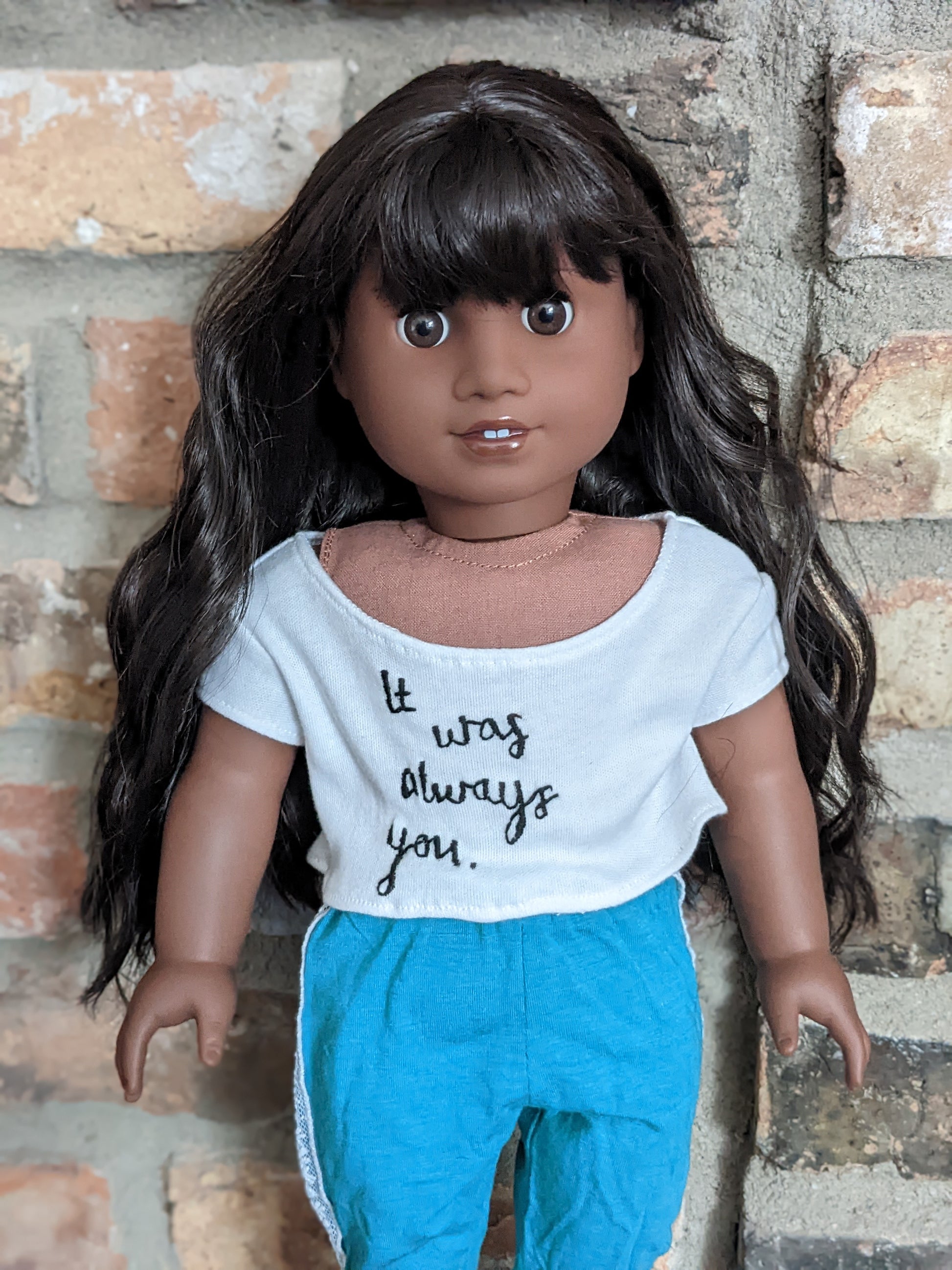 This one of a kind OOAK custom American Girl doll was created with a brand new Truly Me 91 doll, a dark brown wig with bangs, and brown eyes. She has lip gloss that was hand painted and sealed. She may have some minor shine marks from handling. She comes with the outfit pictured.