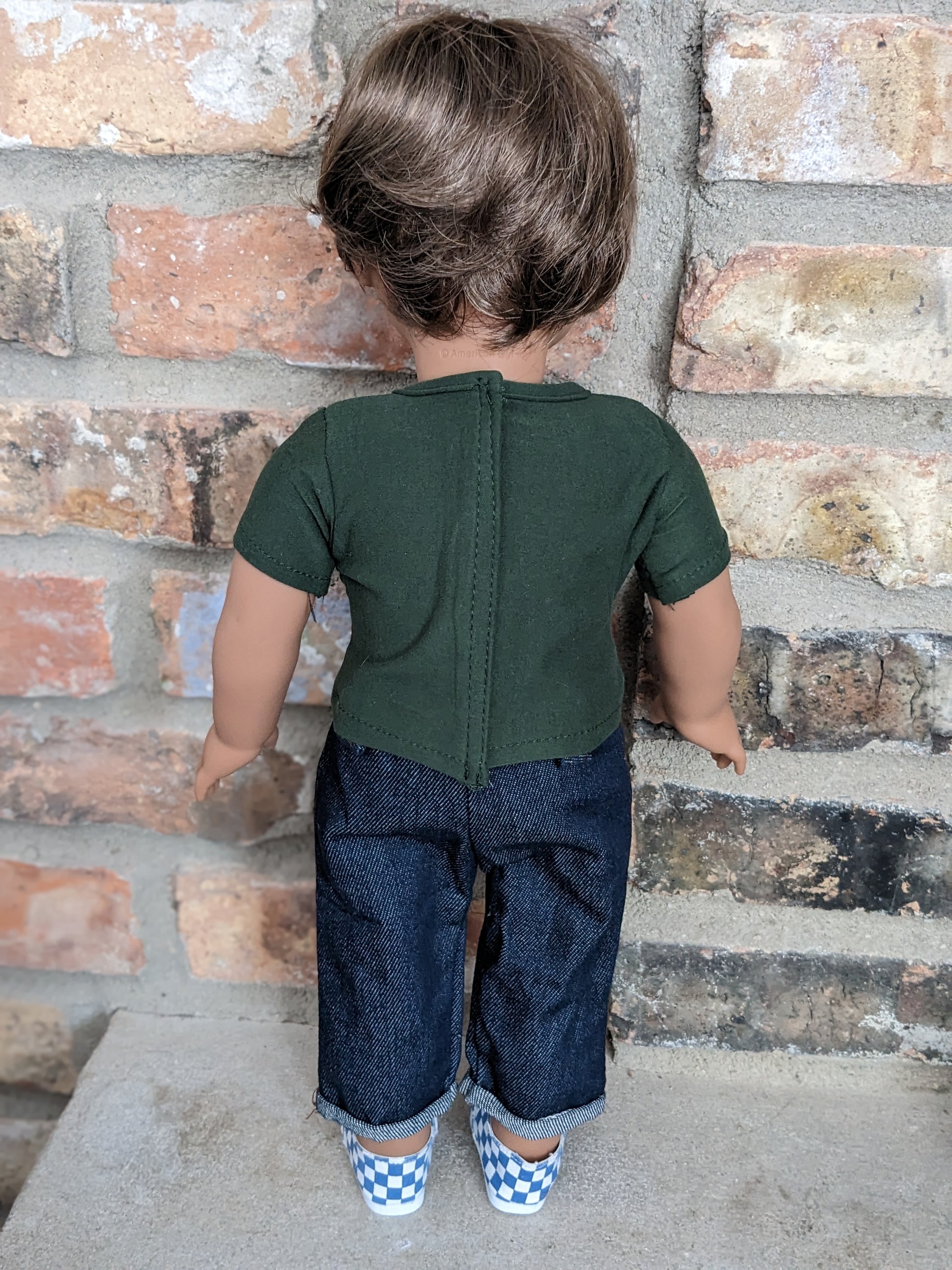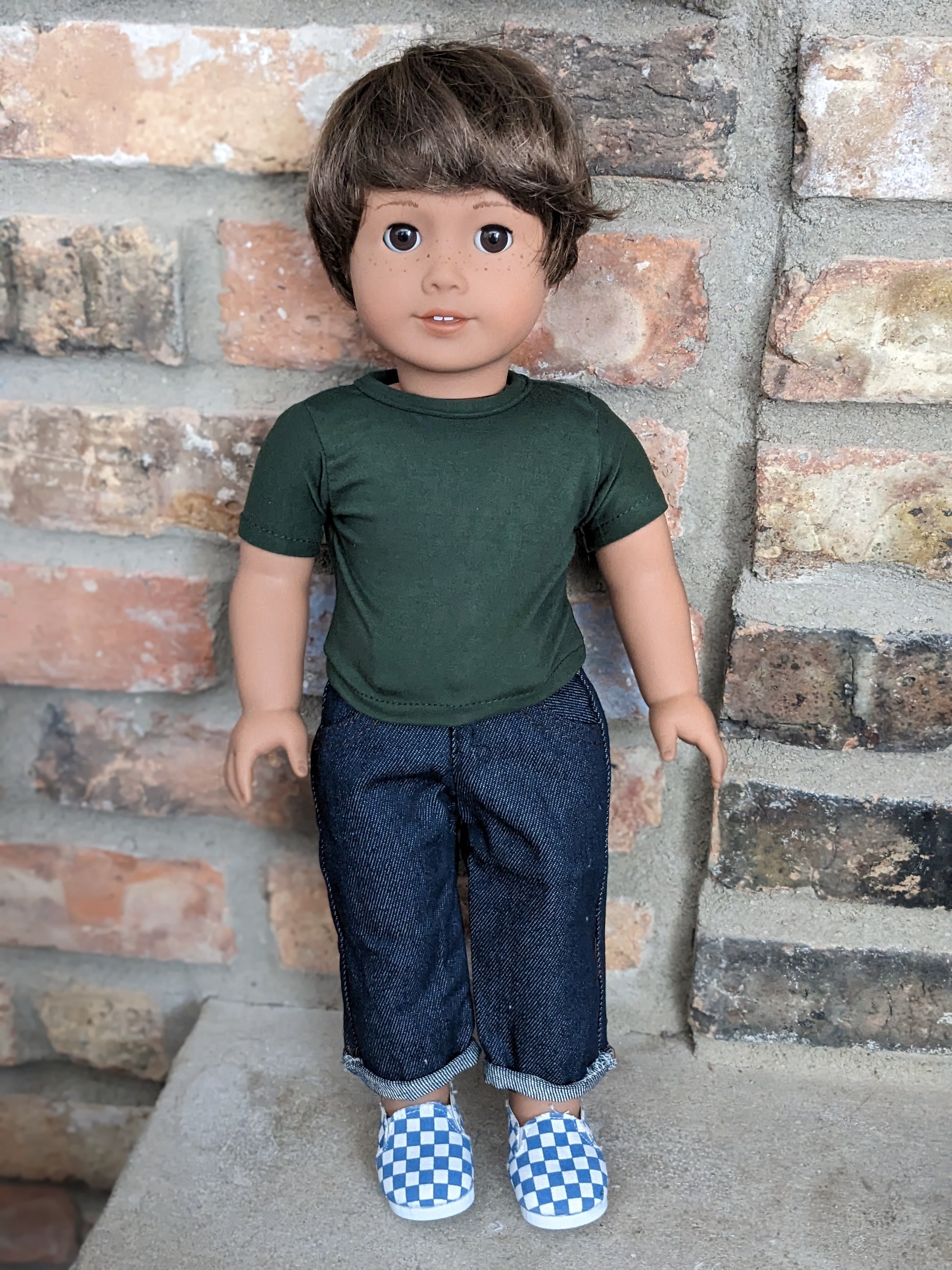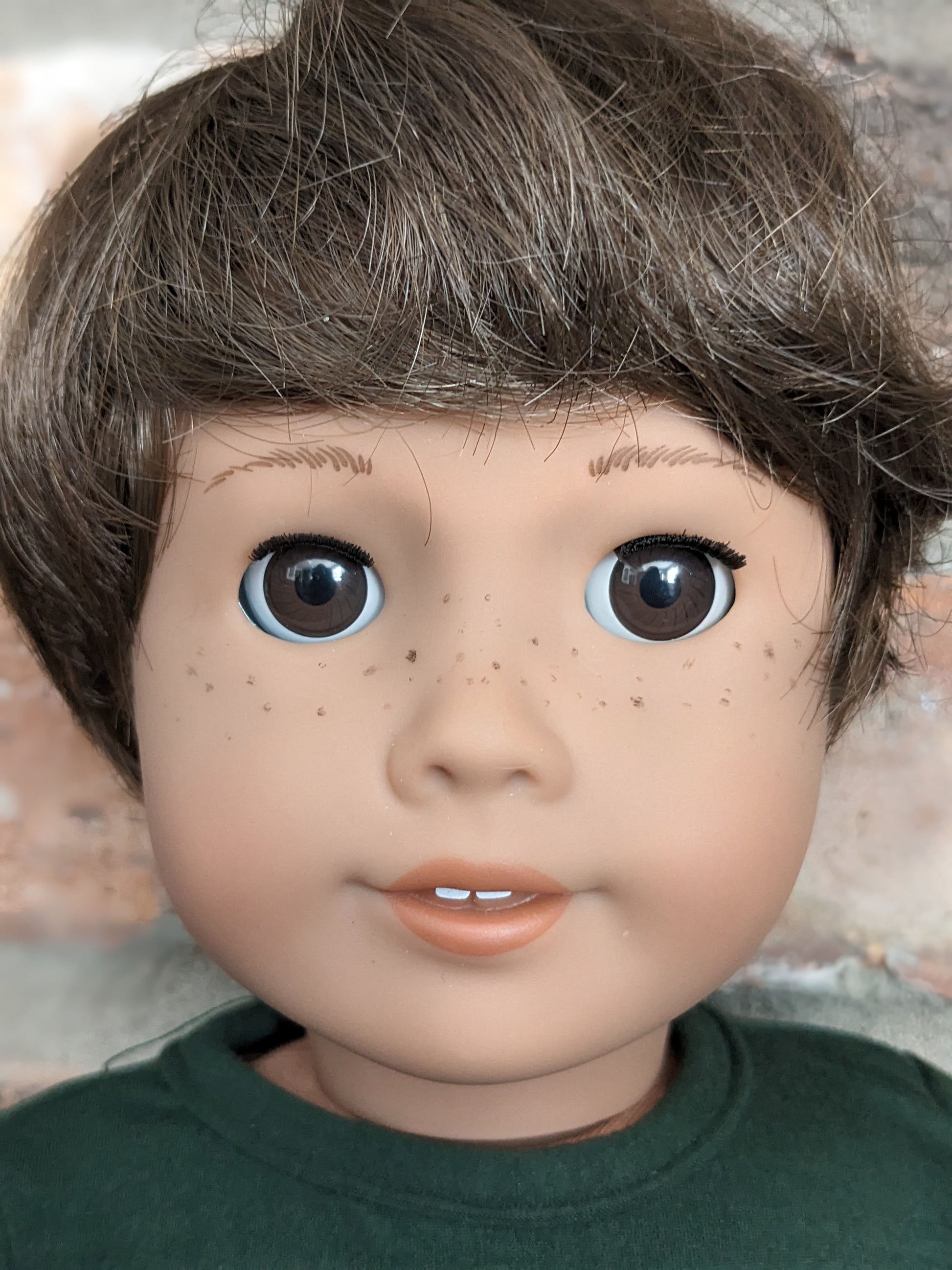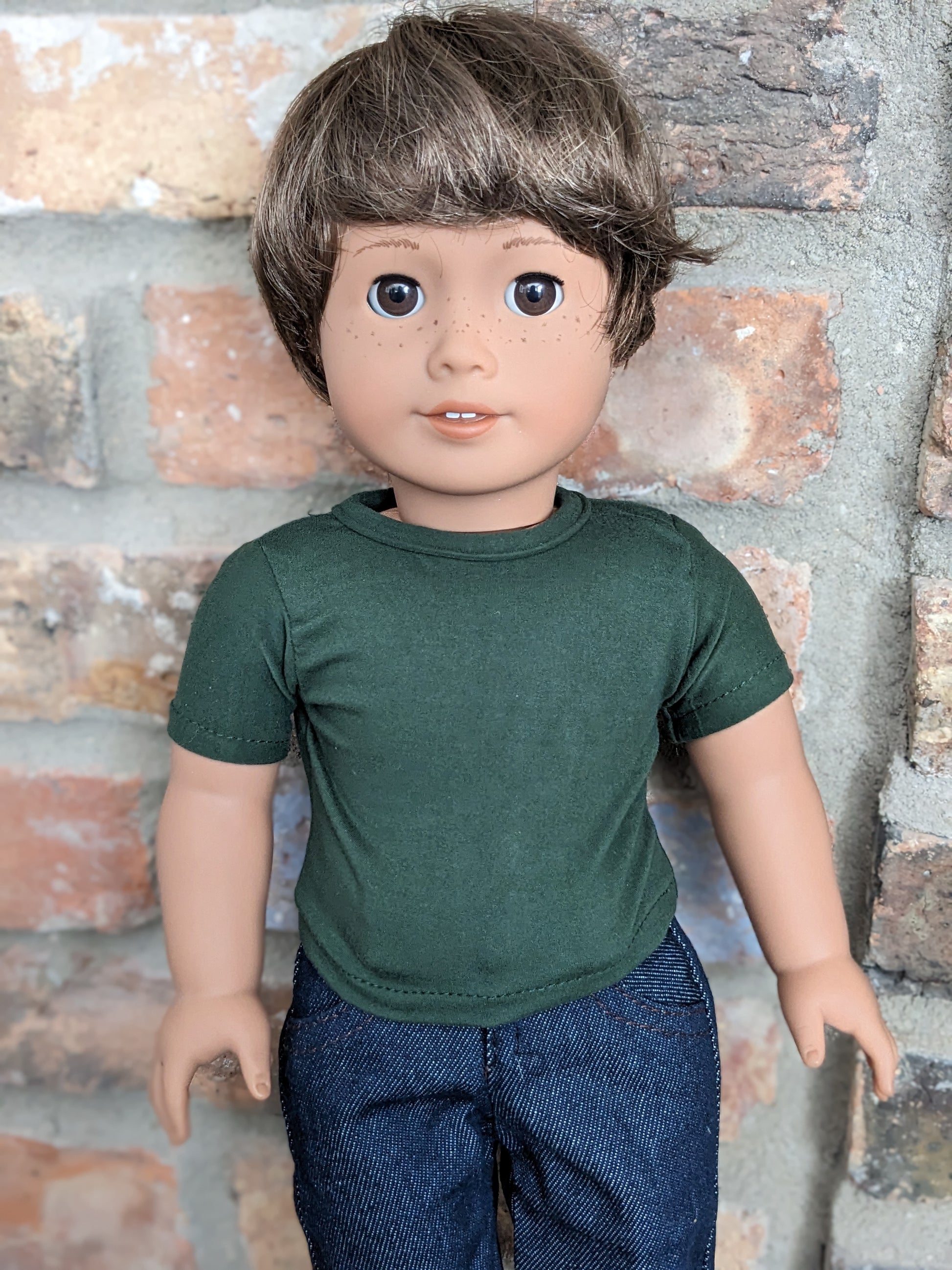 This one of a kind OOAK custom American Girl doll was created with a brand new Truly Me doll, a brown wig, and brown eyes. He may have some minor shine marks from handling. He has hand painted freckles. He comes with the outfit pictured.
