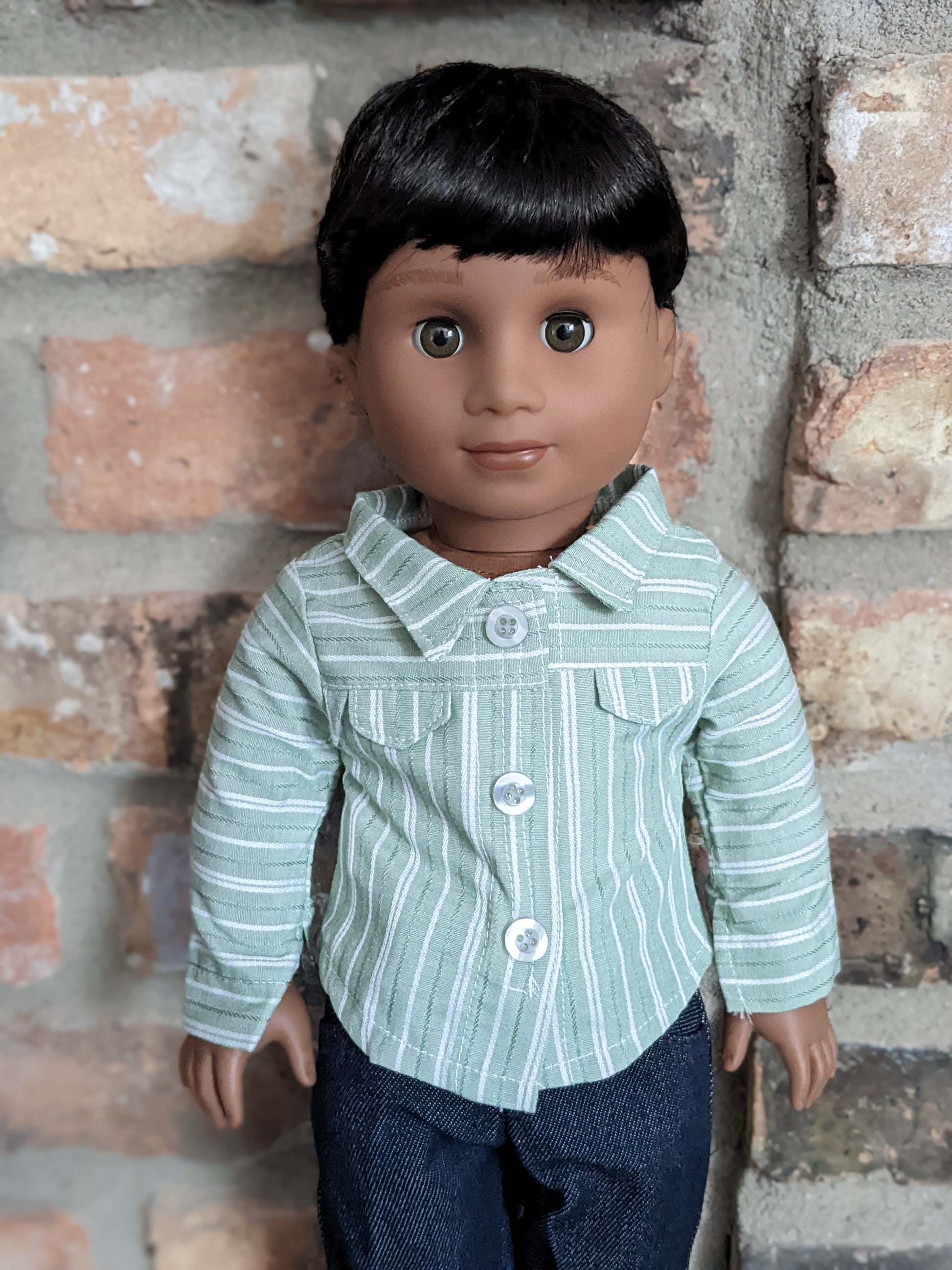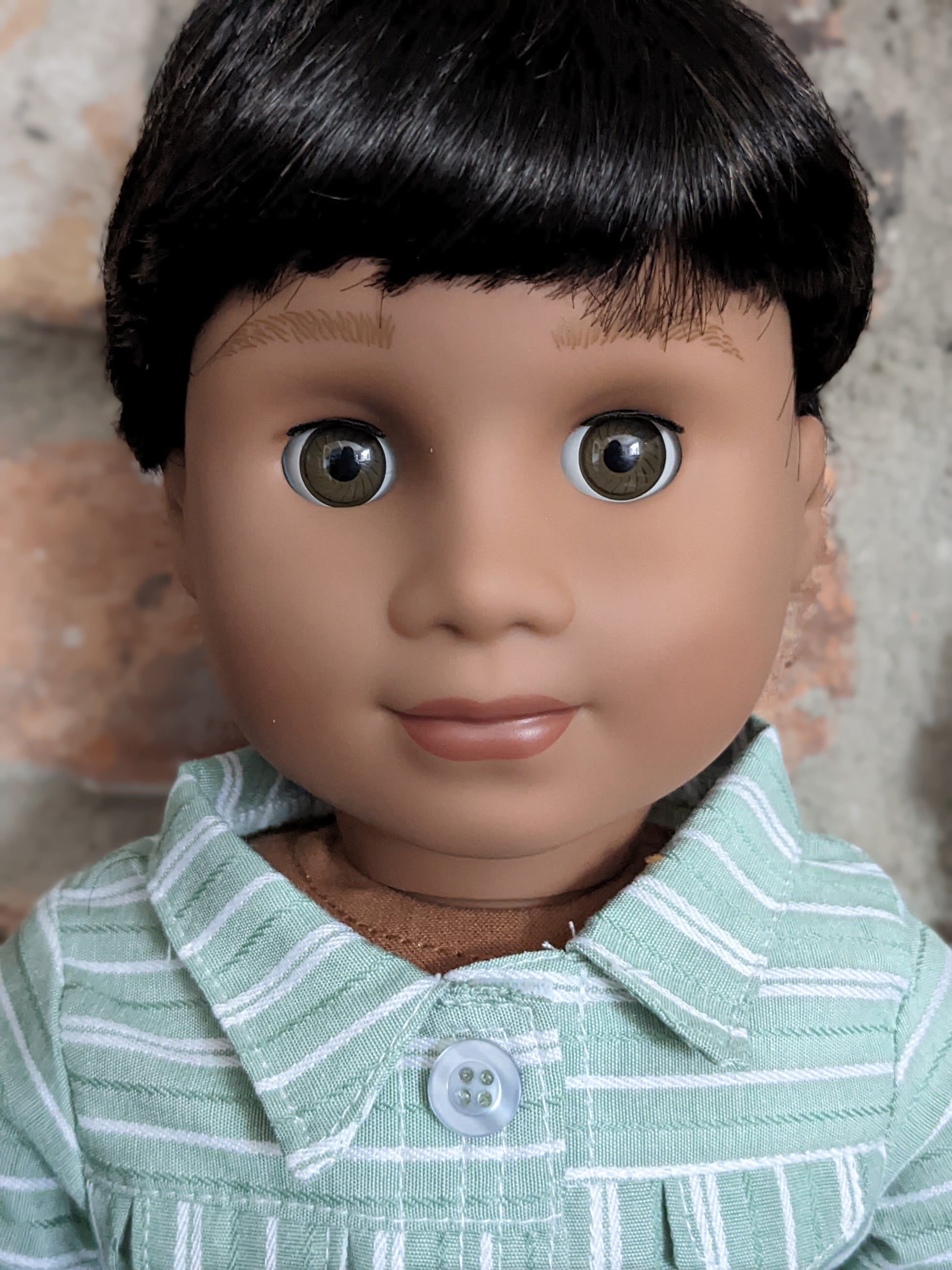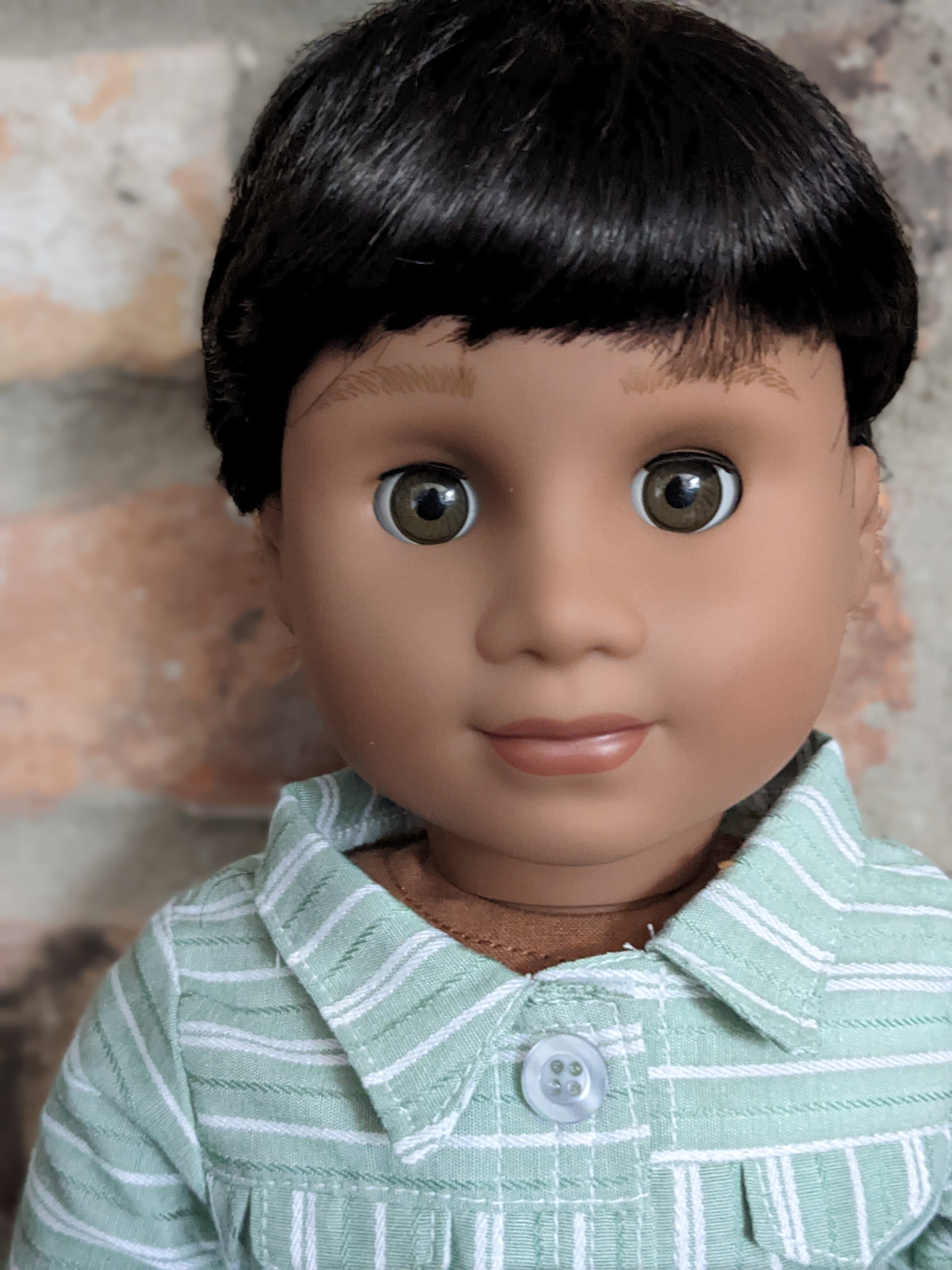 This one of a kind OOAK custom American Girl doll was created with a brand new Truly Me 113 doll, a black wig from a new TM 75 doll, and brown decal eyes. He may have some minor shine marks from handling. He comes with the outfit pictured.