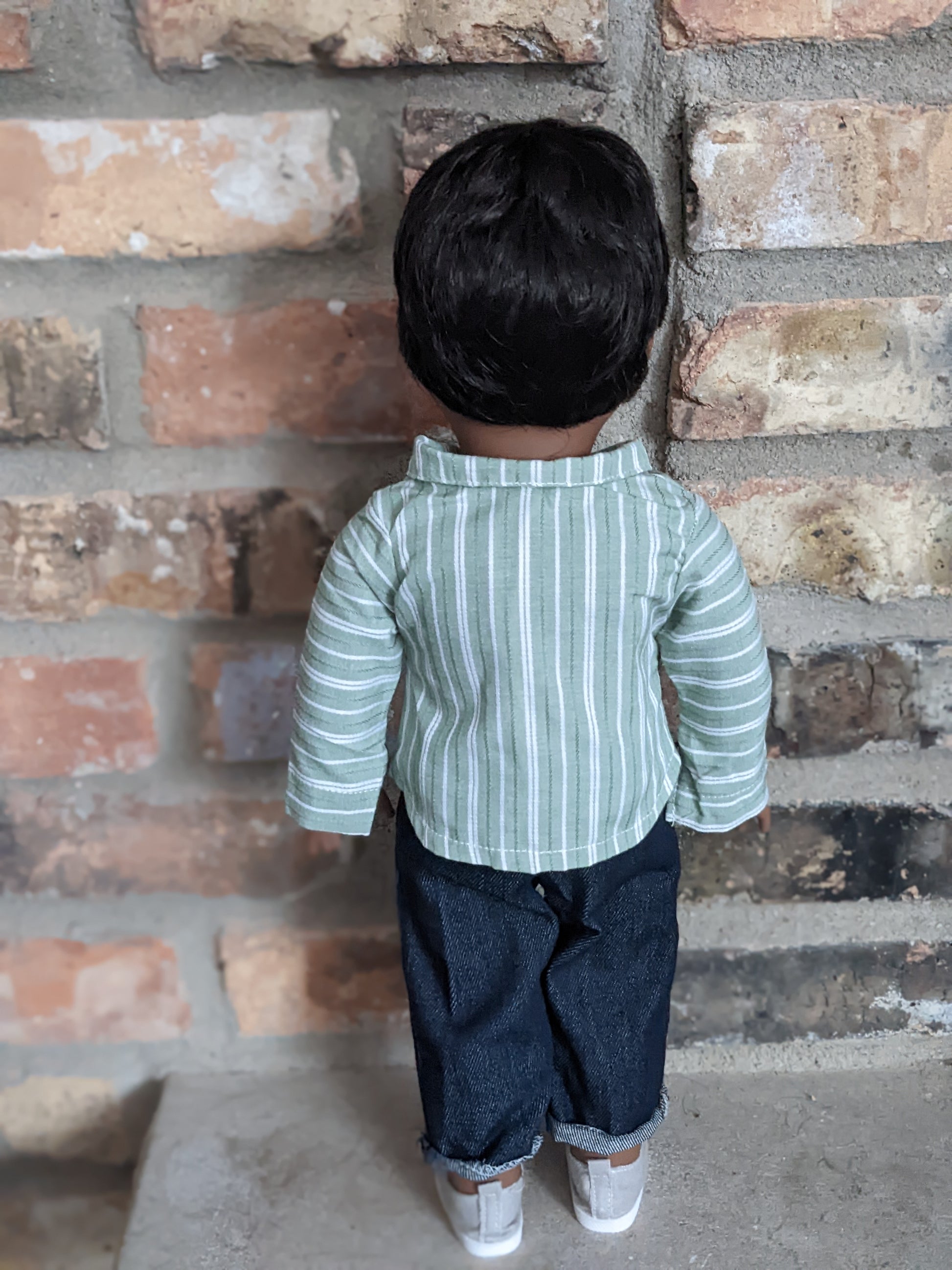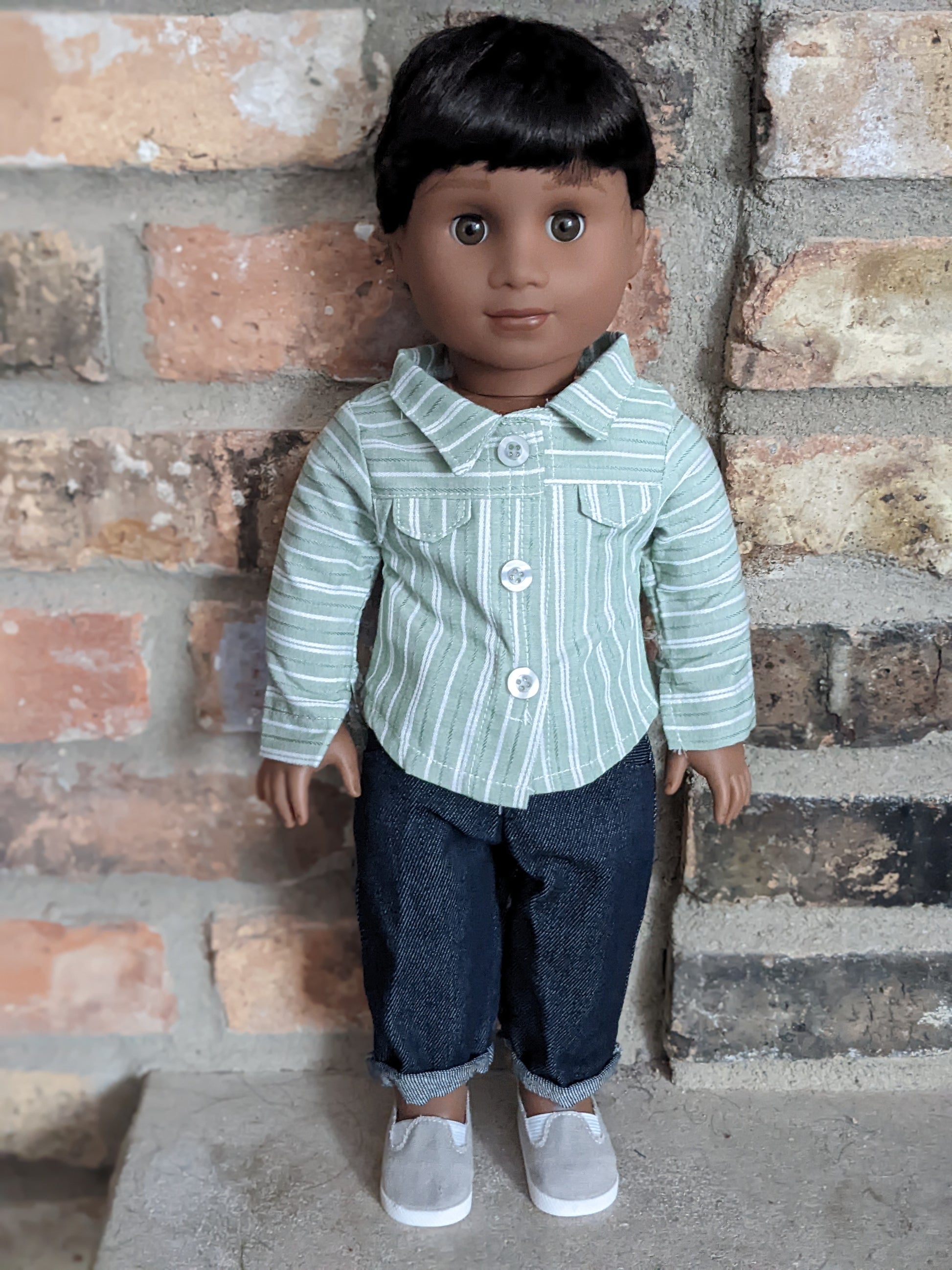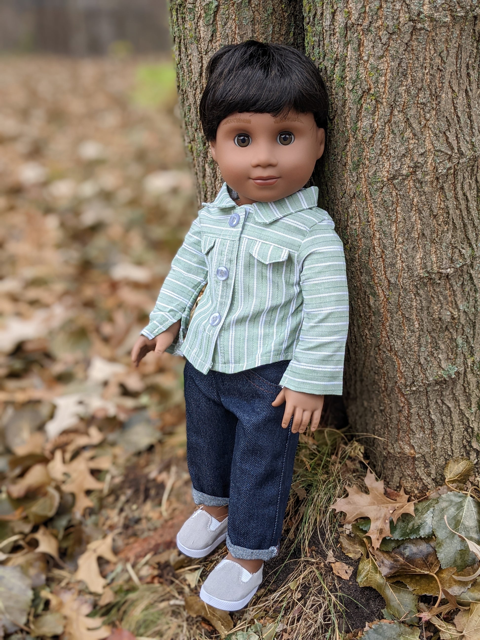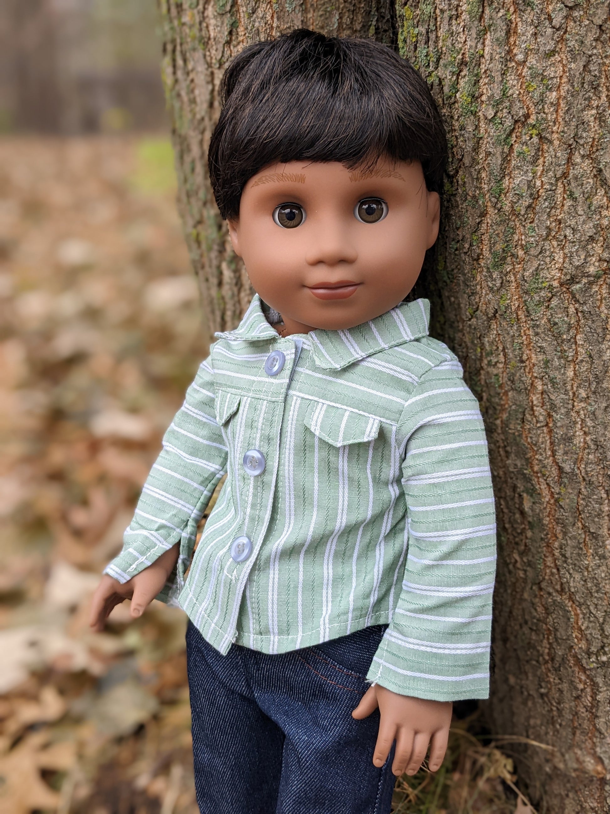 This one of a kind OOAK custom American Girl doll was created with a brand new Truly Me 113 doll, a black wig from a new TM 75 doll, and brown decal eyes. He may have some minor shine marks from handling. He comes with the outfit pictured.