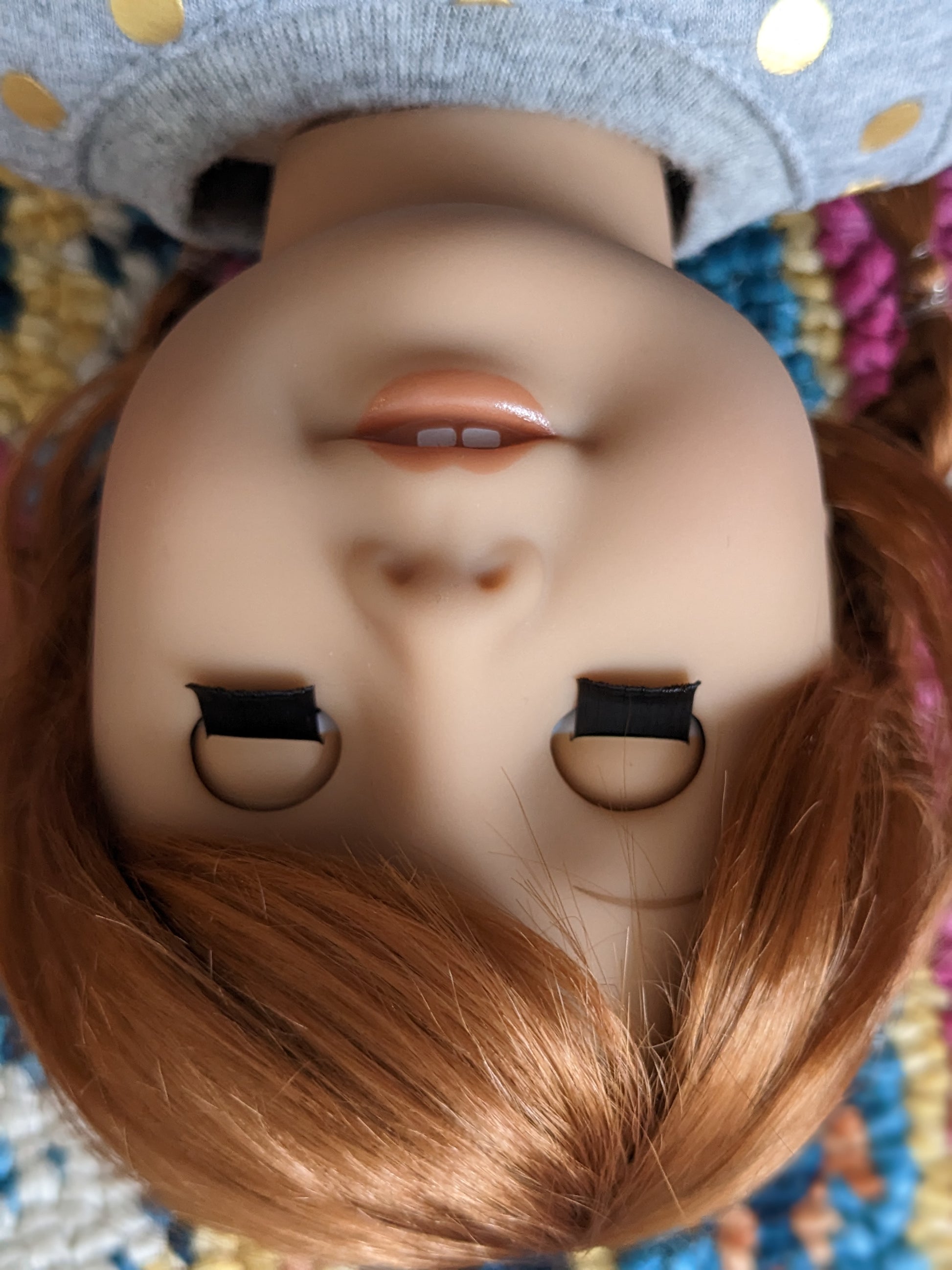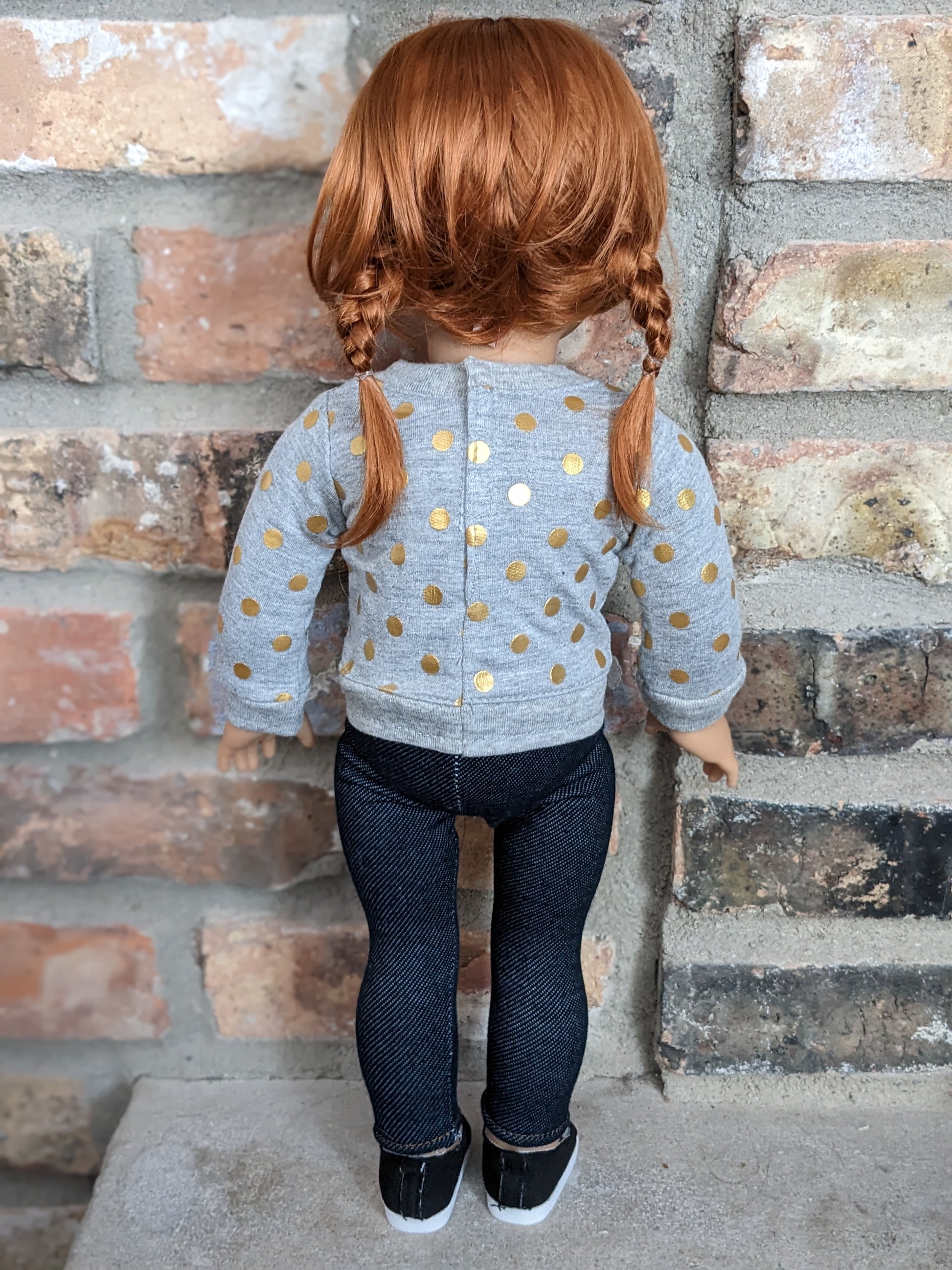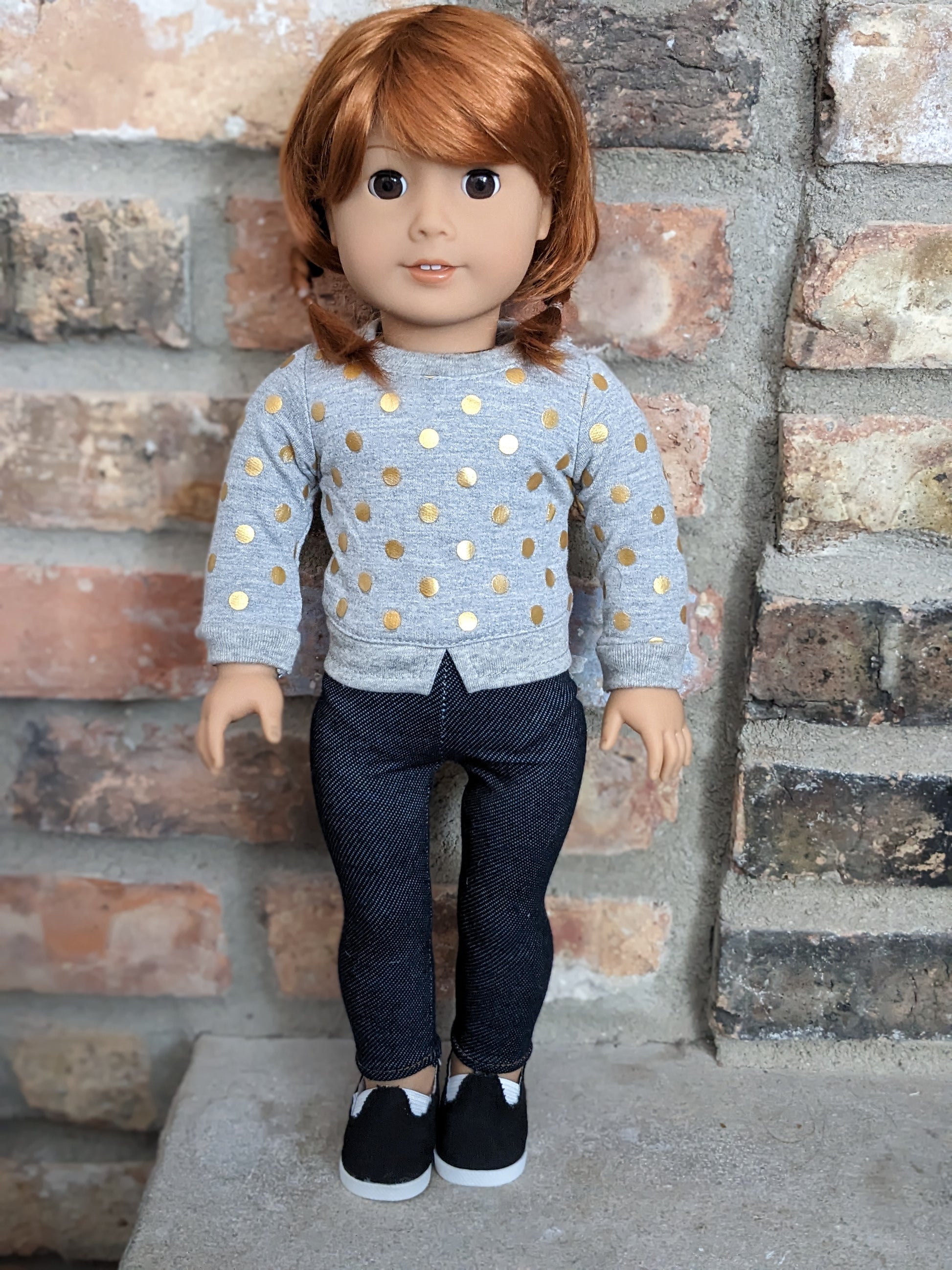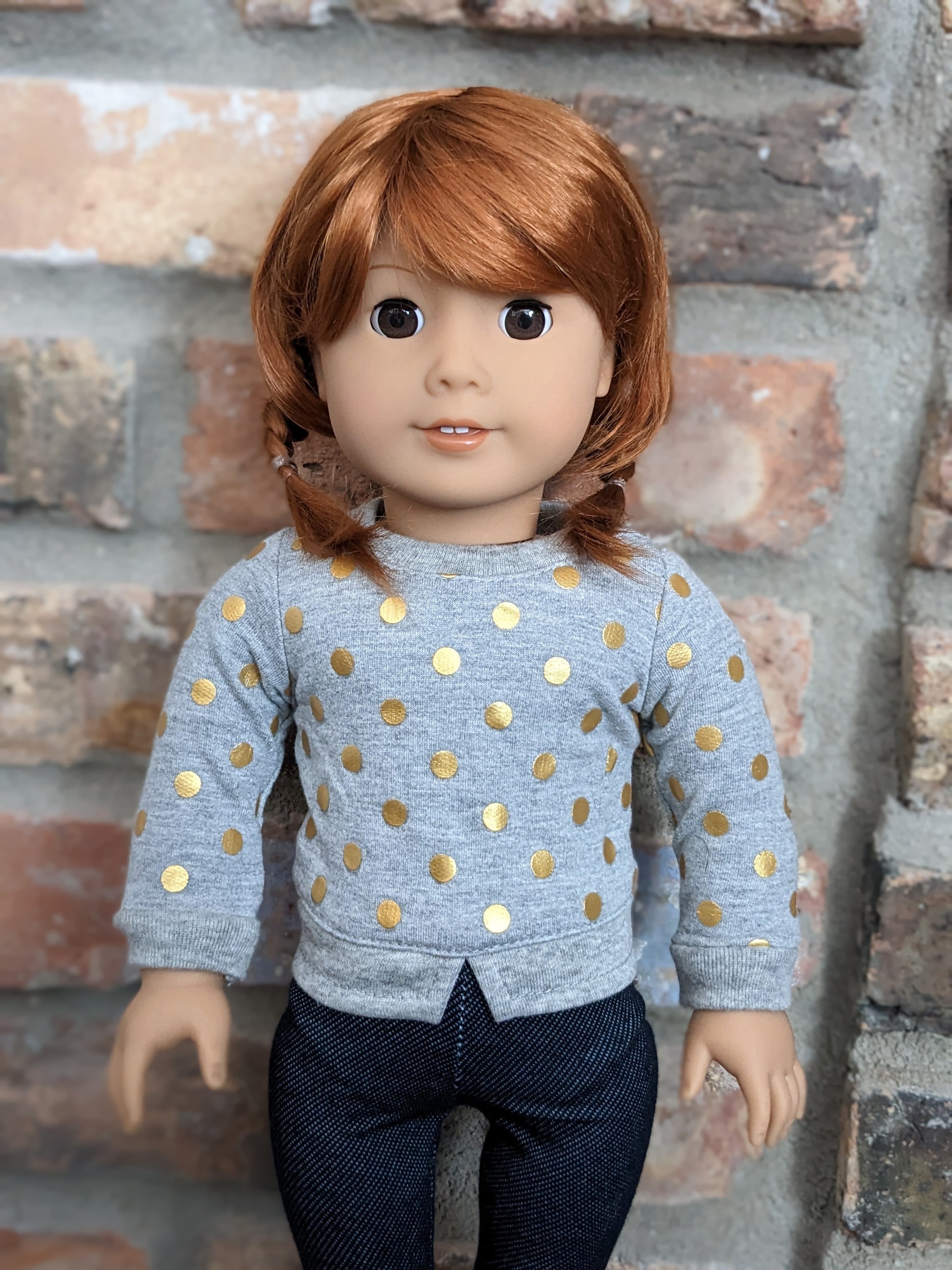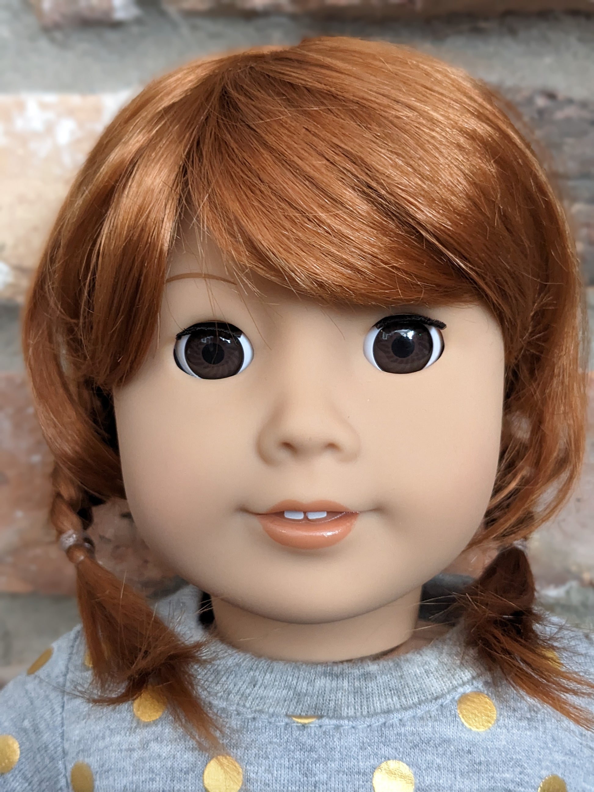 This one of a kind OOAK custom American Girl doll was created with a brand new doll, a red vegan mohair wig, and brown eyes. She has lip gloss that was hand painted and sealed. She may have some minor shine marks from handling. She comes with the outfit pictured. She has the two part eyes with white posts used by American Girl around 2017-2019.