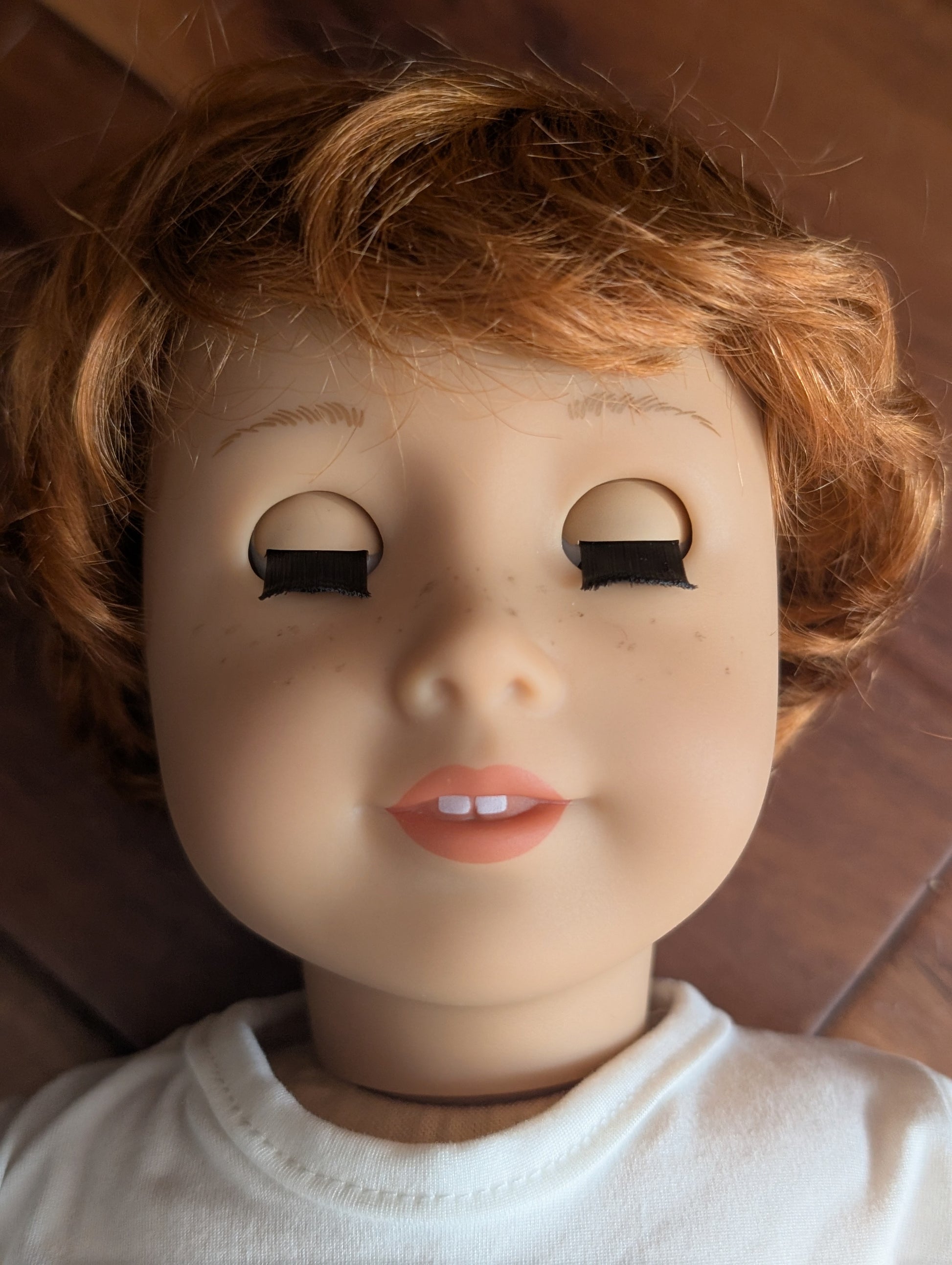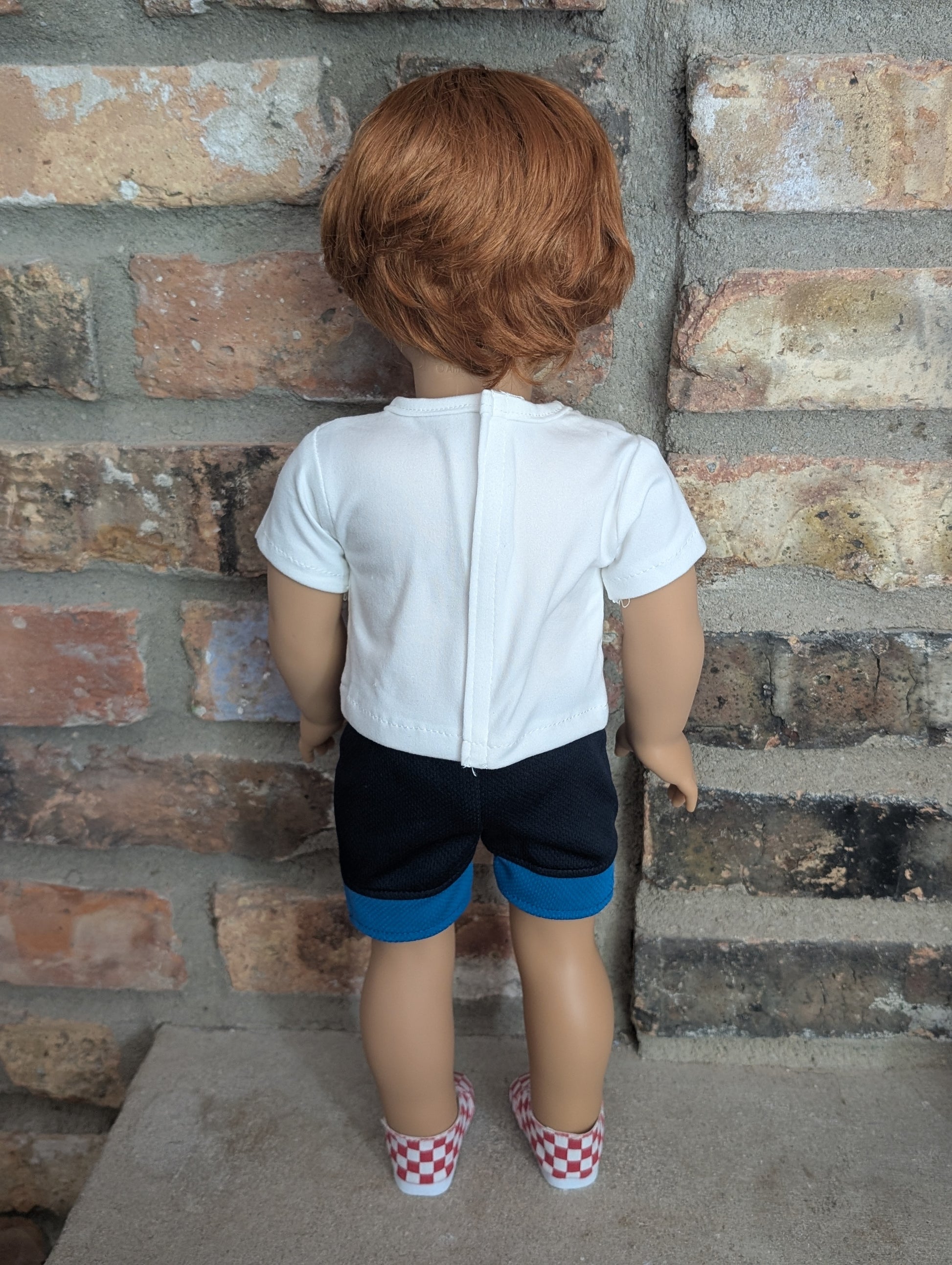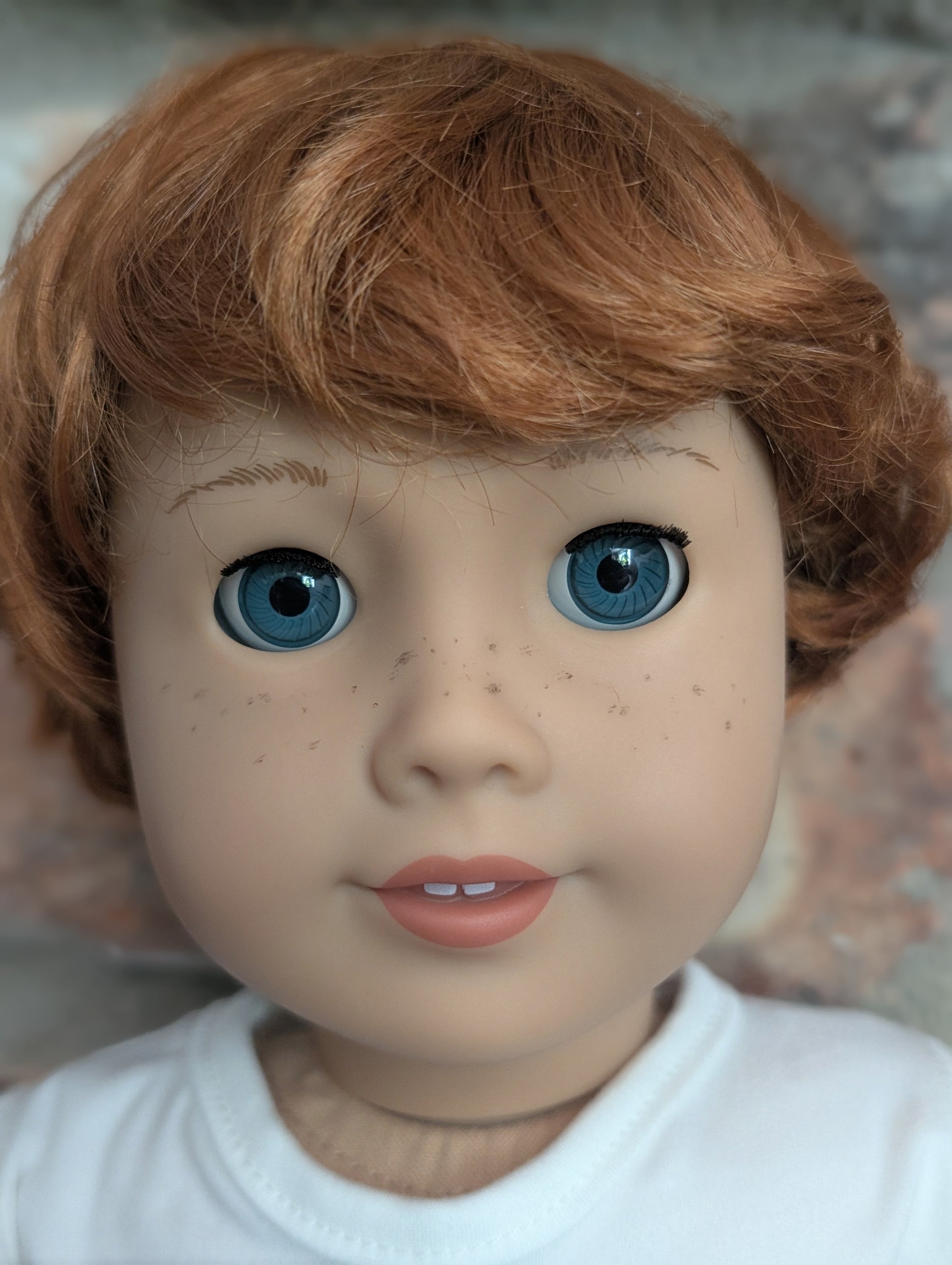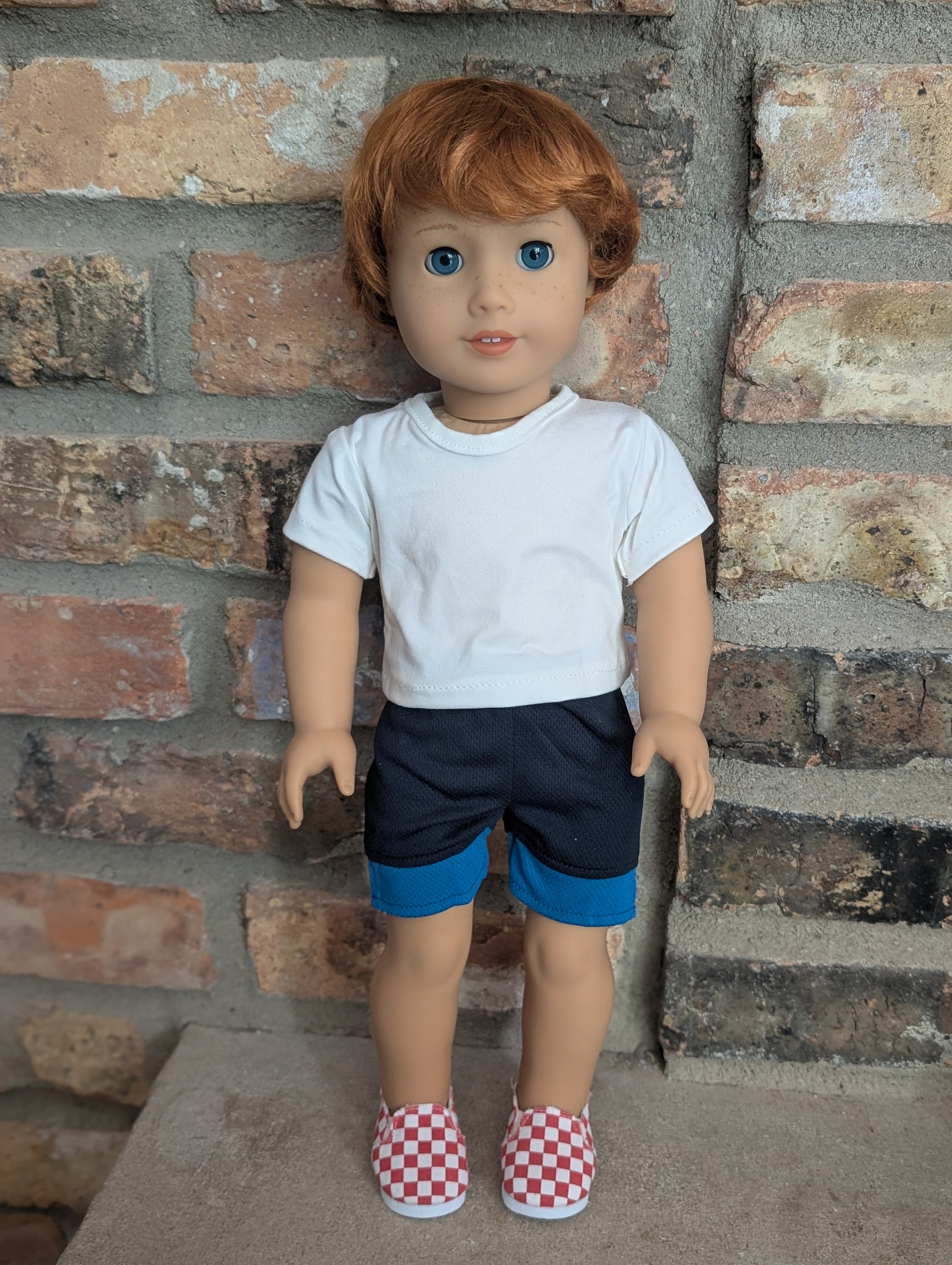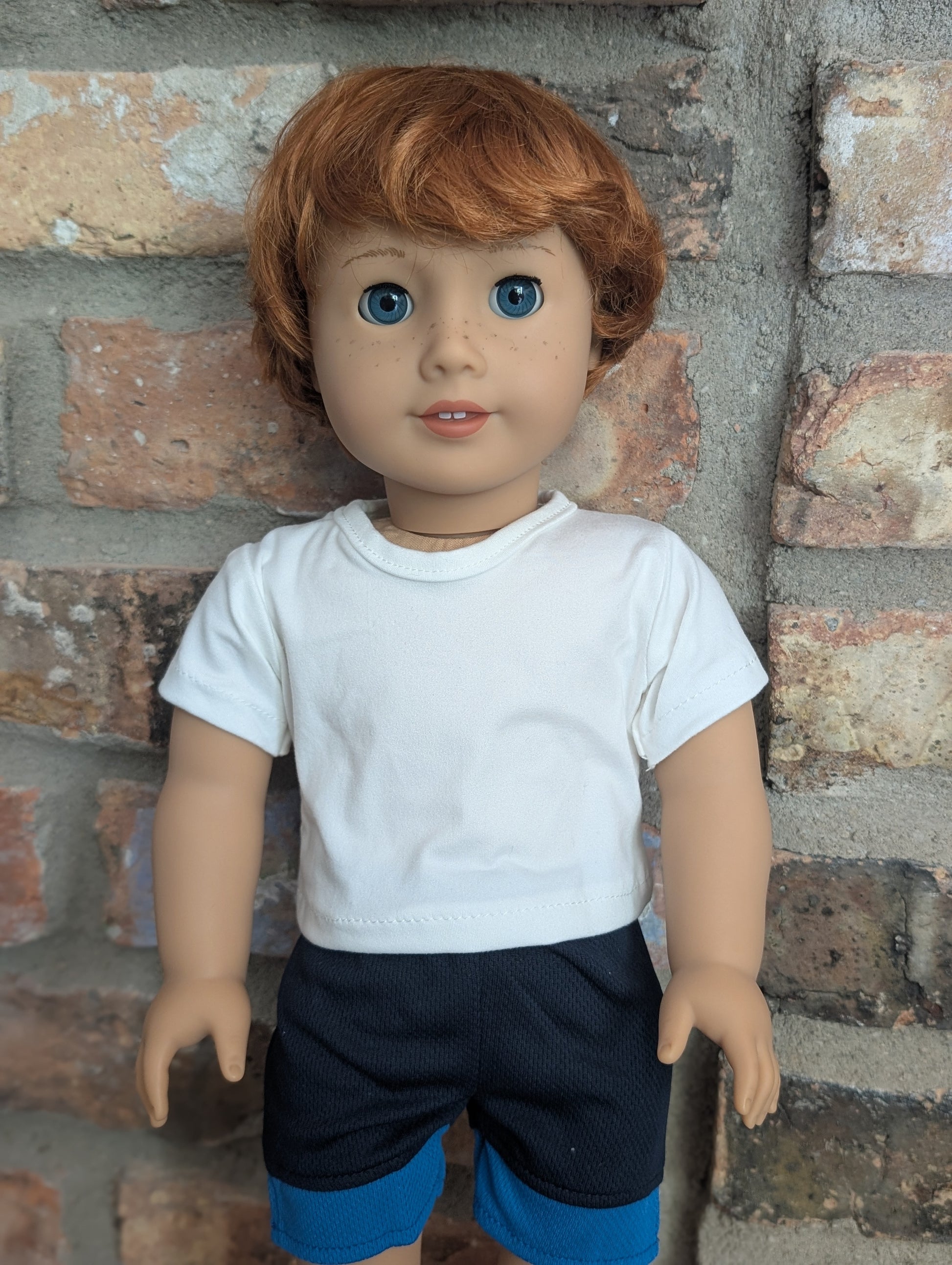 This one of a kind OOAK custom boy American Girl doll was created with a brand new doll, a red wig, and blue eyes. He has freckles that were hand painted and sealed. He may have some minor shine marks from handling. He comes with the outfit pictured.